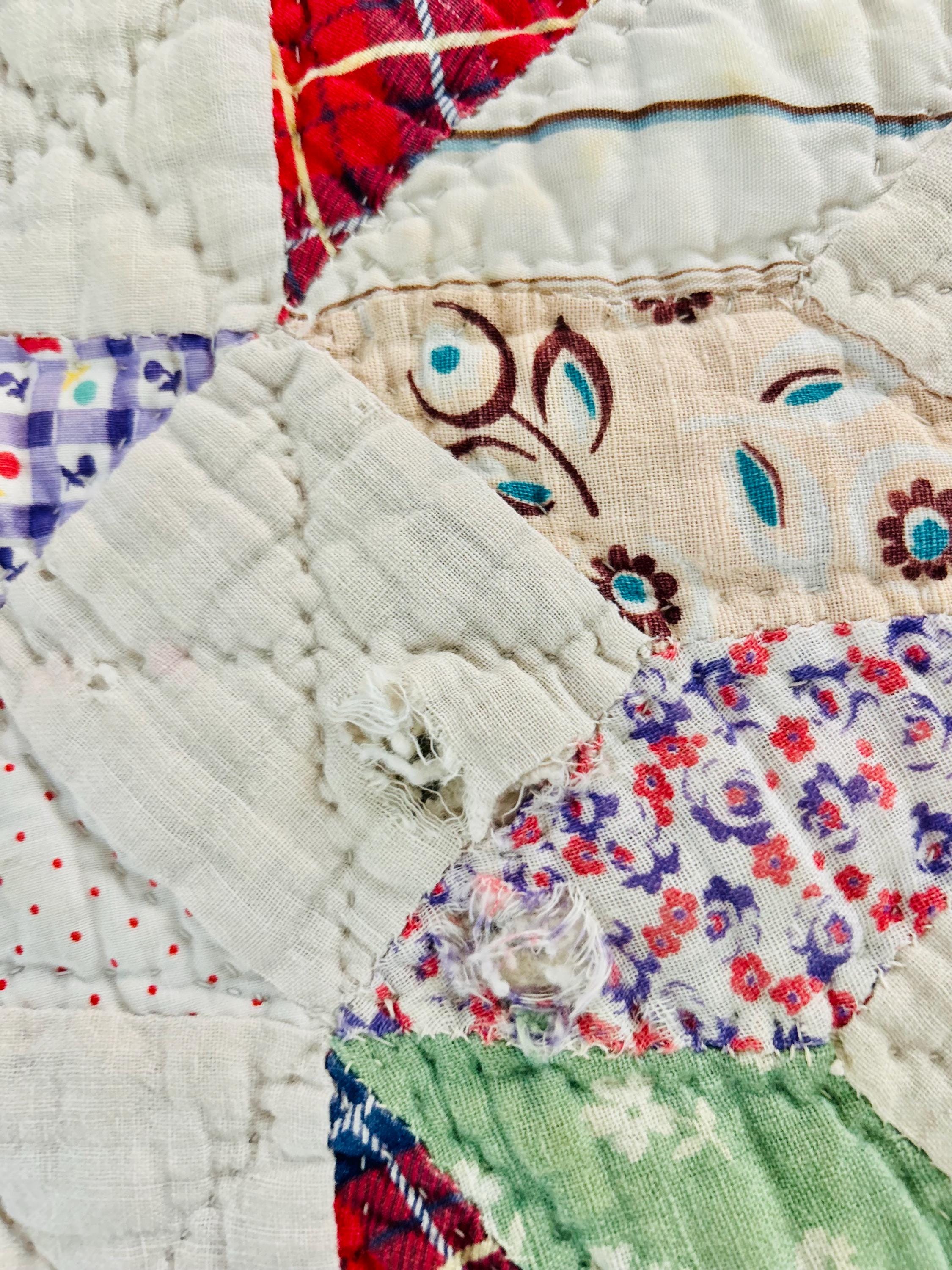 Despite the wear, the quilt retains strong visual impact, original hand quilting, and excellent examples of early cotton prints that are increasingly difficult to find.