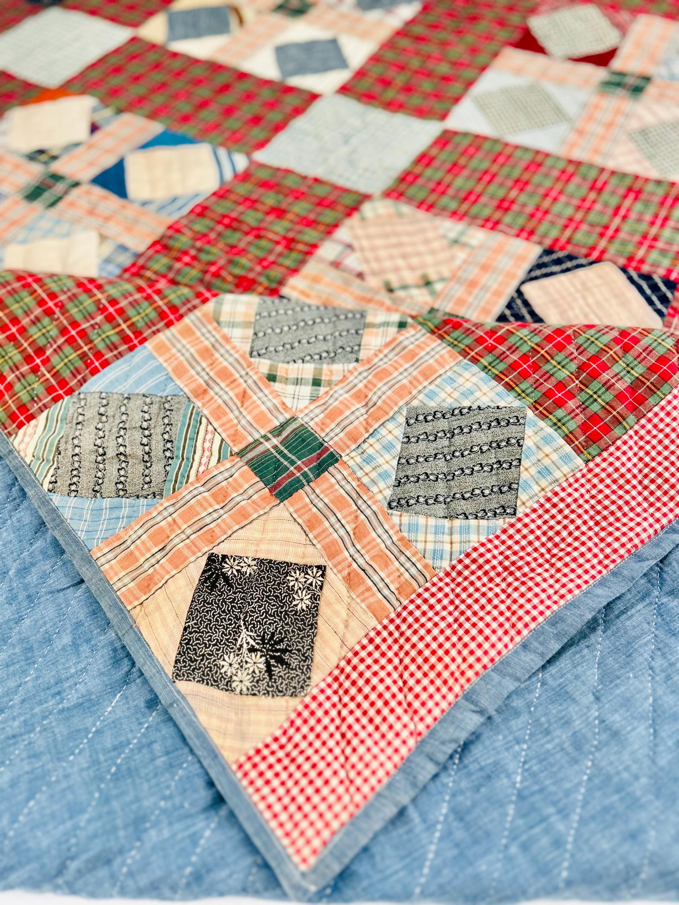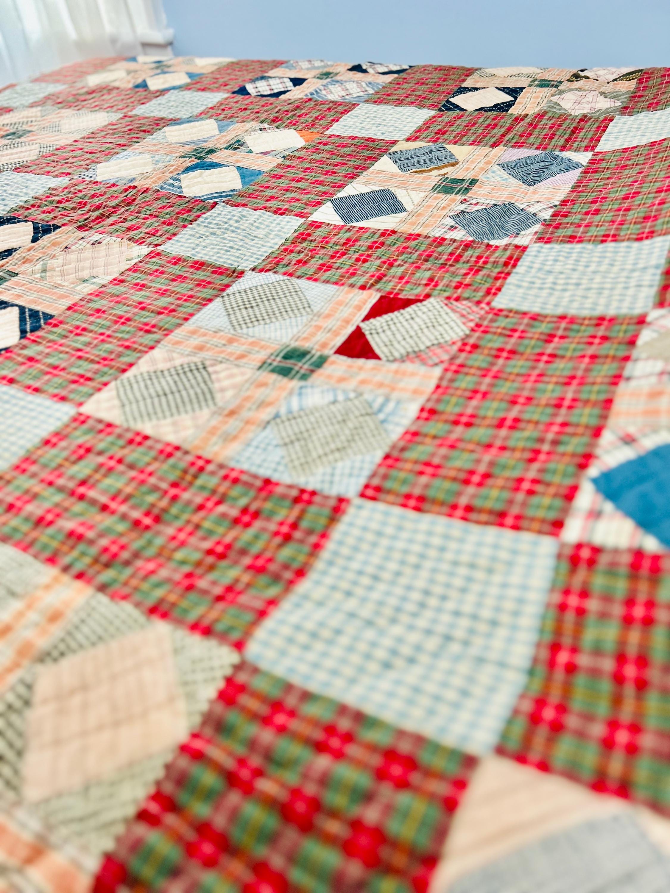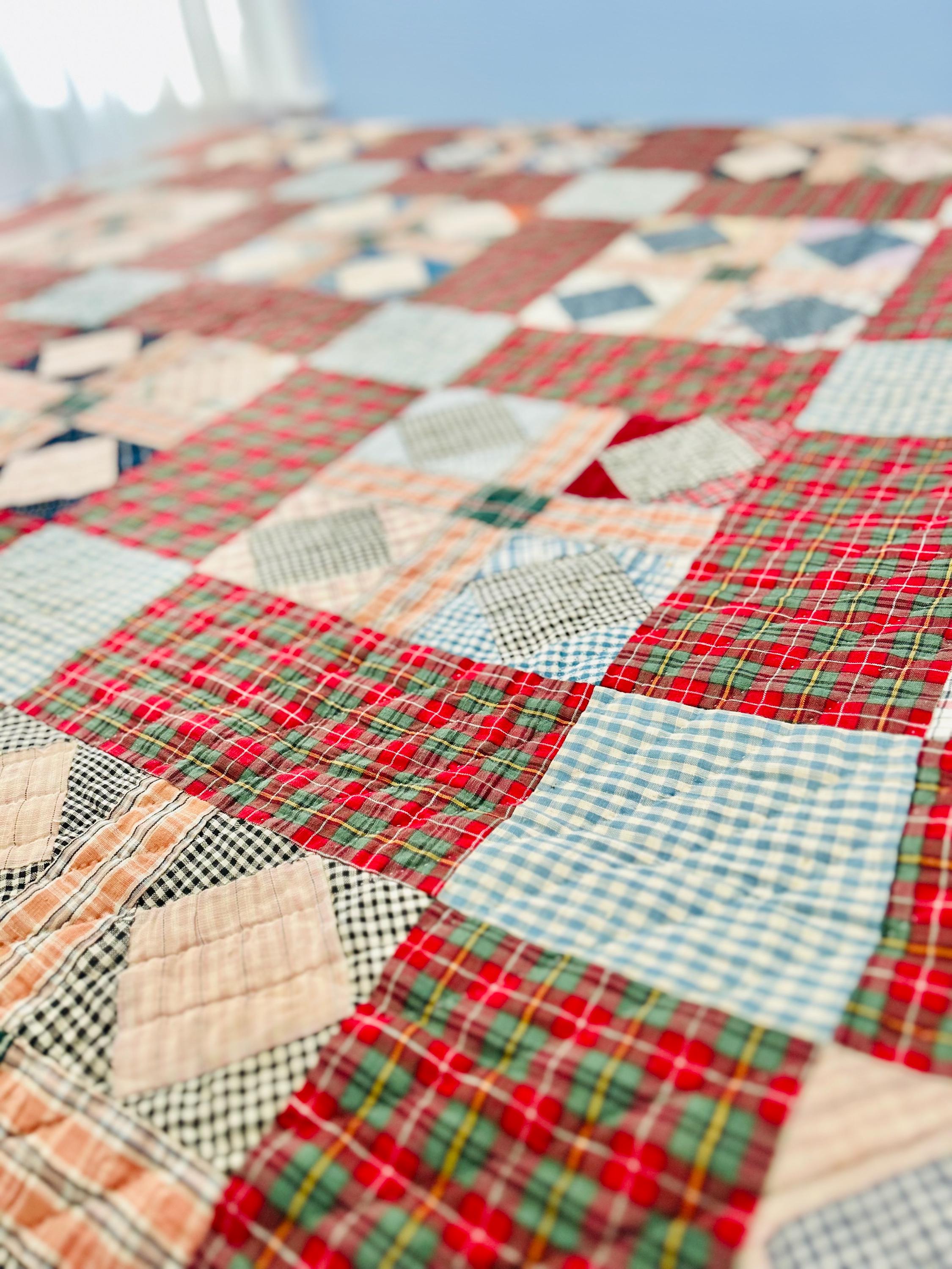 This beautifully preserved Alamanizer Quilt is a classic example of early American patchwork, combining traditional geometry with a warm, visually rich palette of plaids, stripes, and small-scale prints. It dates from the 1890s to 1910.