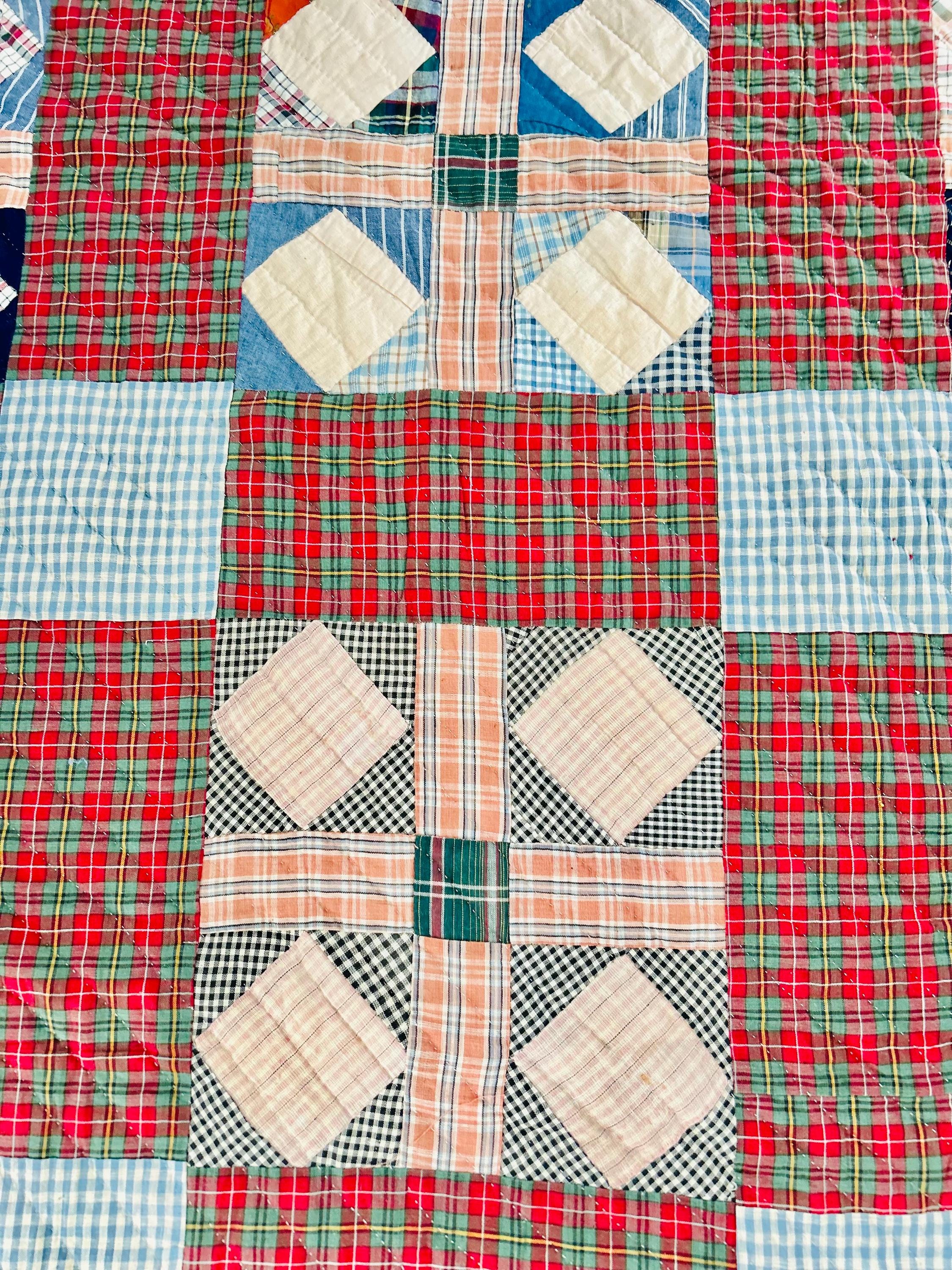 The quilt is hand pieced and hand quilted, featuring alternating blocks of diamonds set within squares, framed by plaid sashing. The fabrics include early cotton plaids, checks, shirtings, and printed motifs typical of late 19th to early 20th century quiltmaking. The hand-quilting is in a grid of diagonals.