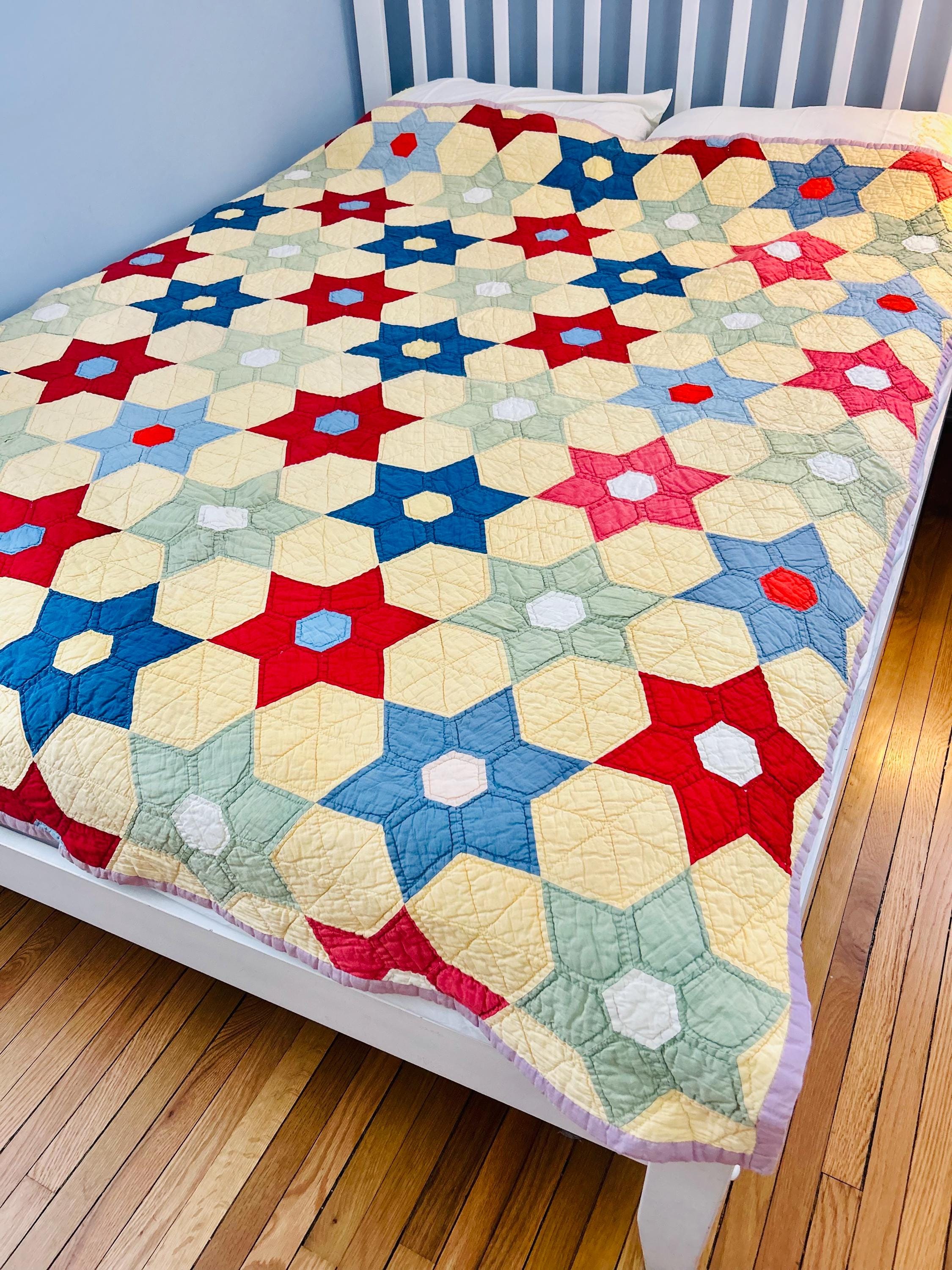The quilt is from a smoke-free, pet-free home and is pictured on a queen-size bed.