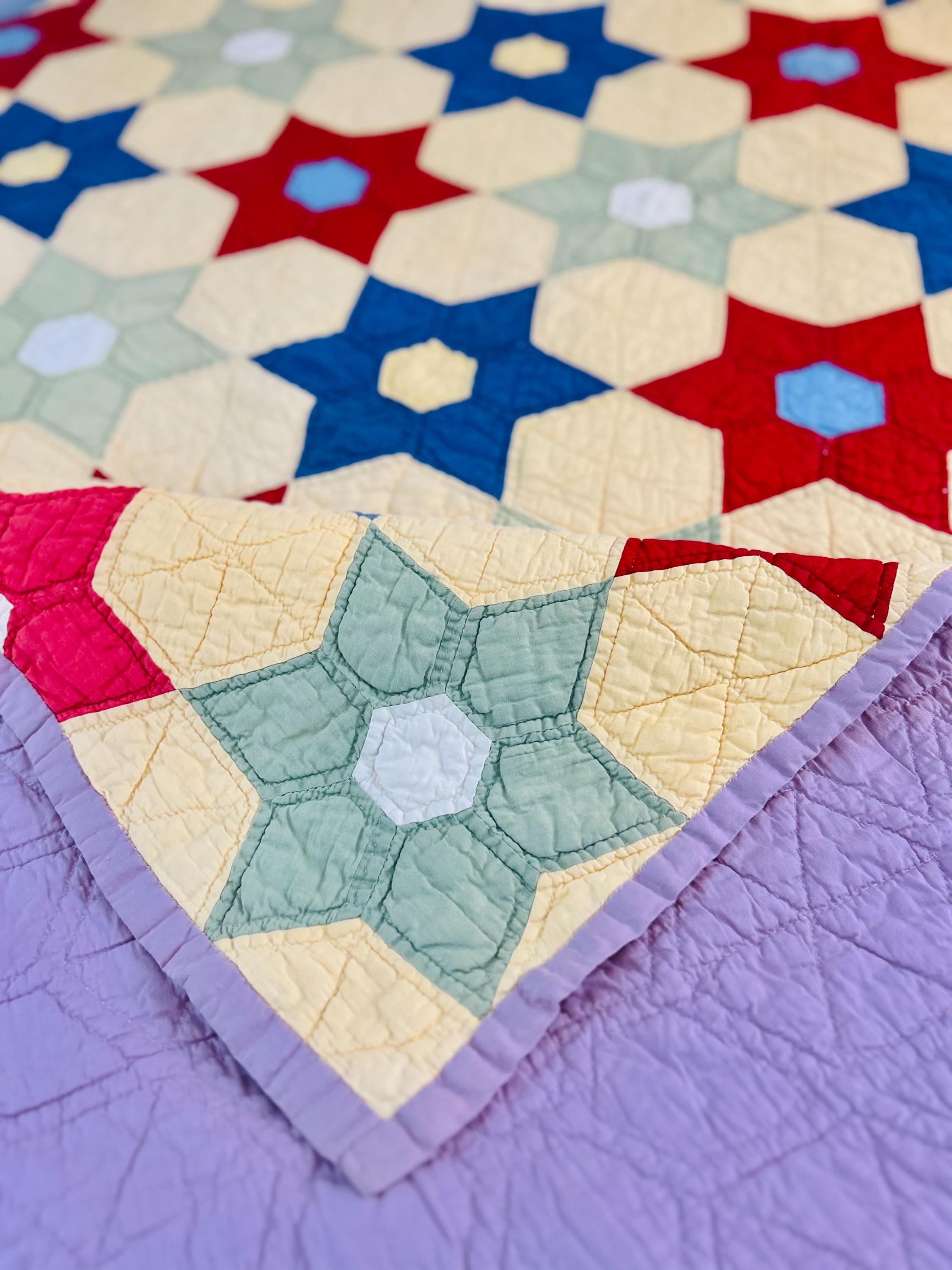 Details • Pattern: Aunt Etta's Diamond Star Quilt • Date: Circa 1940s–early 1950s • Construction: Hand pieced and hand quilted • Fabrics: Solid-color cottons • Backing: Solid lavender cotton • Binding: Self-binding from backing fabric • Size: 63” x 78” • Condition: Excellent vintage condition