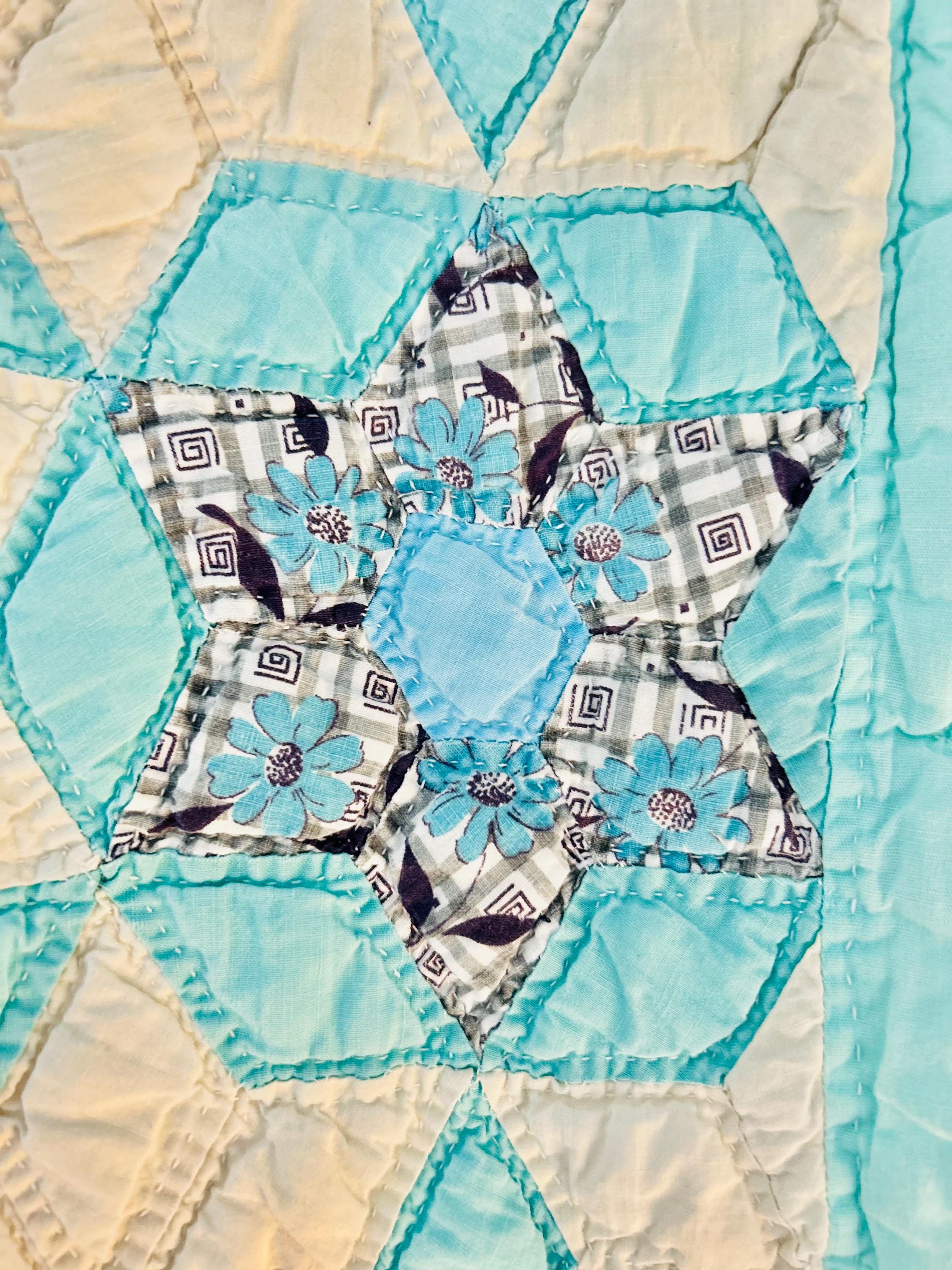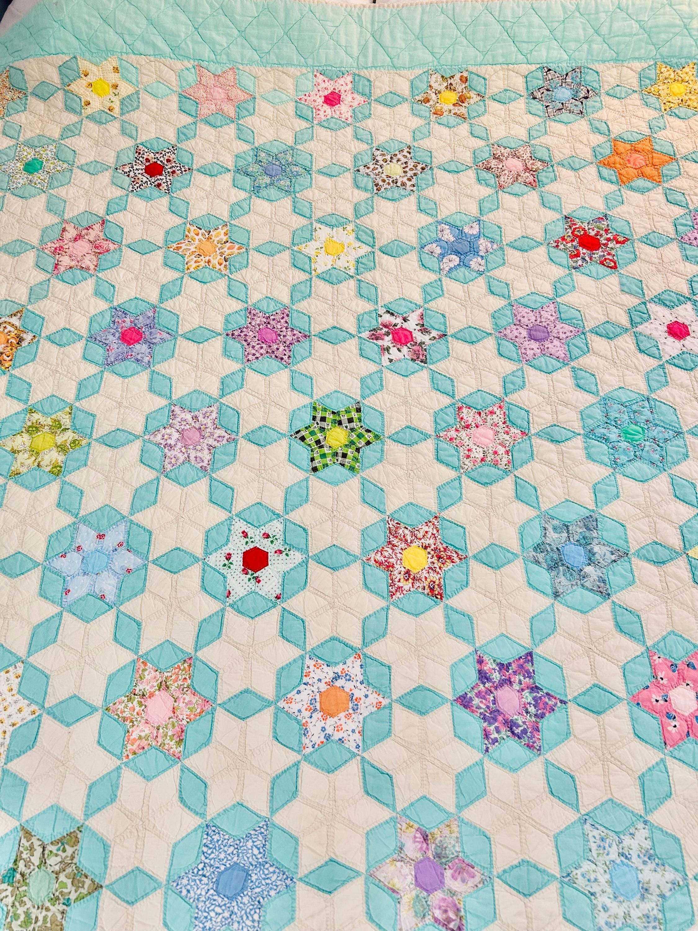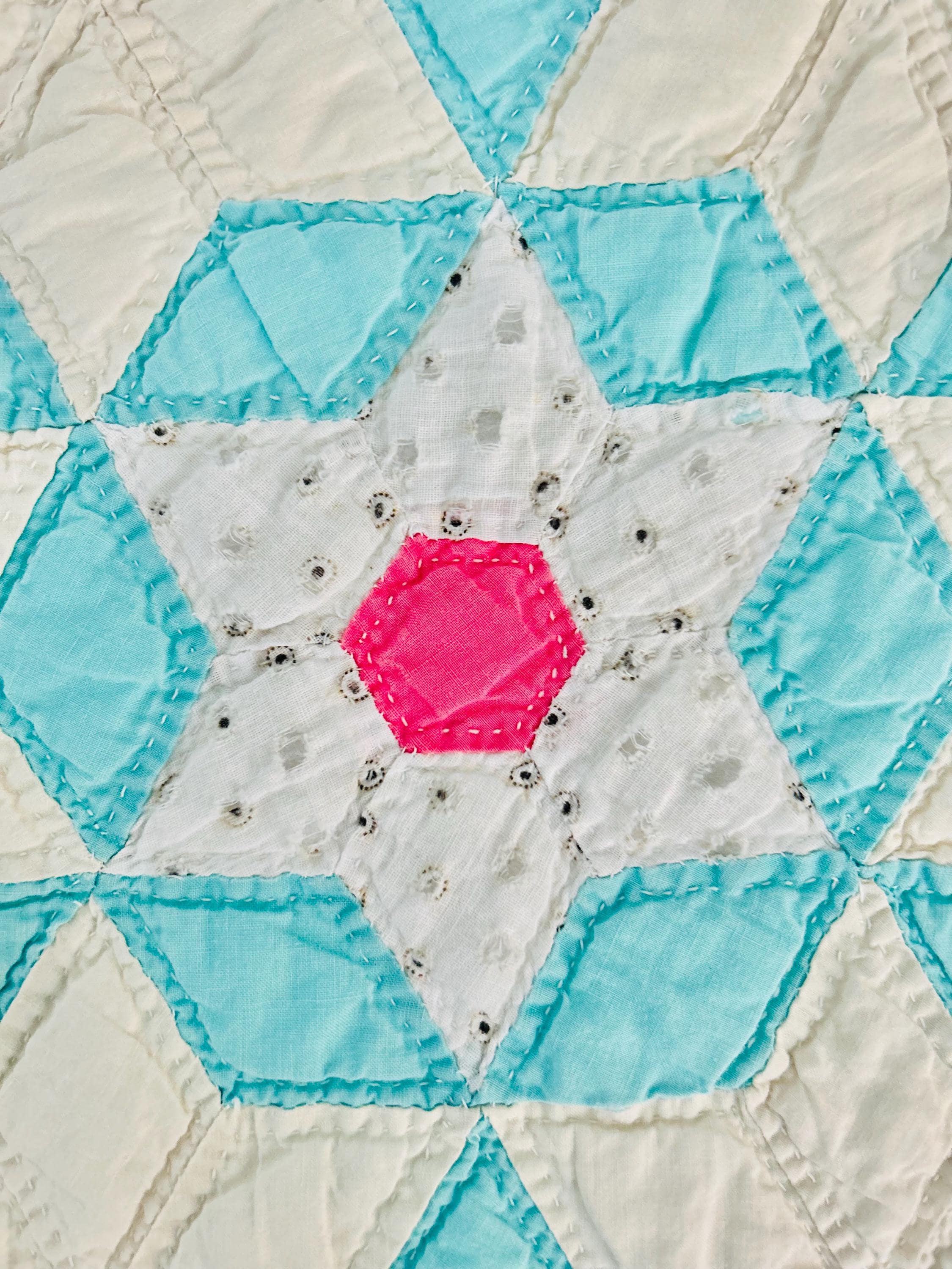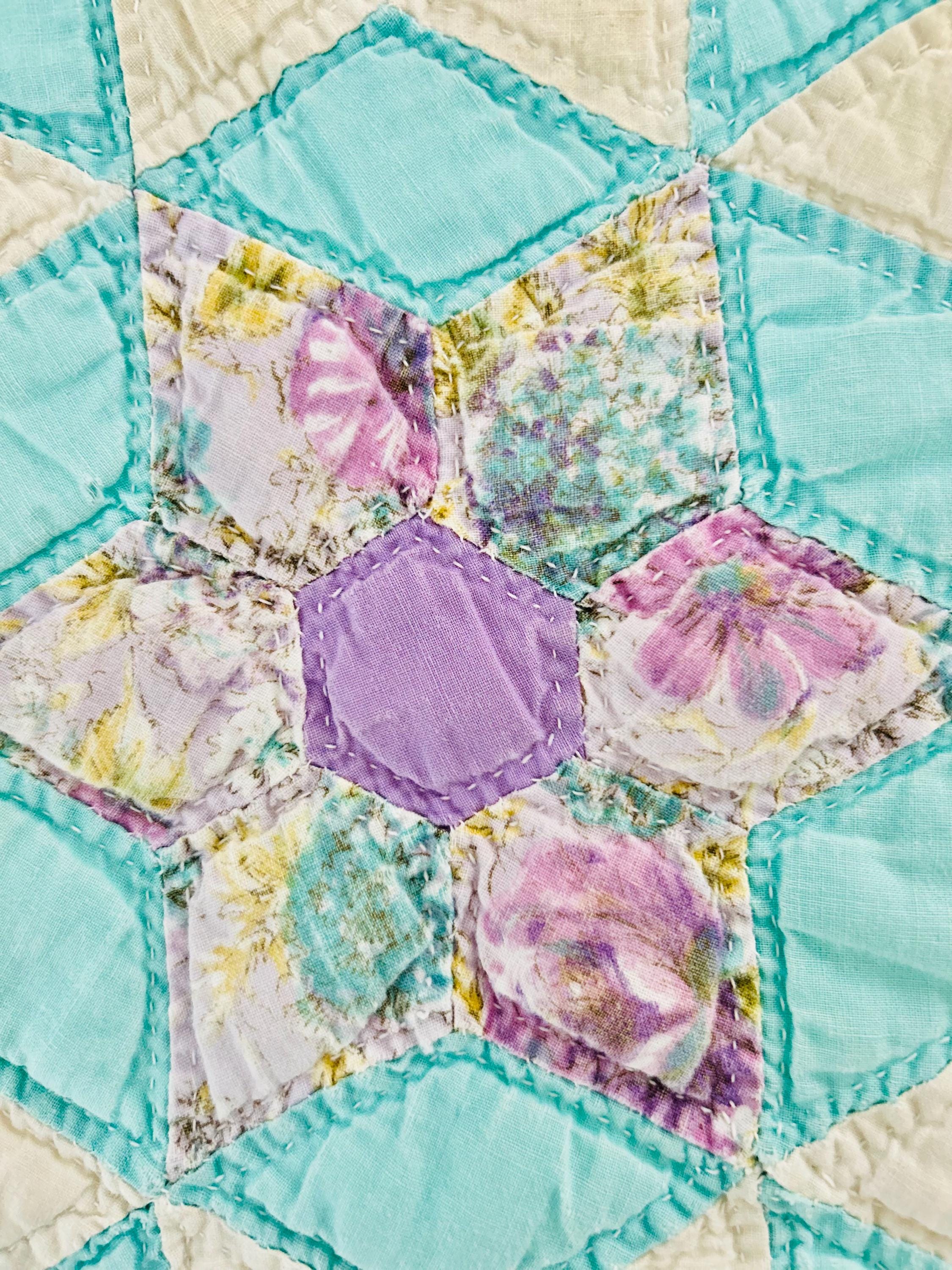 The quilt is arranged around seafoam aqua and white background with lavender, blush pink, peach, butter yellow, and red accent centers. The color palette and fabrics are quintessentially pre-WWII. Hand quilting throughout is fine and steady and is in outlines of the 1.5" by 3" diamonds and the 1-inch hexagon centers. Quilting along the four-sided seafoam/aqua border is in a cross-hatch grid.