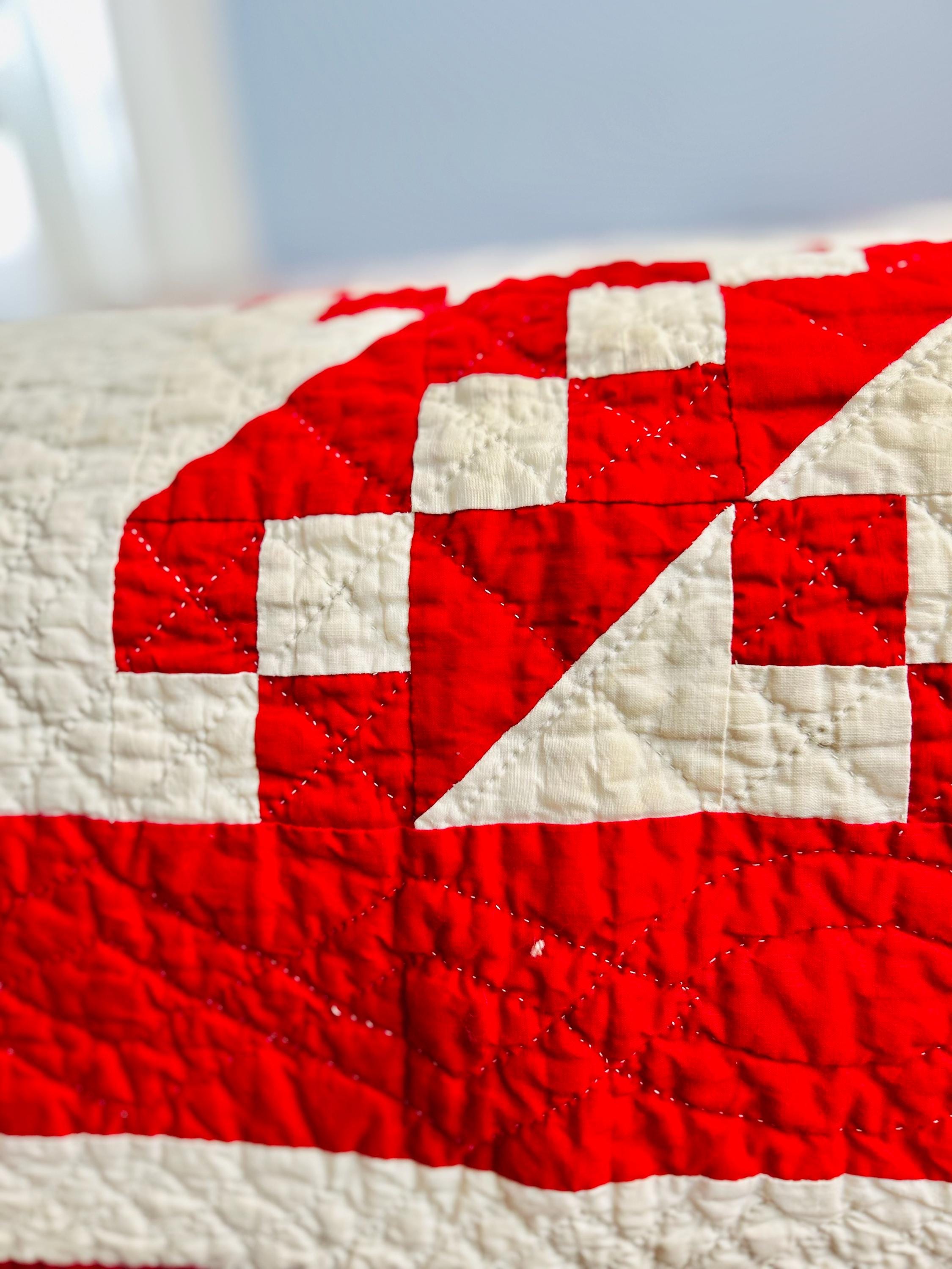 Details: • Pattern: Jacob’s Ladder (diagonal setting) • Date: circa 1915–1925 • Construction: hand pieced and hand quilted • Fabrics: solid red and white cotton • Batting: lightweight cotton • Size: 76” x 79” • Condition: excellent antique condition with some light toning of the white fabric (see photos).