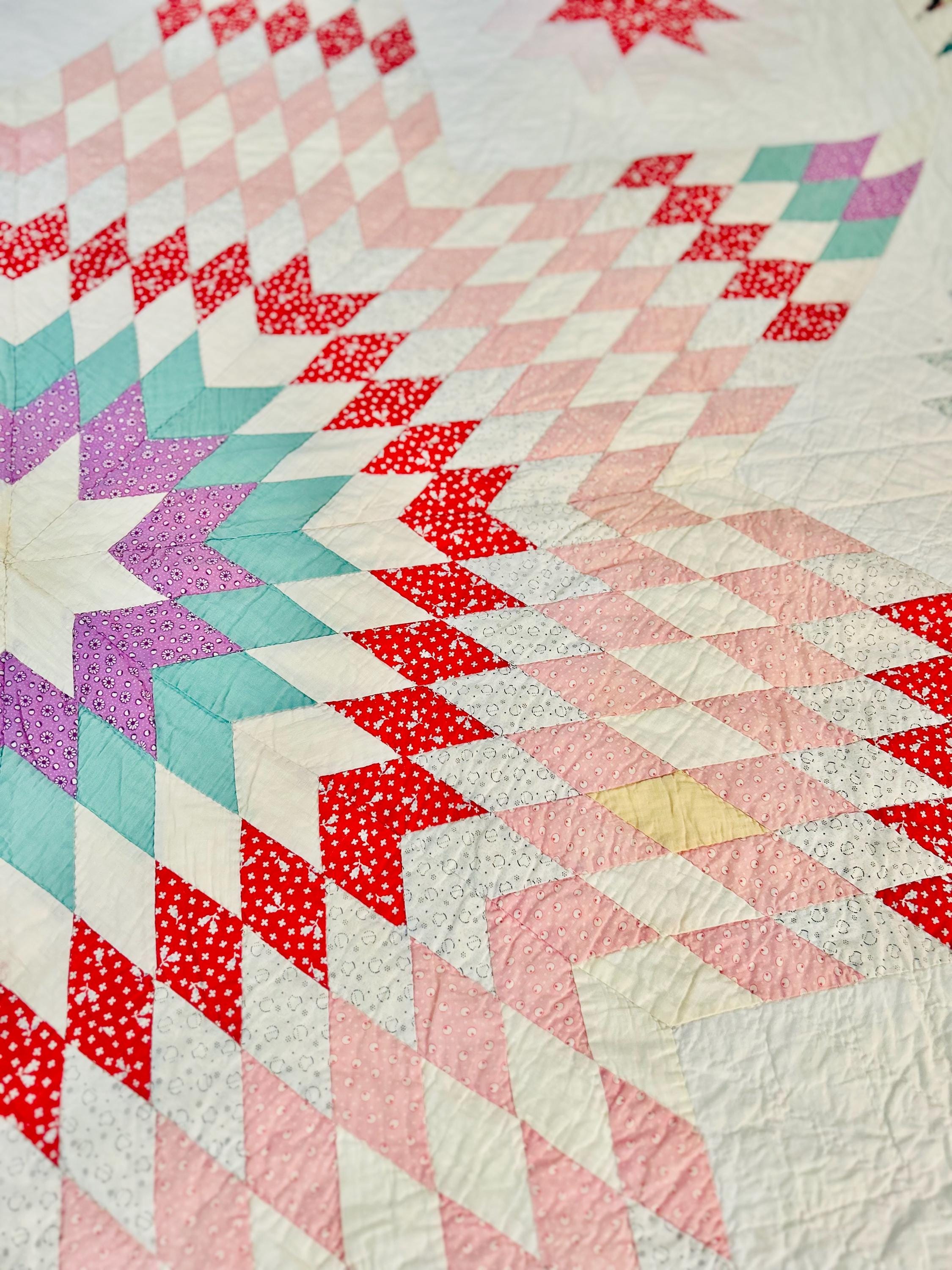 This striking Lone Star (Bethlehem Star) quilt dates to the 1930s–early 1940s and features a beautifully graduated star bursting from a soft ivory ground. The maker used classic Depression-era pastel cottons—blush pinks, lavender, mint, butter yellow, and vivid red—creating exceptional movement and visual depth. The fine hand-quilting is in outlines of the patchwork diamonds and in diamonds in the white areas.