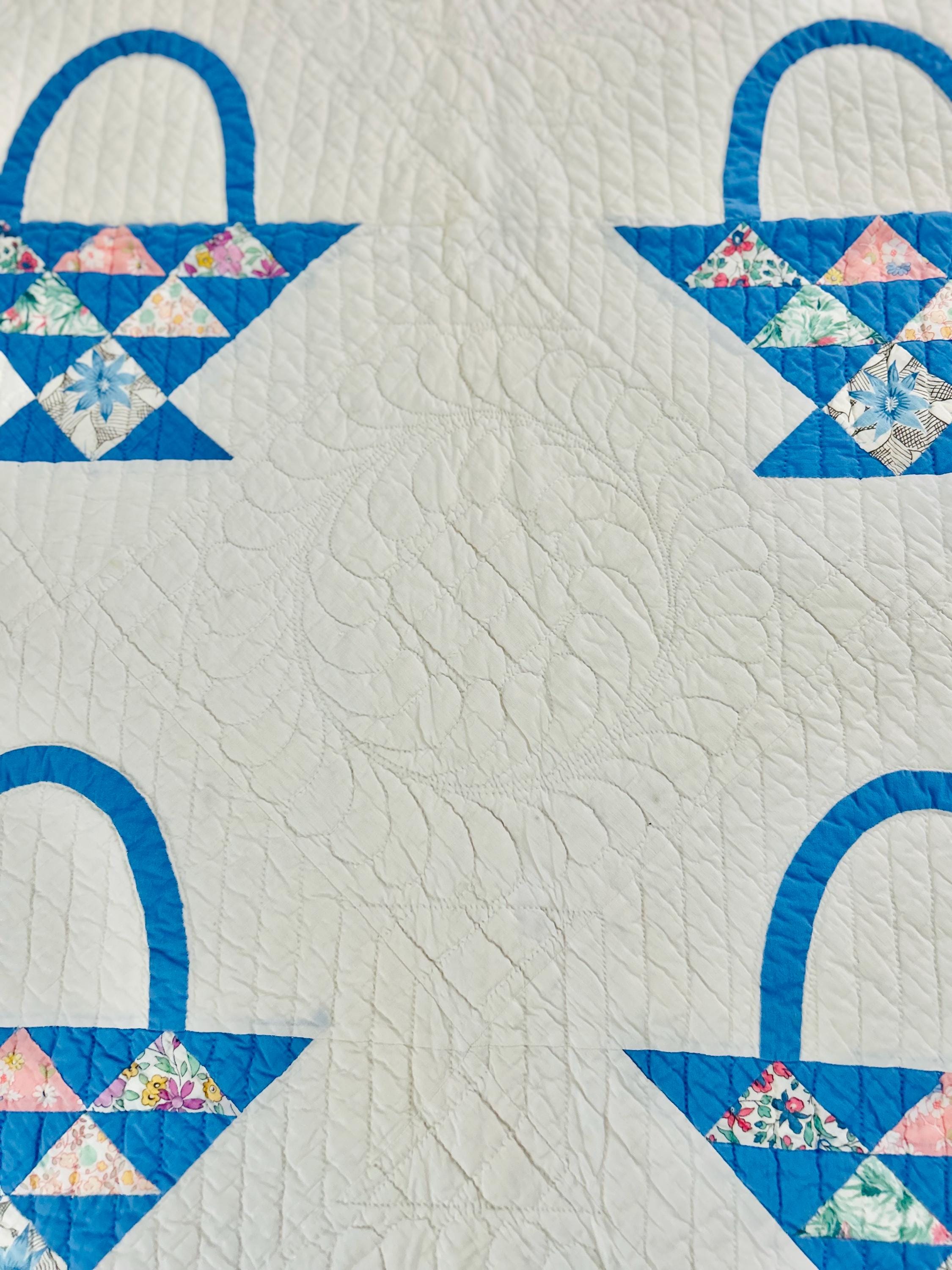 Details: • Era: Circa 1930s–early 1940s • Construction: Hand pieced & hand quilted • Size: 78" x 96" • Fabrics: Depression-era floral cottons • Color scheme: White ground with blue accents • Condition: Excellent vintage condition • Design: Basket Quilt