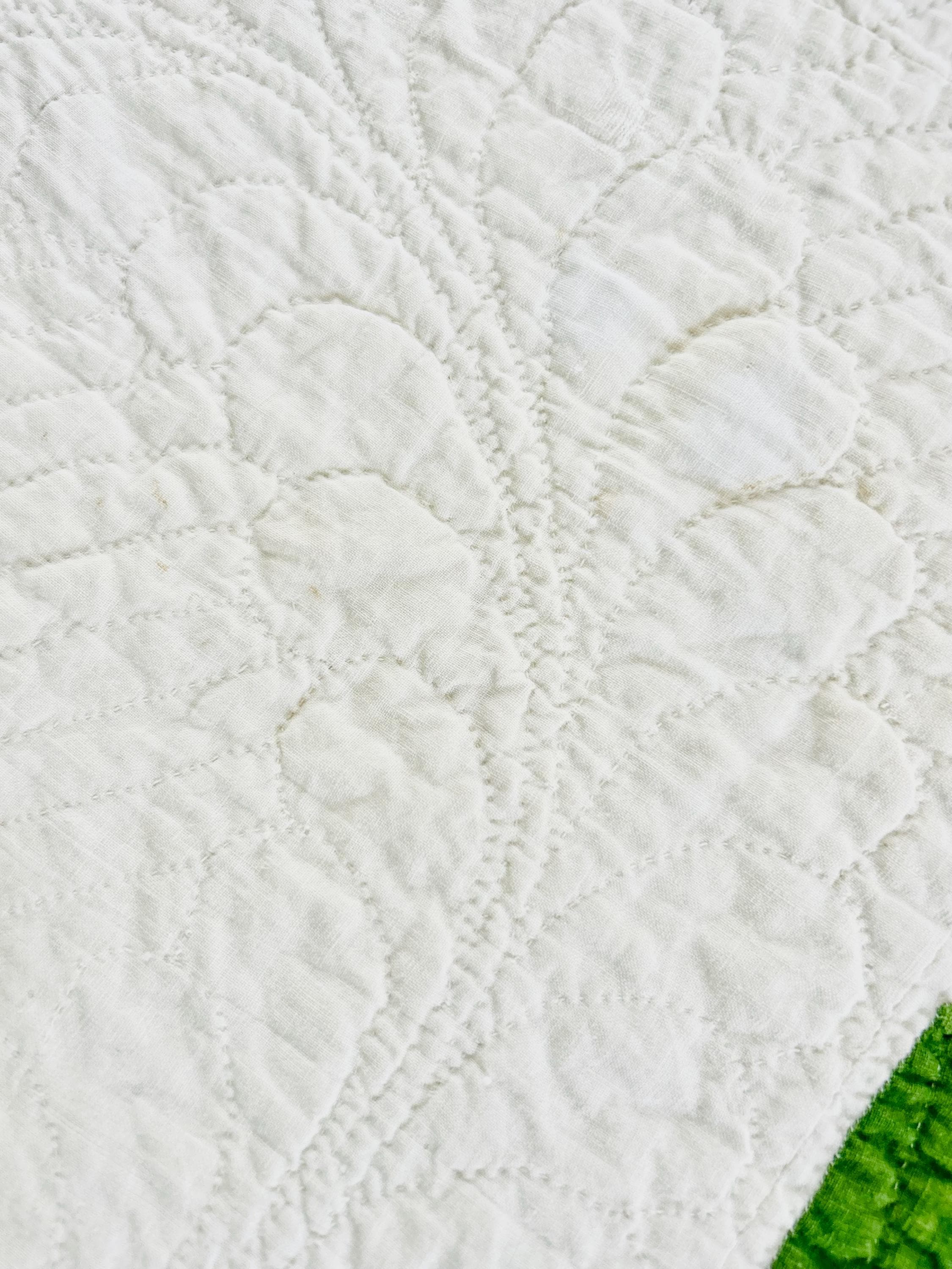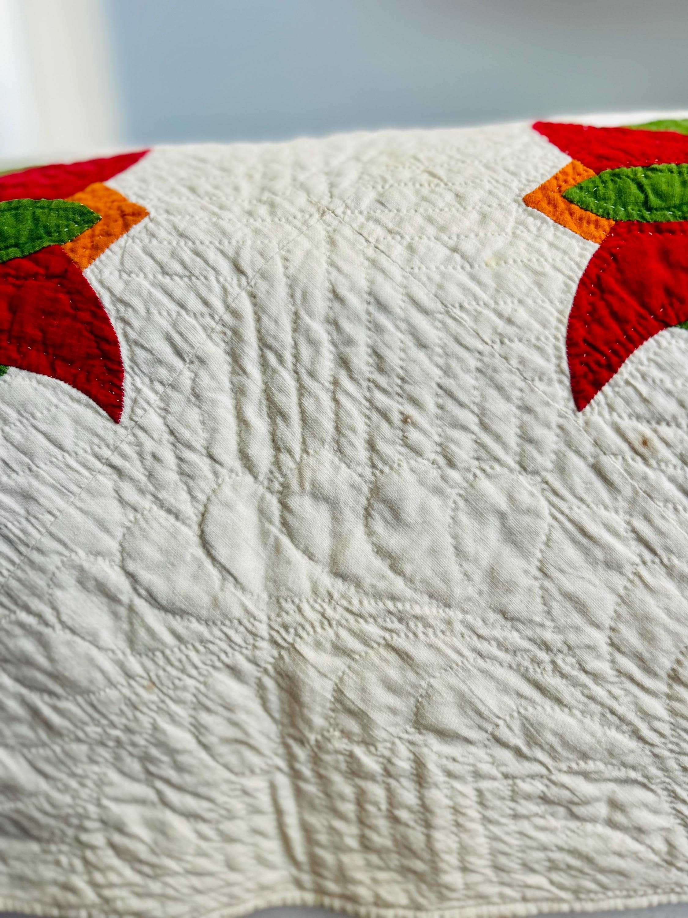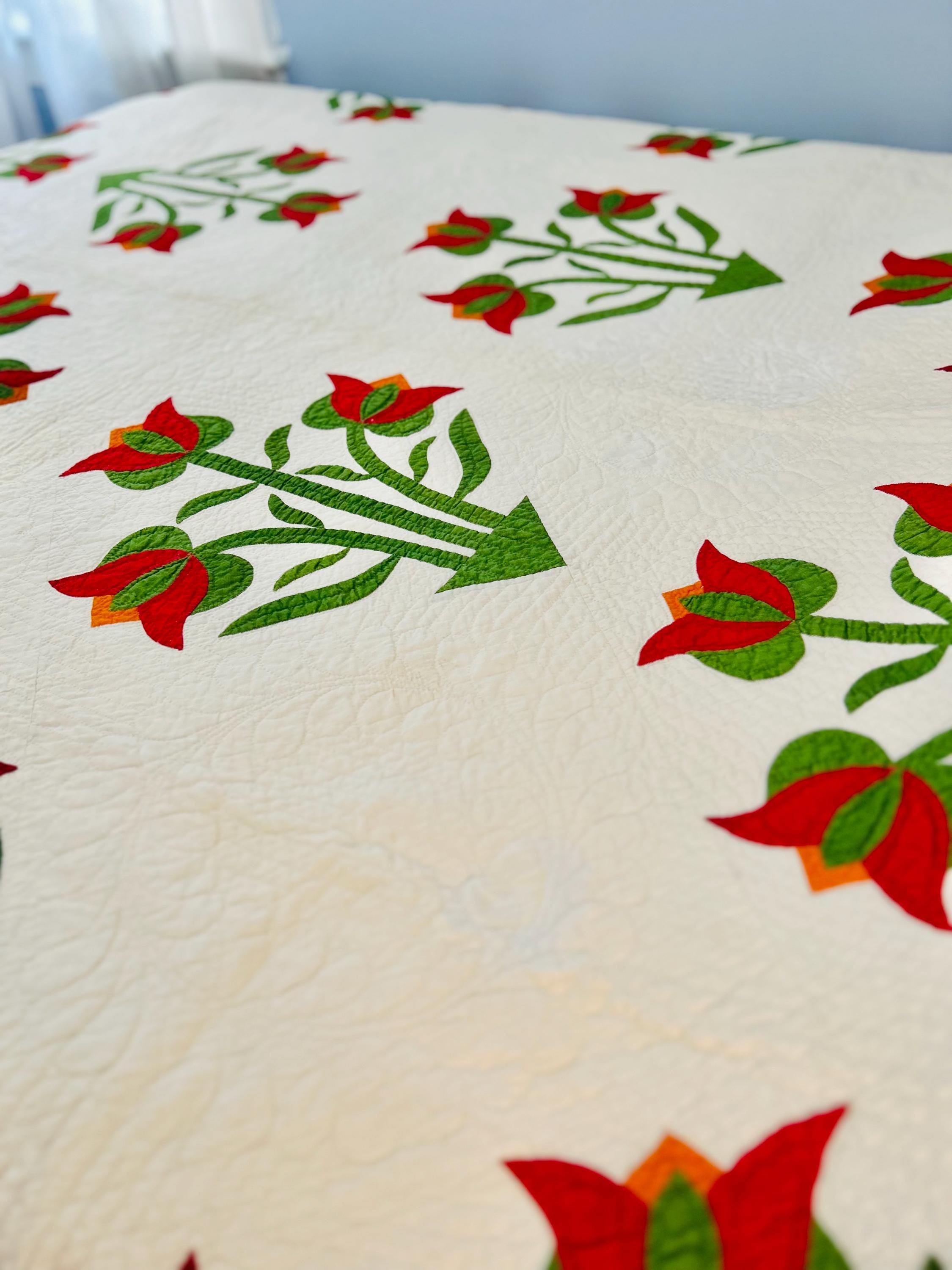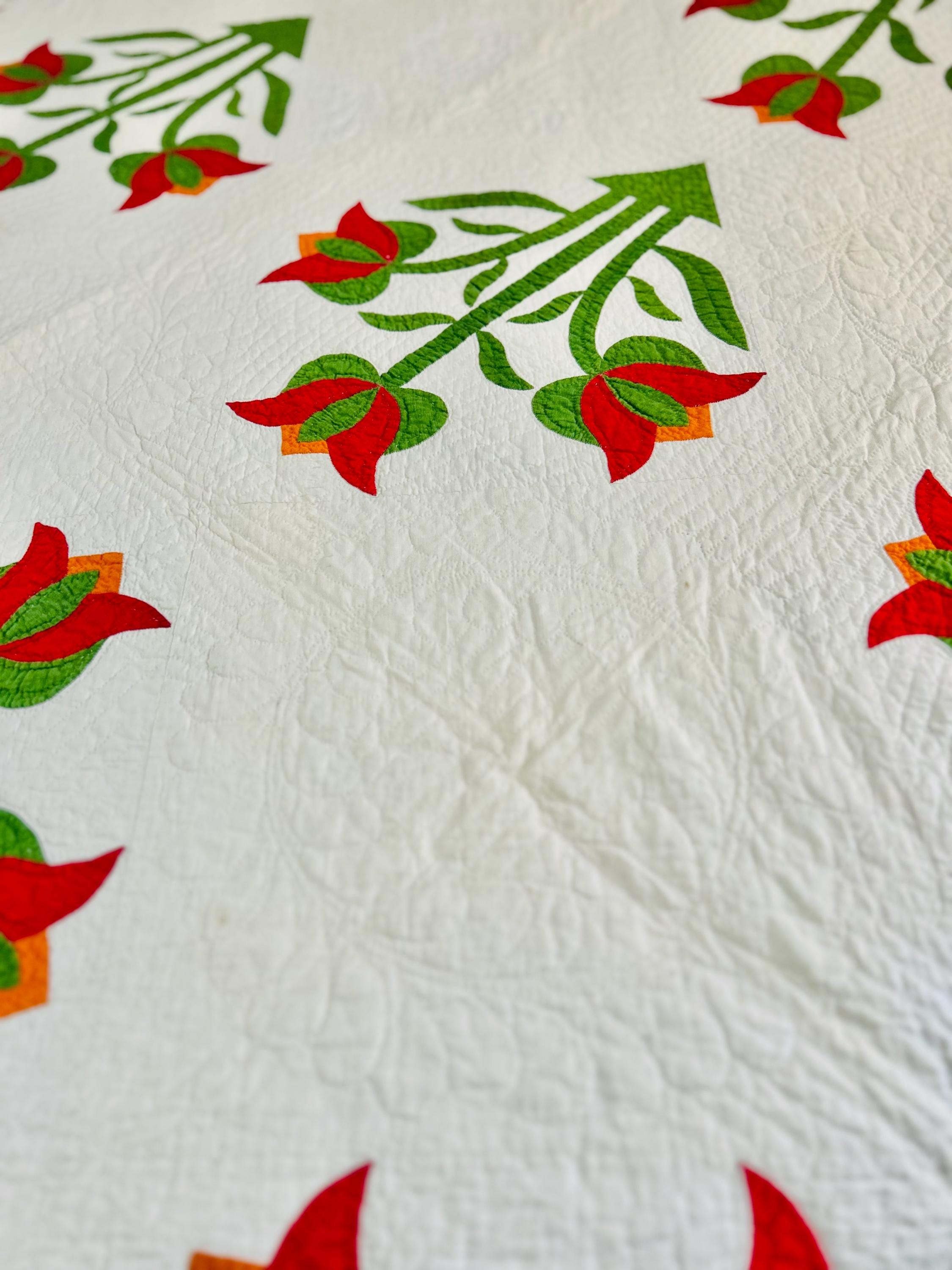 This exquisite antique tulip basket quilt dates from the late 19th century to early 1900s (1890-1910) and features an all-over arrangement of hand-appliquéd tulips on a crisp white ground. Each basket is formed with rich red tulips, vibrant green stems and leaves, and a warm orange accent, creating a striking floral design. The hand-quilting is so dense in some areas it is stippled while everywhere it is finely done in very, very tiny stitches and in patterns that include feathers, feather wreaths, and diagonal grids.