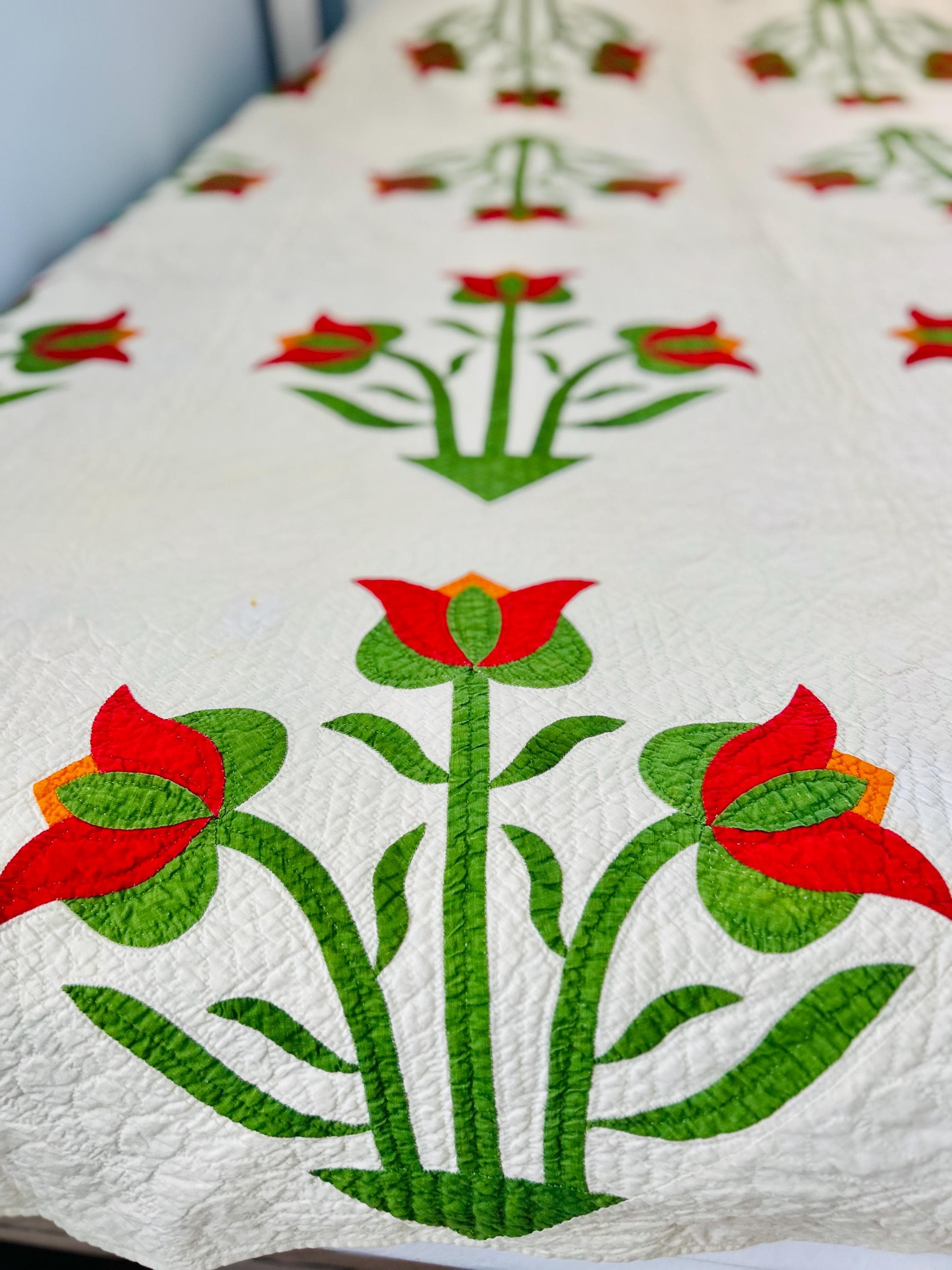 Details: • Date: circa 1890-1910 • Pattern: Tulip Basket (all-over layout) • Construction: hand appliquéd, hand quilted • Size: 78” x 80” • Condition: excellent antique condition