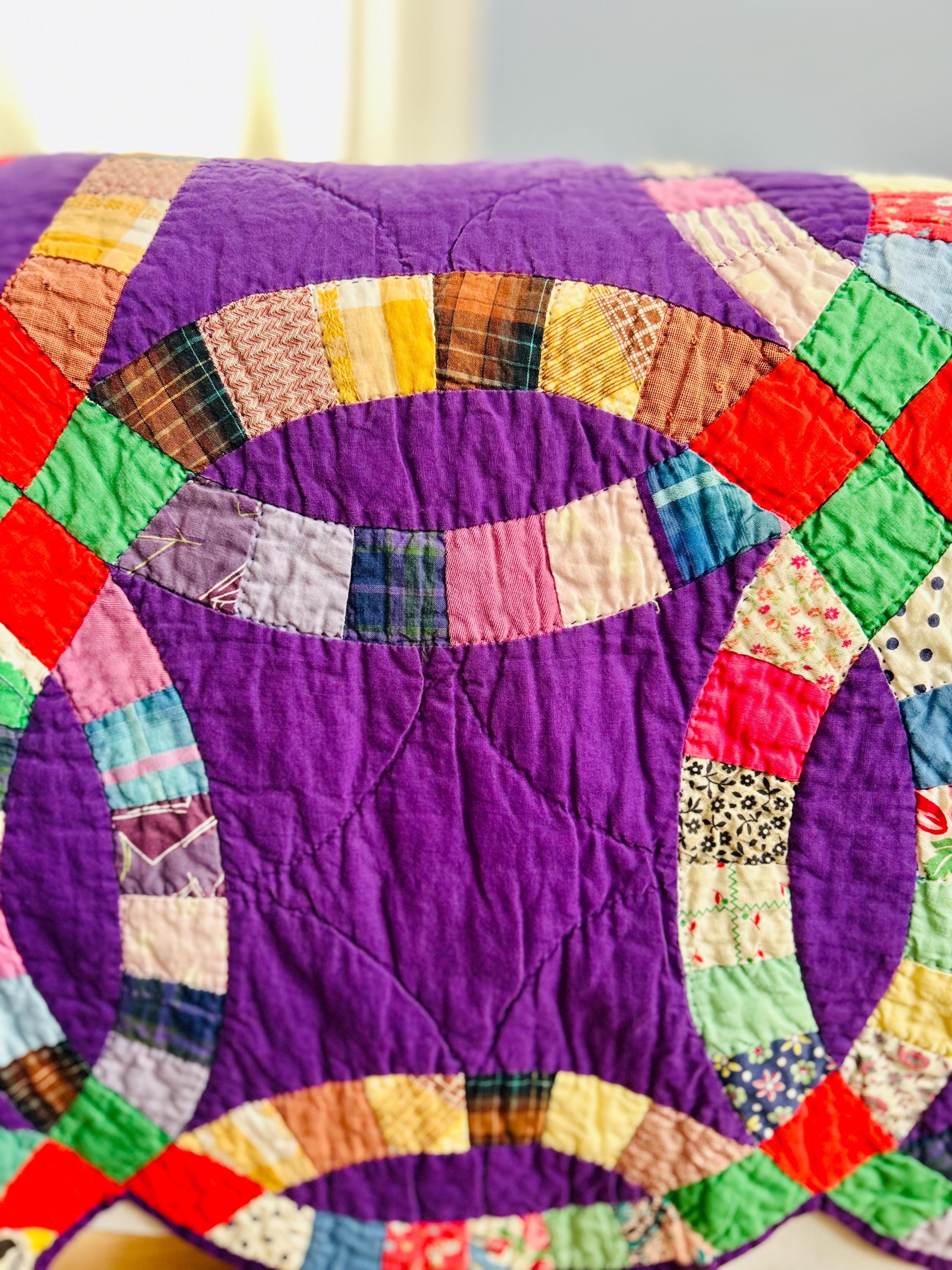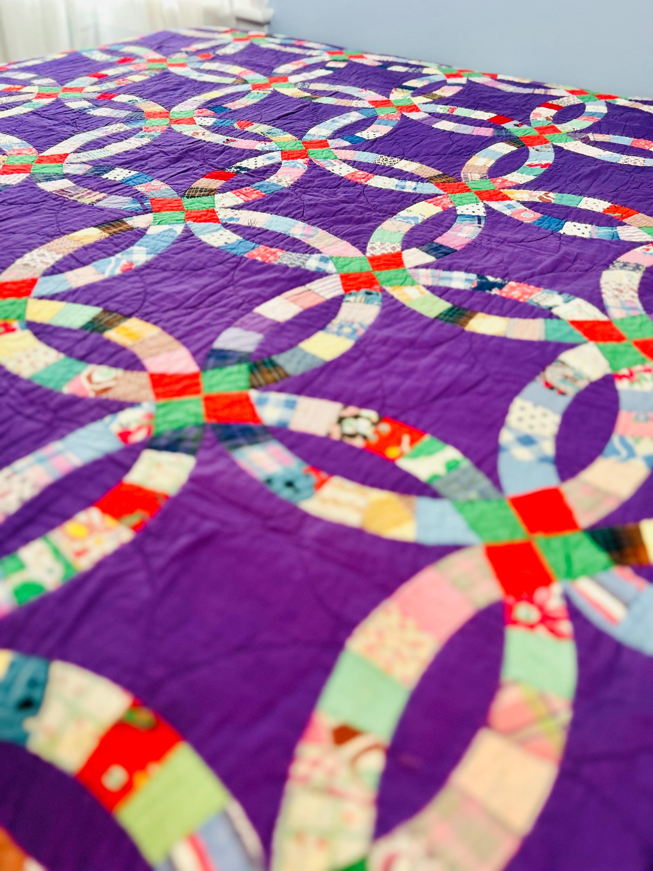 This beautiful Double Wedding Ring quilt dates to the 1940s, and was constructed from a charming mix of authentic 1930s and 1940s cotton prints, including feedsack florals, ginghams, plaids, polka dots, and novelty patterns, all set against a striking solid purple background.