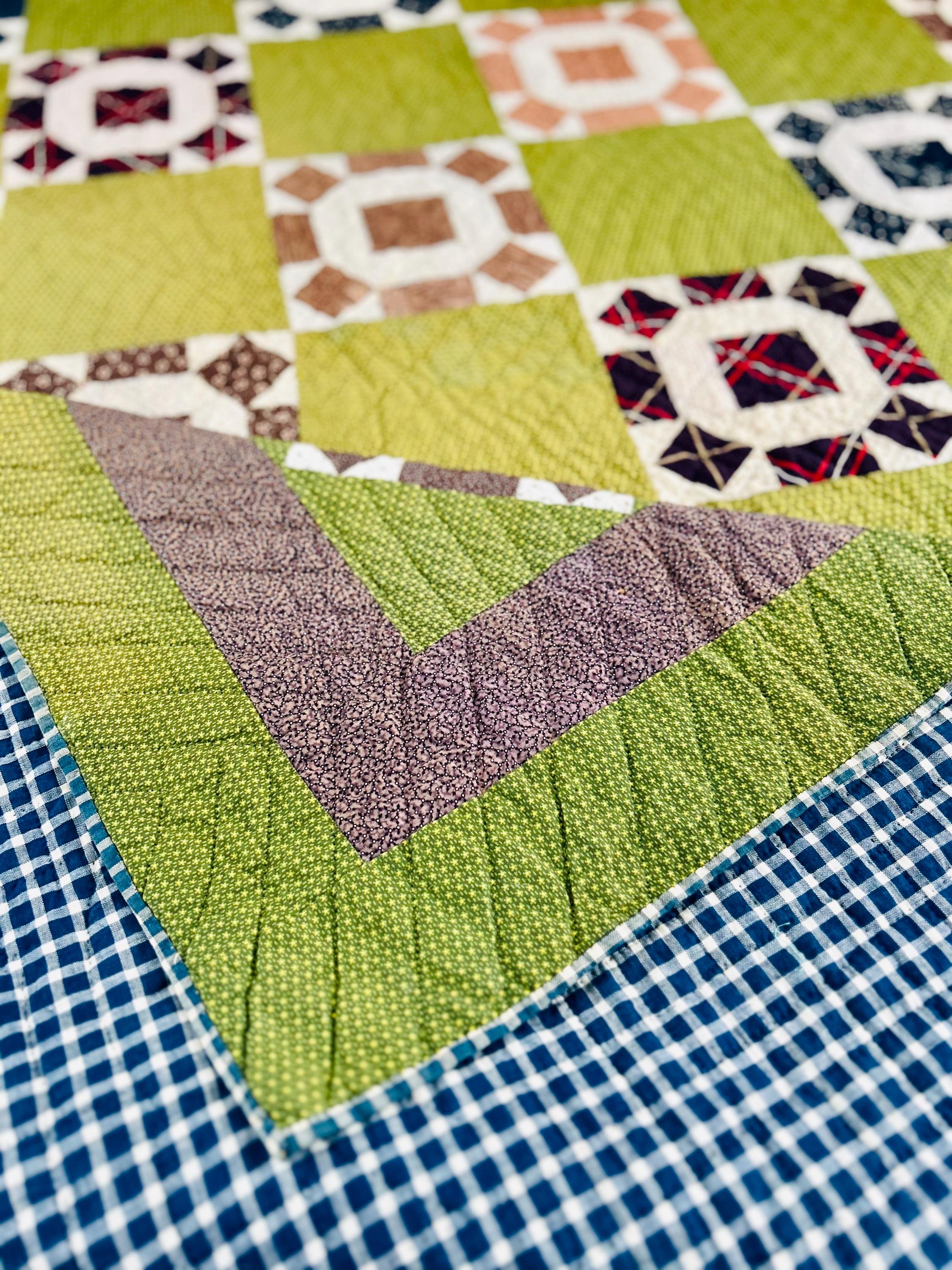 This Garden of Eden Quilt dates to the early 20th century (circa 1905–1920s) and remains in remarkable, never-washed condition. Hand pieced and hand quilted in black thread, the color palette is striking, with rich olive green/tiny yellow prints accented by early browns, indigo blues, and small-scale shirting prints characteristic of the period. The hand-quilting is in a repeating shell pattern.