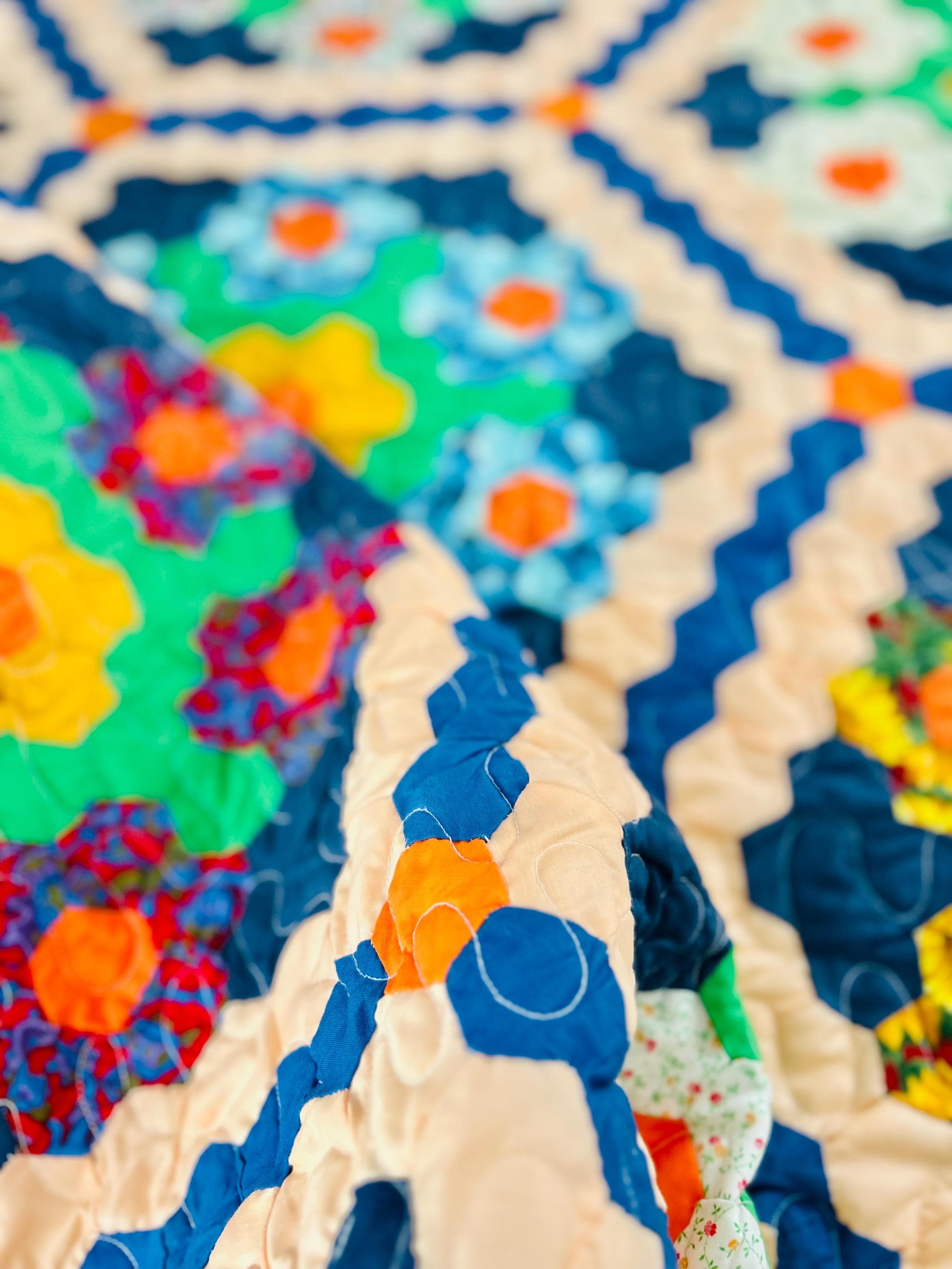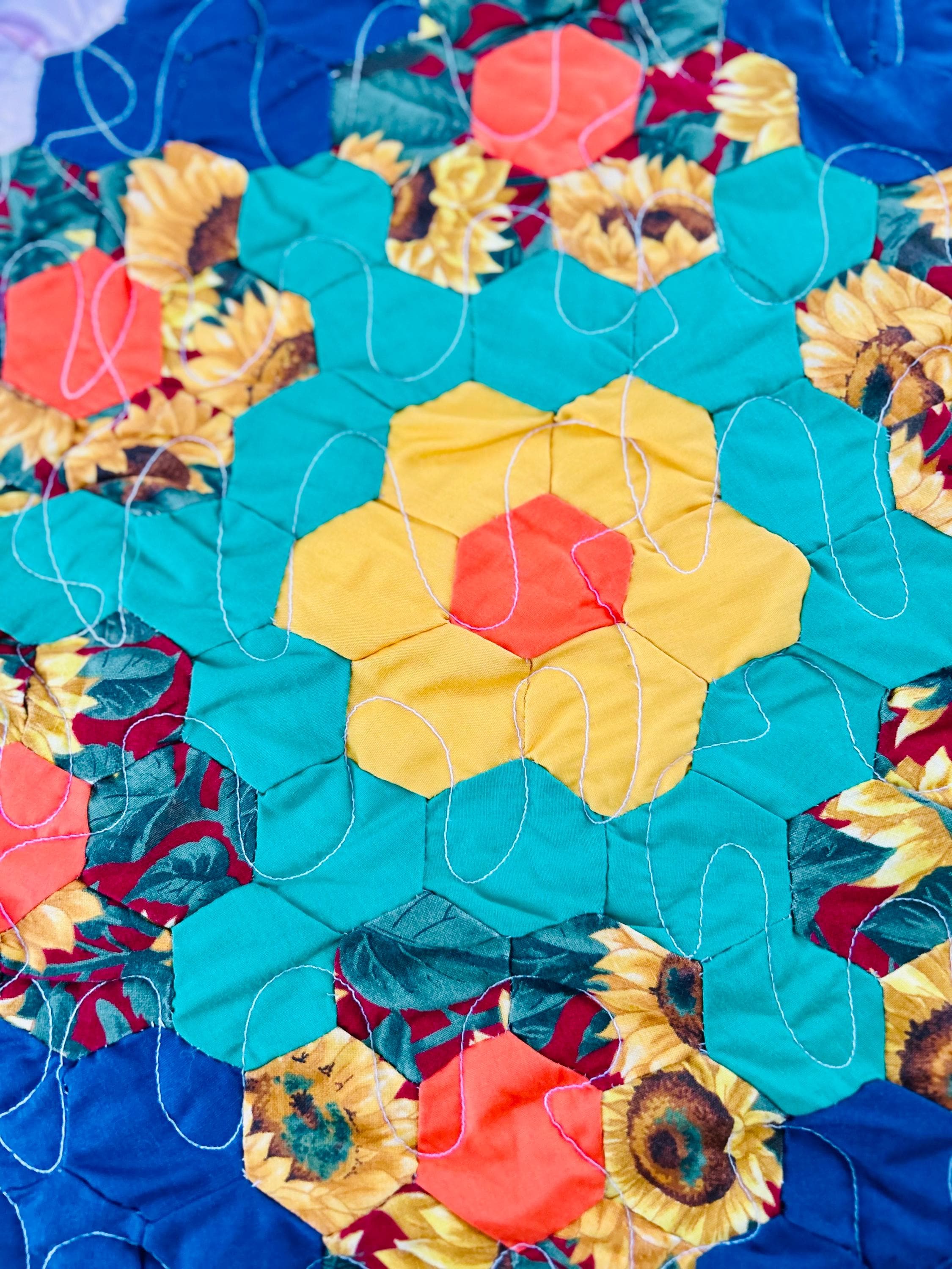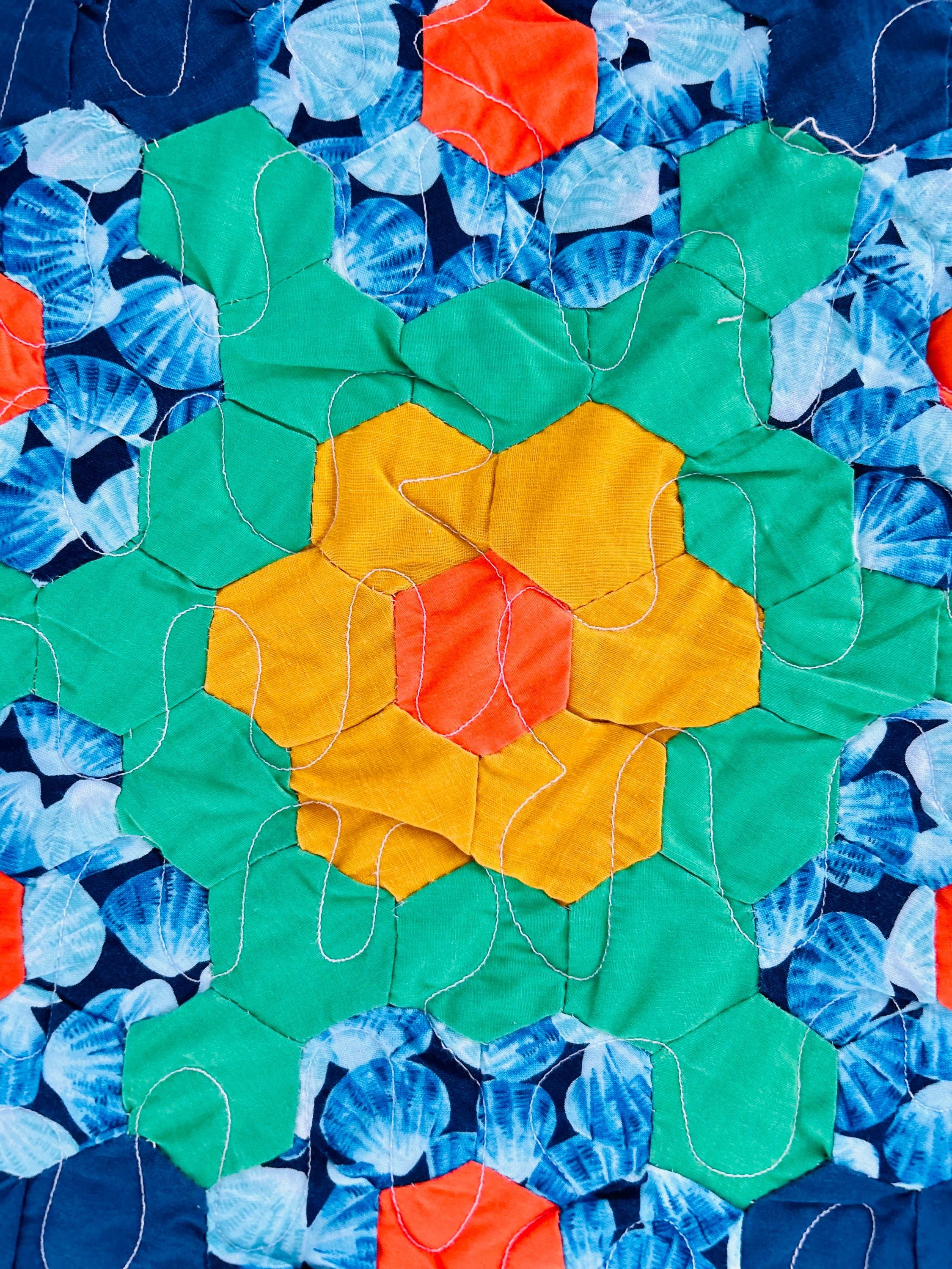The fabrics are bold and even joyful modern, high-quality cottons in turquoise, coral, chartreuse, navy, pinks, and sunny yellows, all framed by peach pathways. Hand-pieced from more than 2,000 individual hexagons, the quilt has been finished with long-arm quilting in waves and curlicues.