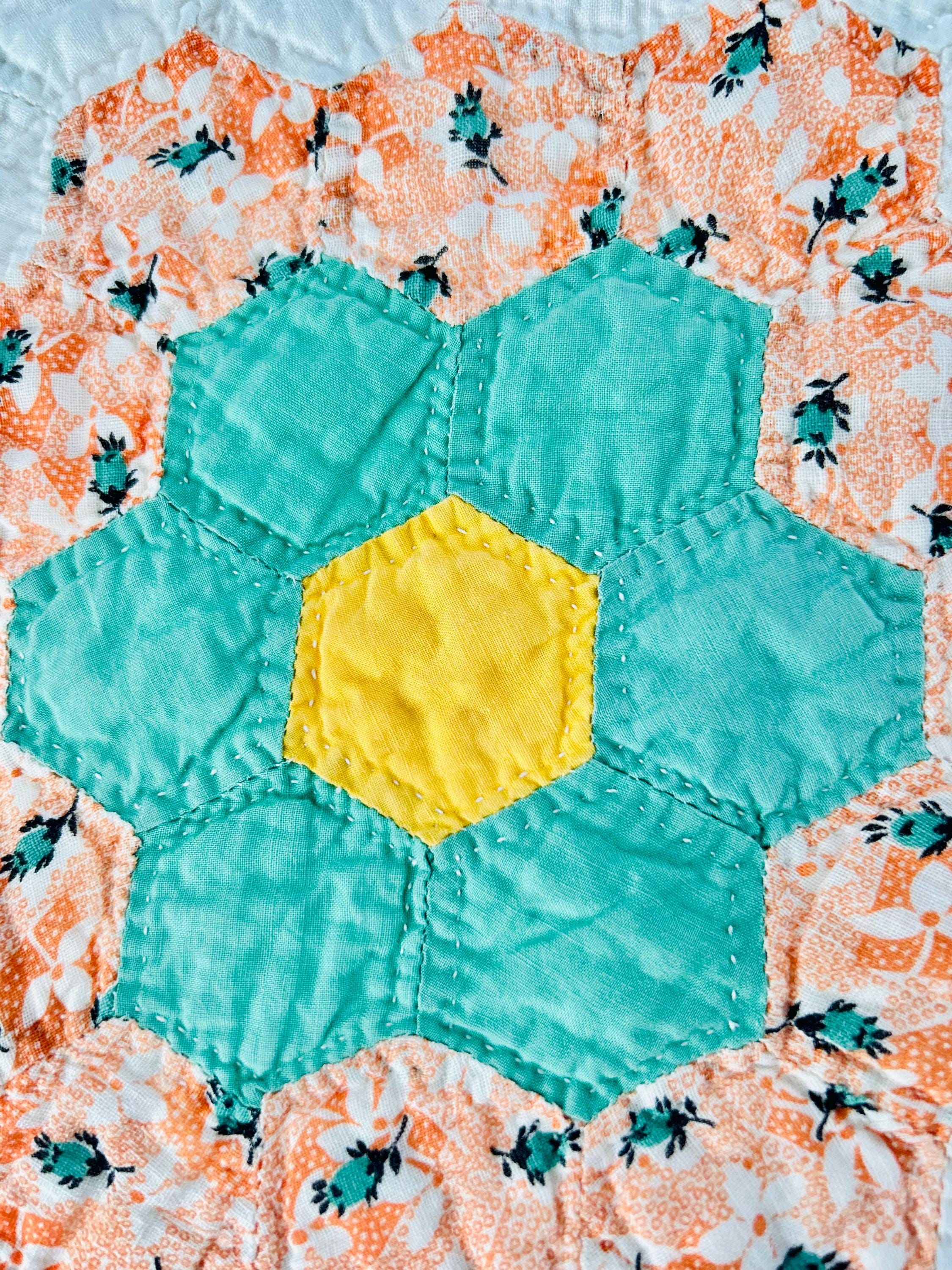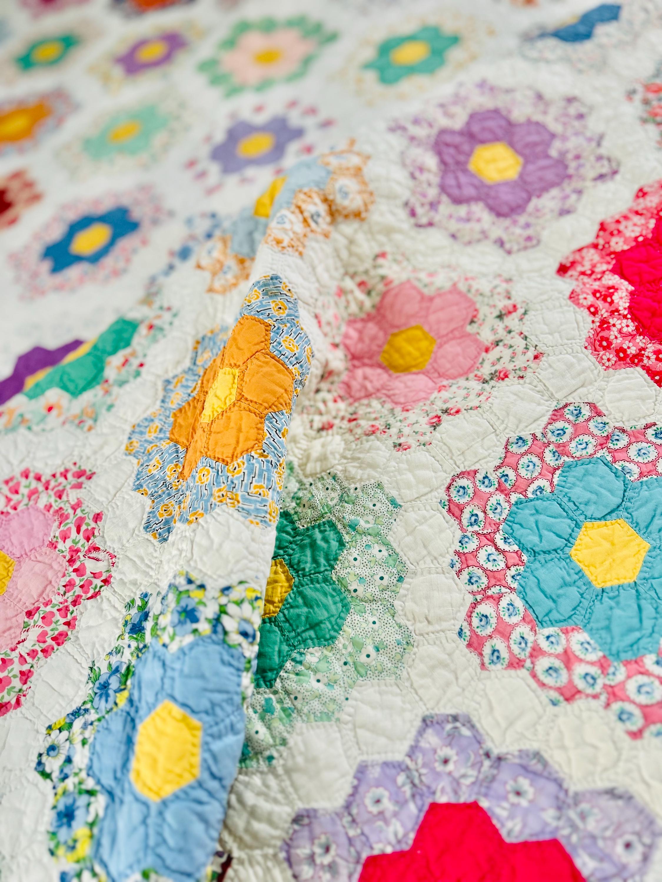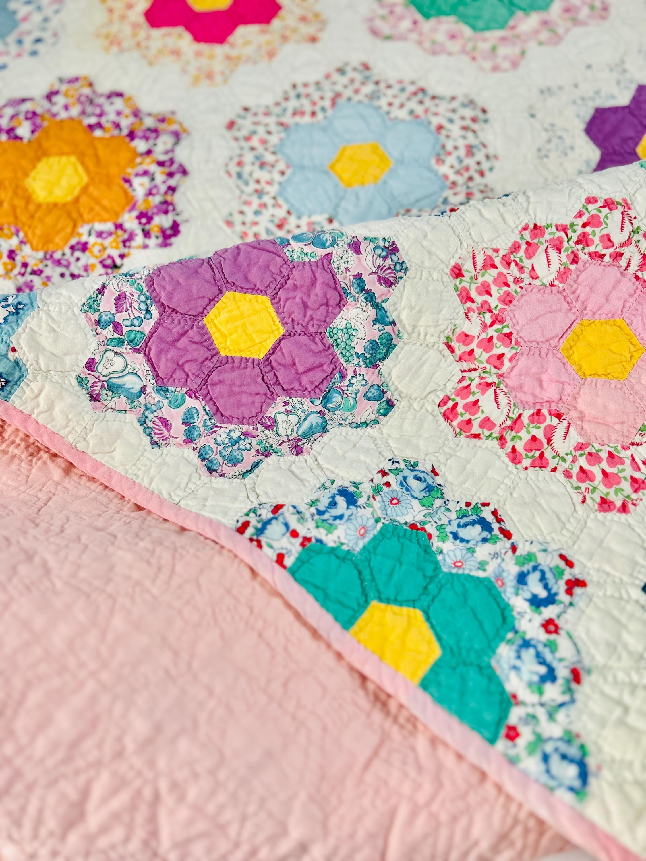 The quilt features hundreds of individually pieced “flower gardens" each with a yellow hexagon center, arranged across a soft ivory ground. The fabrics include a wonderful variety of original 1930s cotton prints, including delicate florals and feed-sack style patterns in cheerful pastel and jewel tones. The back is a soft vintage pink cotton that has been turned to the front and hand-stitched to form the binding. The cotton batting is lightweight.