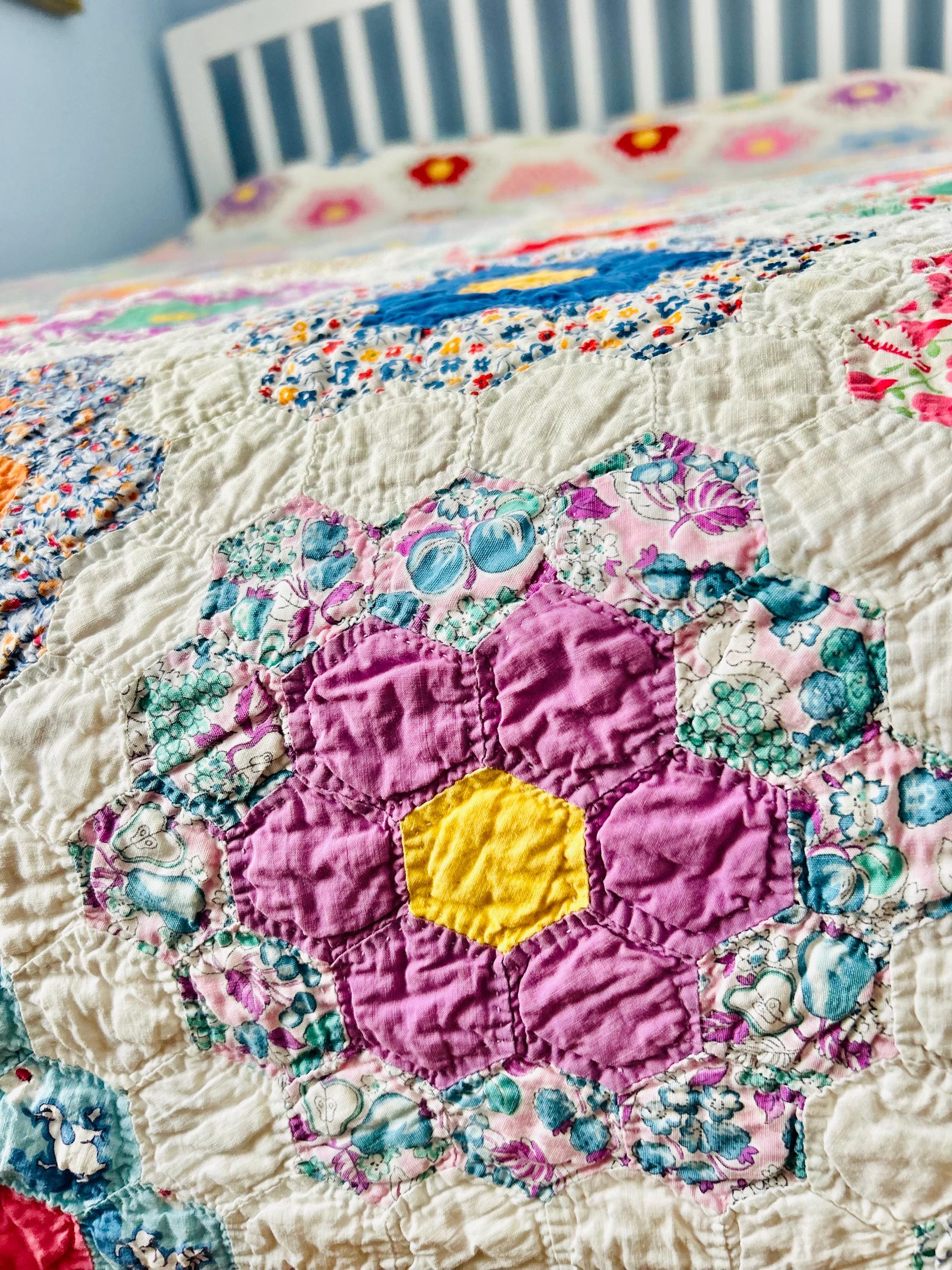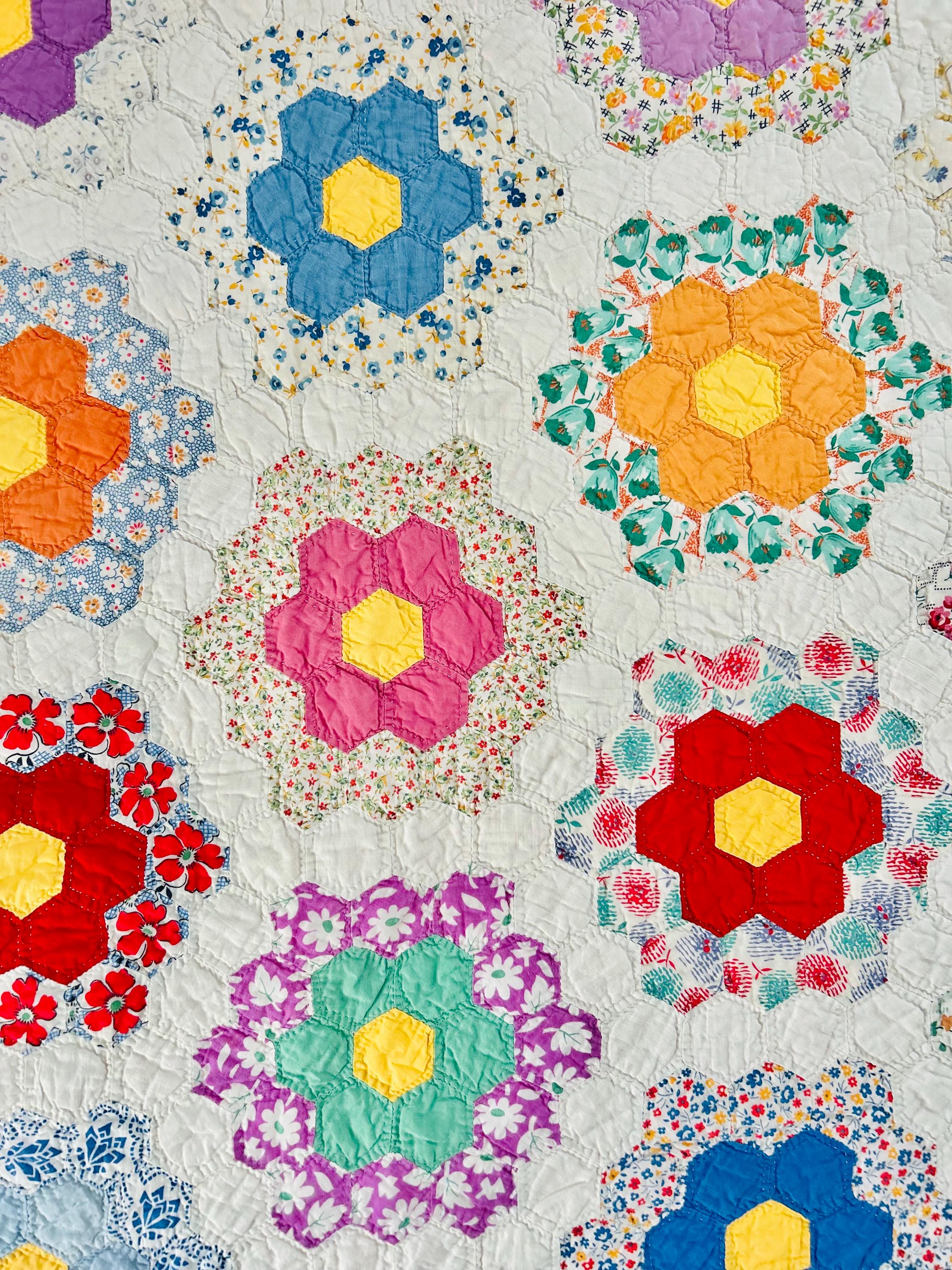 Details: • Pattern: Grandmother’s Flower Garden • Date: Circa 1920s–1930s • Construction: Hand-pieced & hand-quilted • Materials: Vintage cotton prints • Size: 77” x 82” • Condition: Excellent condition