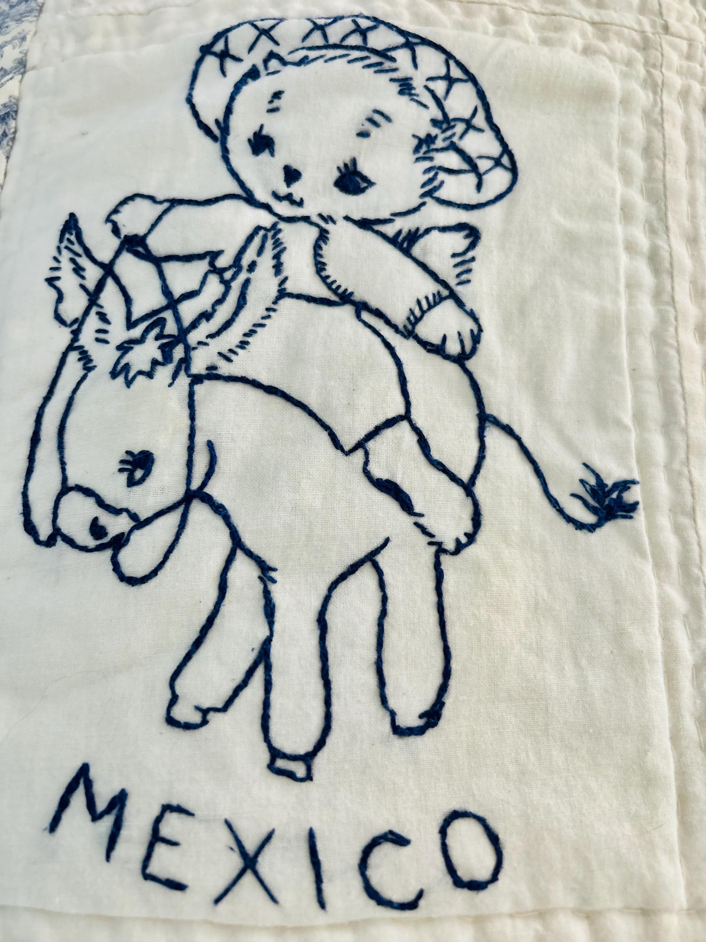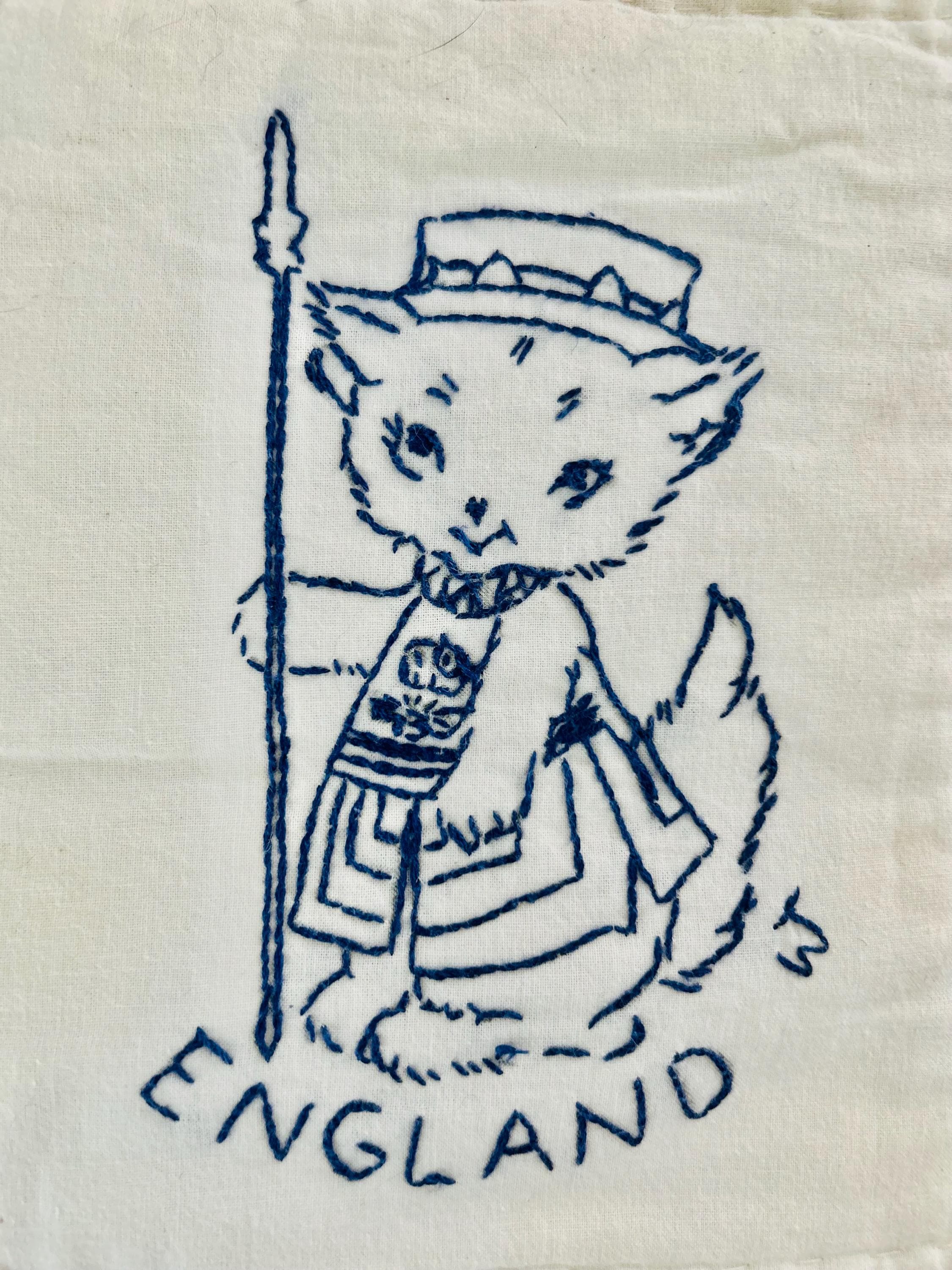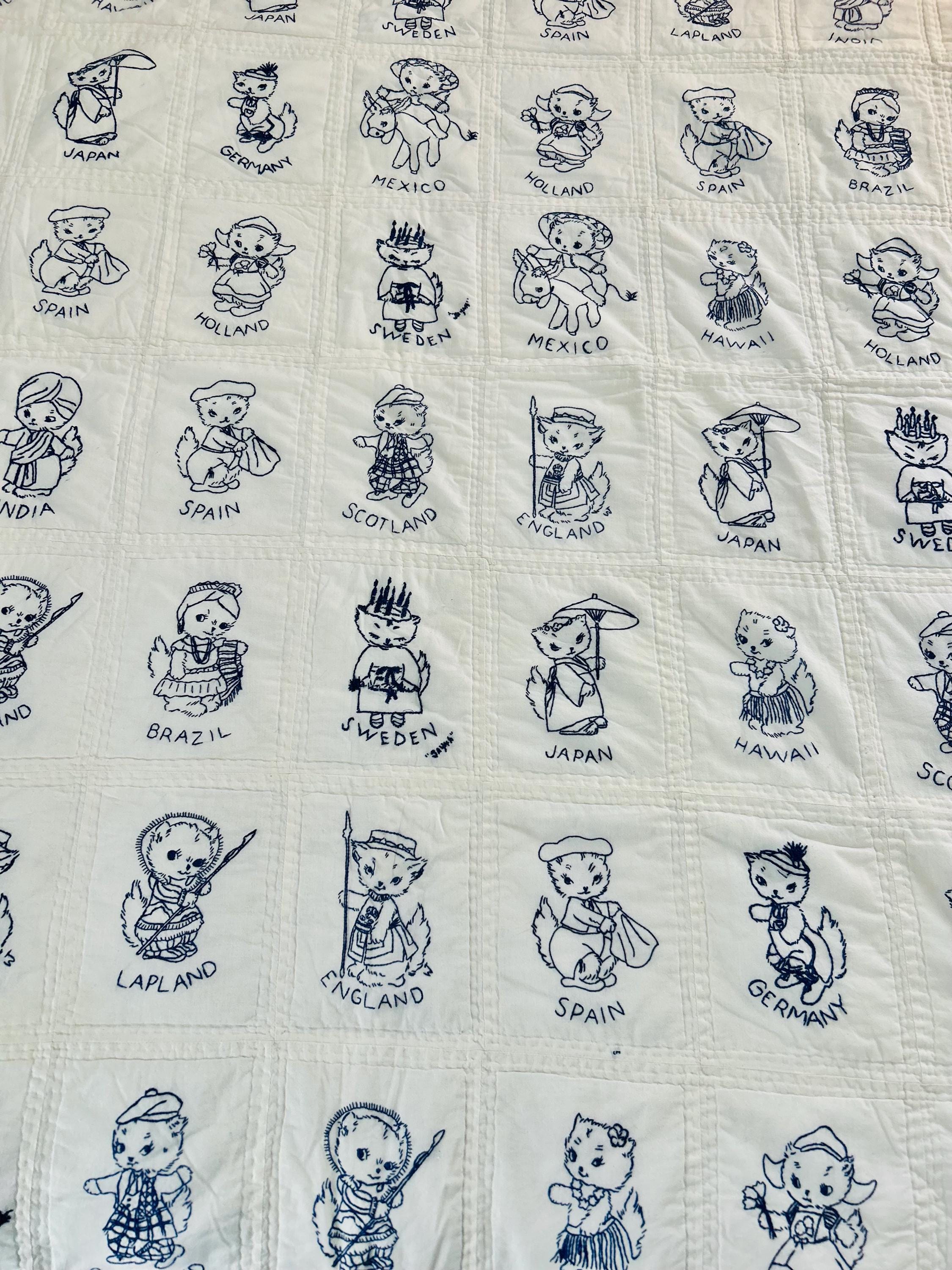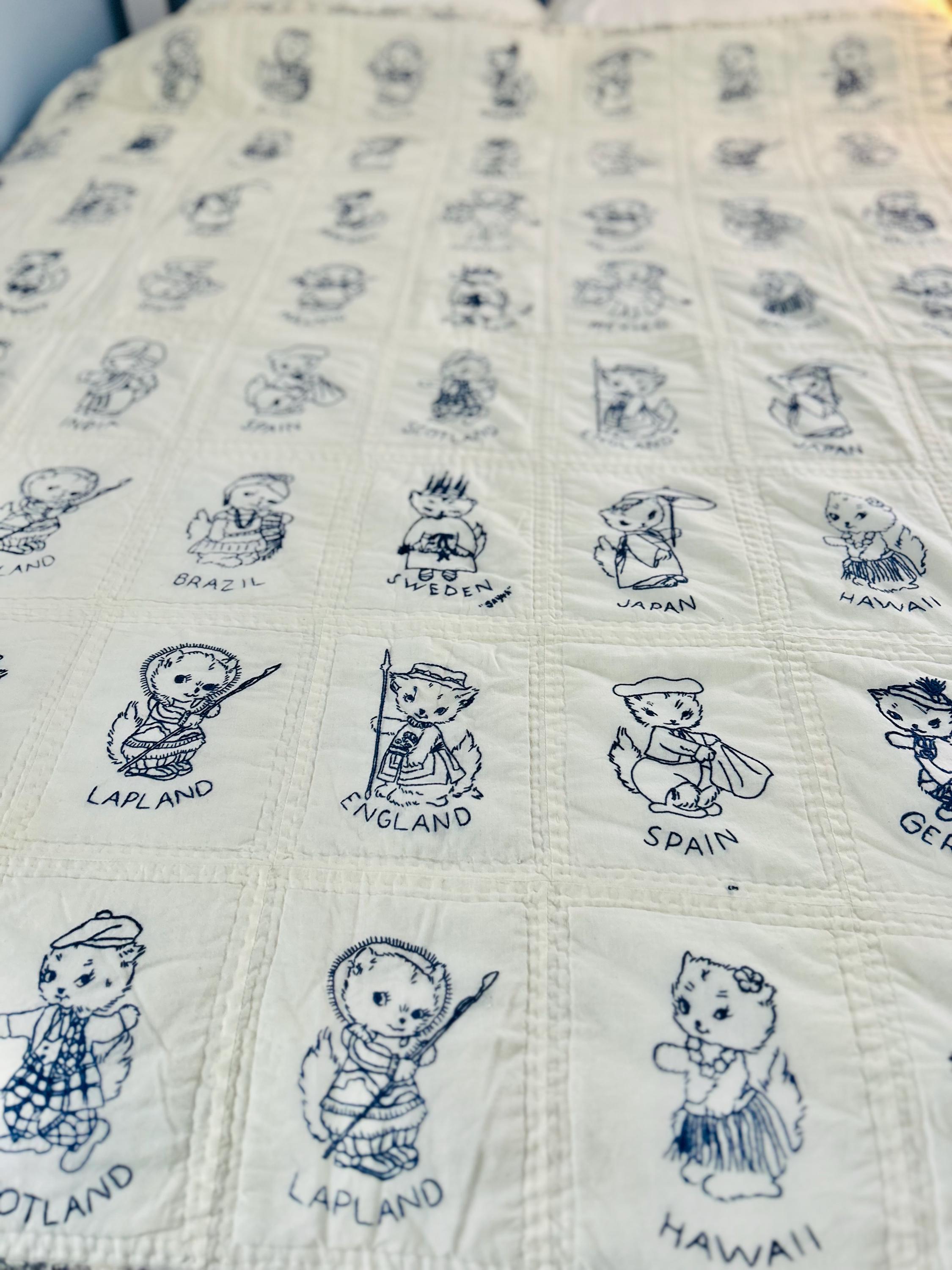 This delightful 1930s “Kittens Around the World” quilt features dozens of hand-embroidered kittens, each dressed in traditional costumes representing countries from around the globe. Since it was made prior to Hawaii becoming a U.S. state (which happened in 1959), Hawaii is one of the other "countries." Rendered in navy blue embroidery on a soft white cotton ground, the panels include Spain, Japan, England, Lapland, Hawaii, India, Germany, Mexico, Brazil, Holland, Scotland, Sweden, and more.