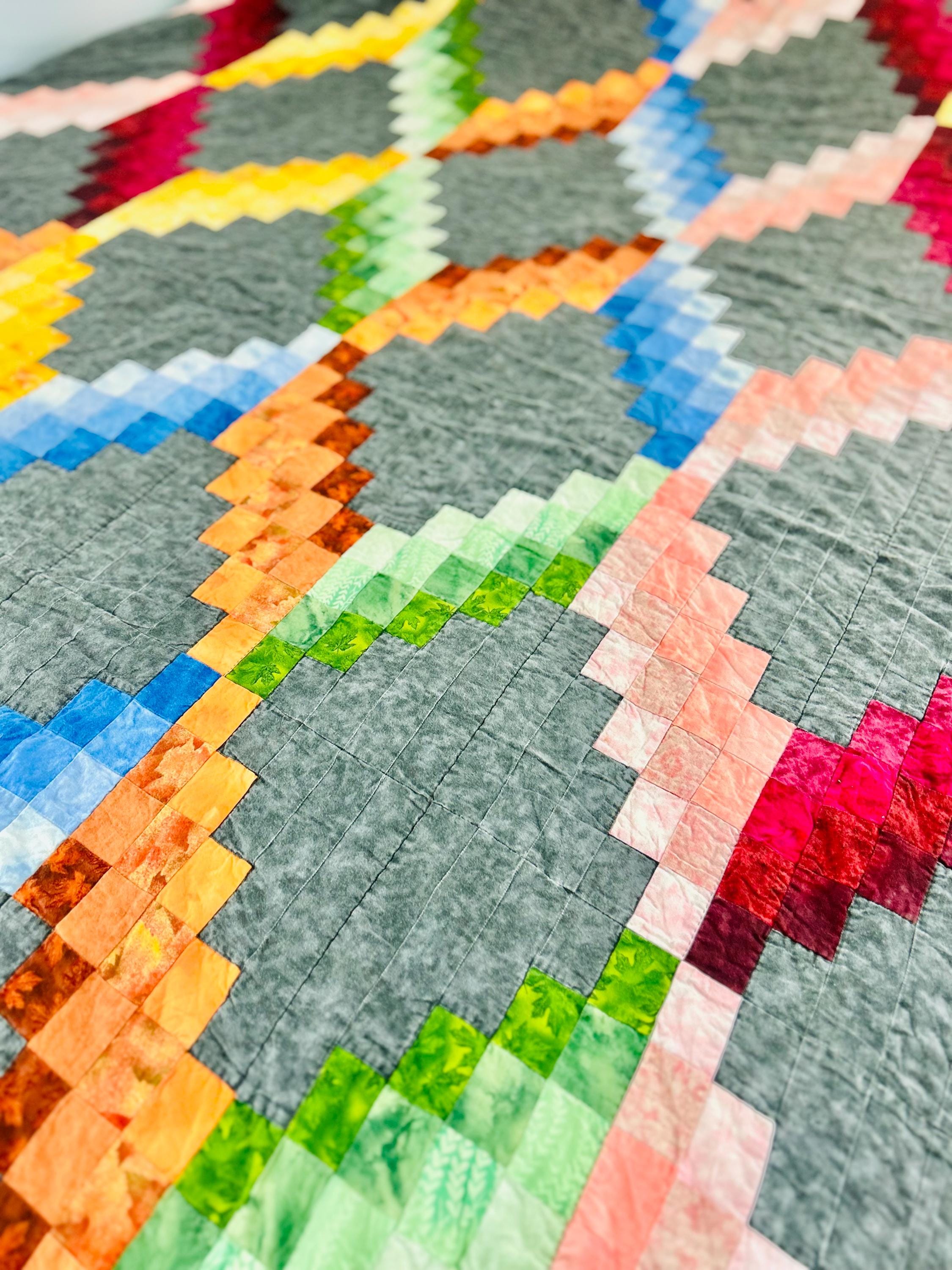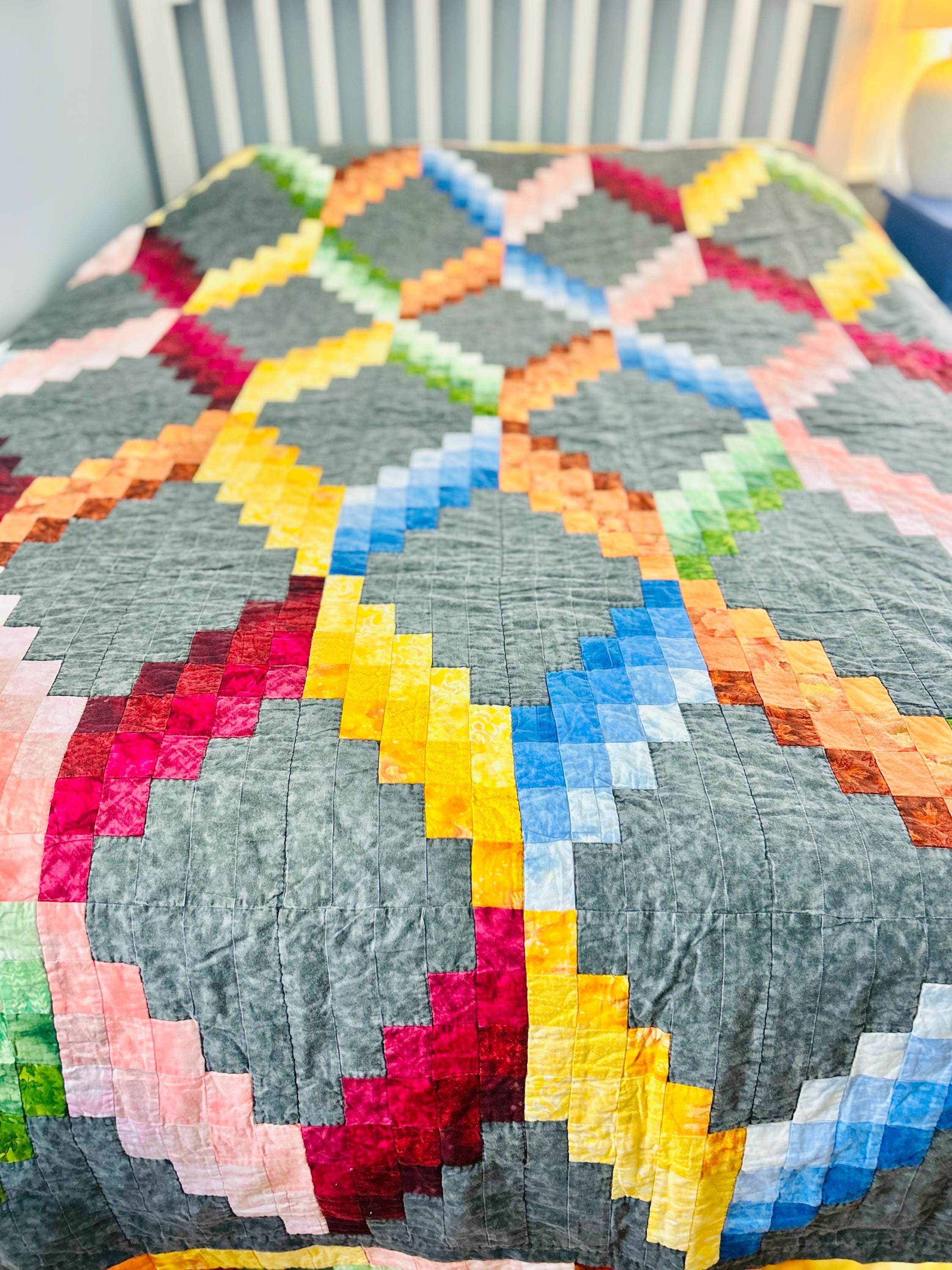 This striking large modern (1985-2000) Accordion Quilt features a bold geometric design with vibrant stepped colorwork set against a soft gray ground. The palette includes saturated jewel and citrus tones—reds, blues, greens, yellows, and pinks—using high-quality cottons that create a dynamic, contemporary look.