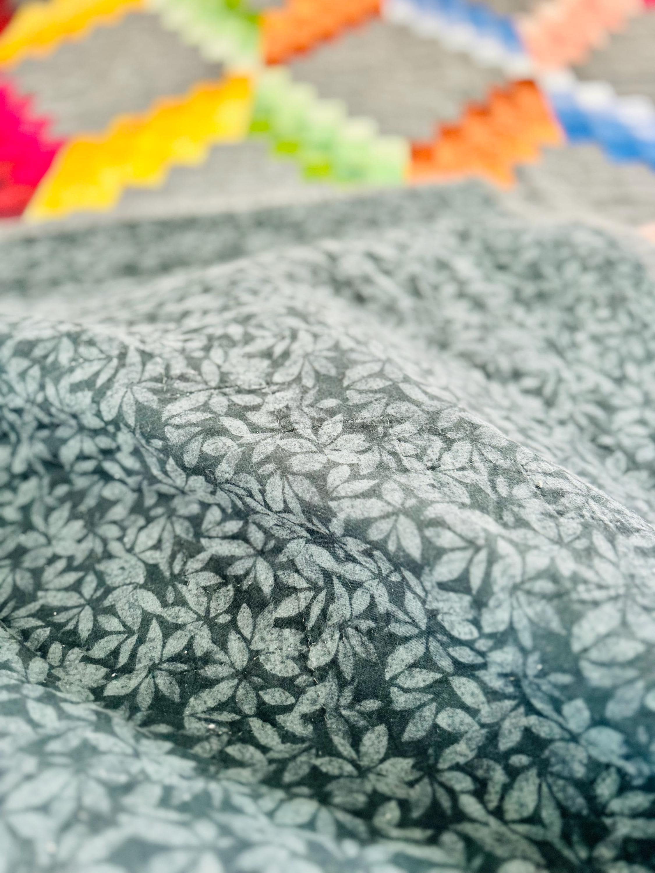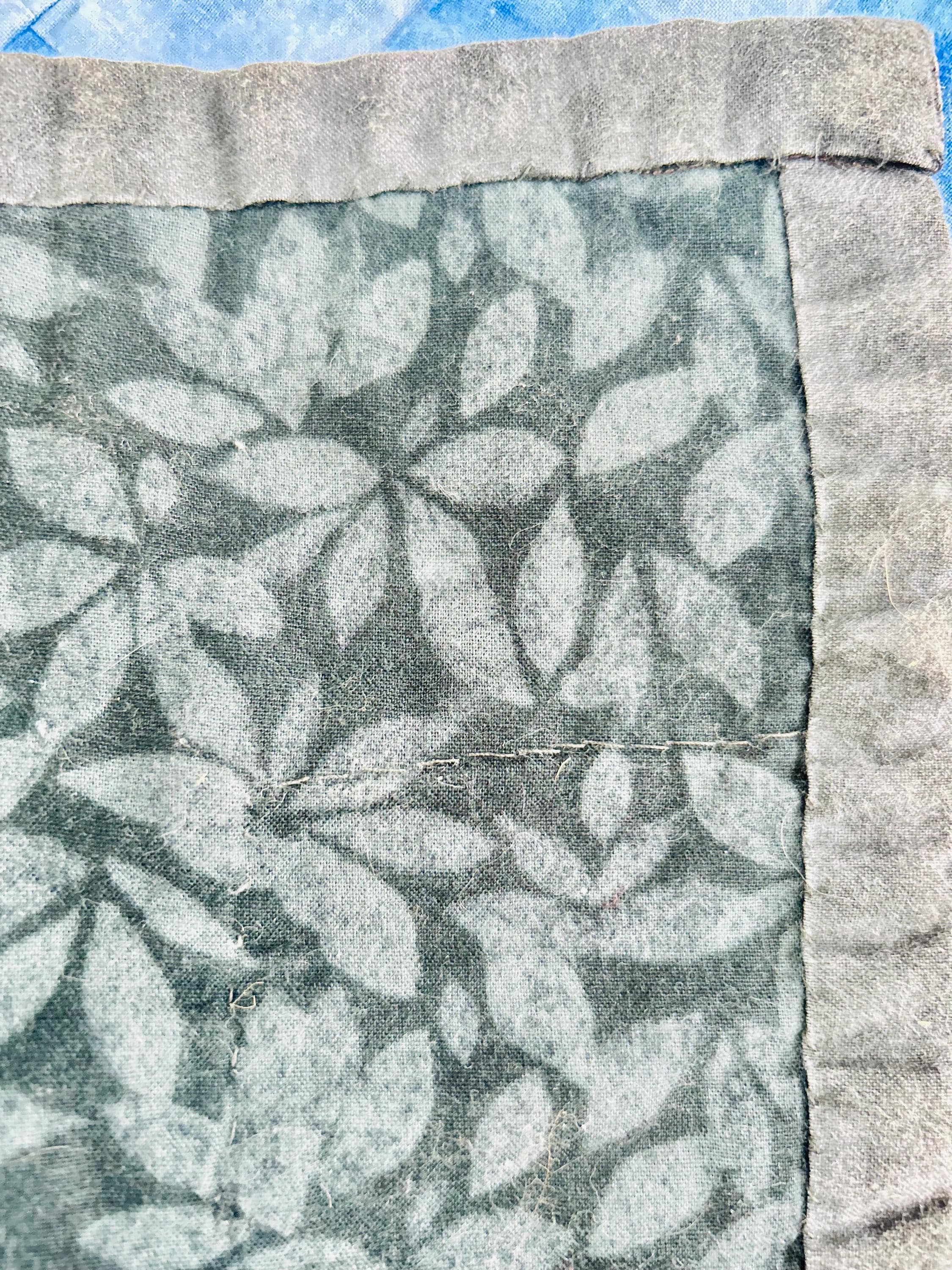 It has been machine quilted in straight lines that follow the patchwork. The back is a gray cotton floral while \a gray cotton binding has been machine stitched to the front and hand-stitched to the back. The batting is lightweight.