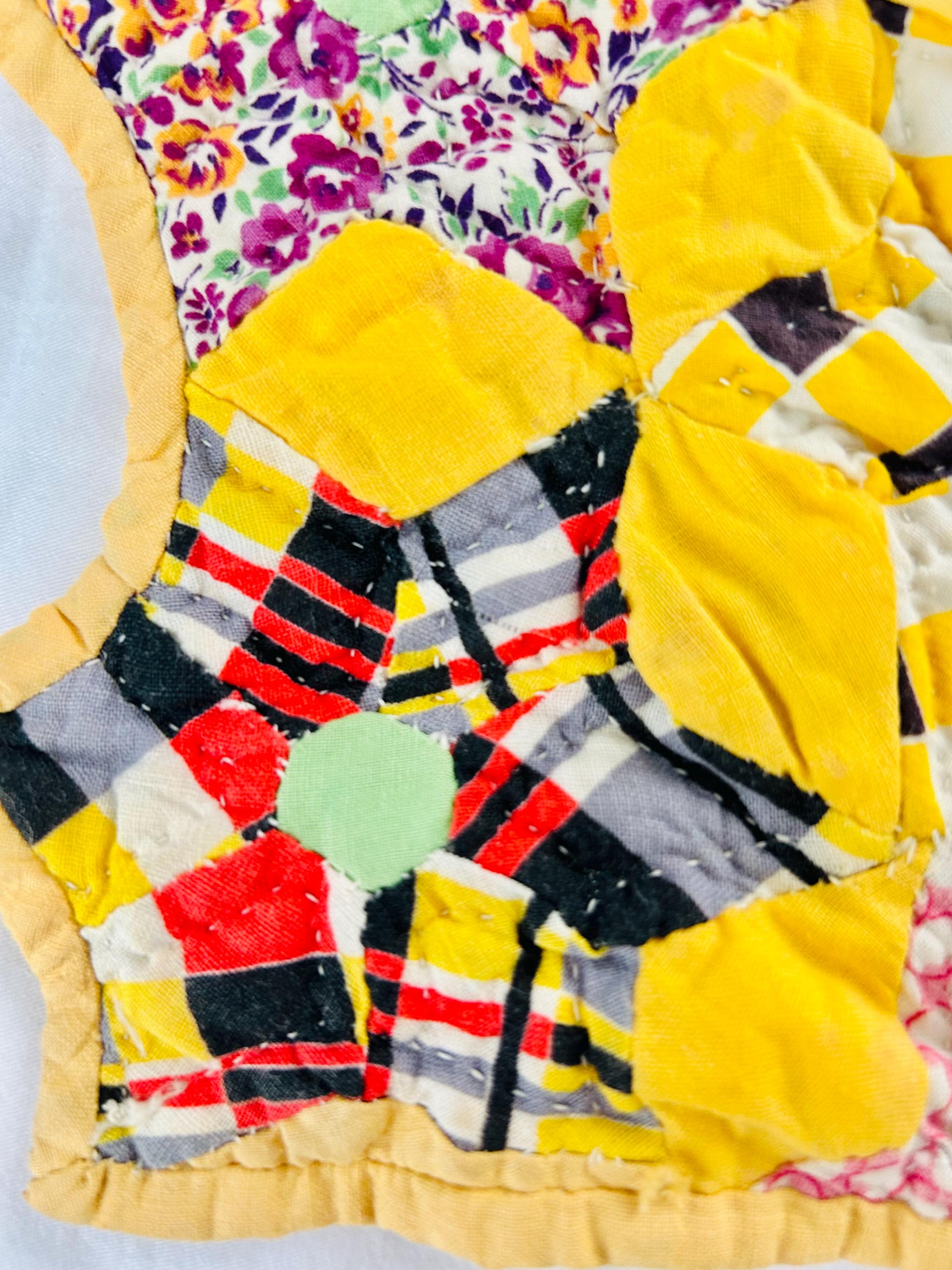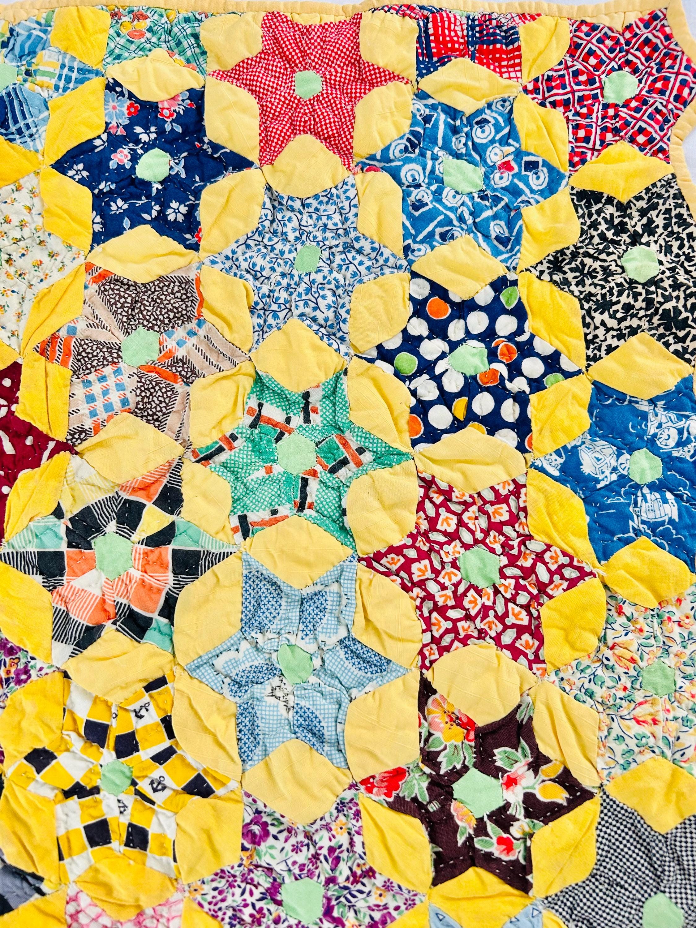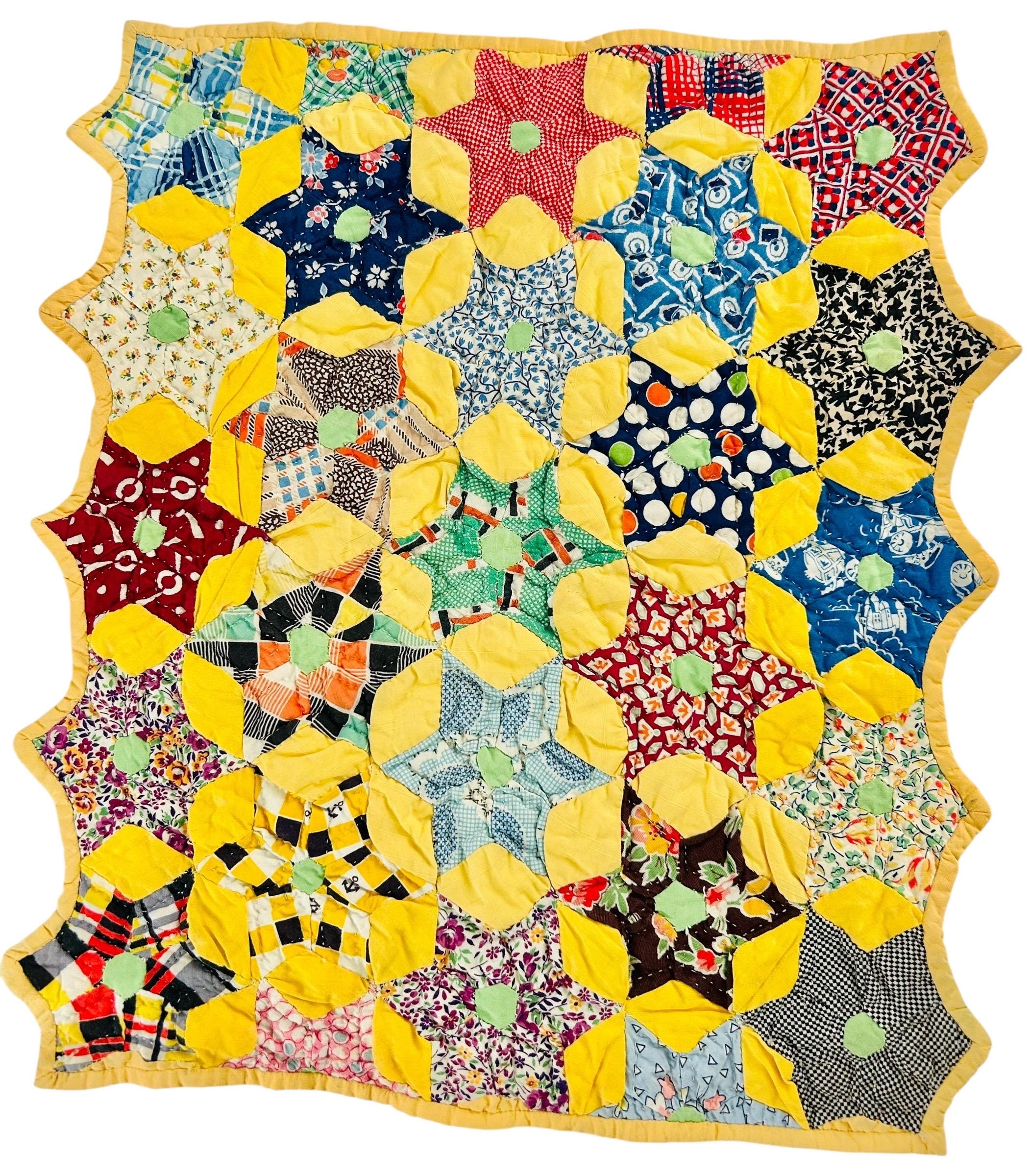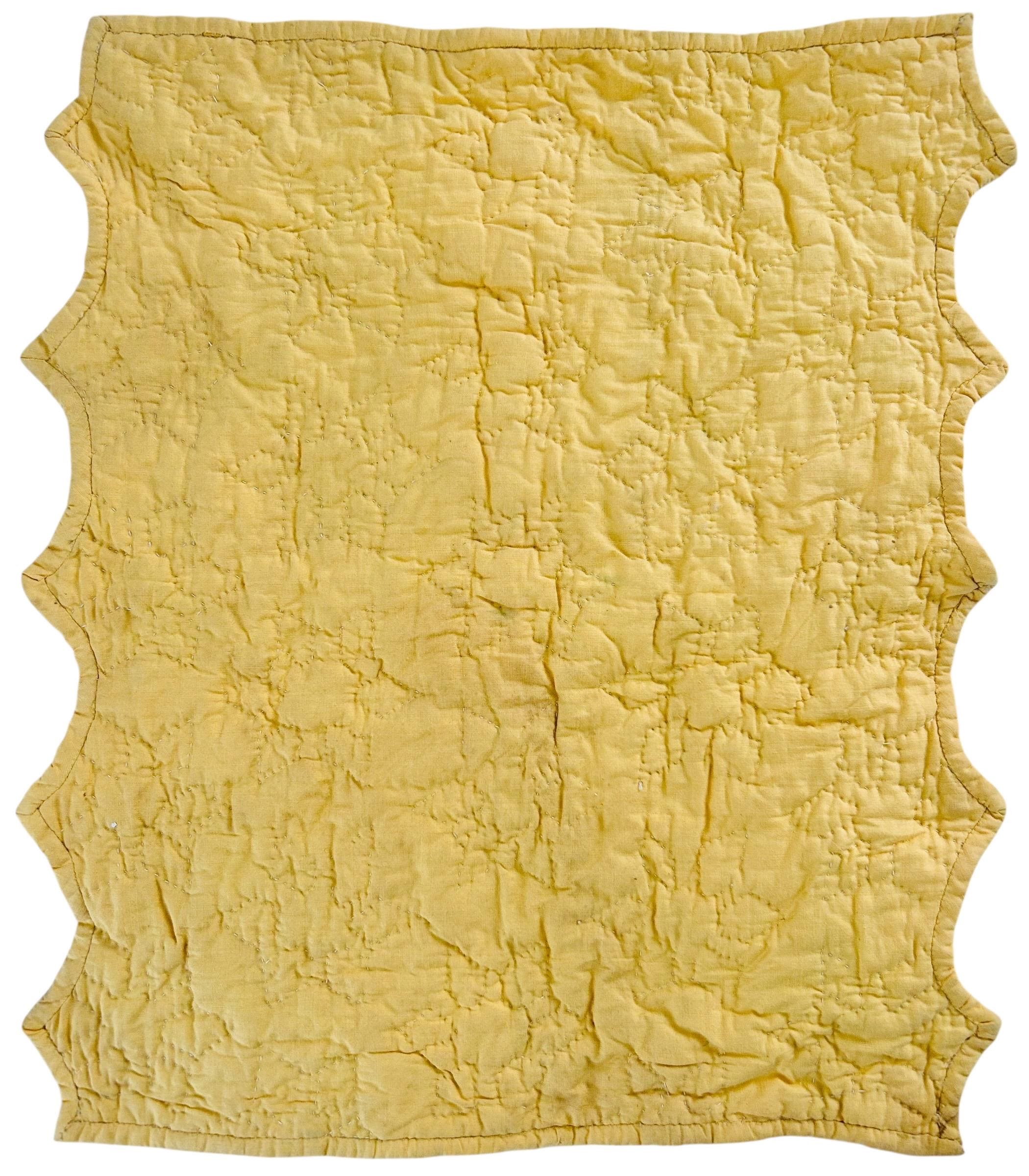 This charming Six-Pointed Star Doll Quilt dates to the 1930s–early 1940s and is entirely hand pieced and hand quilted. Constructed from classic Depression-era feed sack and cotton prints, it features twenty-three tiny (3-inch) stars, each with six points and mint green centers set against a soft yellow ground. Two of the edges are scalloped while the top and bottom have been evened-off with half-stars. It is hand-quilted in outlines of the patchwork.