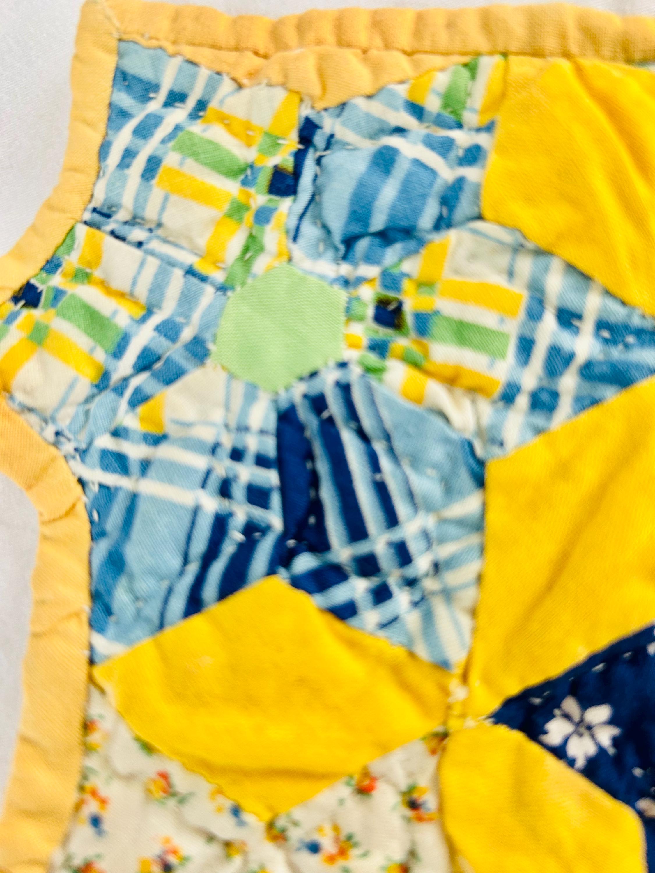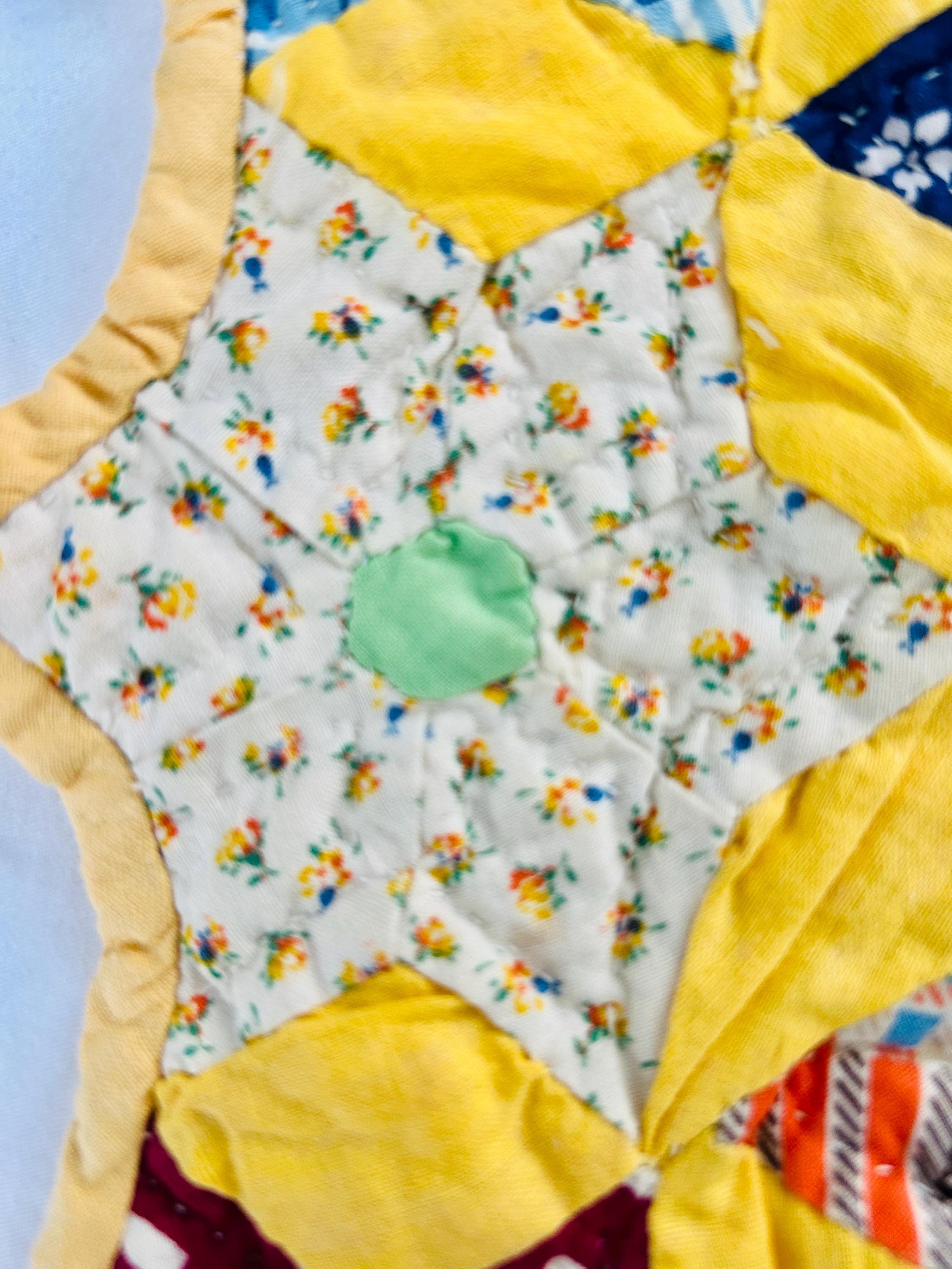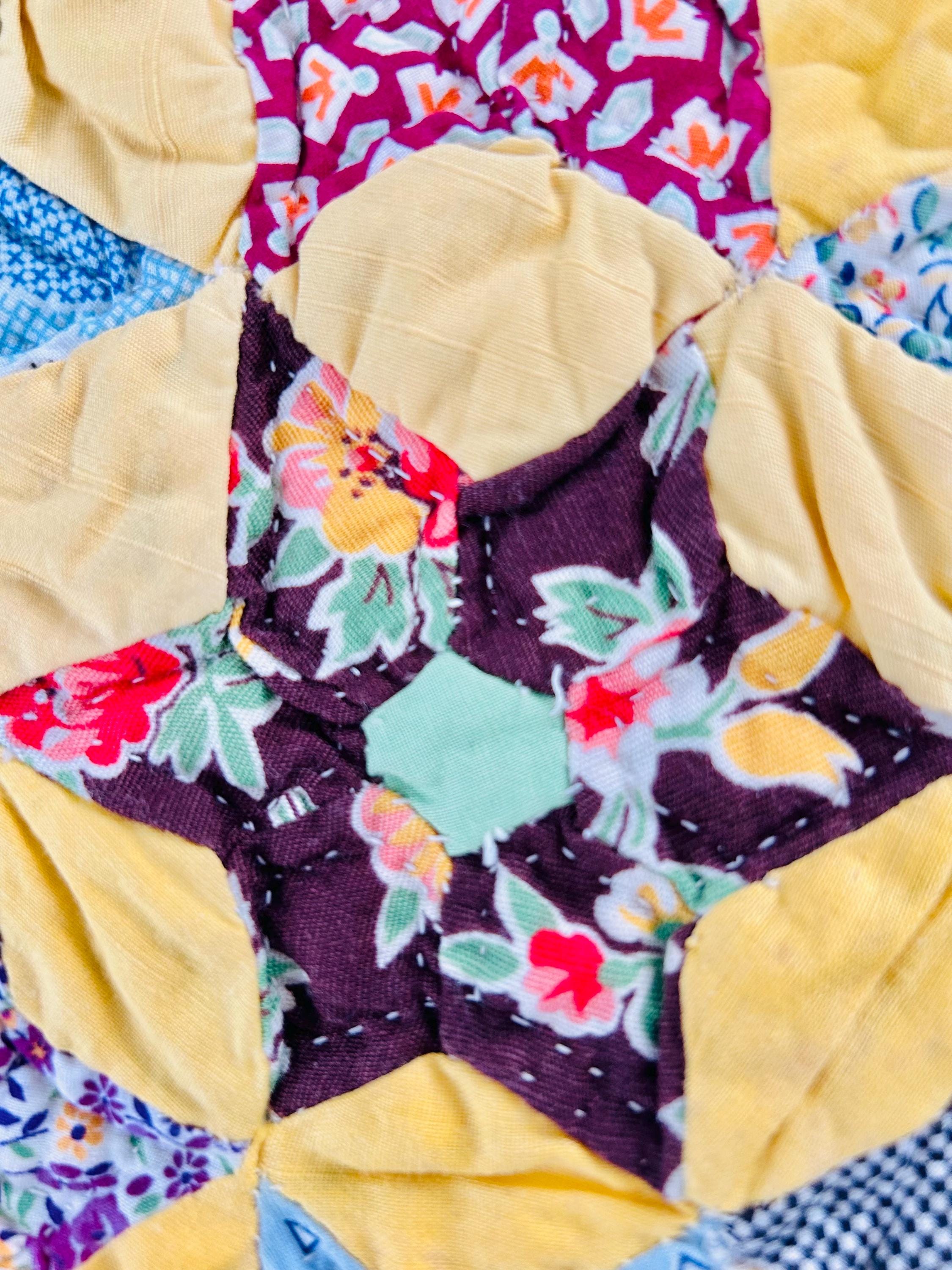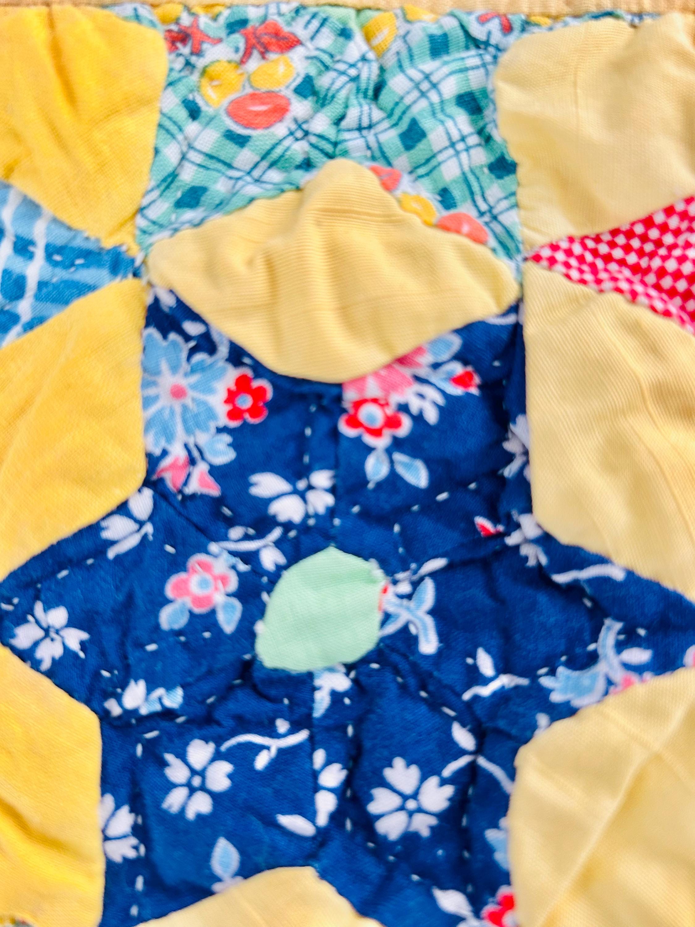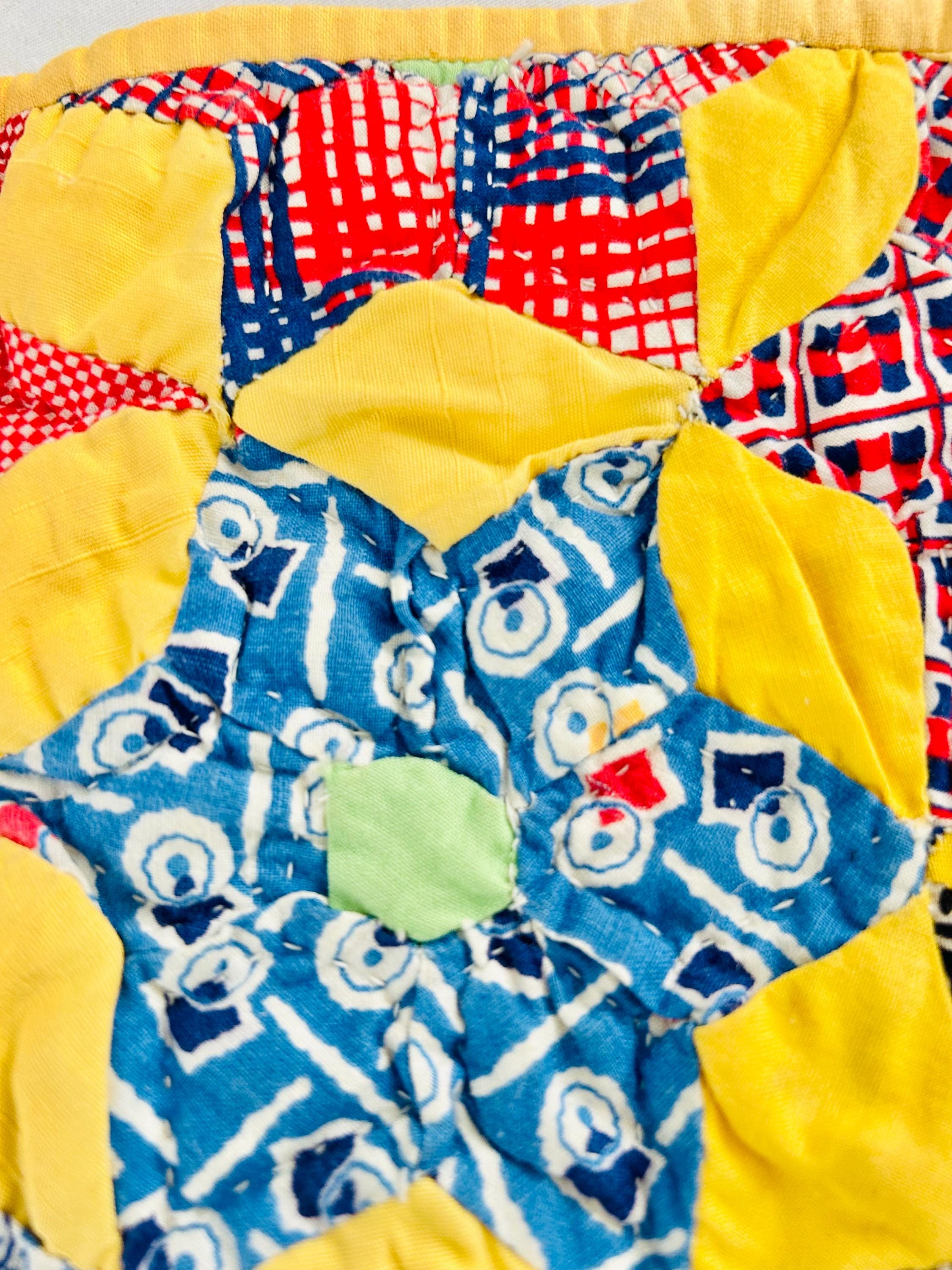 Details: • Date: circa 1930–1940s • Construction: Hand pieced & hand quilted • Materials: Cotton (feed sack era prints) • Size: 14½” x 16½” • Shape: Scalloped edges