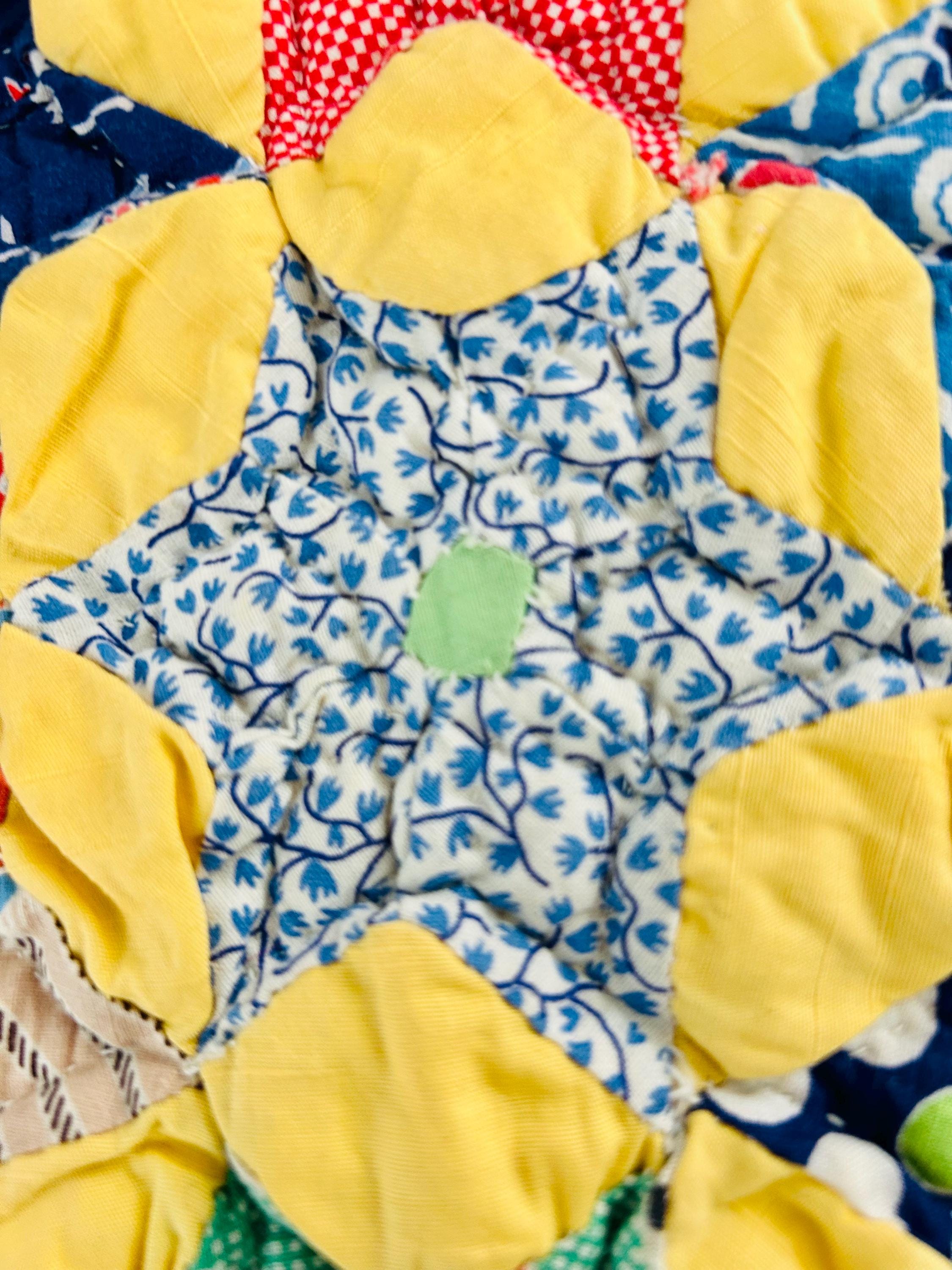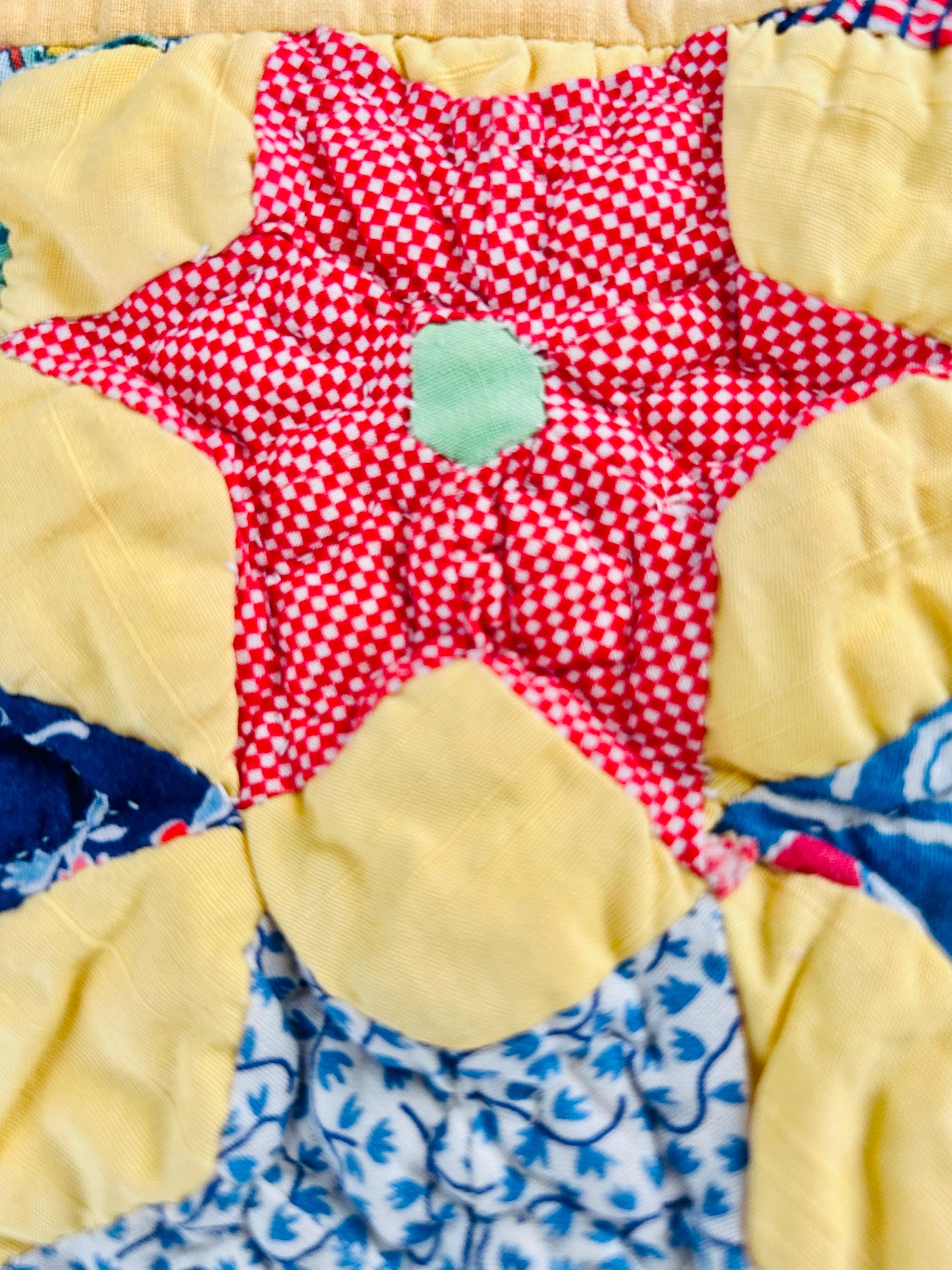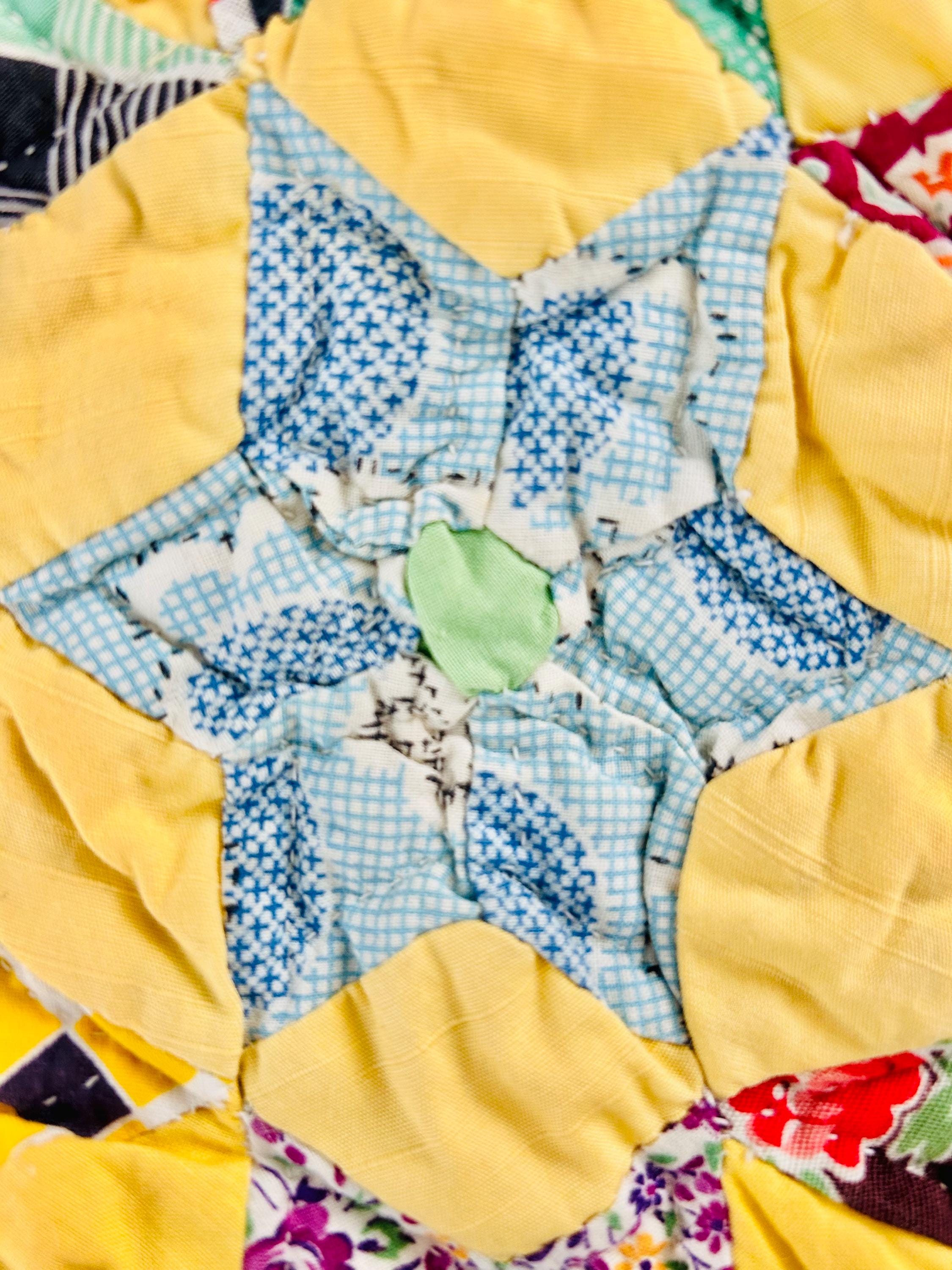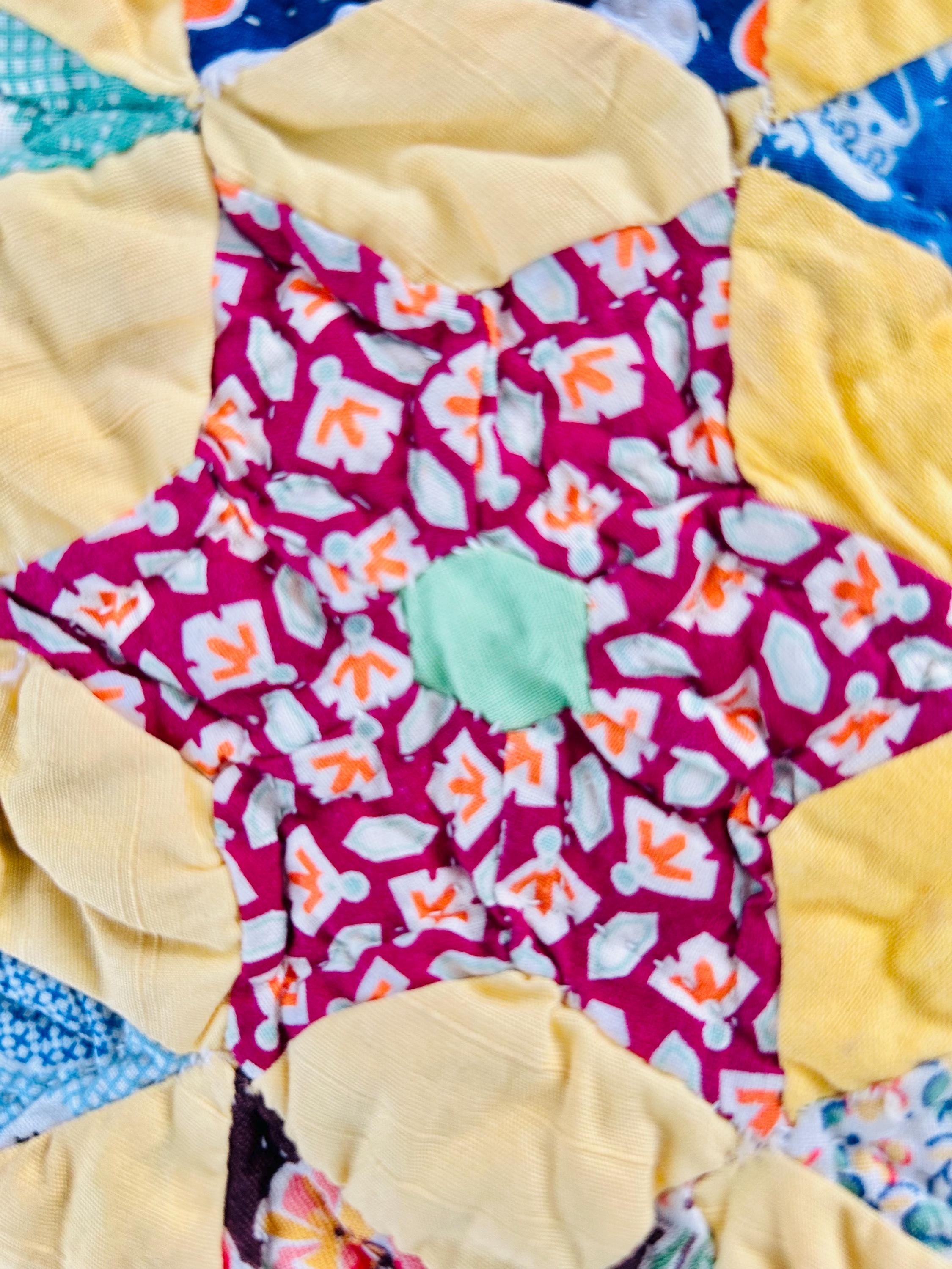 Details: • Date: circa 1930–1940s • Construction: Hand pieced & hand quilted • Materials: Cotton (feed sack era prints) • Size: 14½” x 16½” • Shape: Scalloped edges