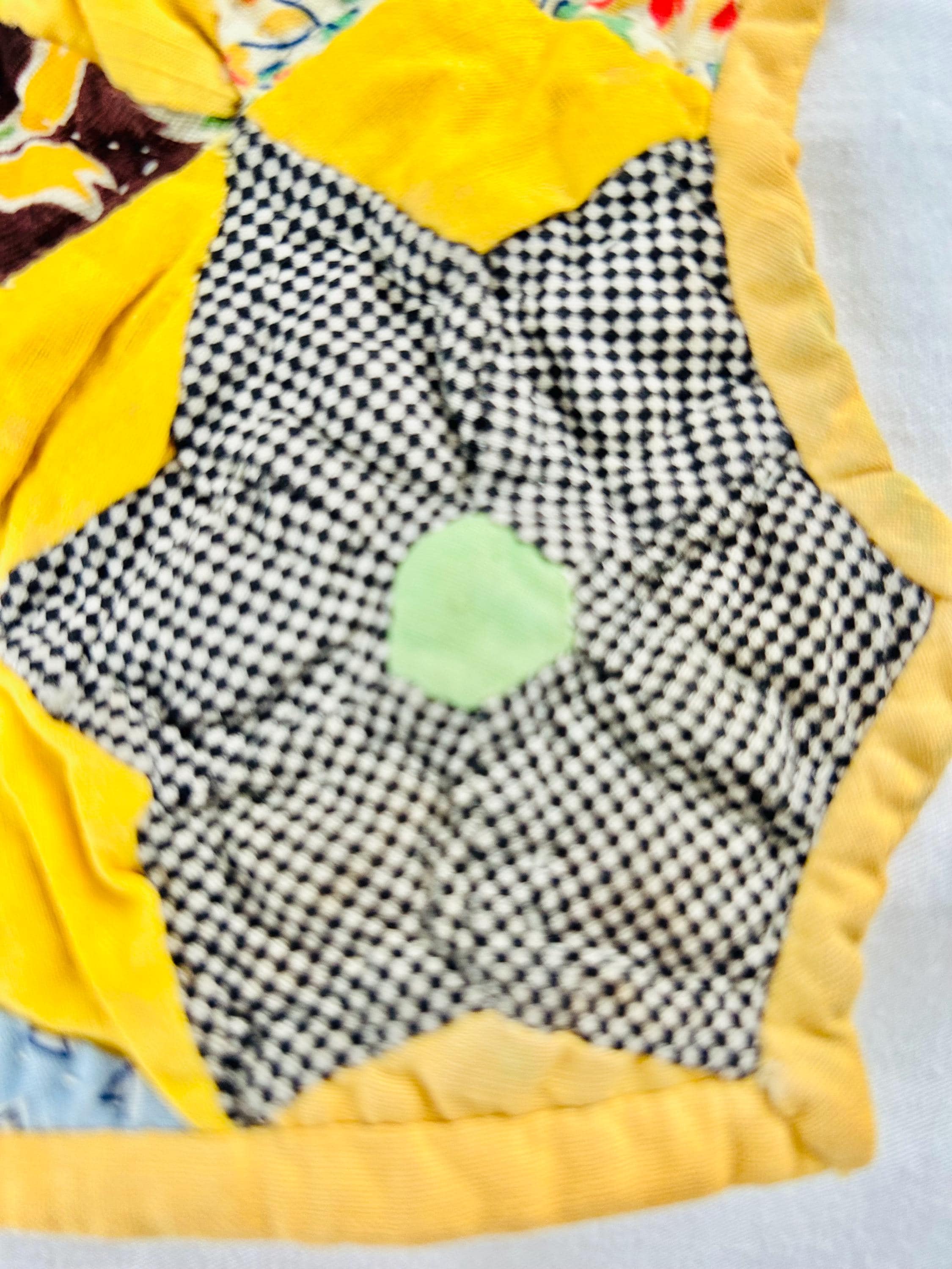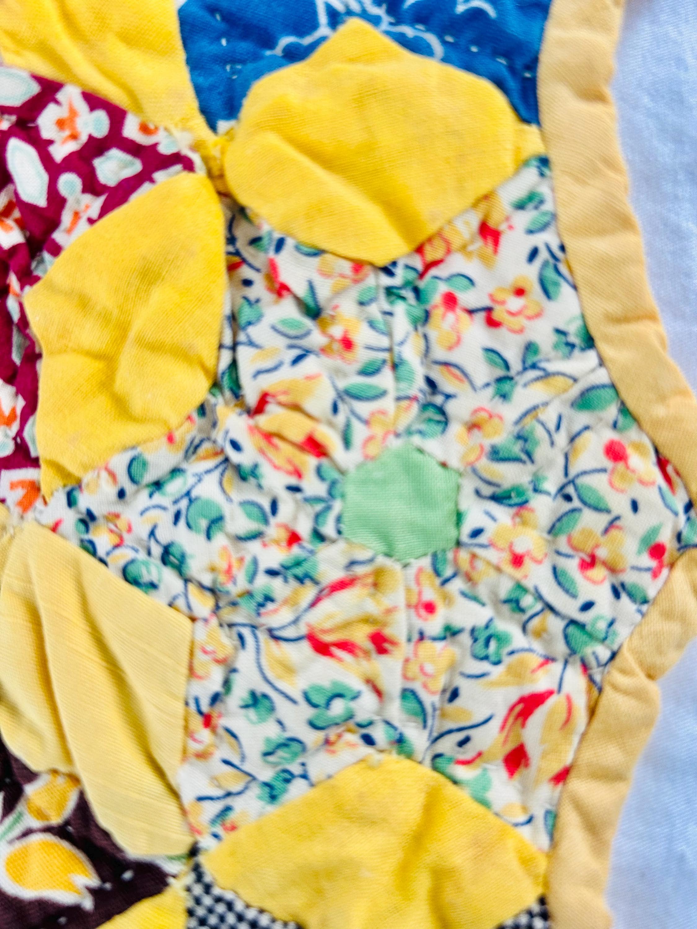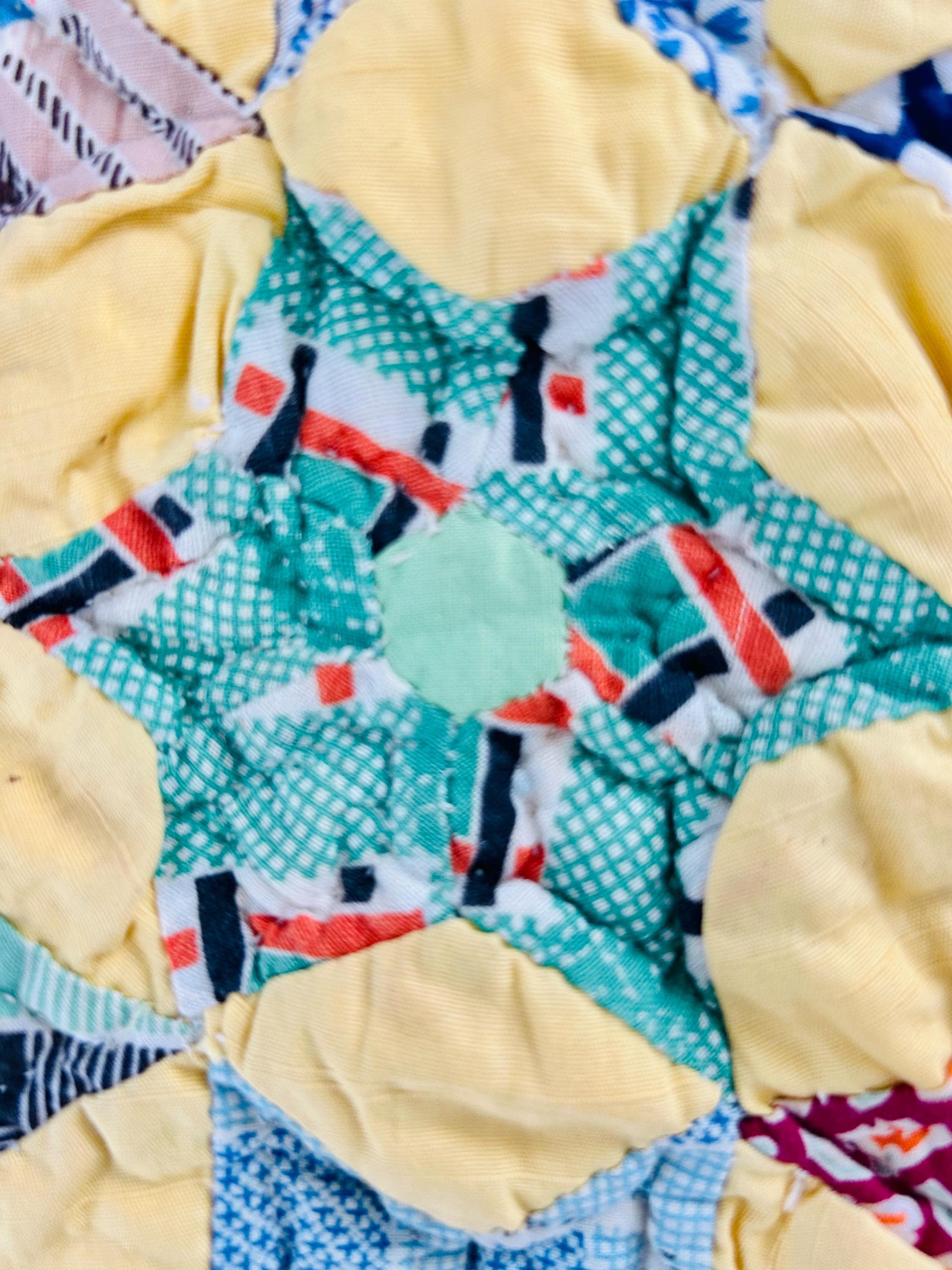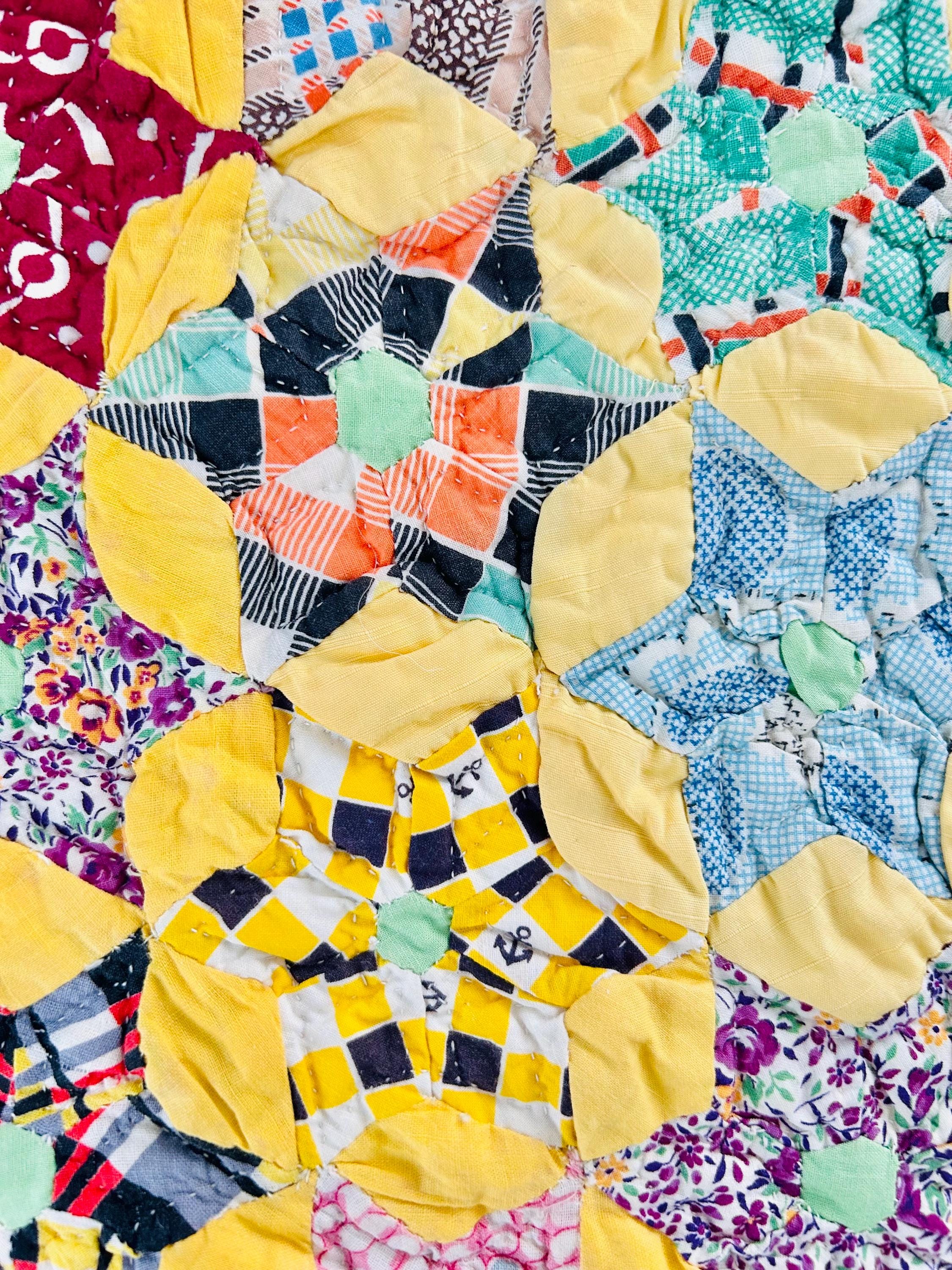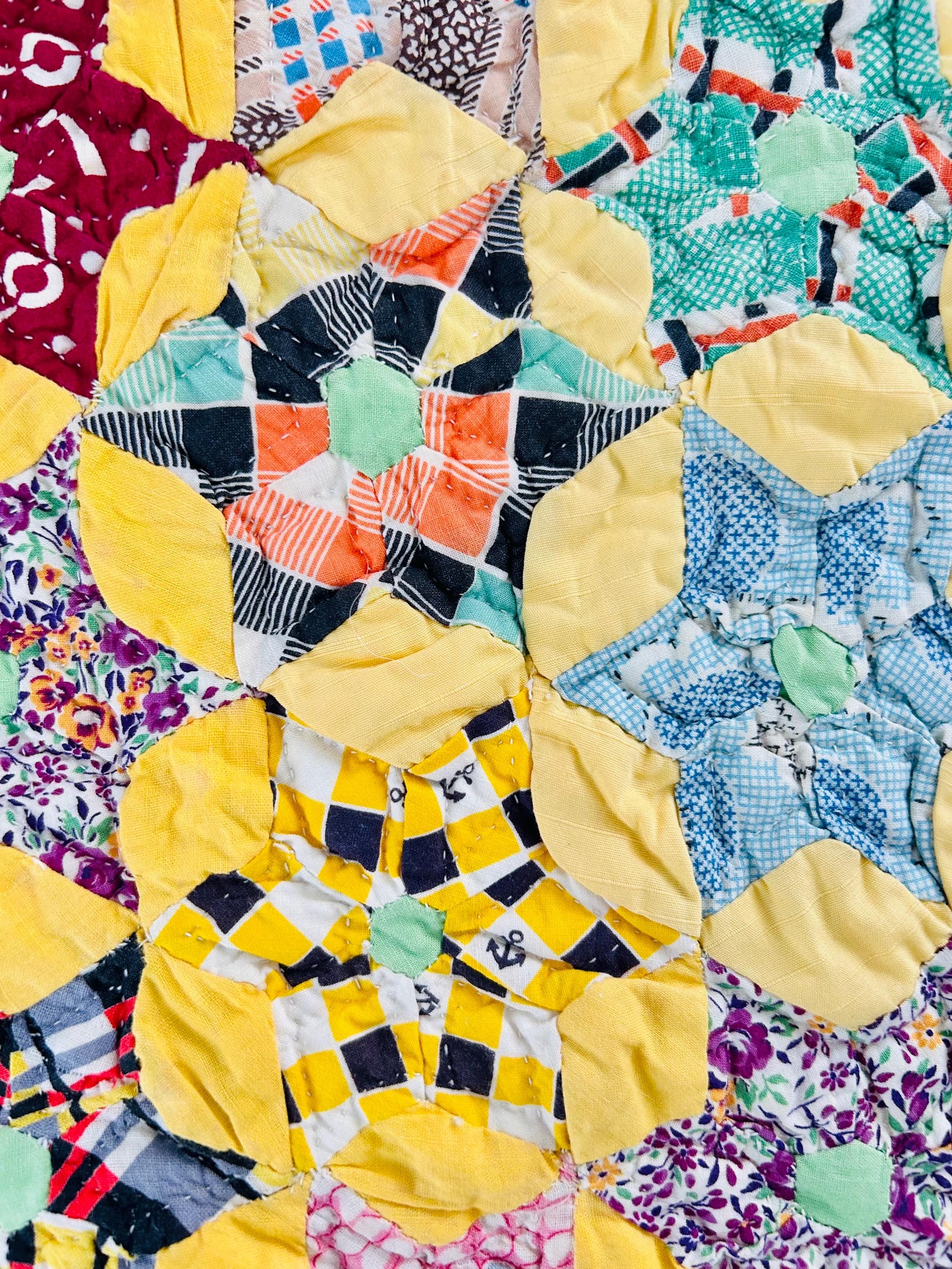 Details: • Date: circa 1930–1940s • Construction: Hand pieced & hand quilted • Materials: Cotton (feed sack era prints) • Size: 14½” x 16½” • Shape: Scalloped edges