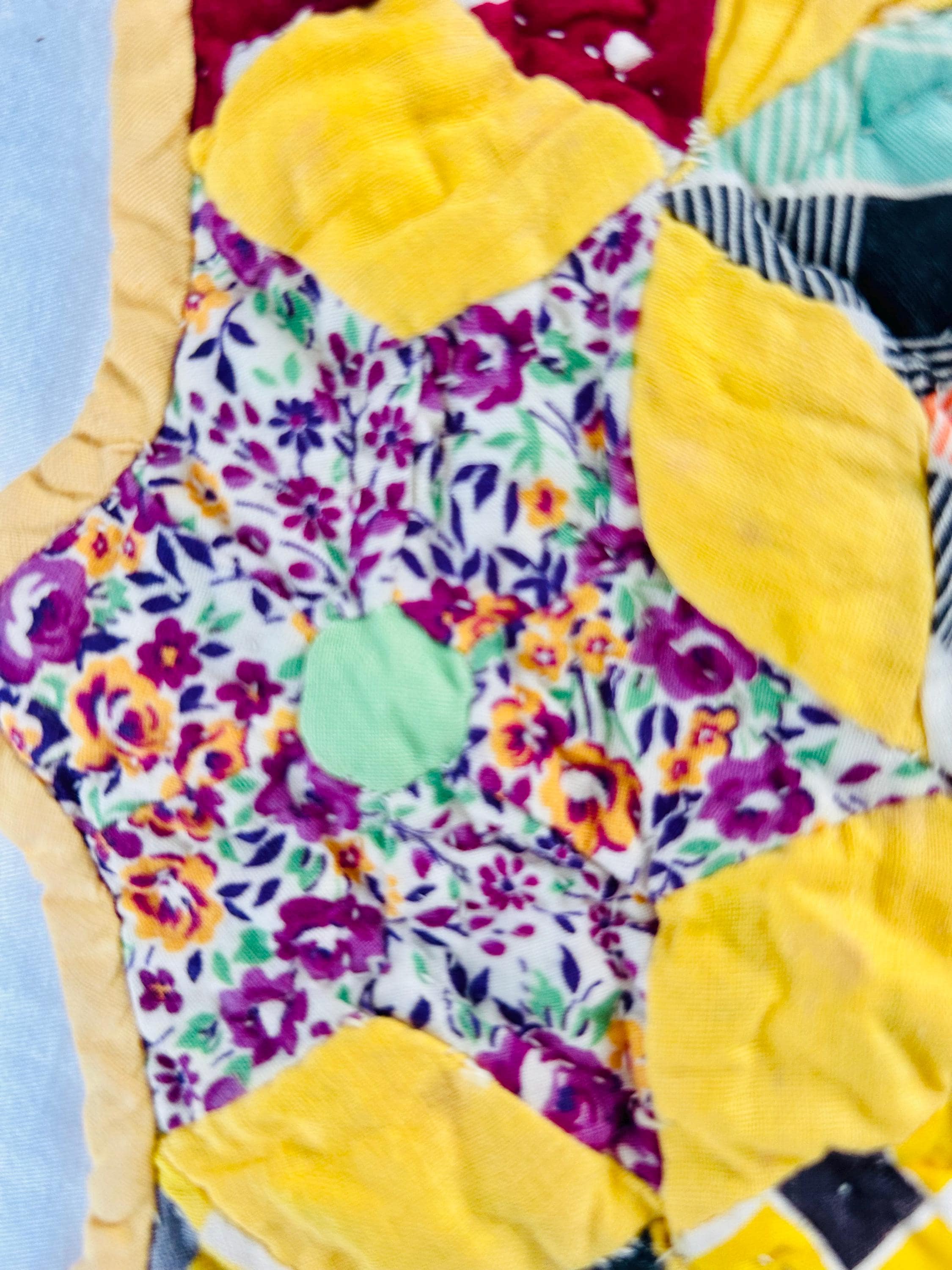 The back is a yellow cotton as is the binding that has been hand-stitched to both sides. The cotton batting is very lightweight.
