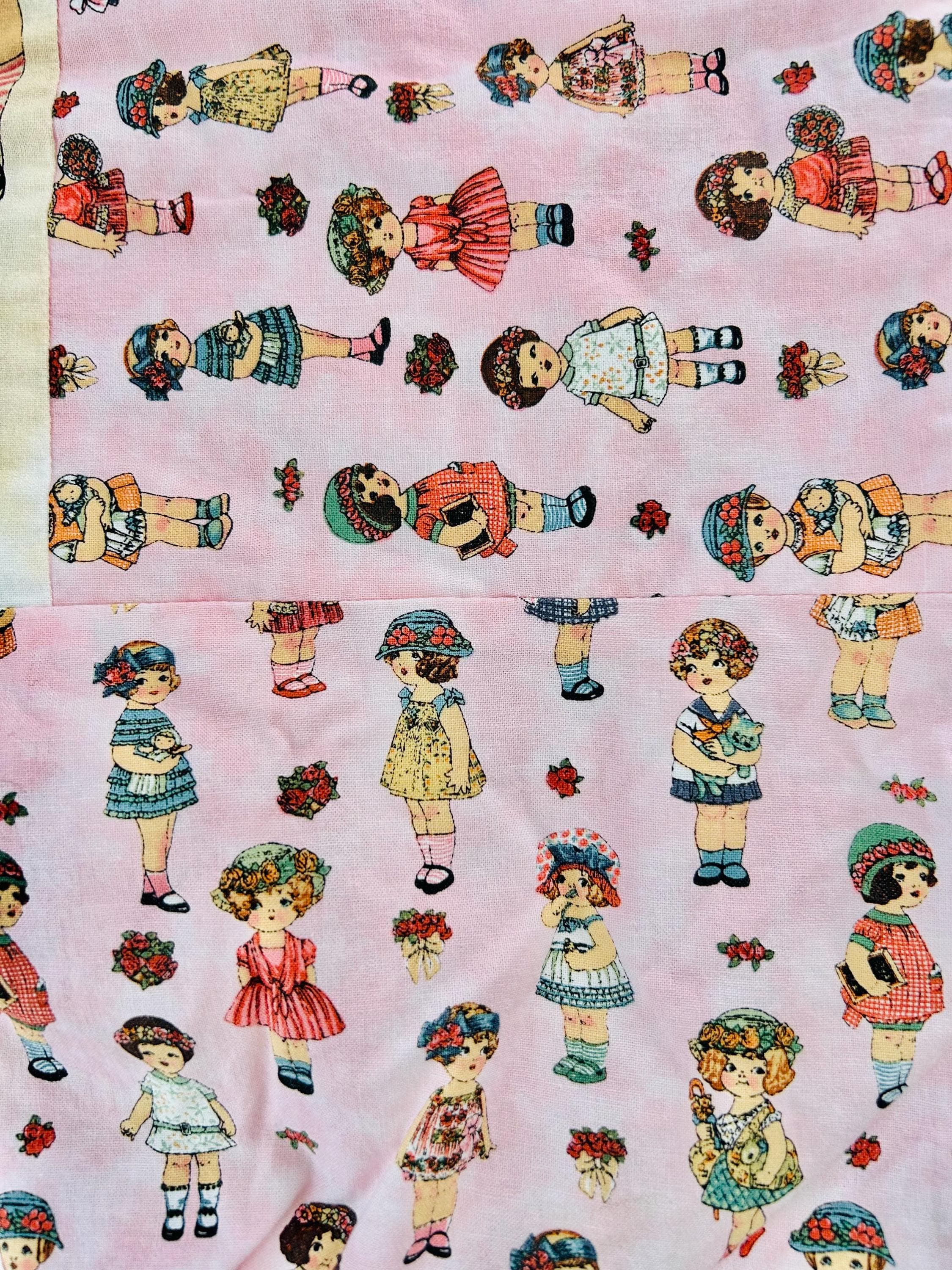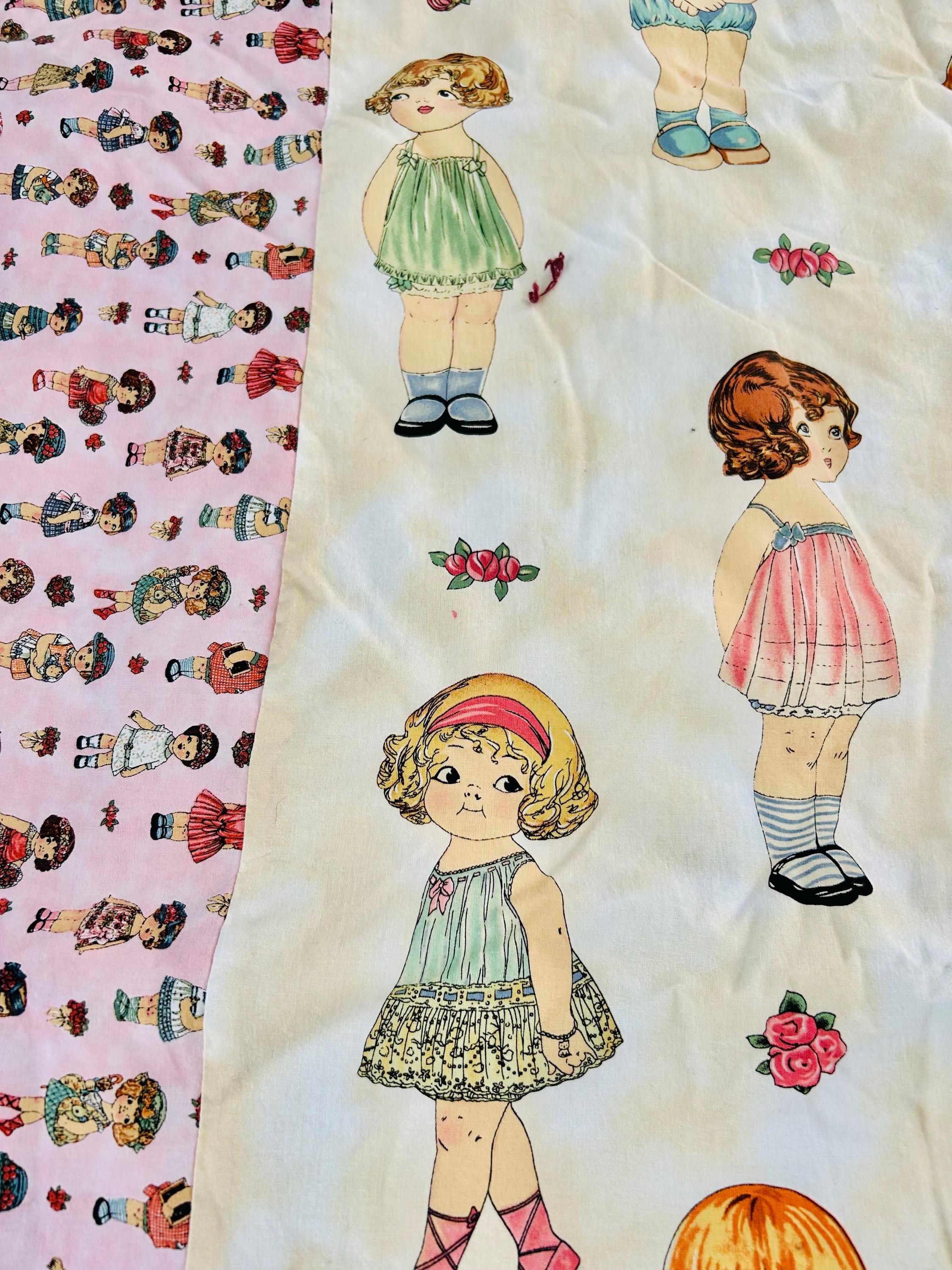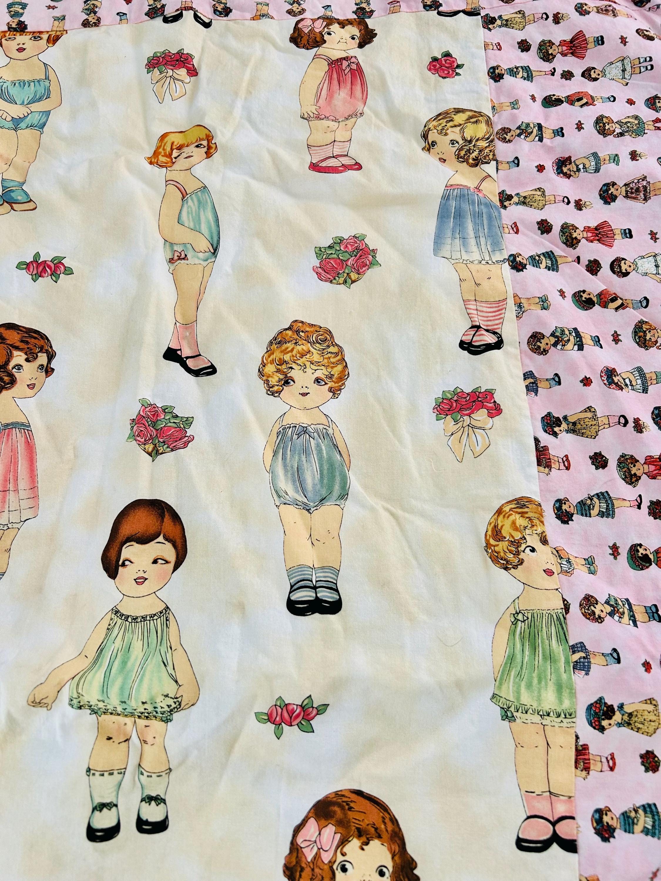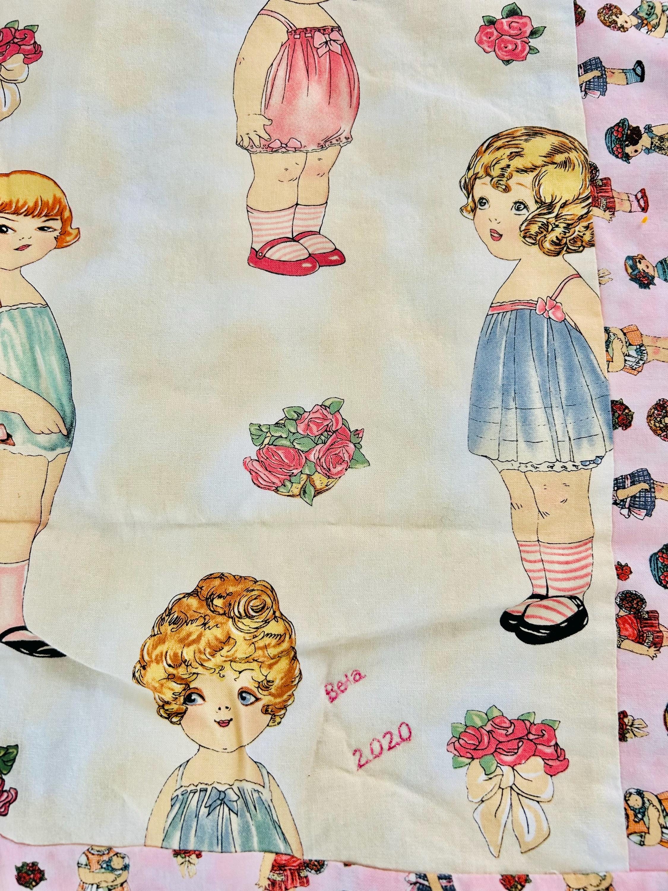 Charming handmade quilt featuring vintage-inspired paper doll imagery, thoughtfully arranged on a soft cream background and framed with coordinating pink doll-print borders. This quilt is signed "Bela" and dated 2020 by the maker.