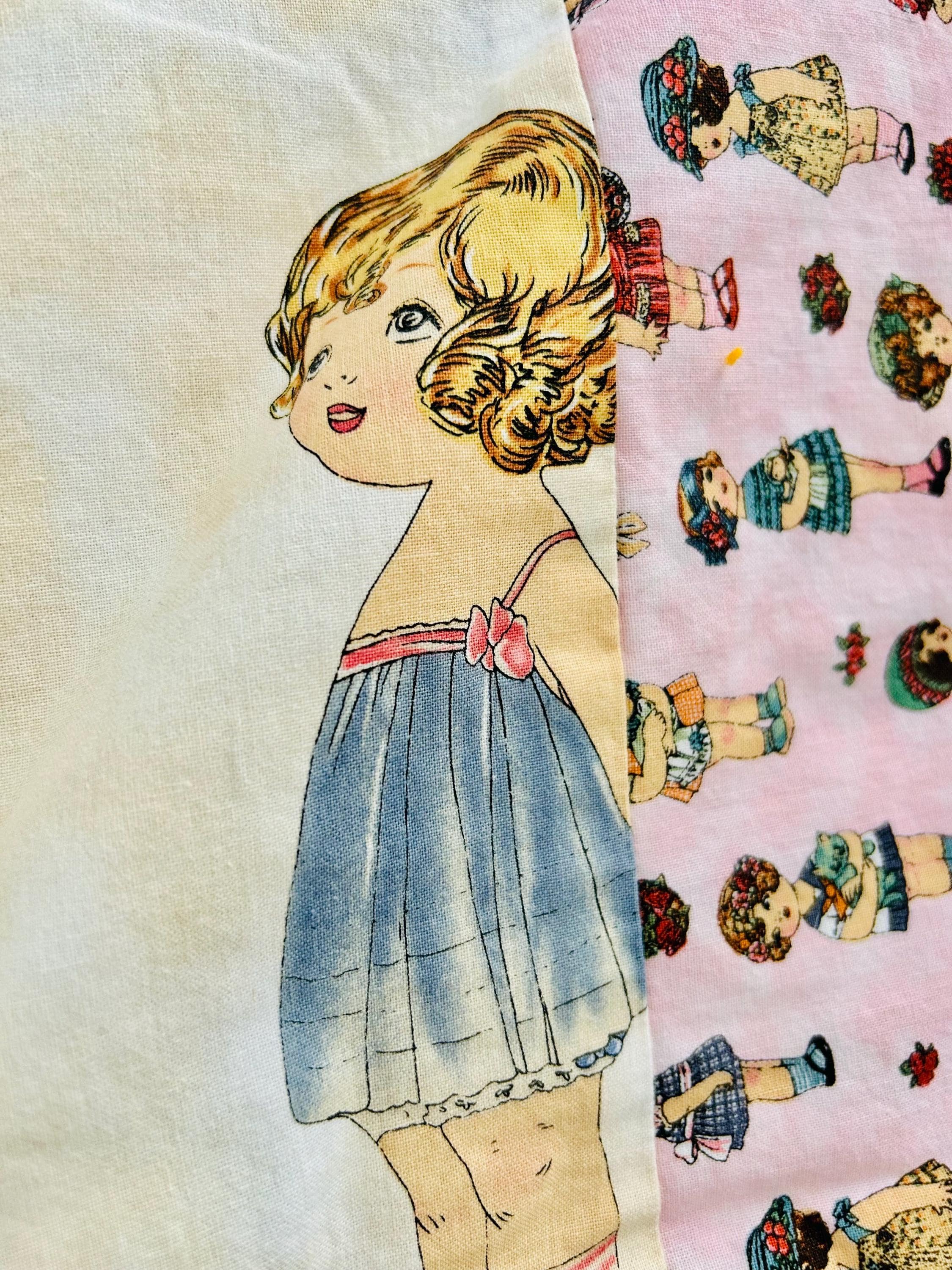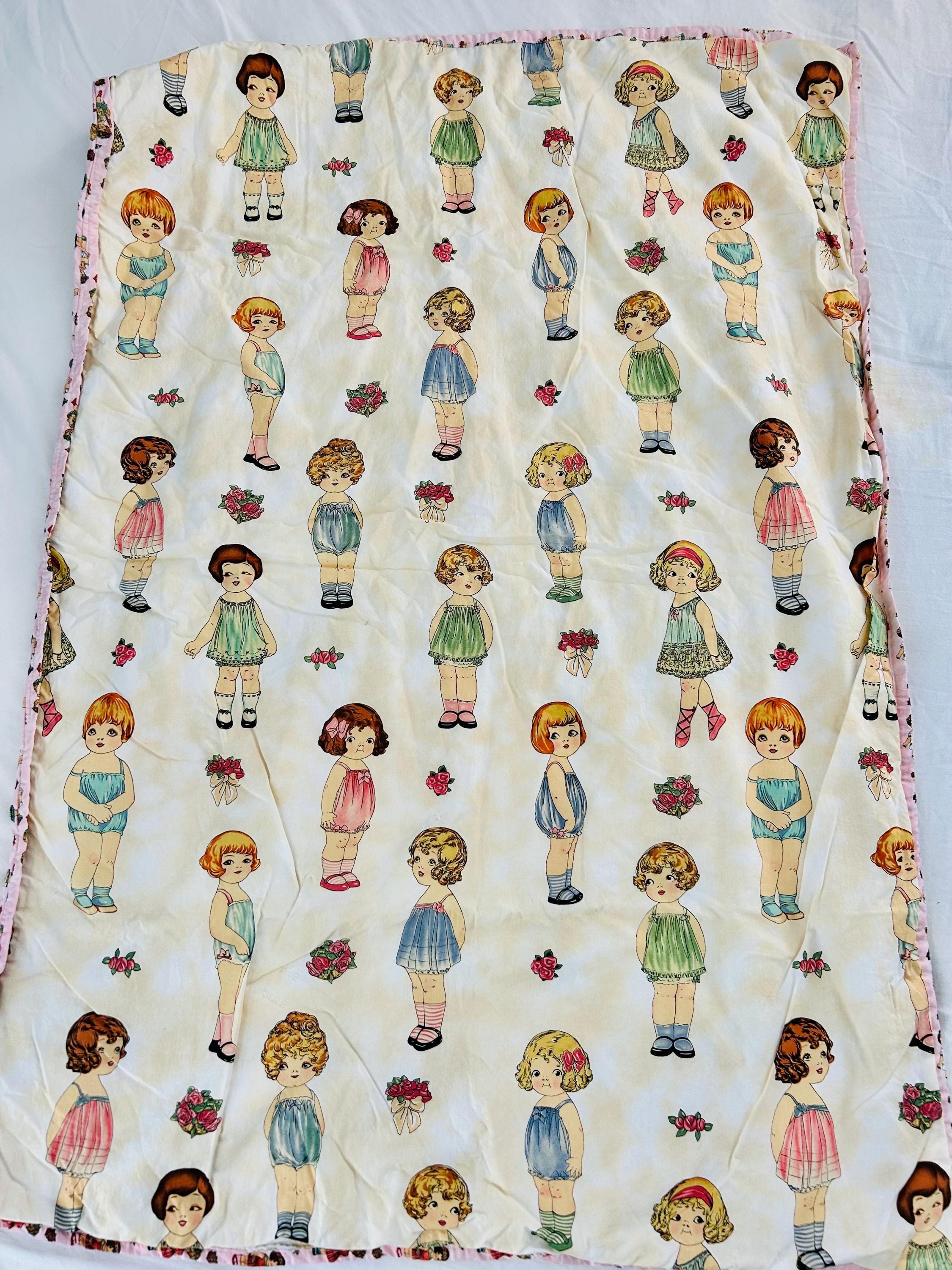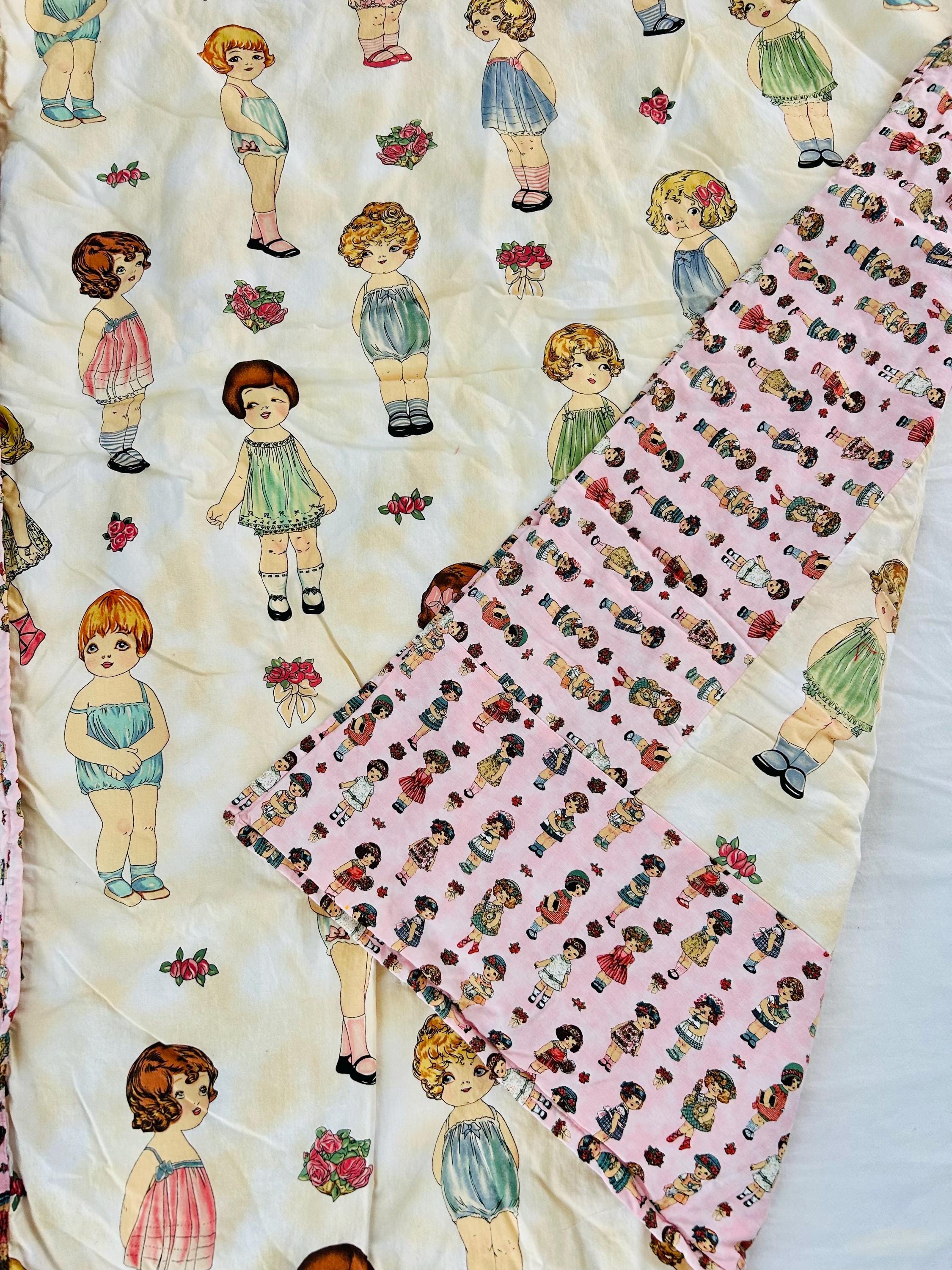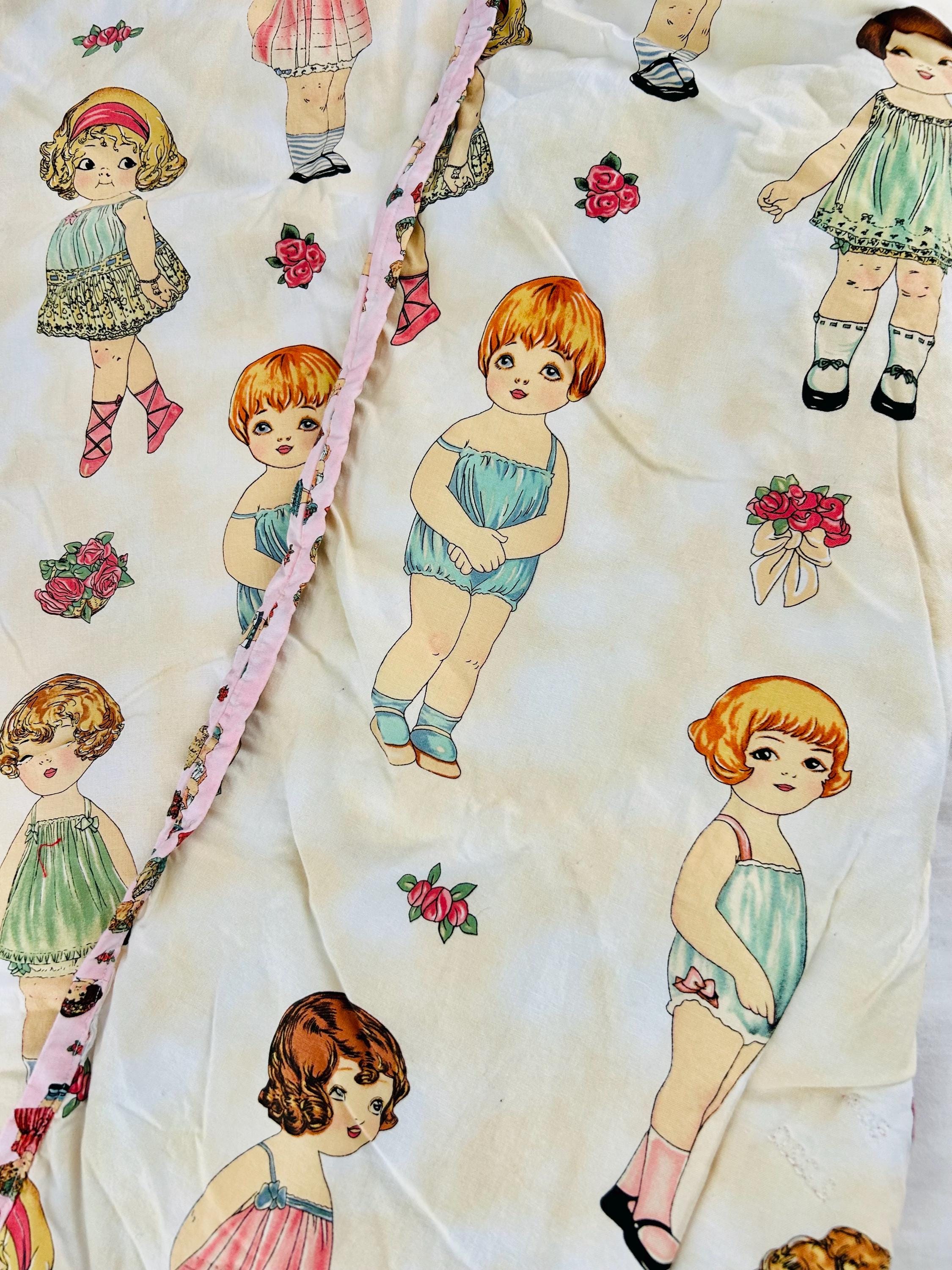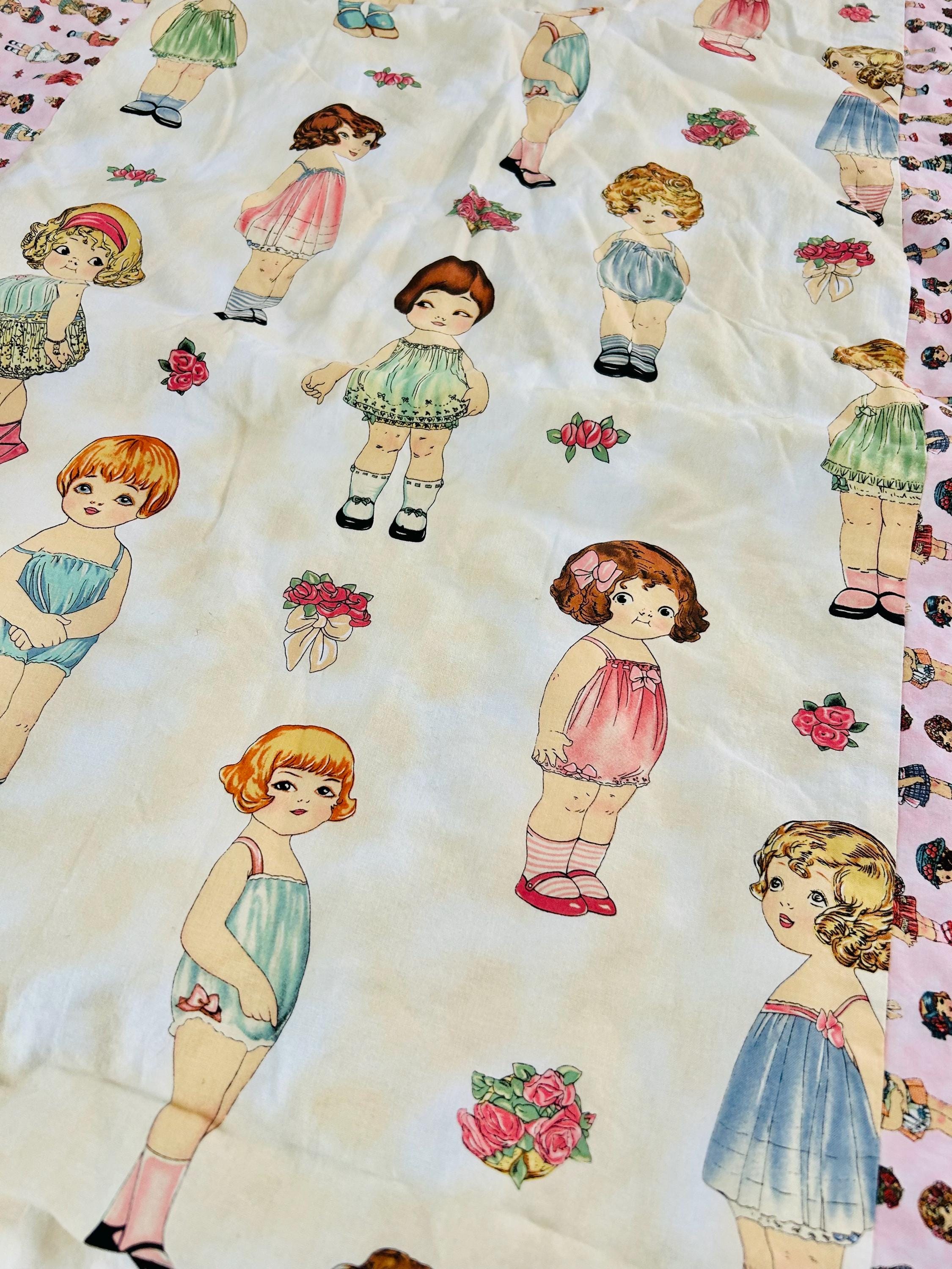 Charming handmade quilt featuring vintage-inspired paper doll imagery, thoughtfully arranged on a soft cream background and framed with coordinating pink doll-print borders. This quilt is signed "Bela" and dated 2020 by the maker.