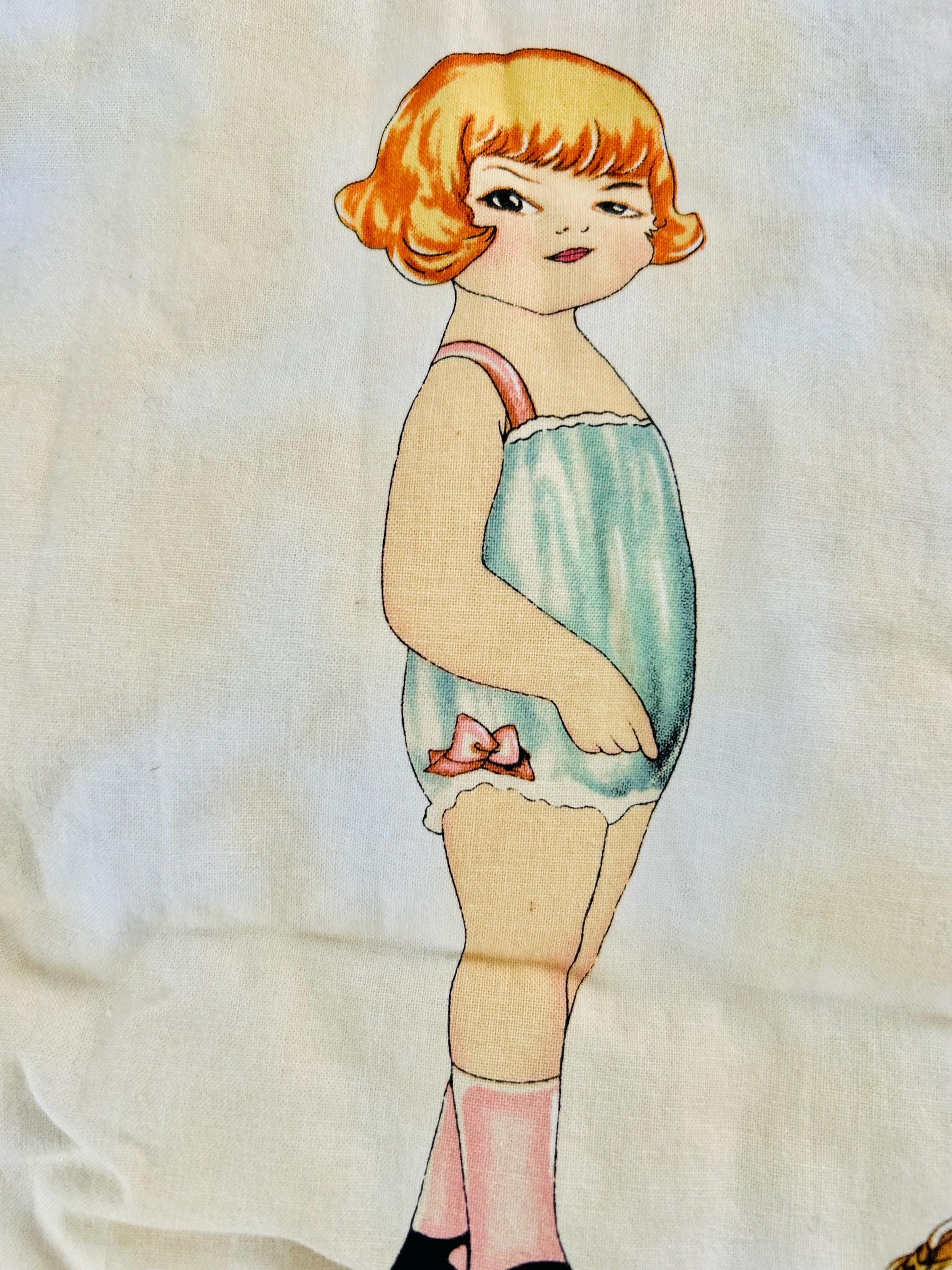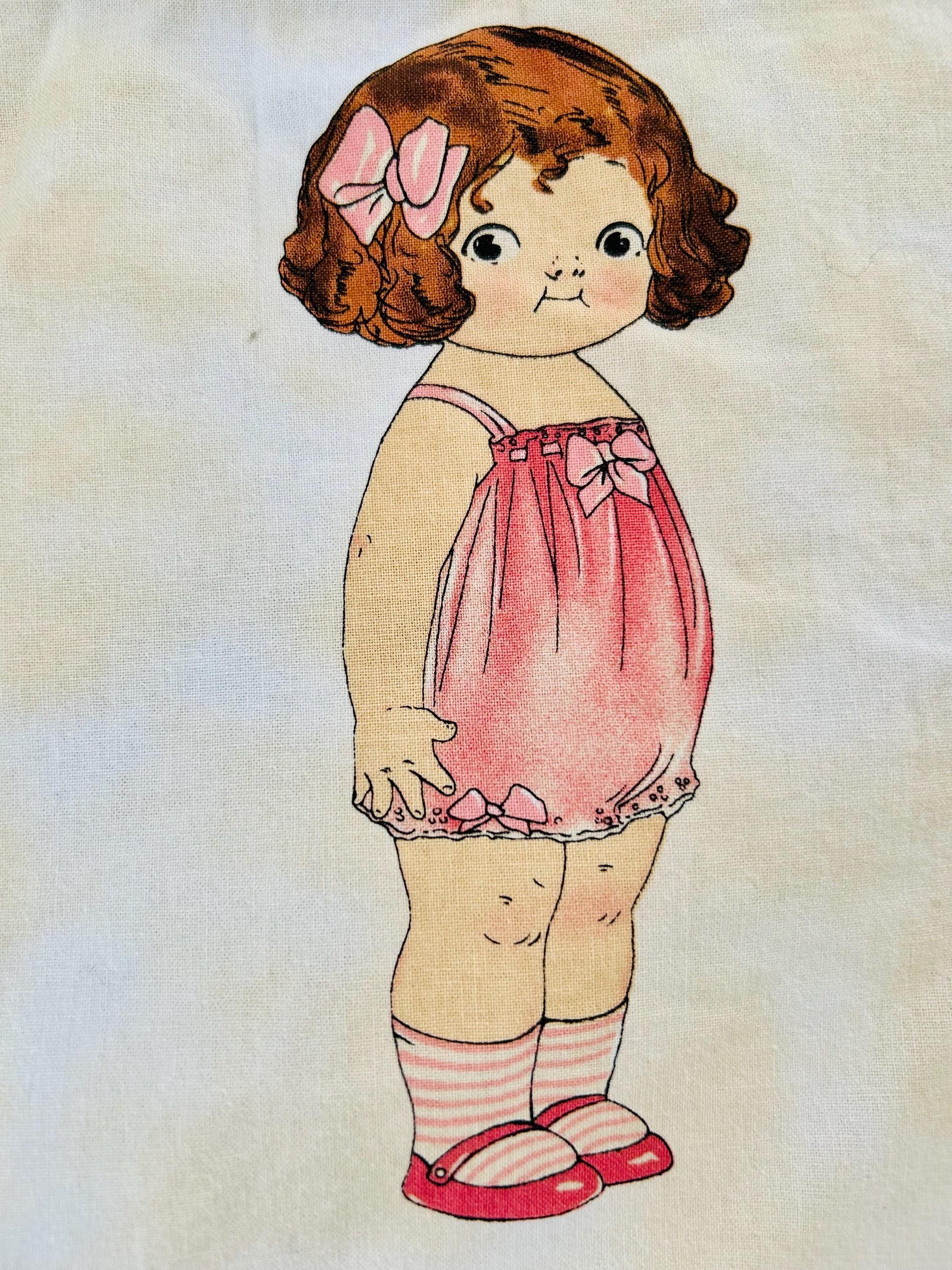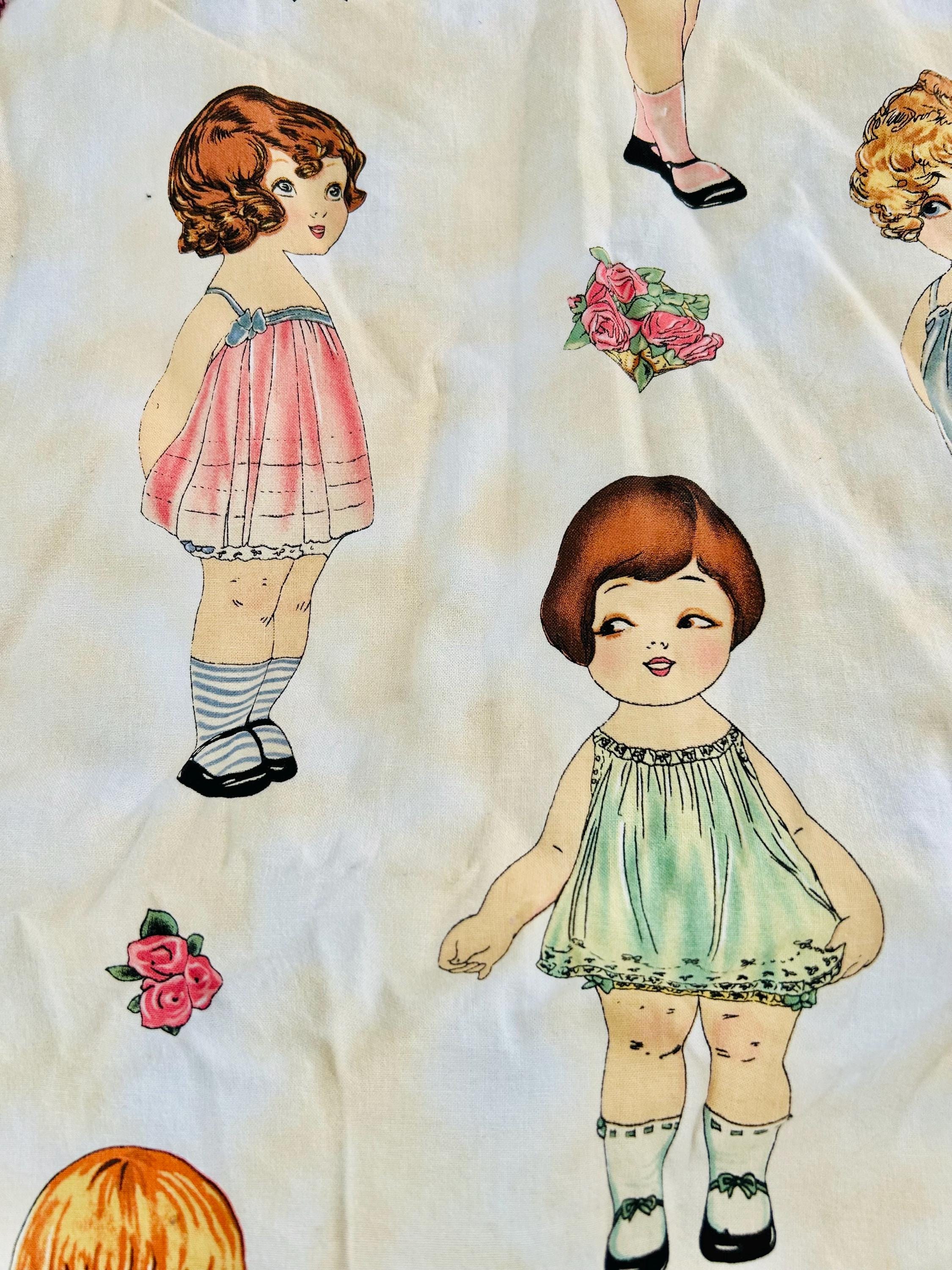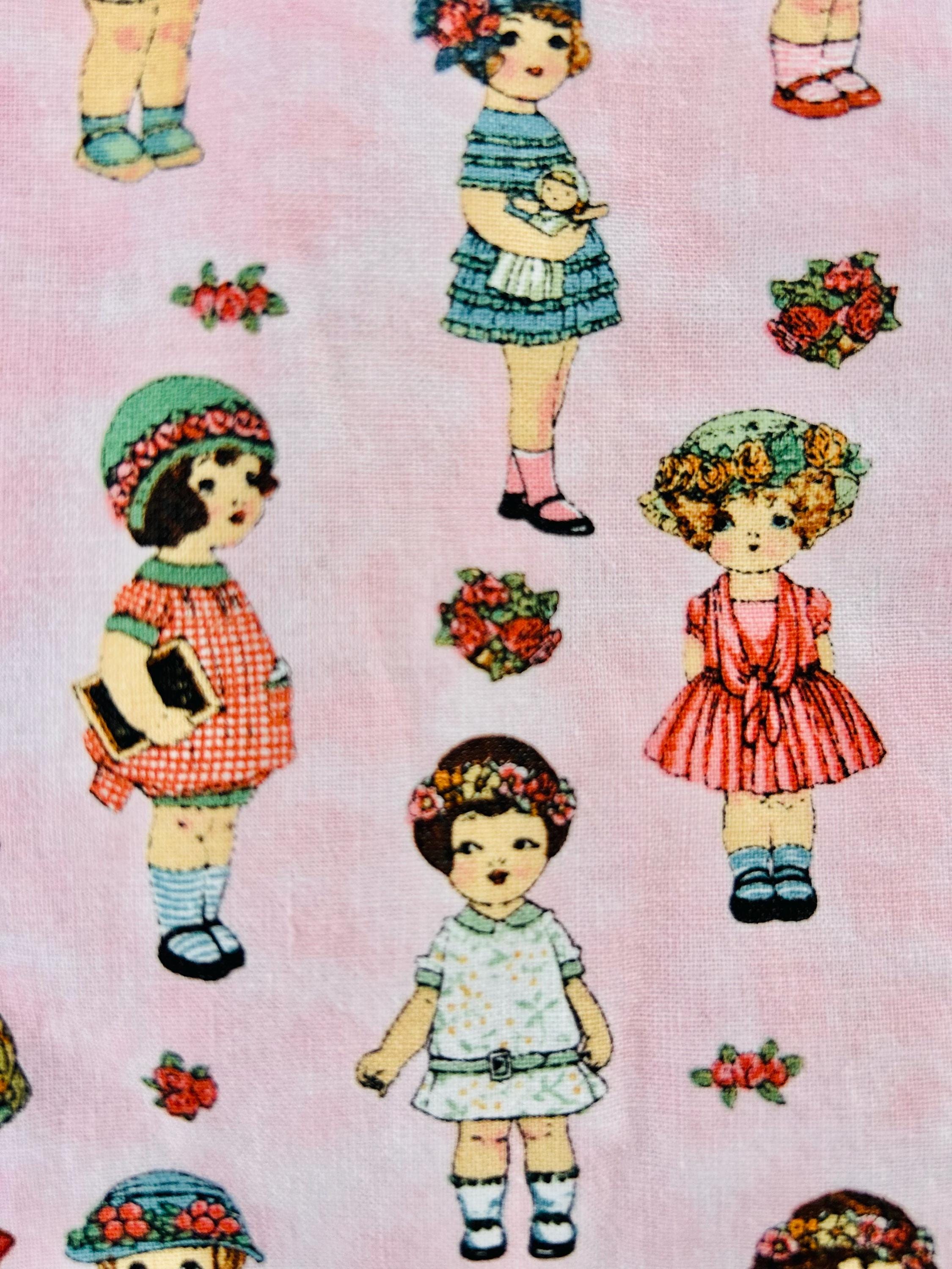 Charming handmade quilt featuring vintage-inspired paper doll imagery, thoughtfully arranged on a soft cream background and framed with coordinating pink doll-print borders. This quilt is signed "Bela" and dated 2020 by the maker.