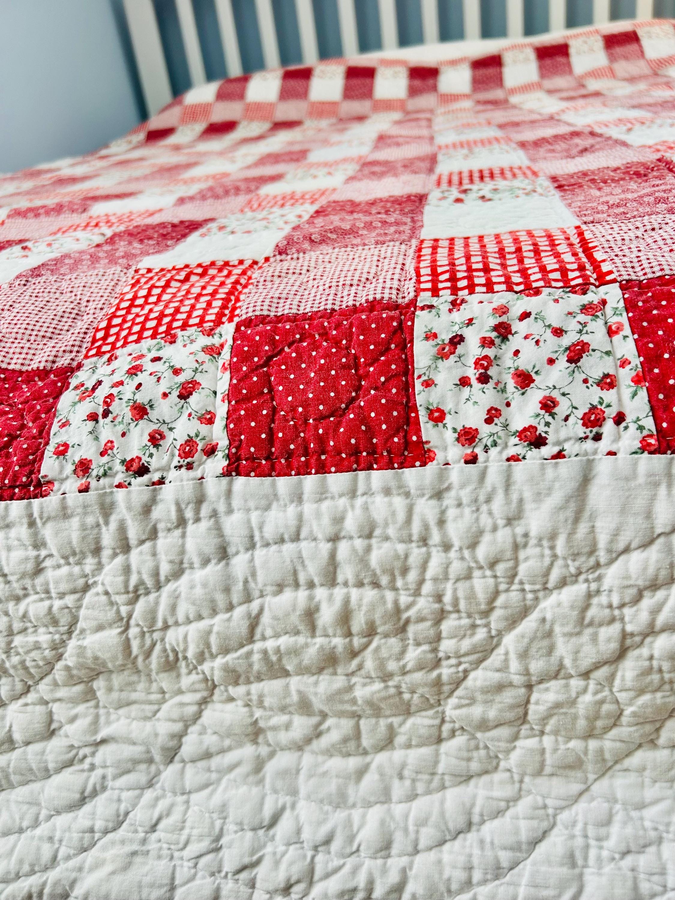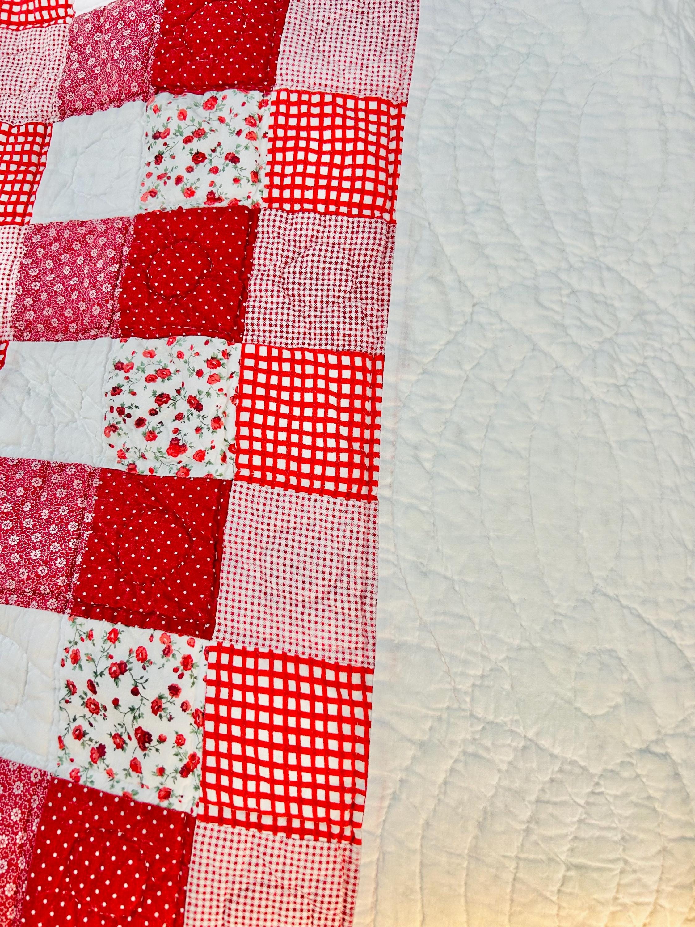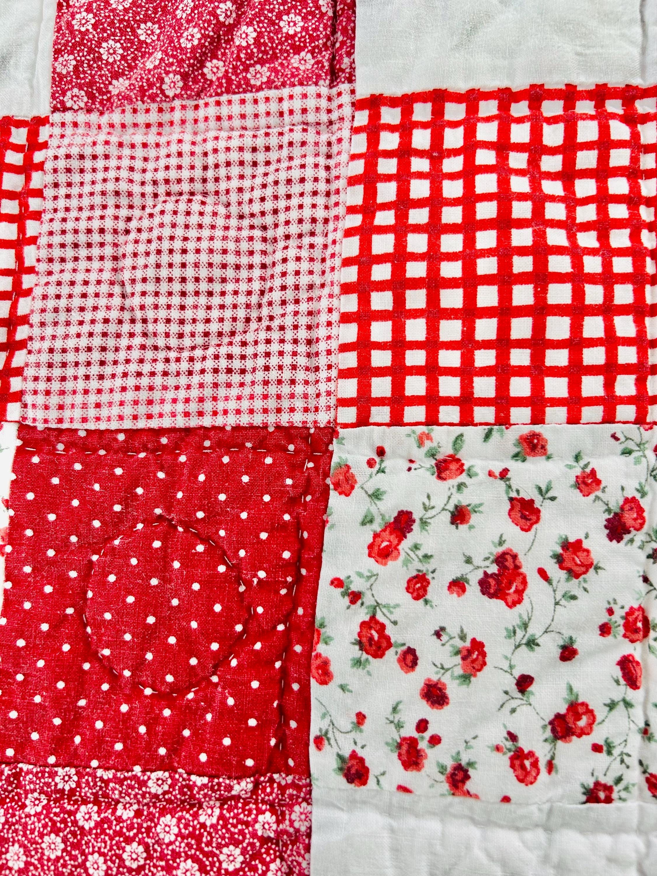Details: • Construction: Handmade patchwork quilt • Quilting: Hand quilted • Era: Circa 1950-1960s • Fabrics: Cotton fabrics and cotton batting • Size: 82” x 90” (Full / Queen) • Colors: red, white, soft pink • Excellent condition – clean, bright, and well preserved