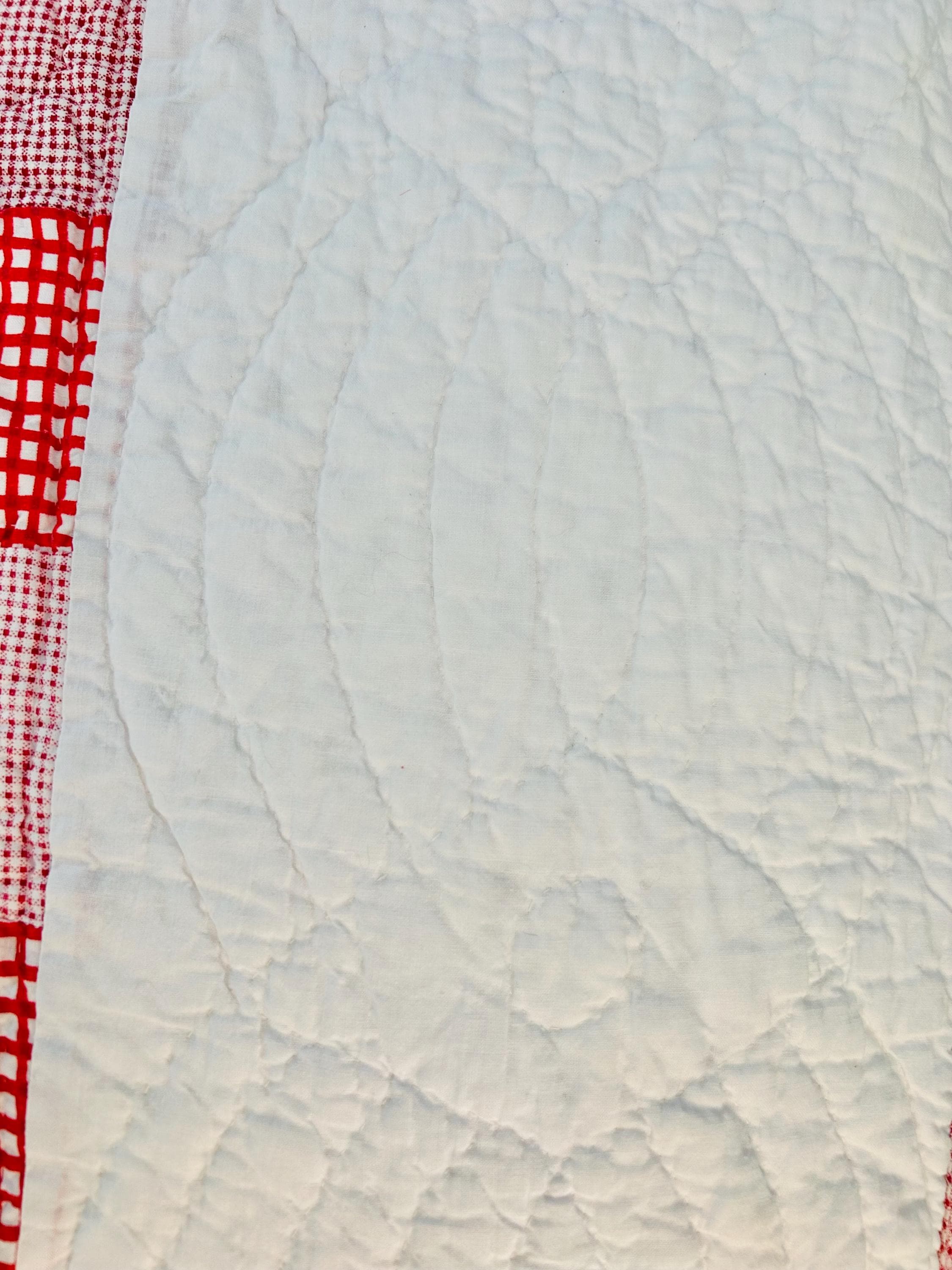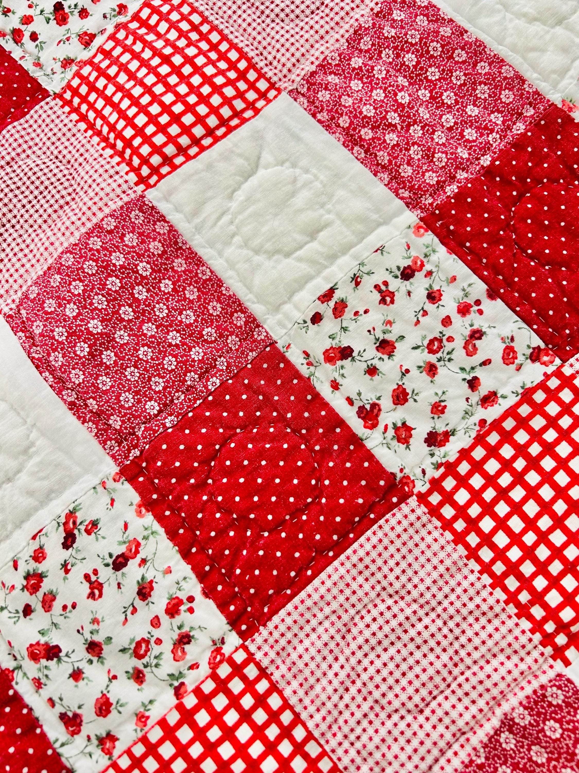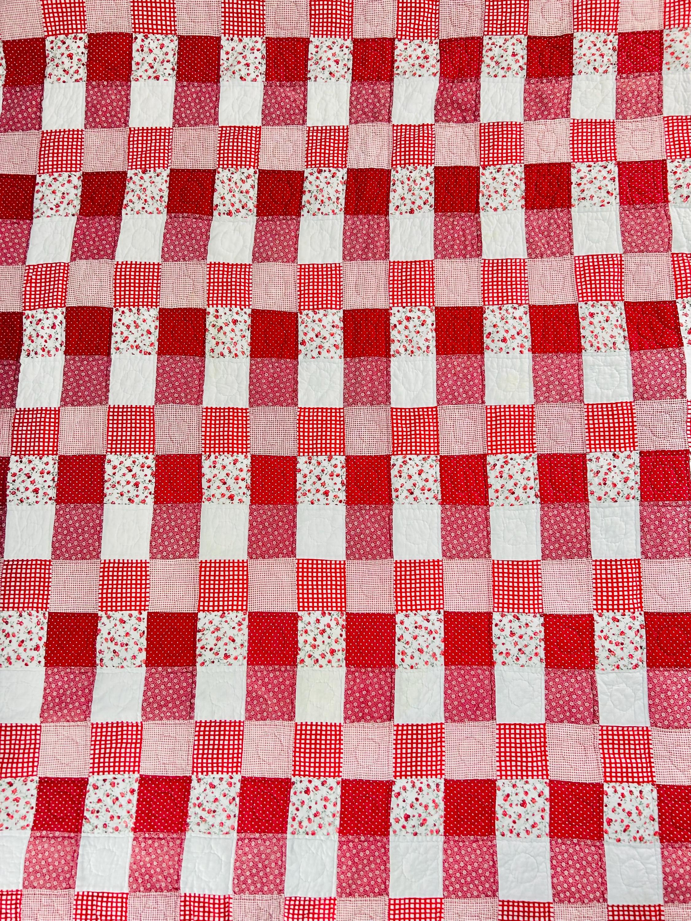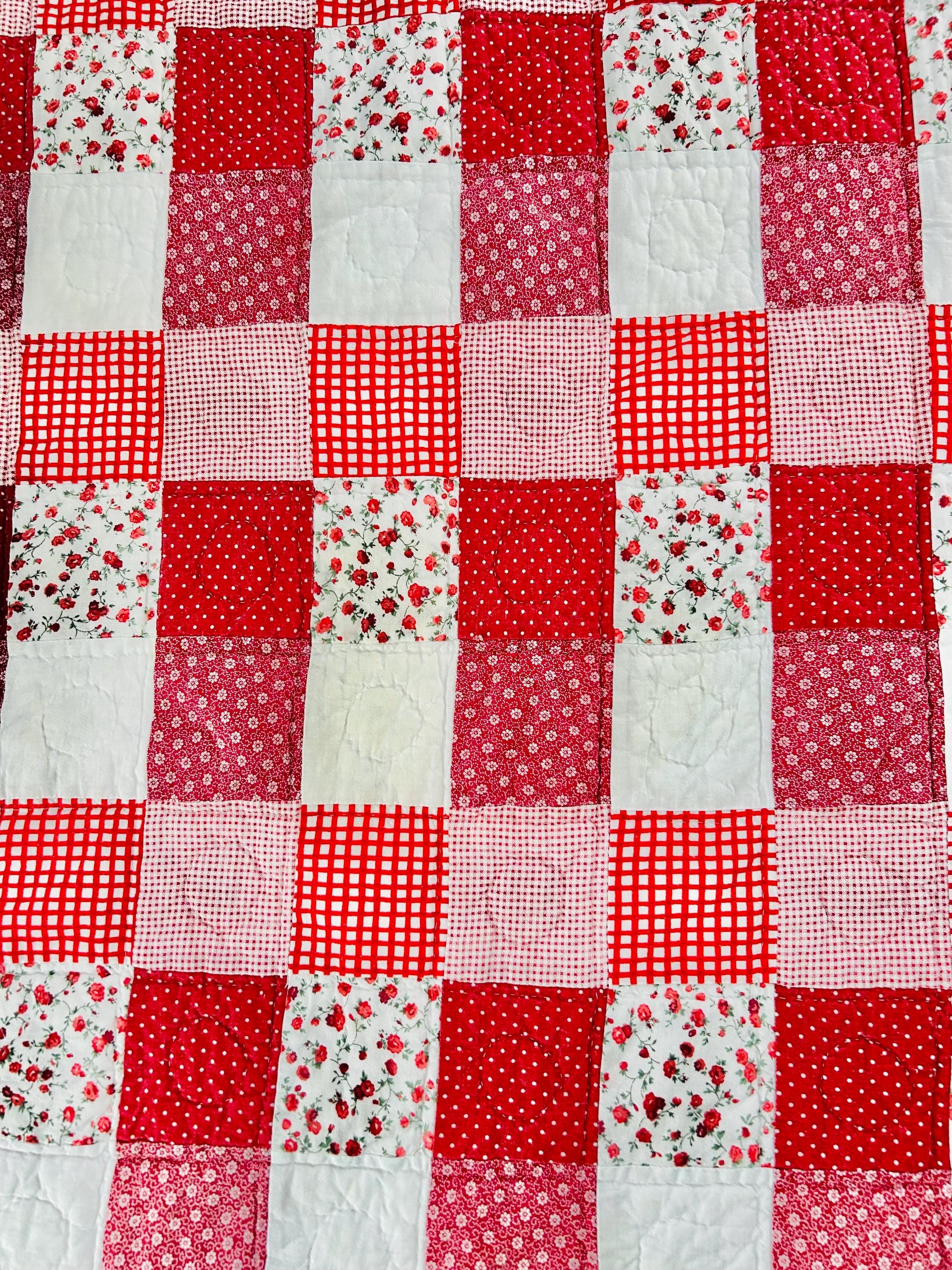 Details: • Construction: Handmade patchwork quilt • Quilting: Hand quilted • Era: Circa 1950-1960s • Fabrics: Cotton fabrics and cotton batting • Size: 82” x 90” (Full / Queen) • Colors: red, white, soft pink • Excellent condition – clean, bright, and well preserved