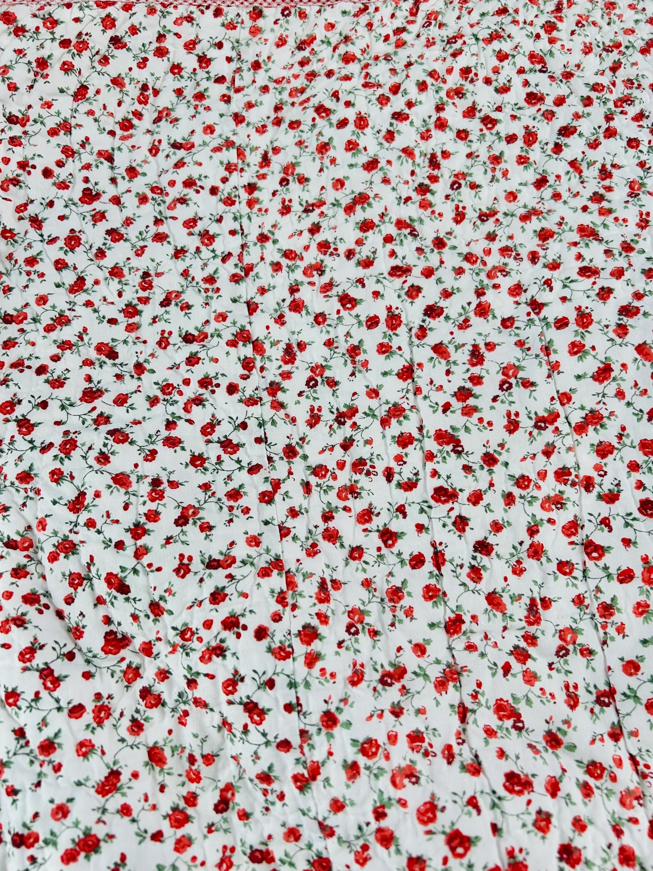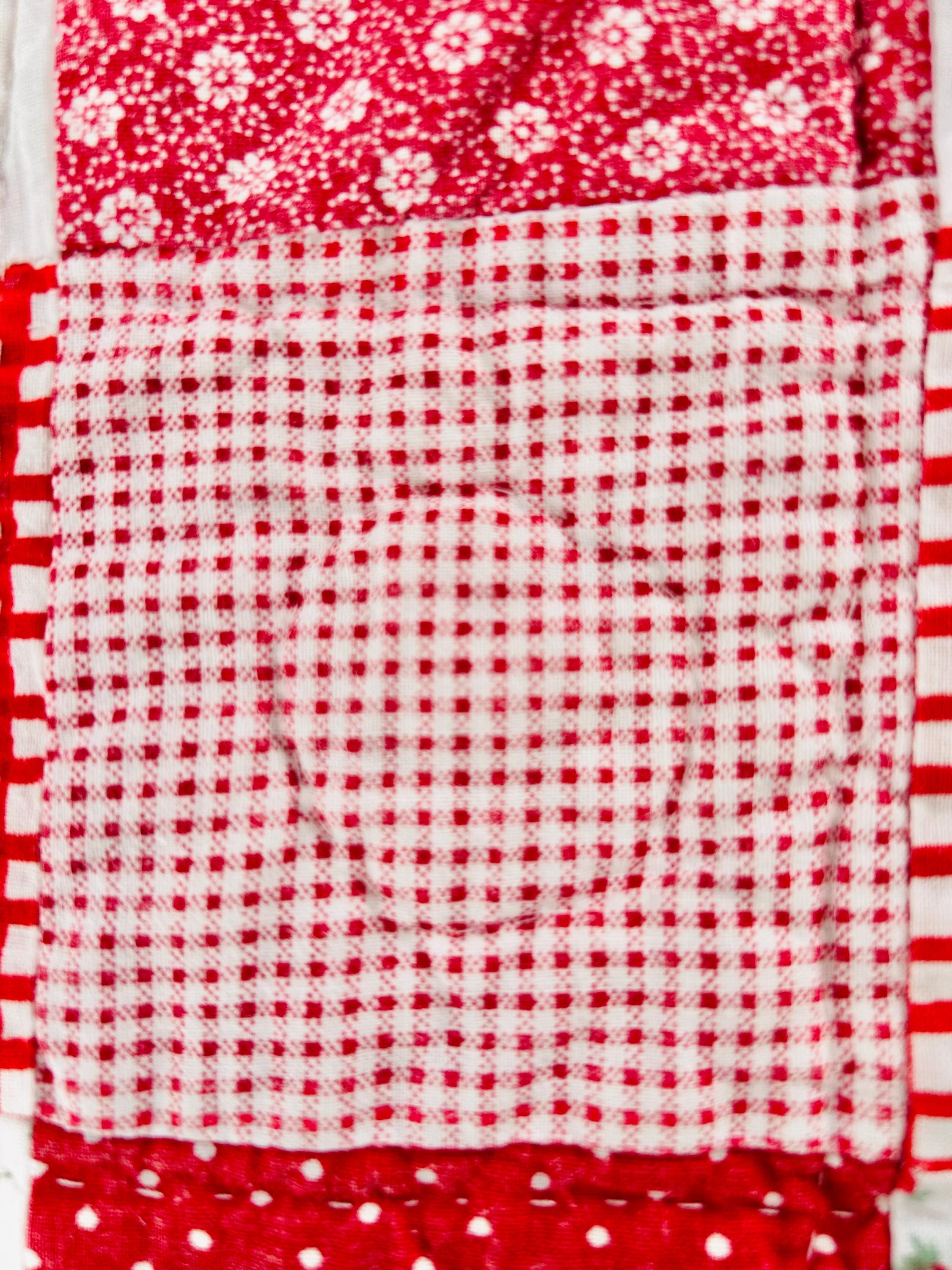 The back is finished in a red and white floral cotton, while the cotton binding is red and white checks and has been machine stitched to both sides. The batting is lightweight.