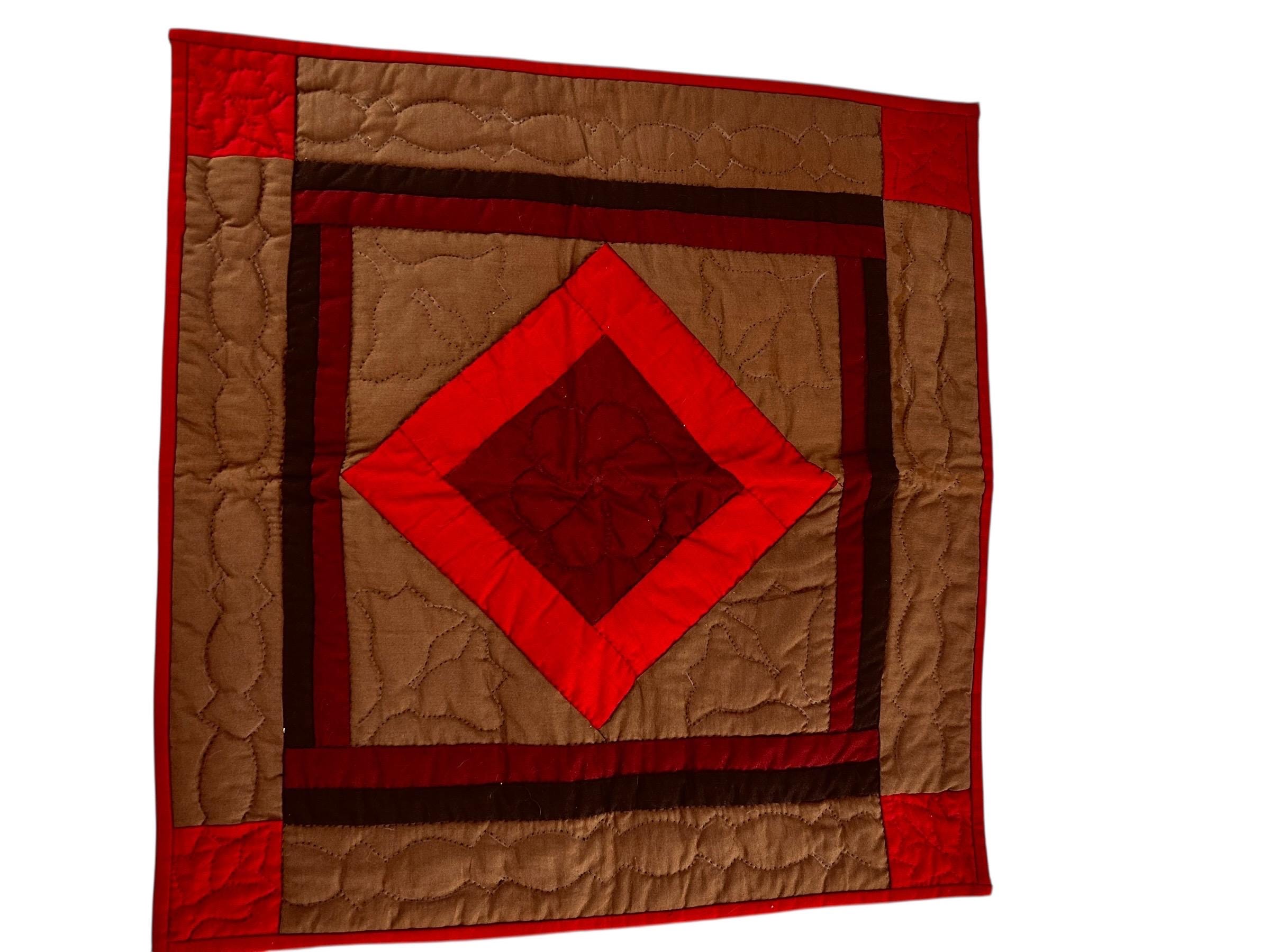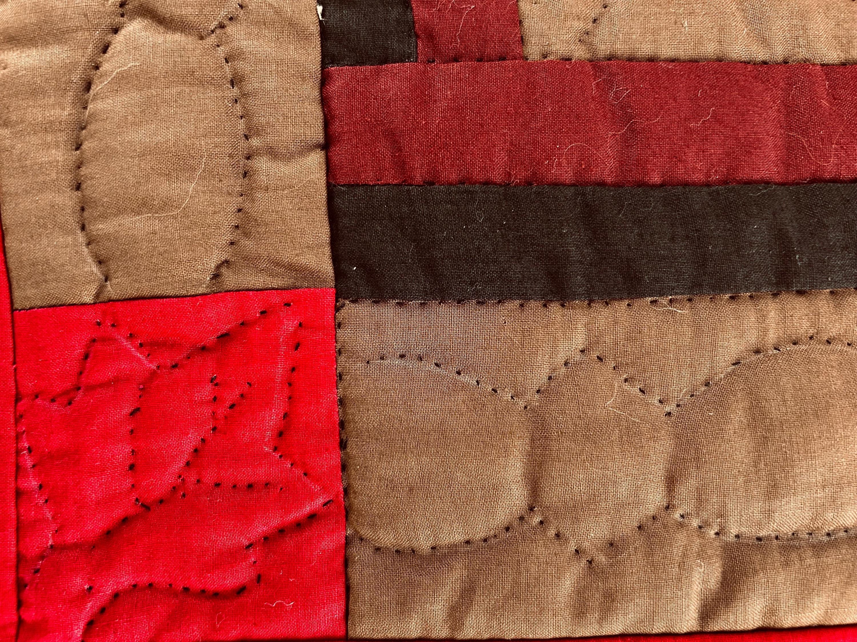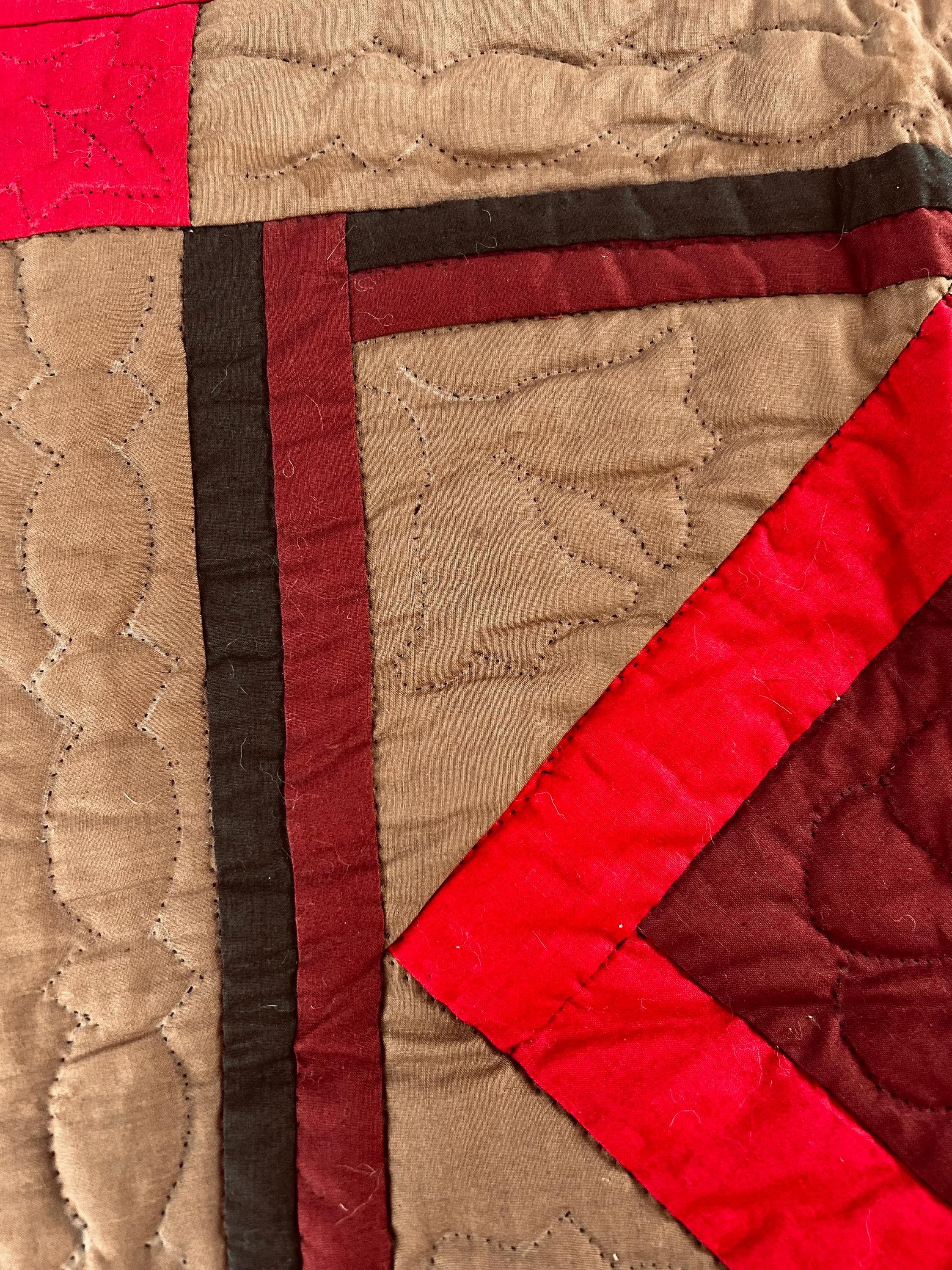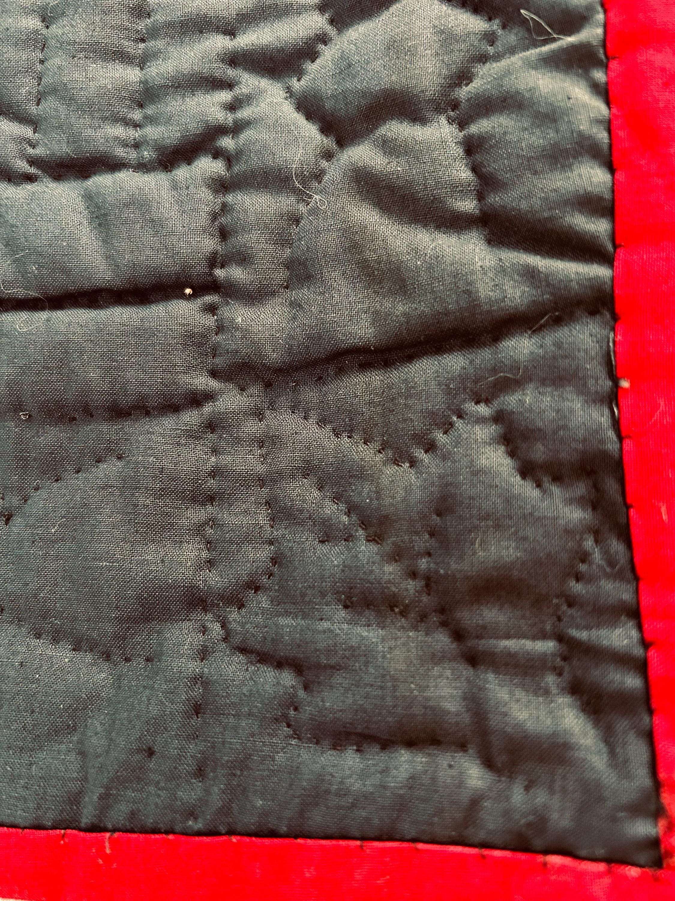 The backing is a plain woven black cotton, with a red cotton binding that has been hand-stitched to both sides. The cotton batting is lightweight.