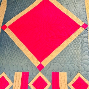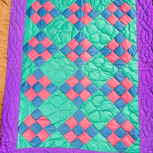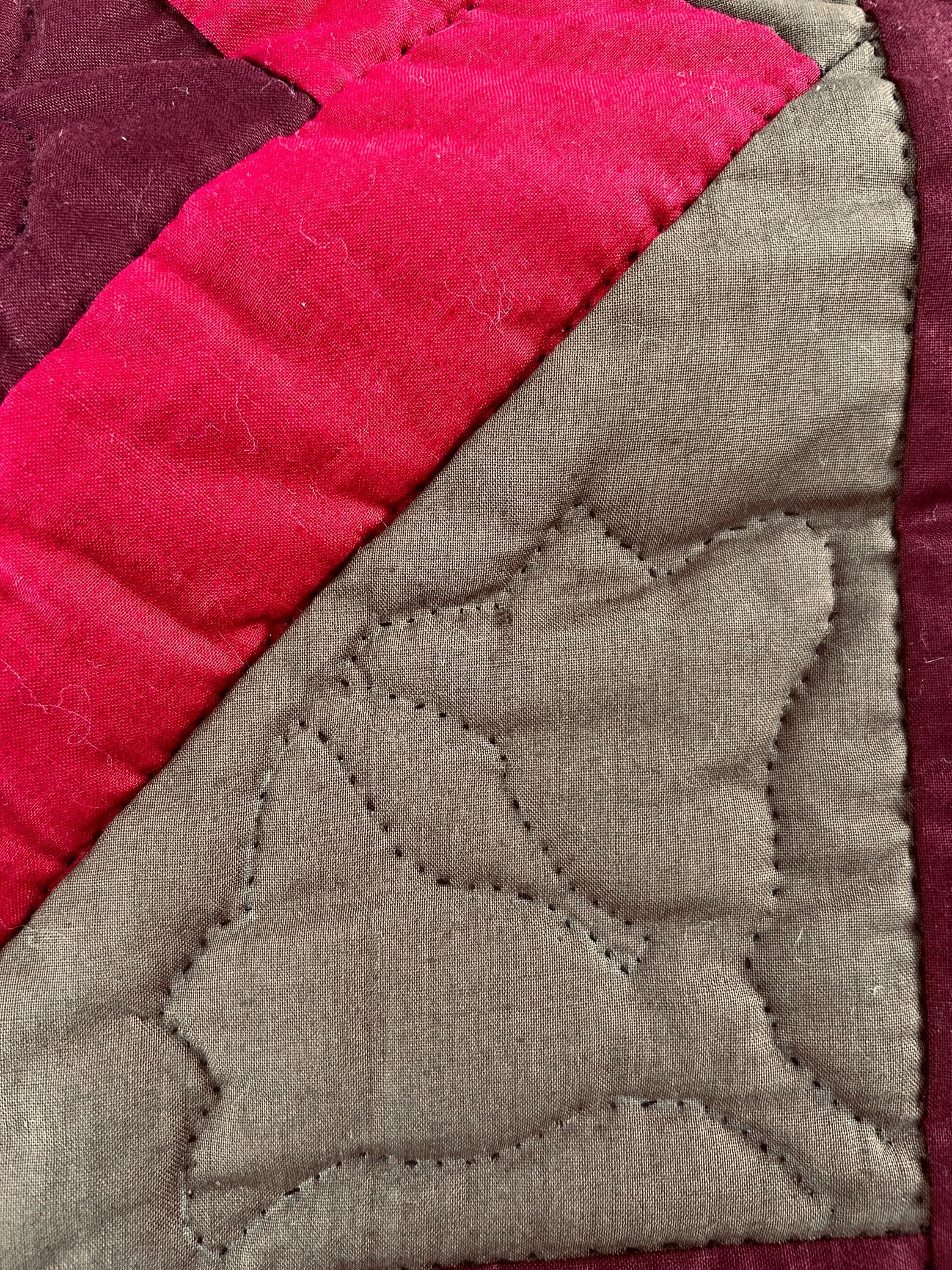 Measuring 21” x 22”, this small quilt was likely made as a doll or teaching quilt, a practice known among Mennonite women for instructing young girls in piecing and quilting techniques.