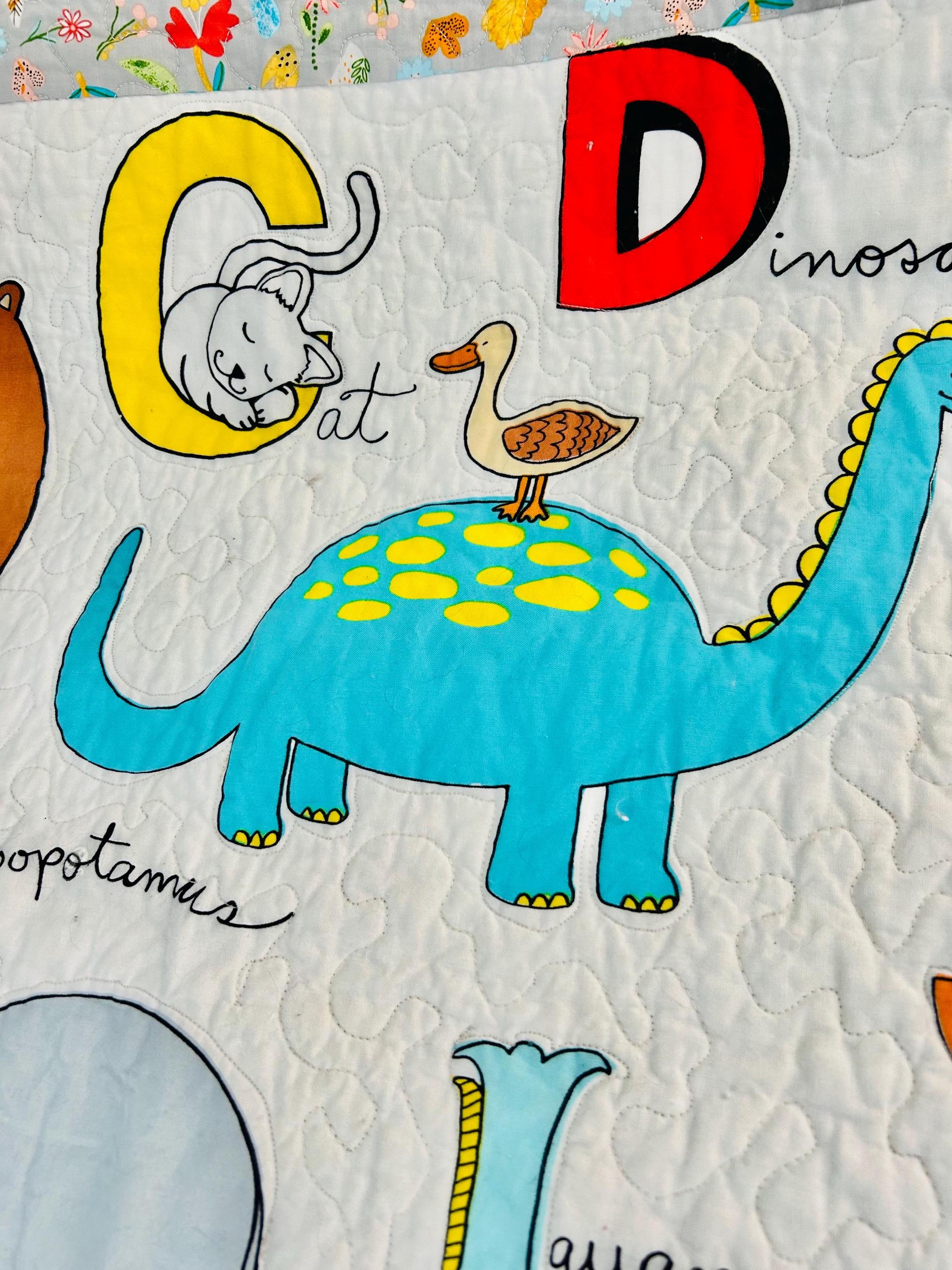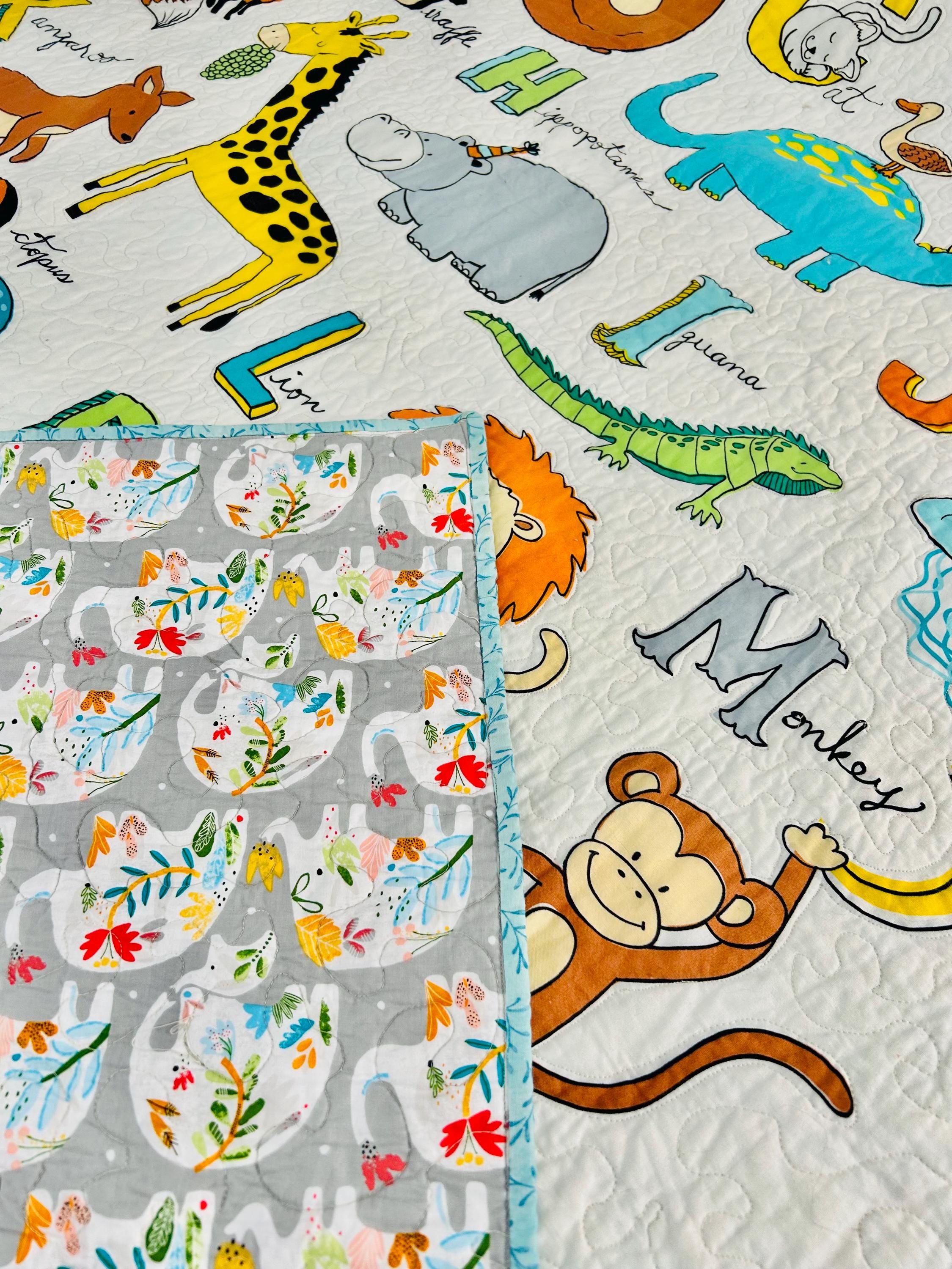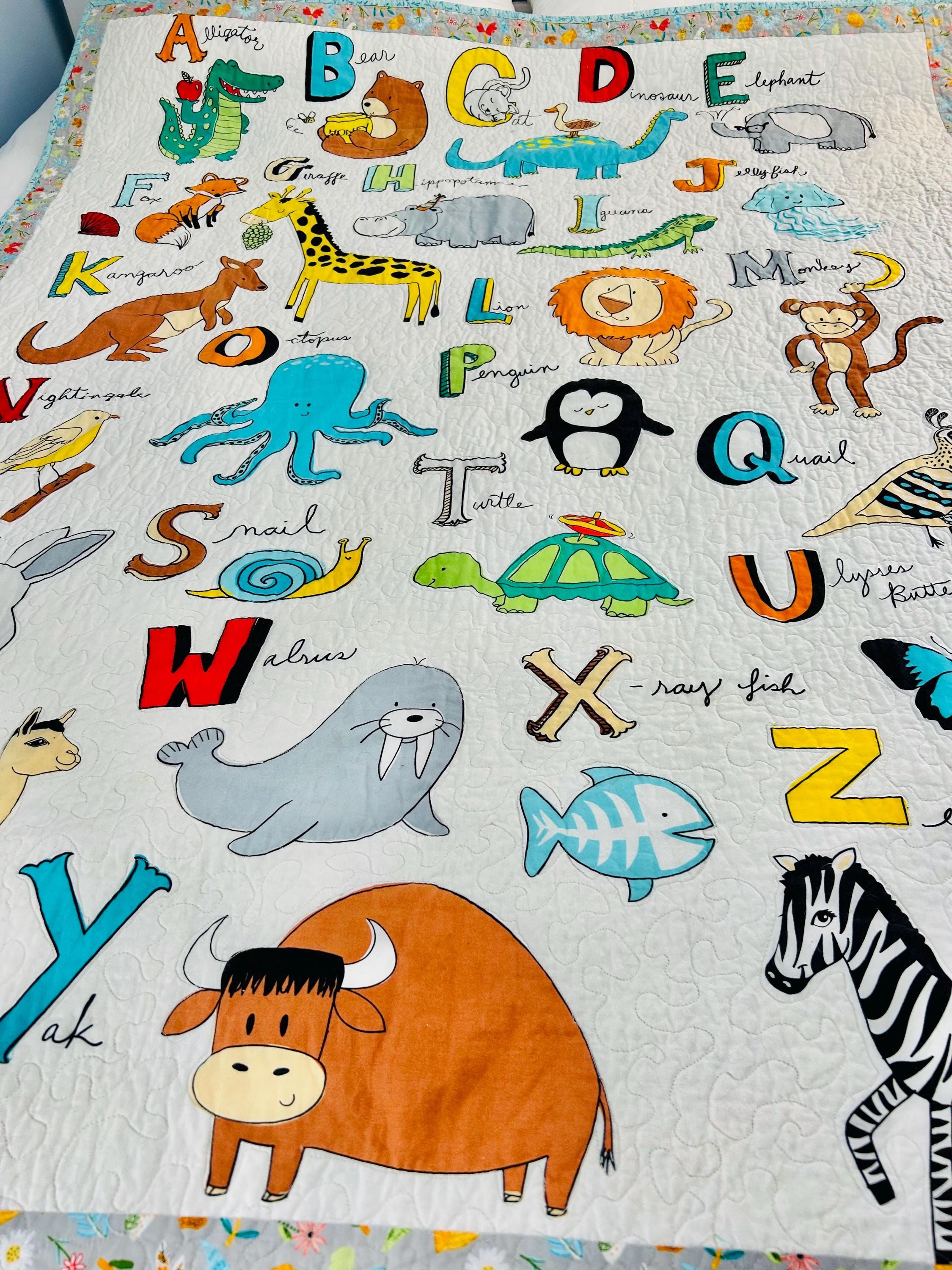 This charming handmade ABC animal quilt is a beautifully crafted modern children’s quilt that is both playful and educational. Featuring the full alphabet with whimsical illustrated animals—from Alligator to Zebra—it is a wonderful nursery accent, toddler bedspread, or cozy learning blanket. The long-arm quilting is in a meandering path that follows and outlines all of the ABC animals.