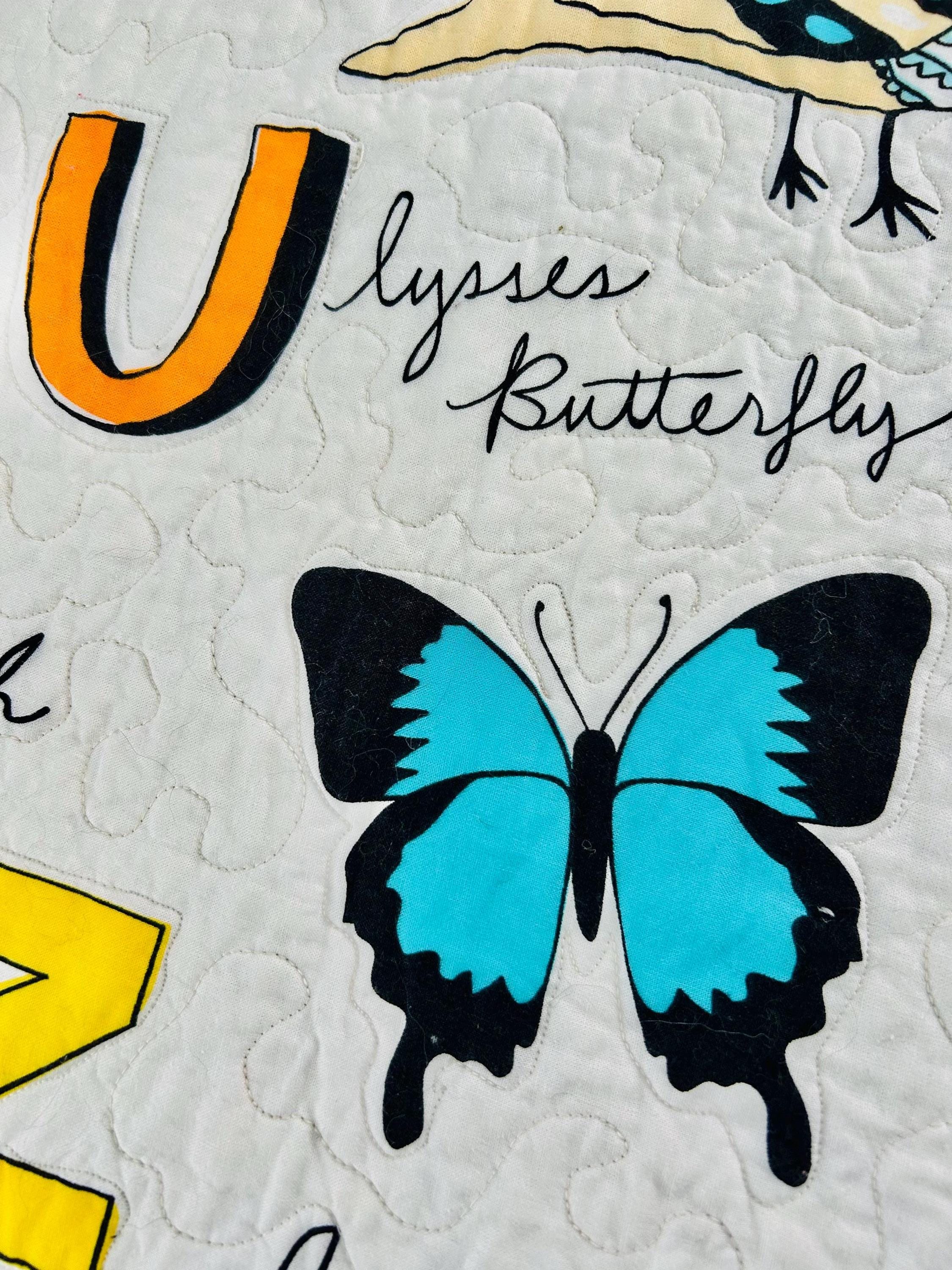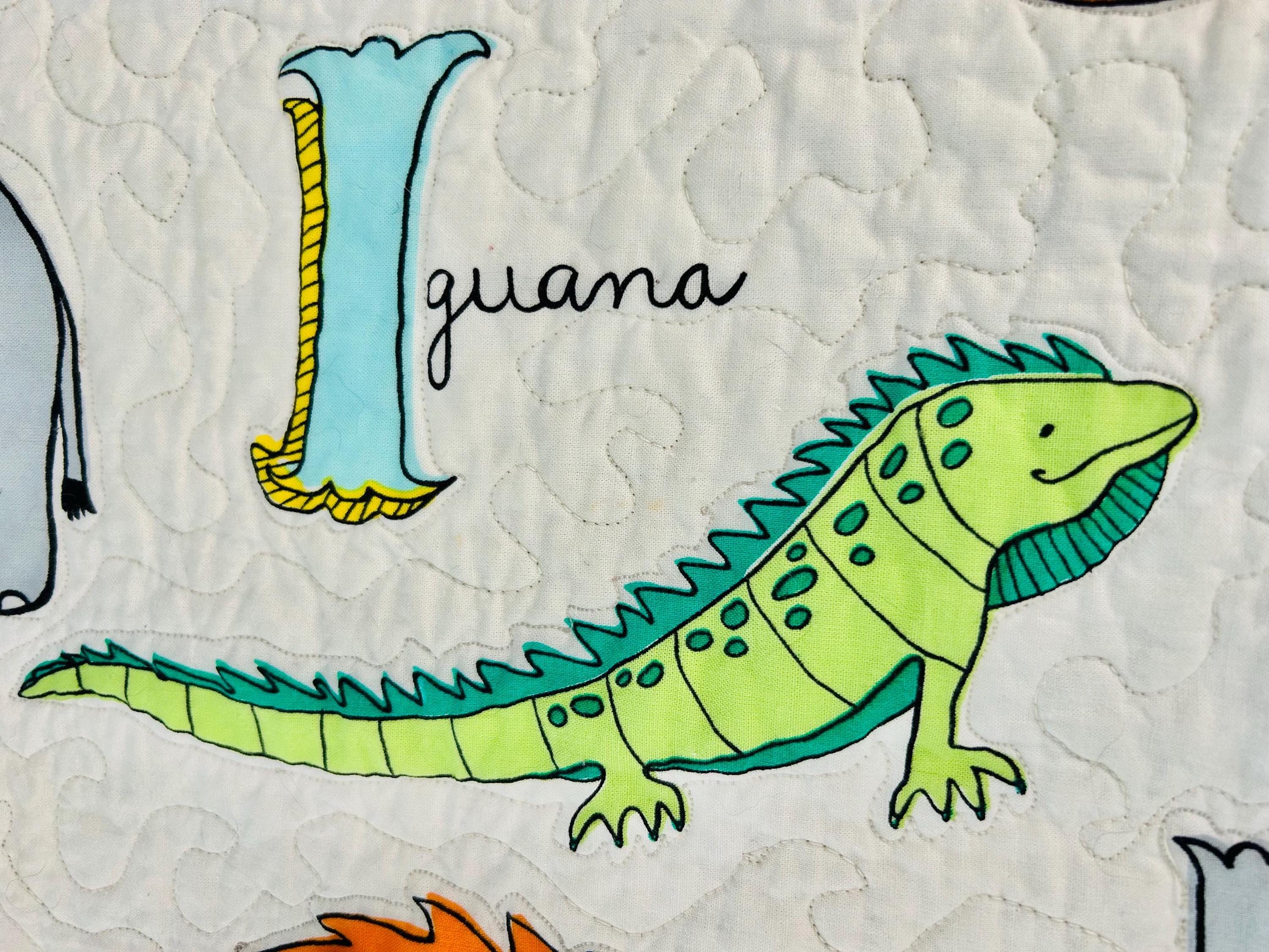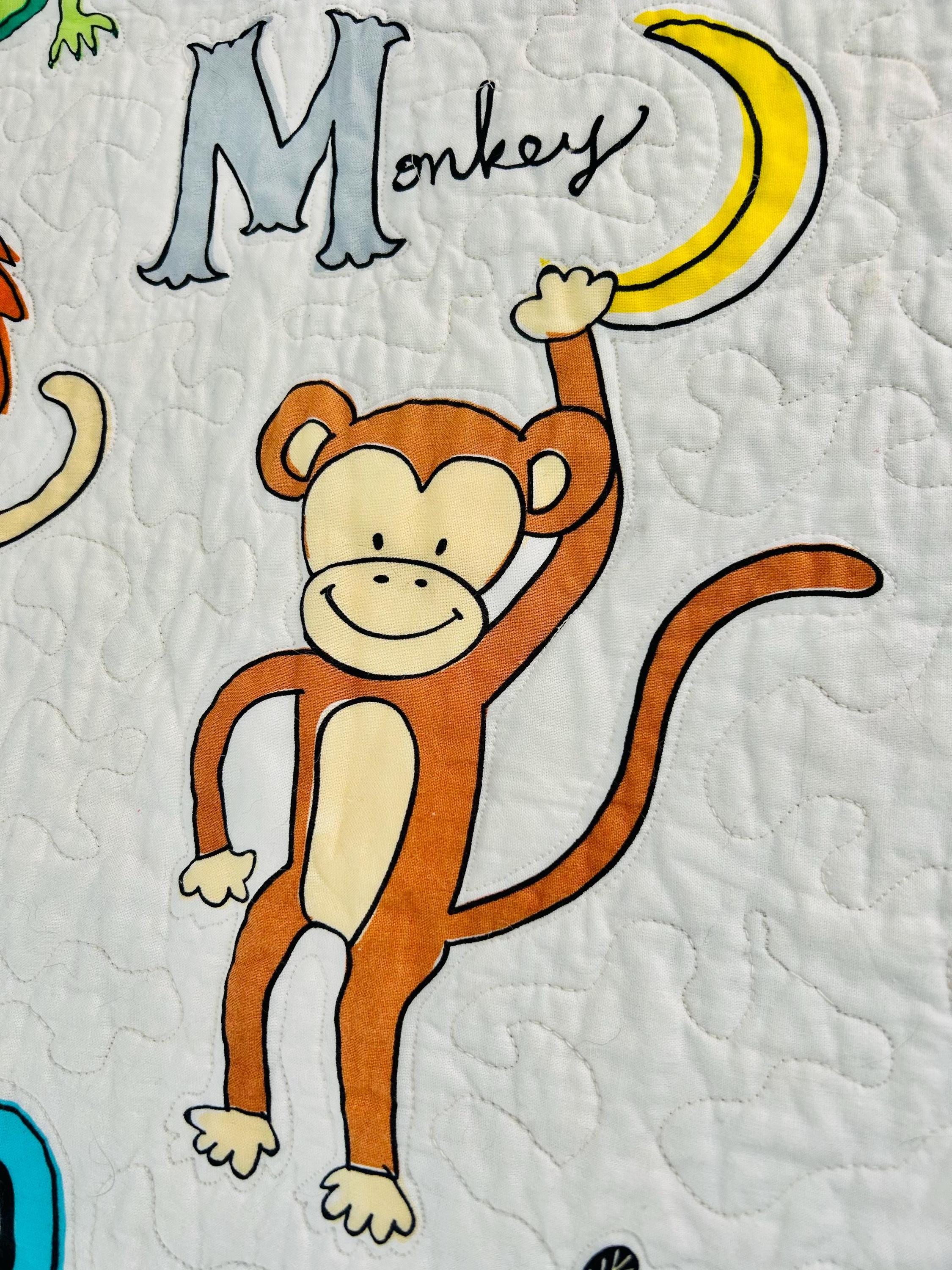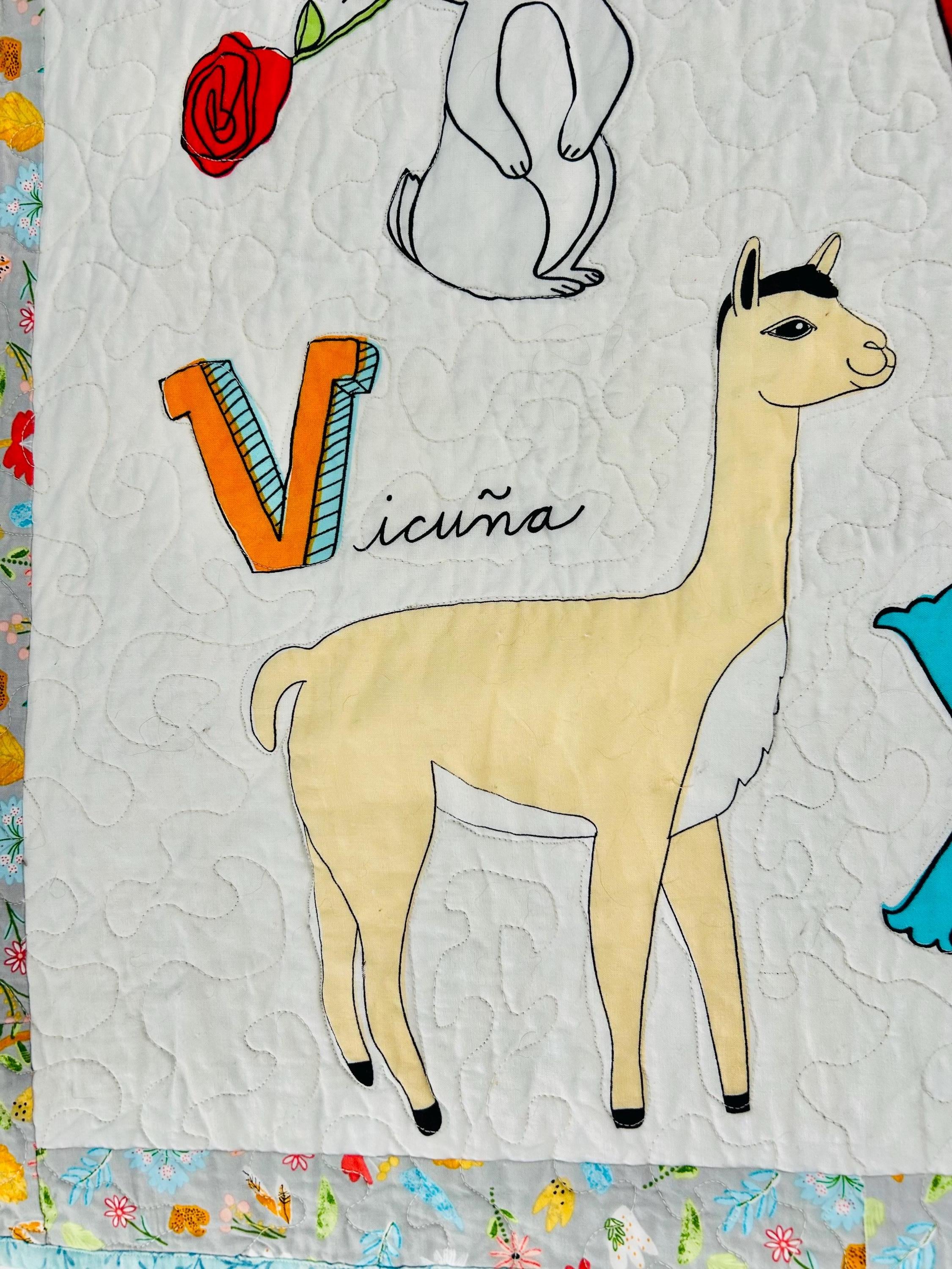 This charming handmade ABC animal quilt is a beautifully crafted modern children’s quilt that is both playful and educational. Featuring the full alphabet with whimsical illustrated animals—from Alligator to Zebra—it is a wonderful nursery accent, toddler bedspread, or cozy learning blanket. The long-arm quilting is in a meandering path that follows and outlines all of the ABC animals.