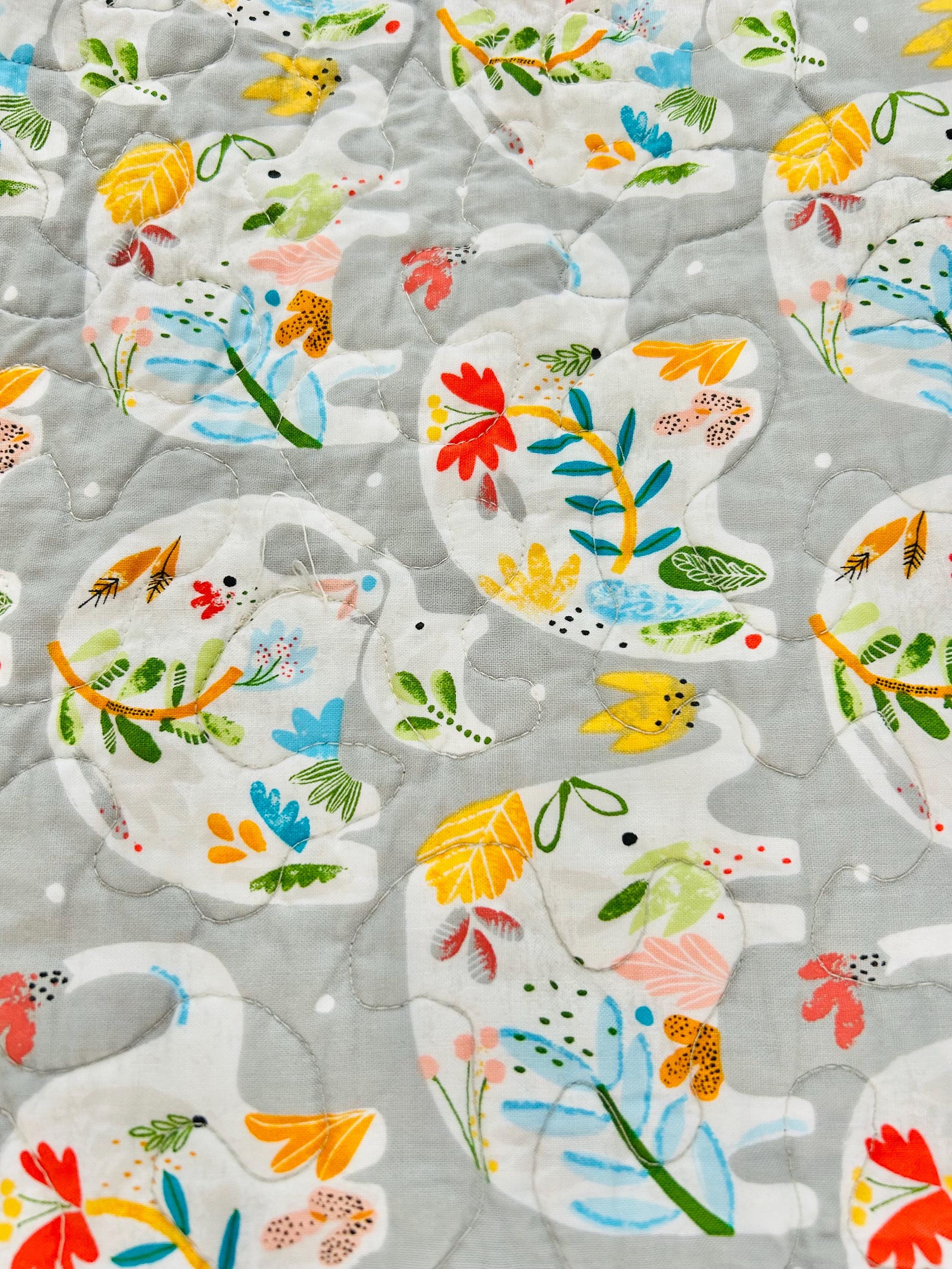 Made with high-quality modern cotton fabrics, the quilt is bright and cheerful with a cotton back of elephants and flowers. The binding is blue floral cotton that has been machine stitched to both sides. The batting is lightweight.
