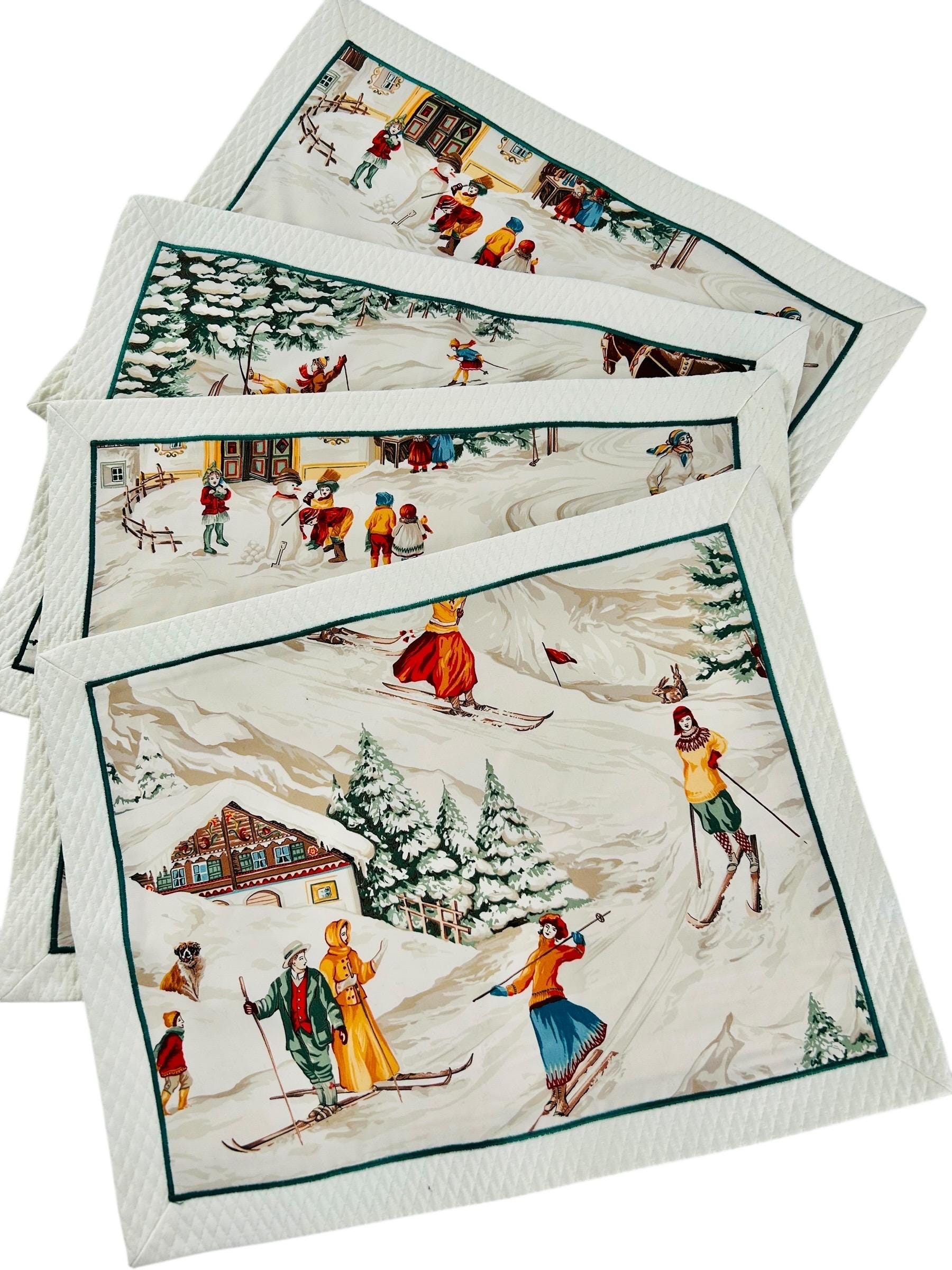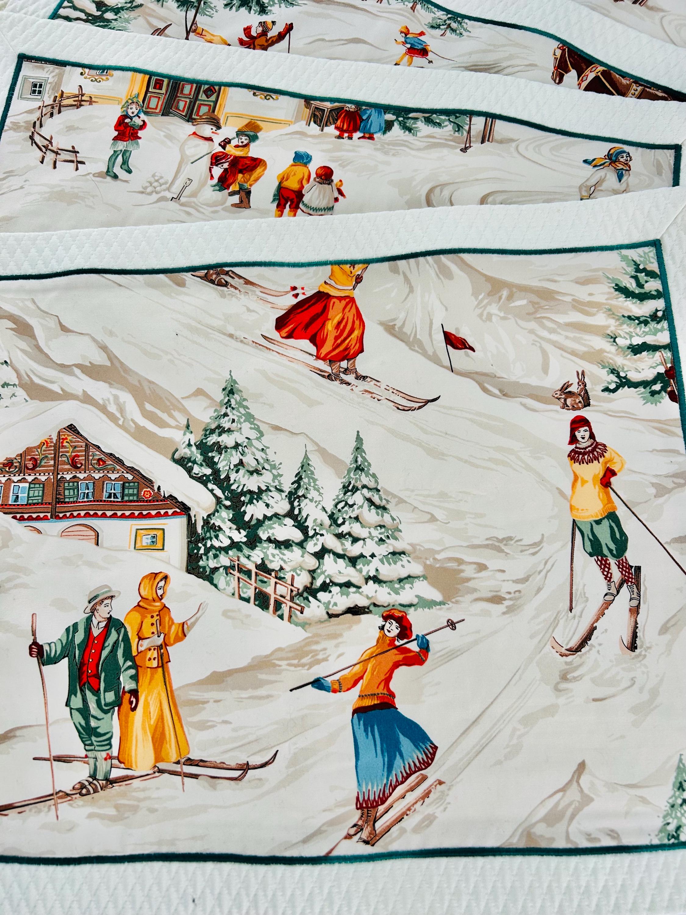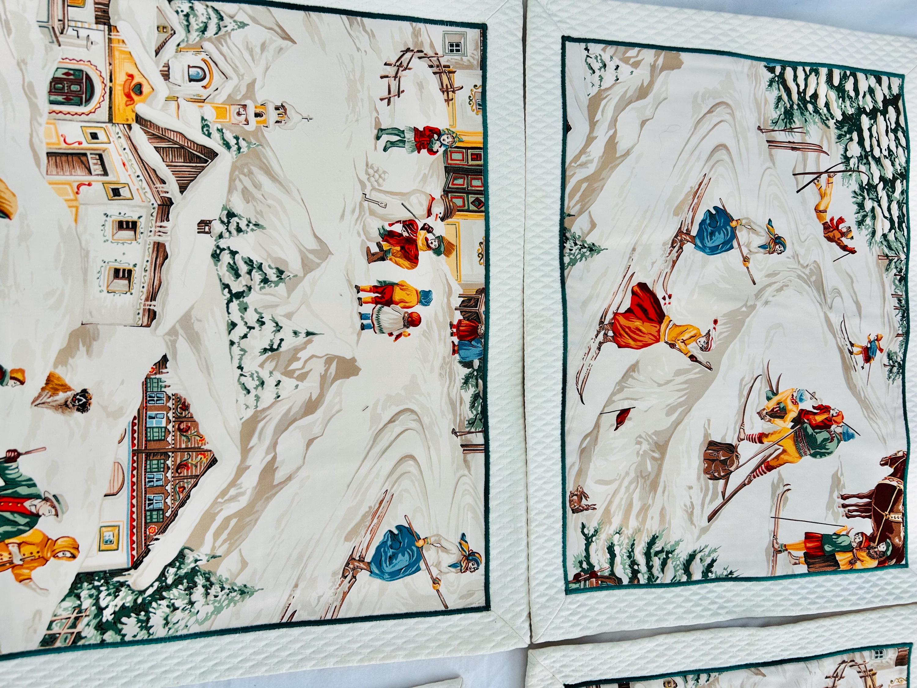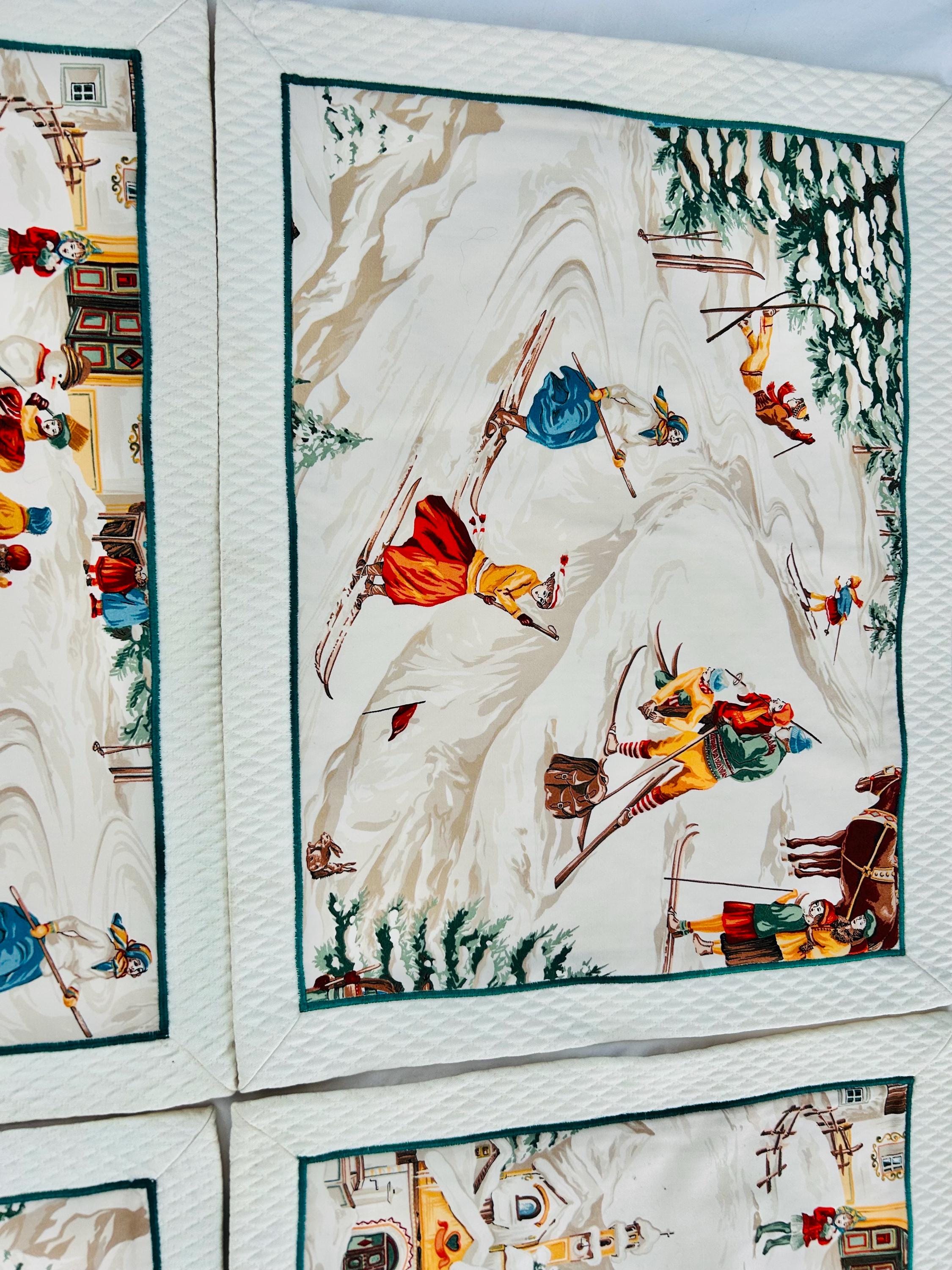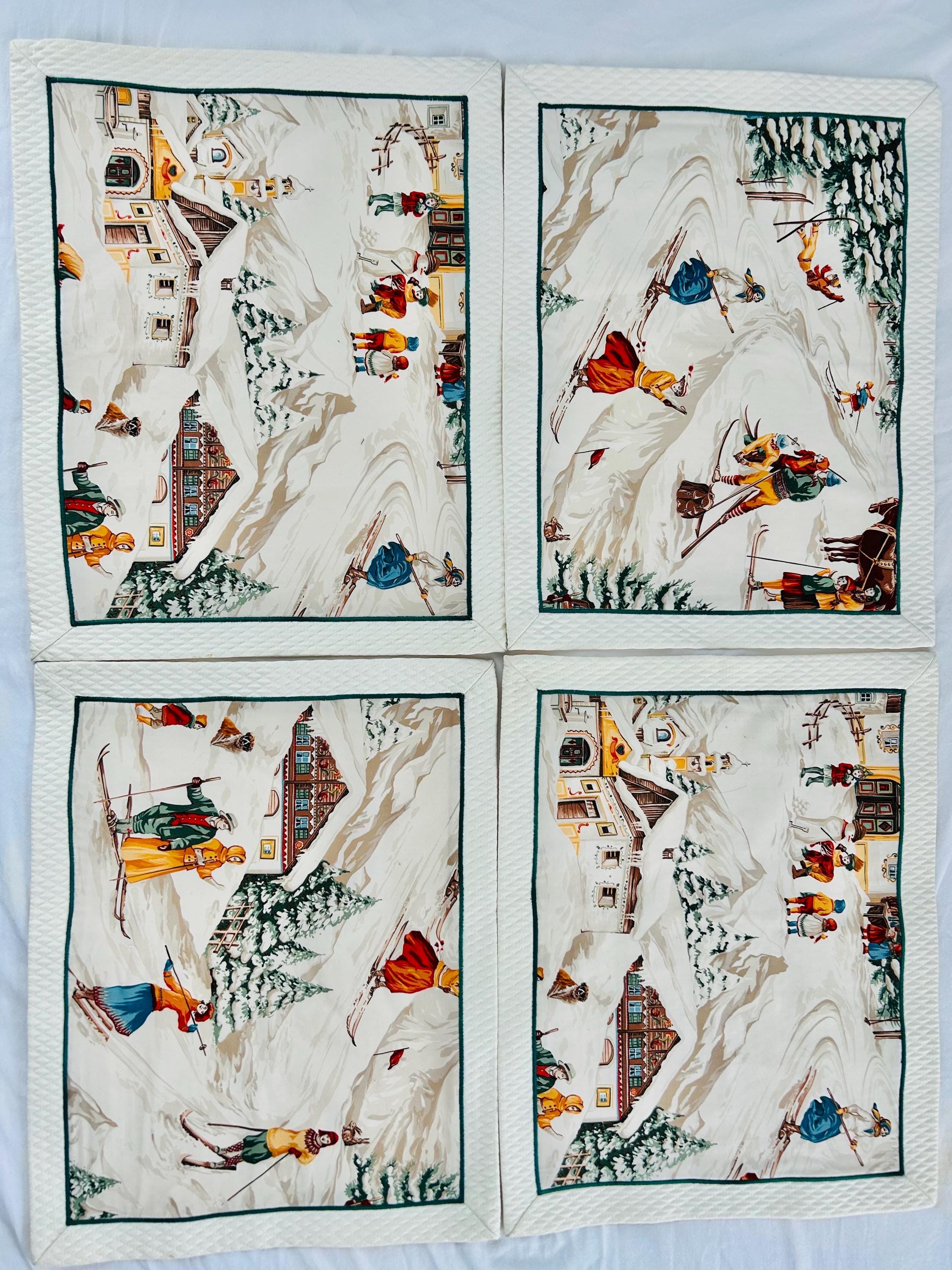Exceptional unused set of four luxury placemats by Pierre Frey Paris (circa 1980s-1990s) featuring a charming Alpine winter scene with skiers, village architecture, horses, and snowy mountain landscapes. These placemats incorporate the iconic Les Trois Vallées fabric, which is inspired by 1960s winter sports magazines.