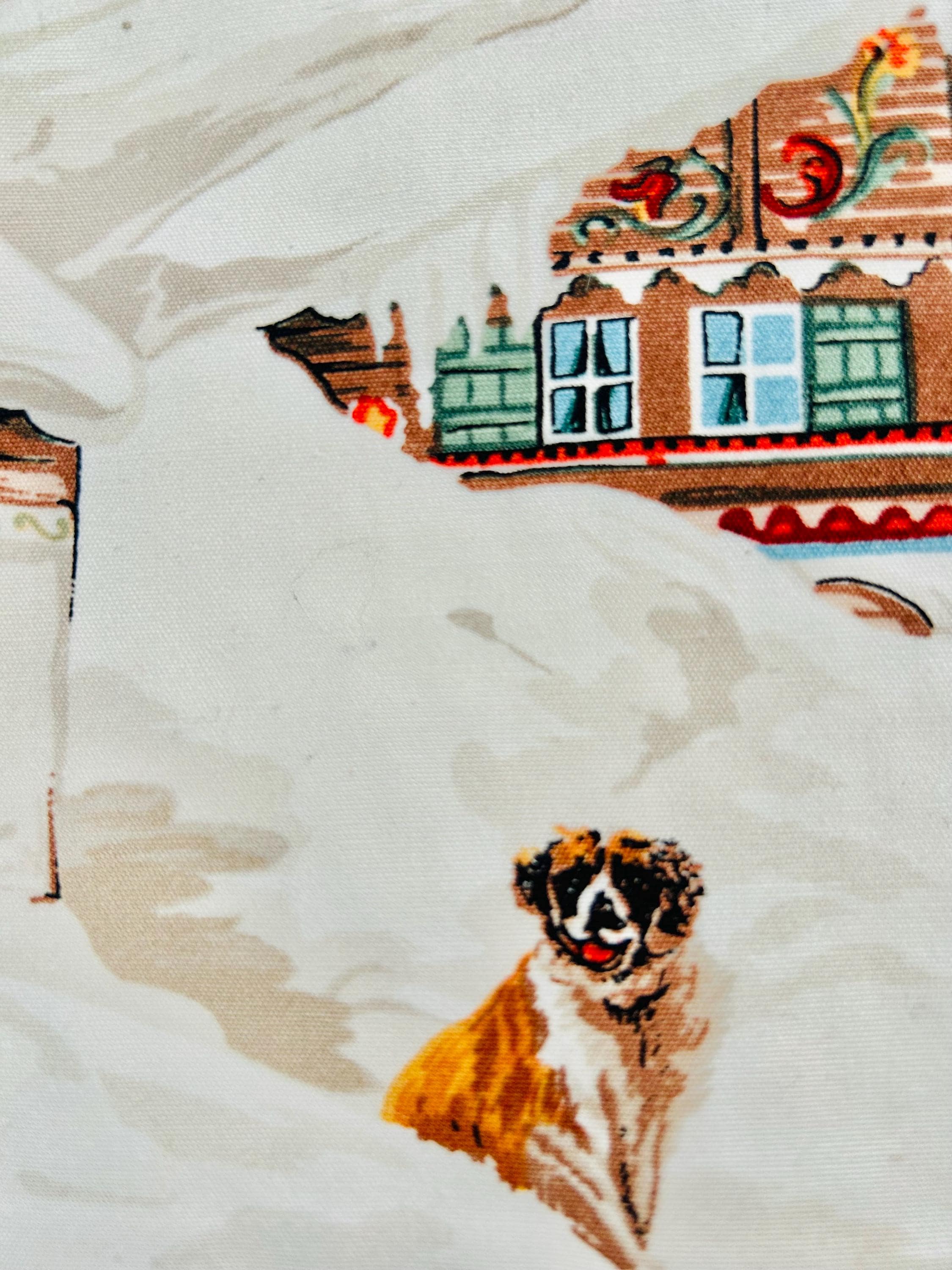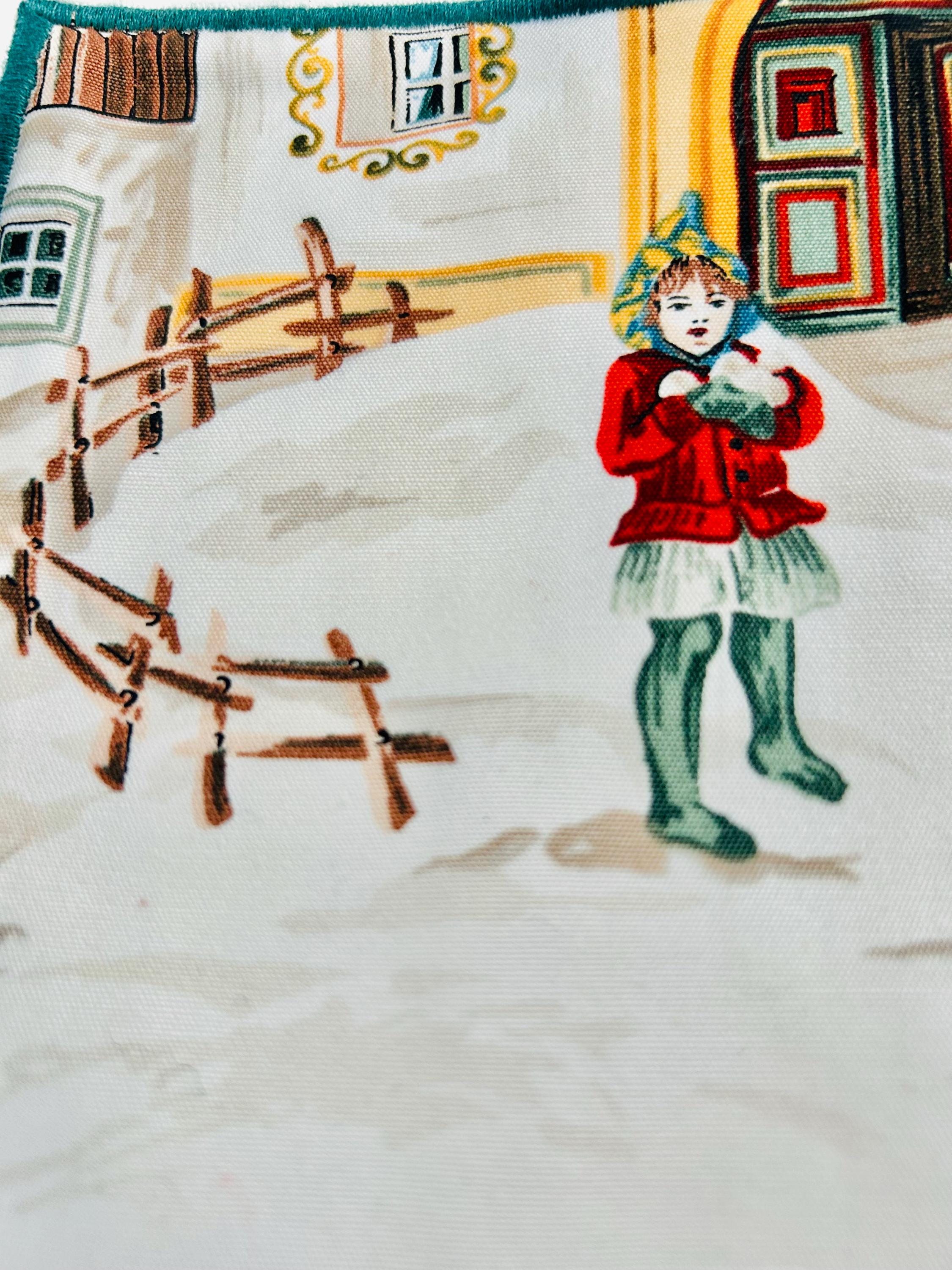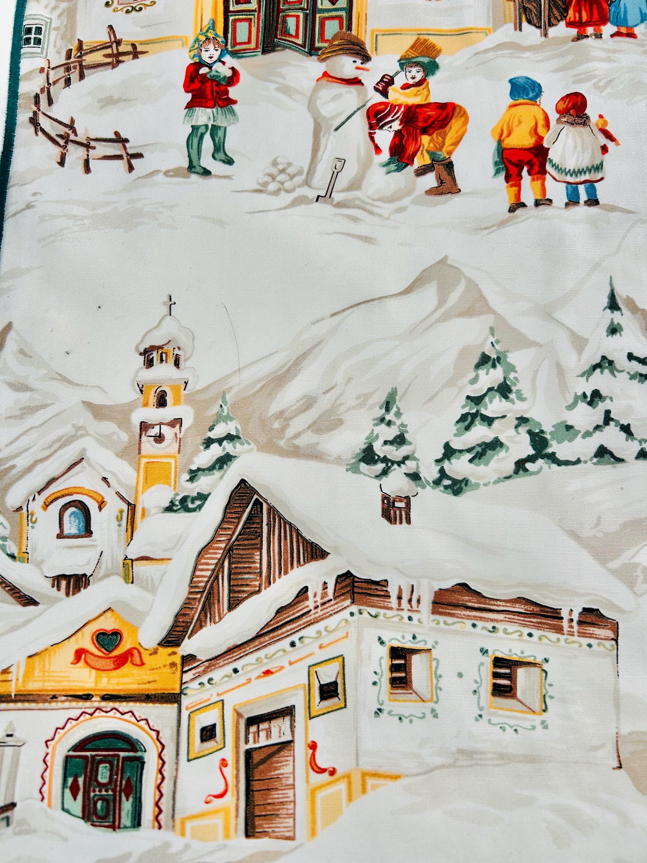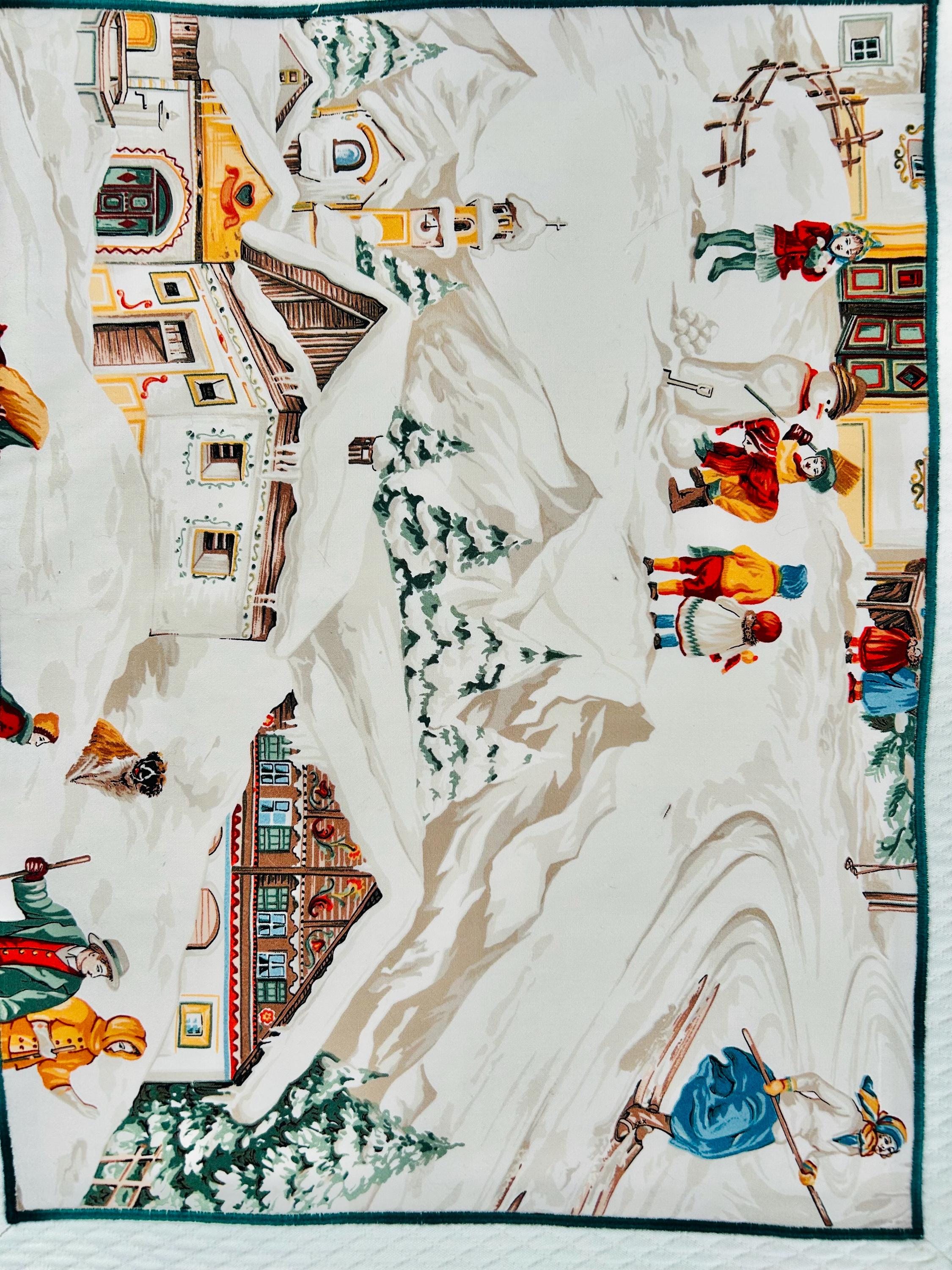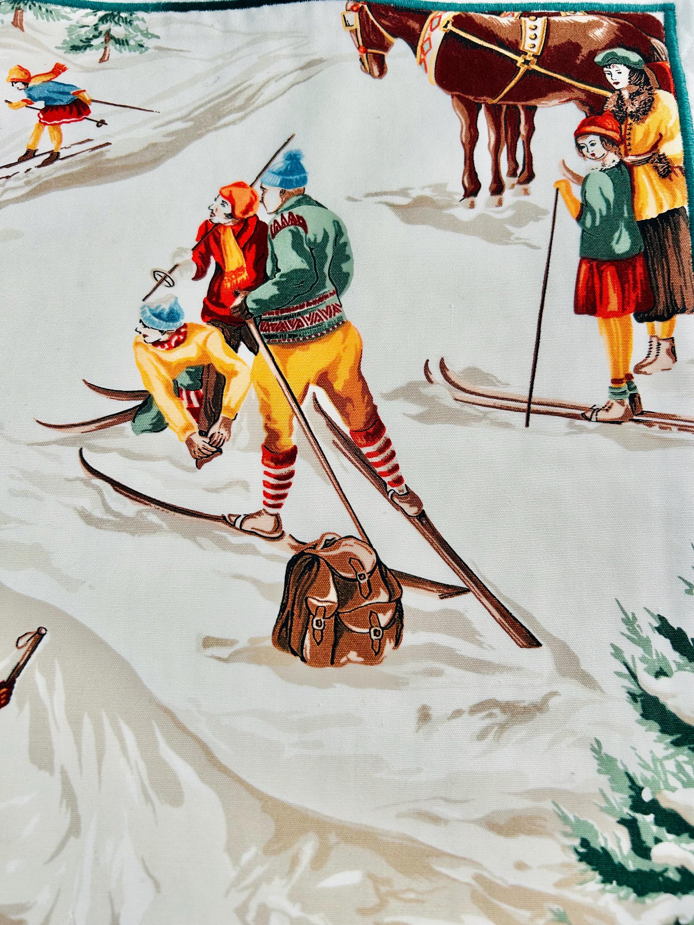 Exceptional unused set of four luxury placemats by Pierre Frey Paris (circa 1980s-1990s) featuring a charming Alpine winter scene with skiers, village architecture, horses, and snowy mountain landscapes. These placemats incorporate the iconic Les Trois Vallées fabric, which is inspired by 1960s winter sports magazines.