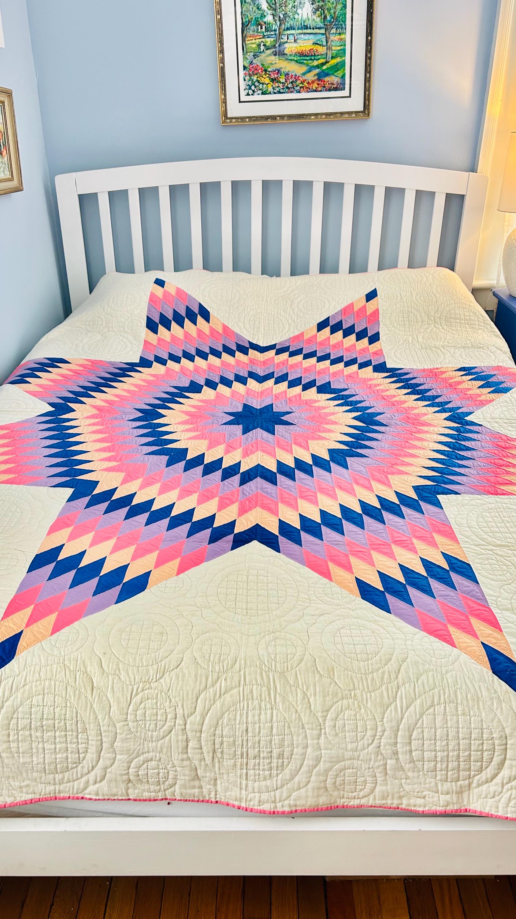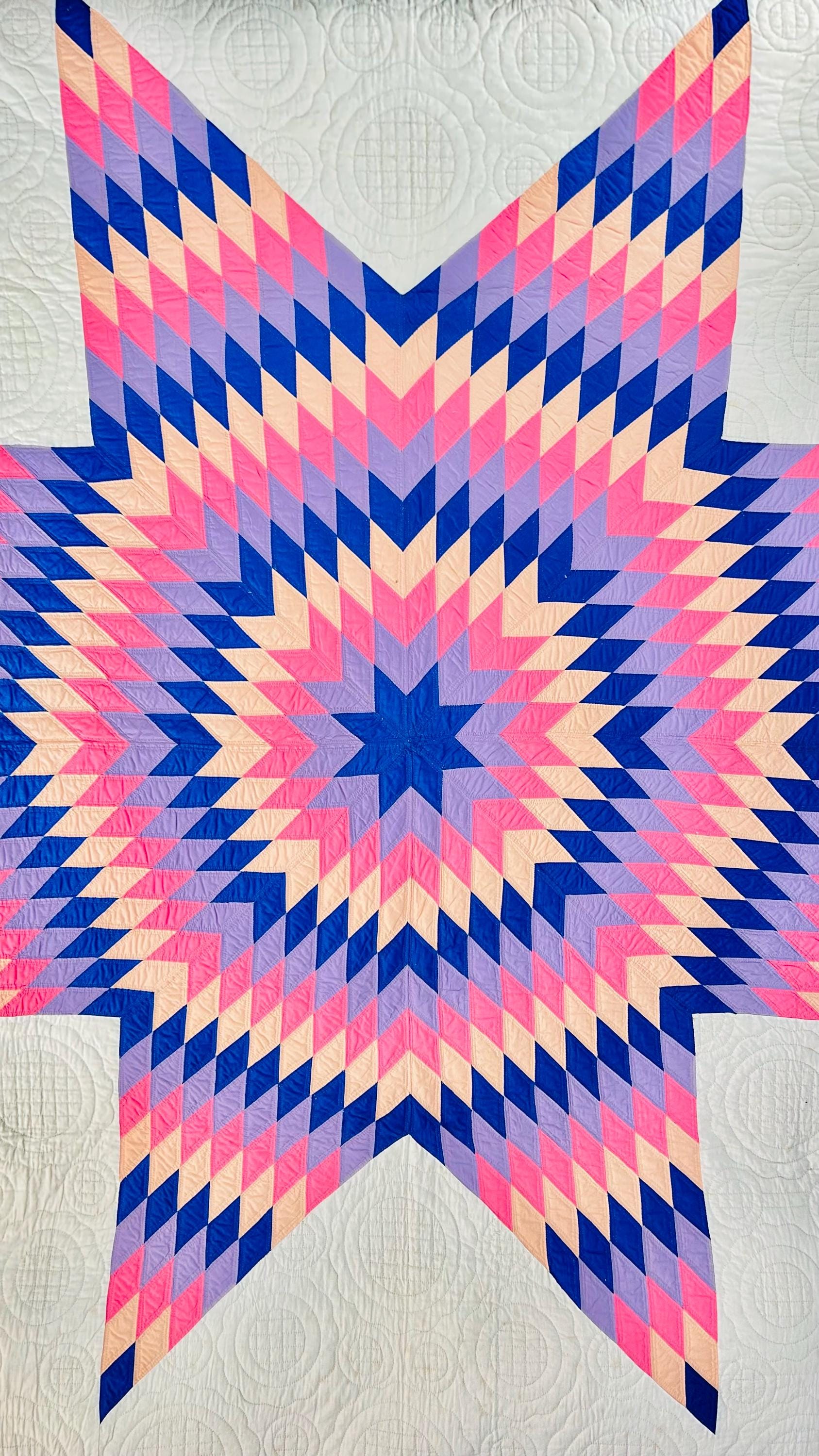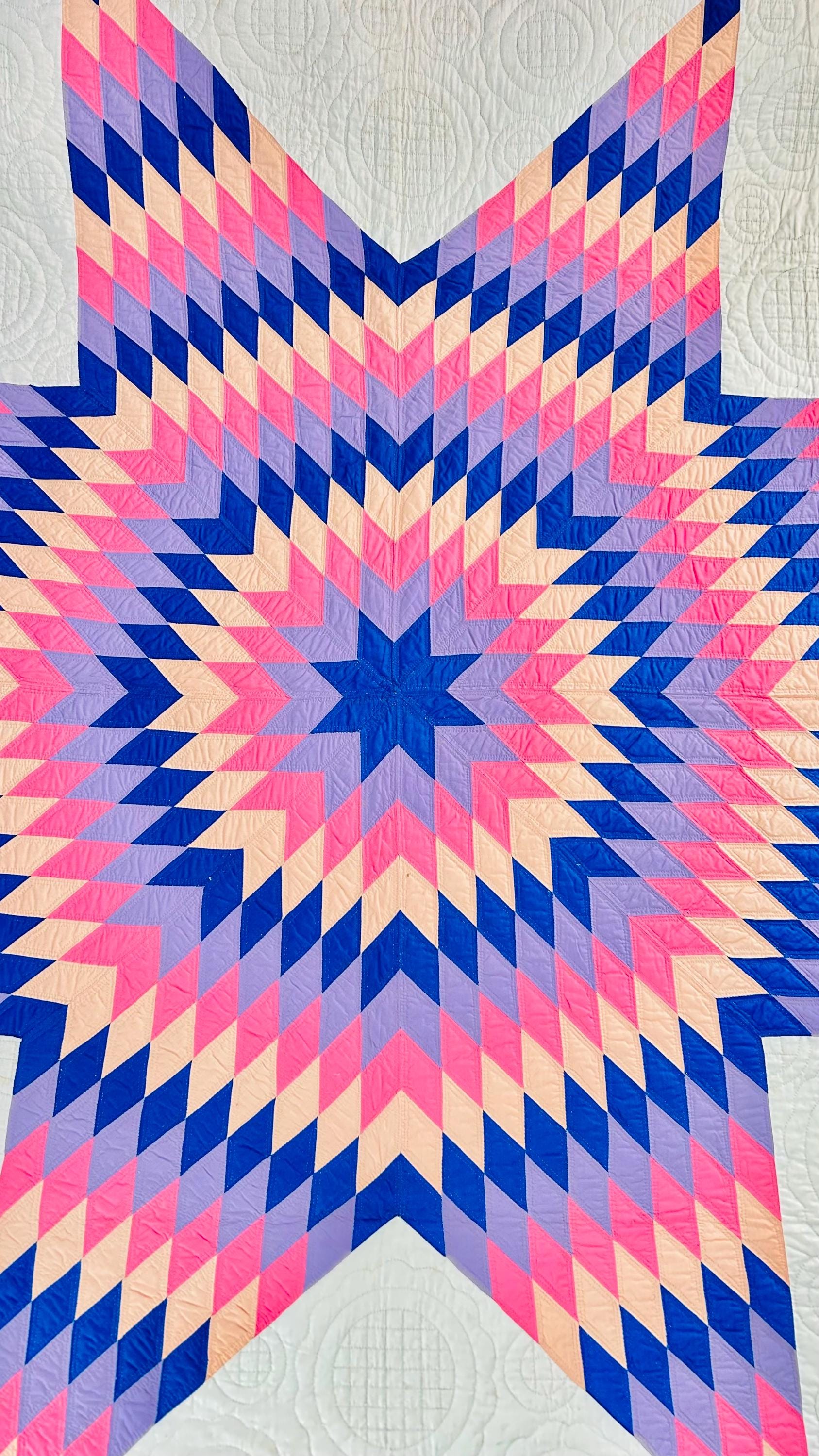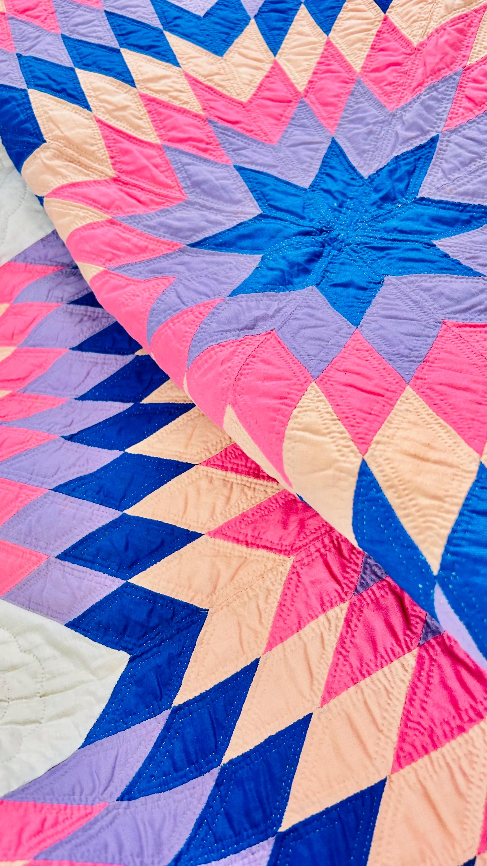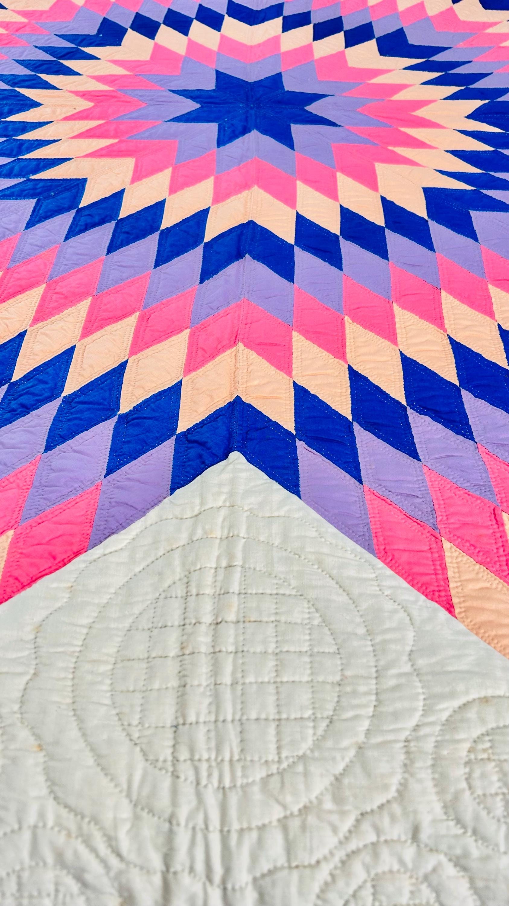 This striking antique Lone Star quilt dates to the 1930s–1940s and features a bold, oversized eight-point star radiating across a creamy white ground. Hand-pieced from classic Depression-era cottons in vivid pink, lavender, peach, and deep blue, the quilt is entirely and beautifully hand quilted in concentric circles and cross-hatch grids, as well as in double outlines of the diamond piecework.