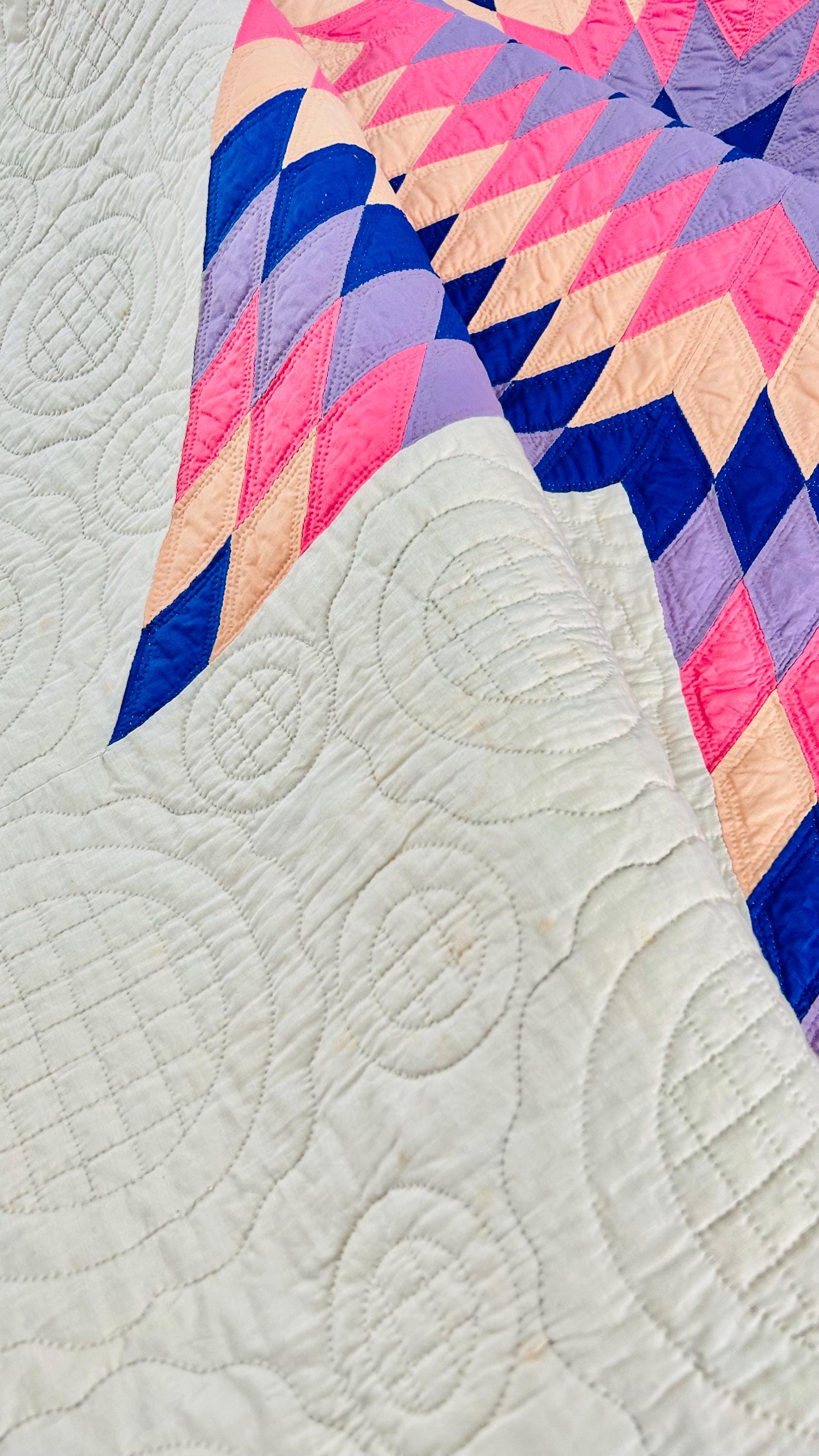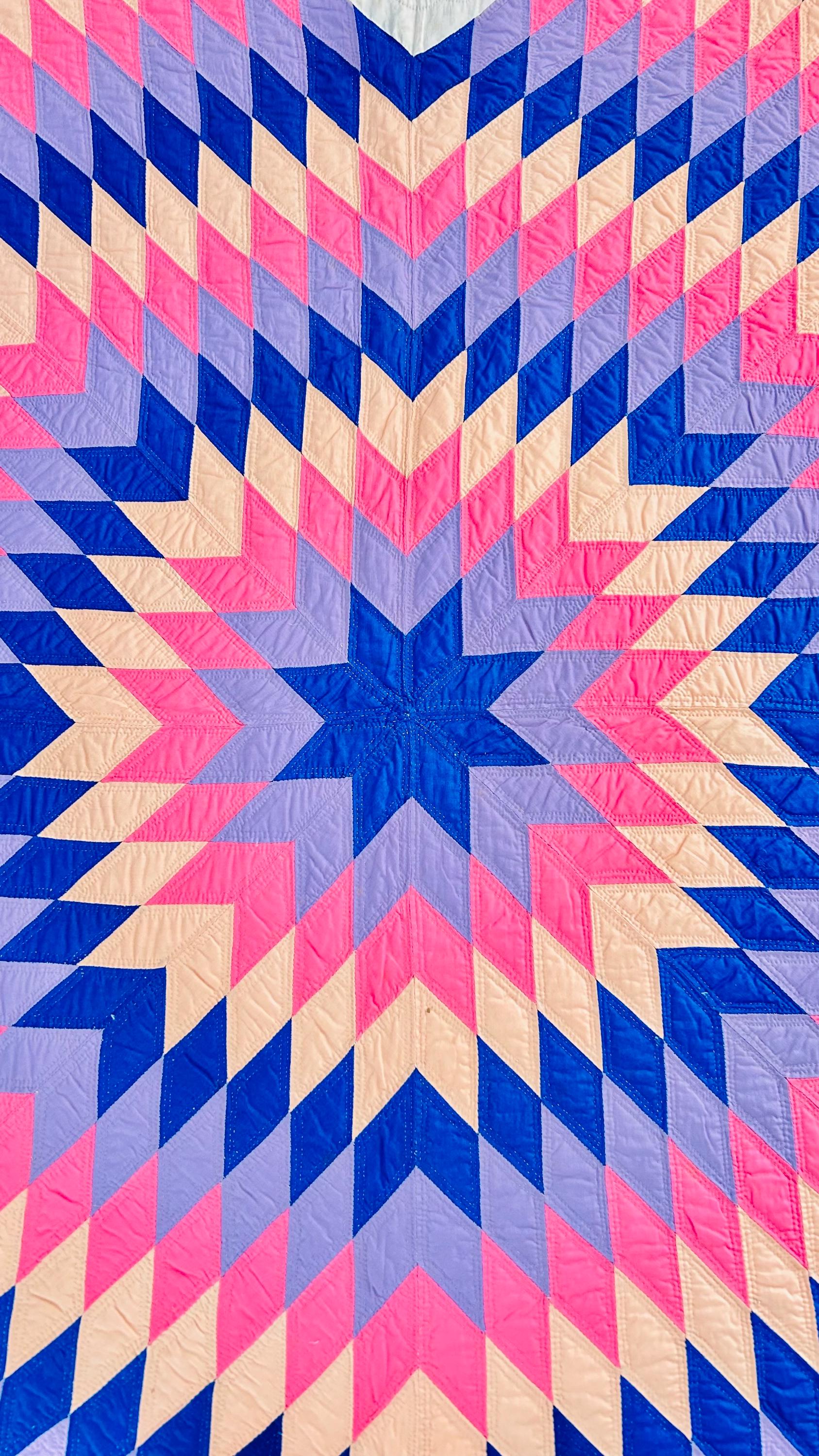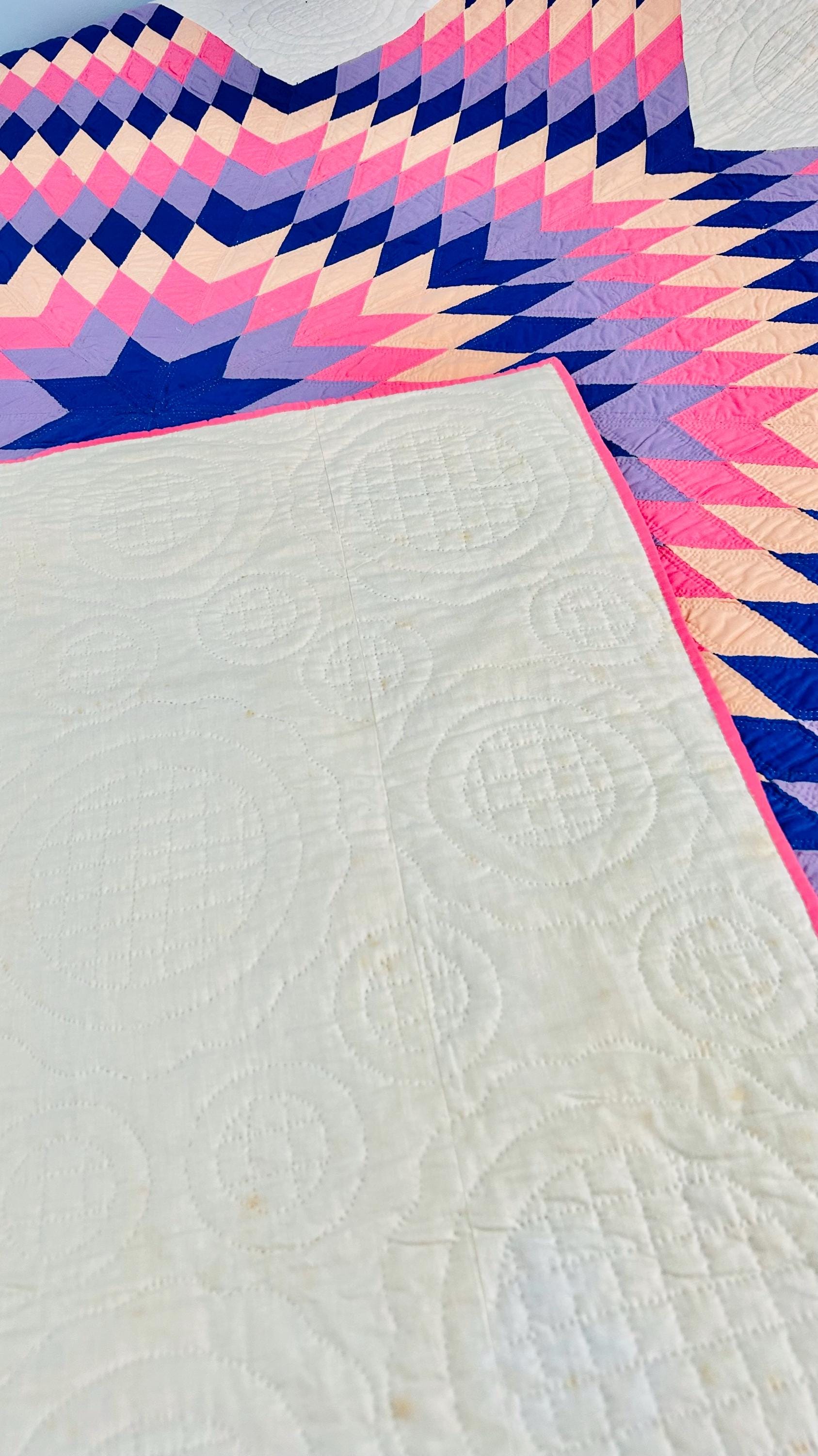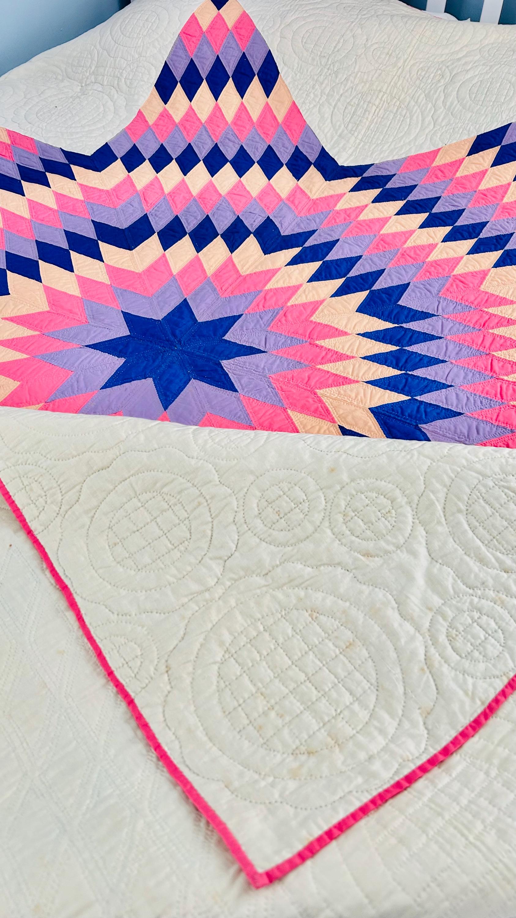 This striking antique Lone Star quilt dates to the 1930s–1940s and features a bold, oversized eight-point star radiating across a creamy white ground. Hand-pieced from classic Depression-era cottons in vivid pink, lavender, peach, and deep blue, the quilt is entirely and beautifully hand quilted in concentric circles and cross-hatch grids, as well as in double outlines of the diamond piecework.