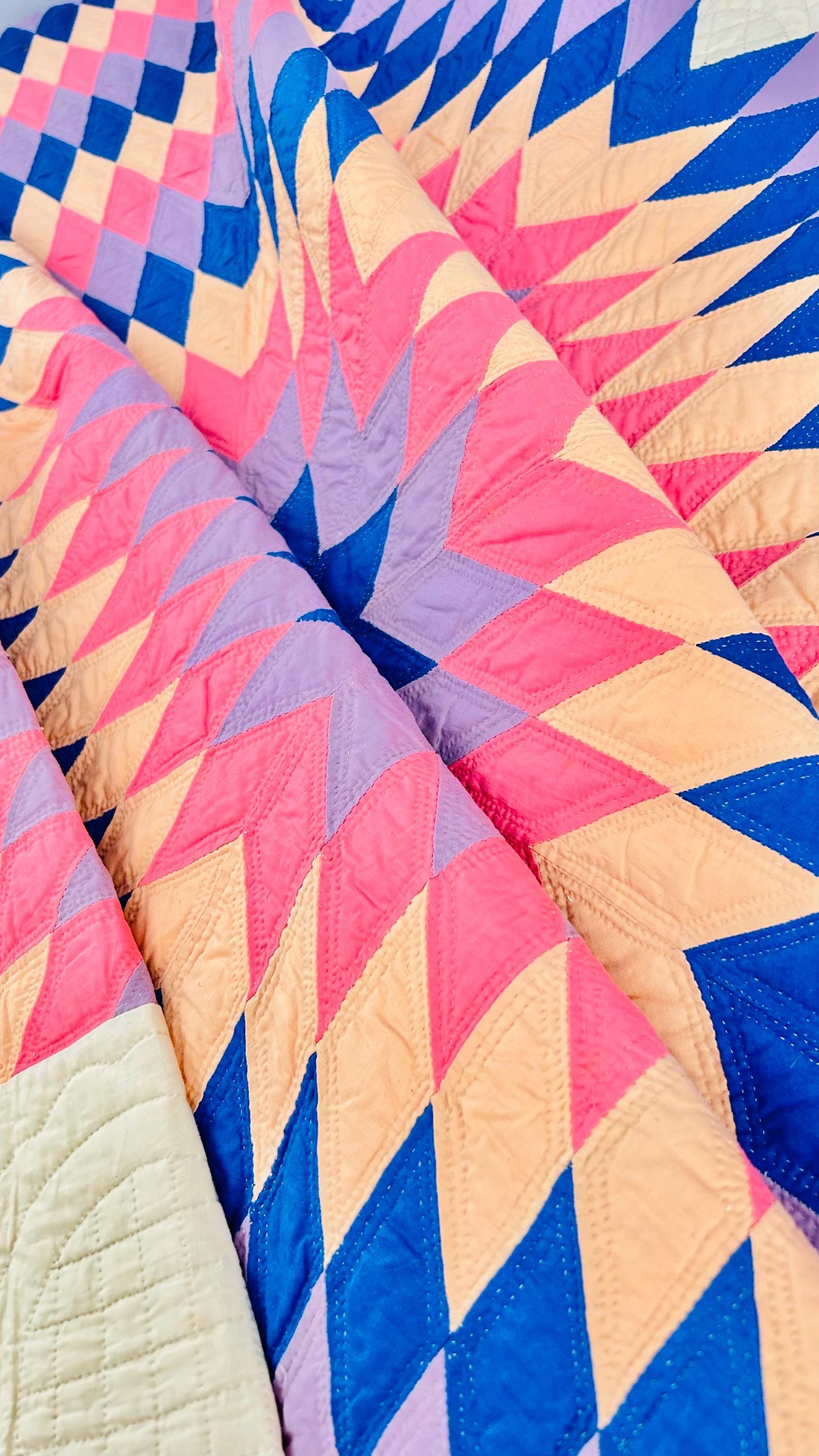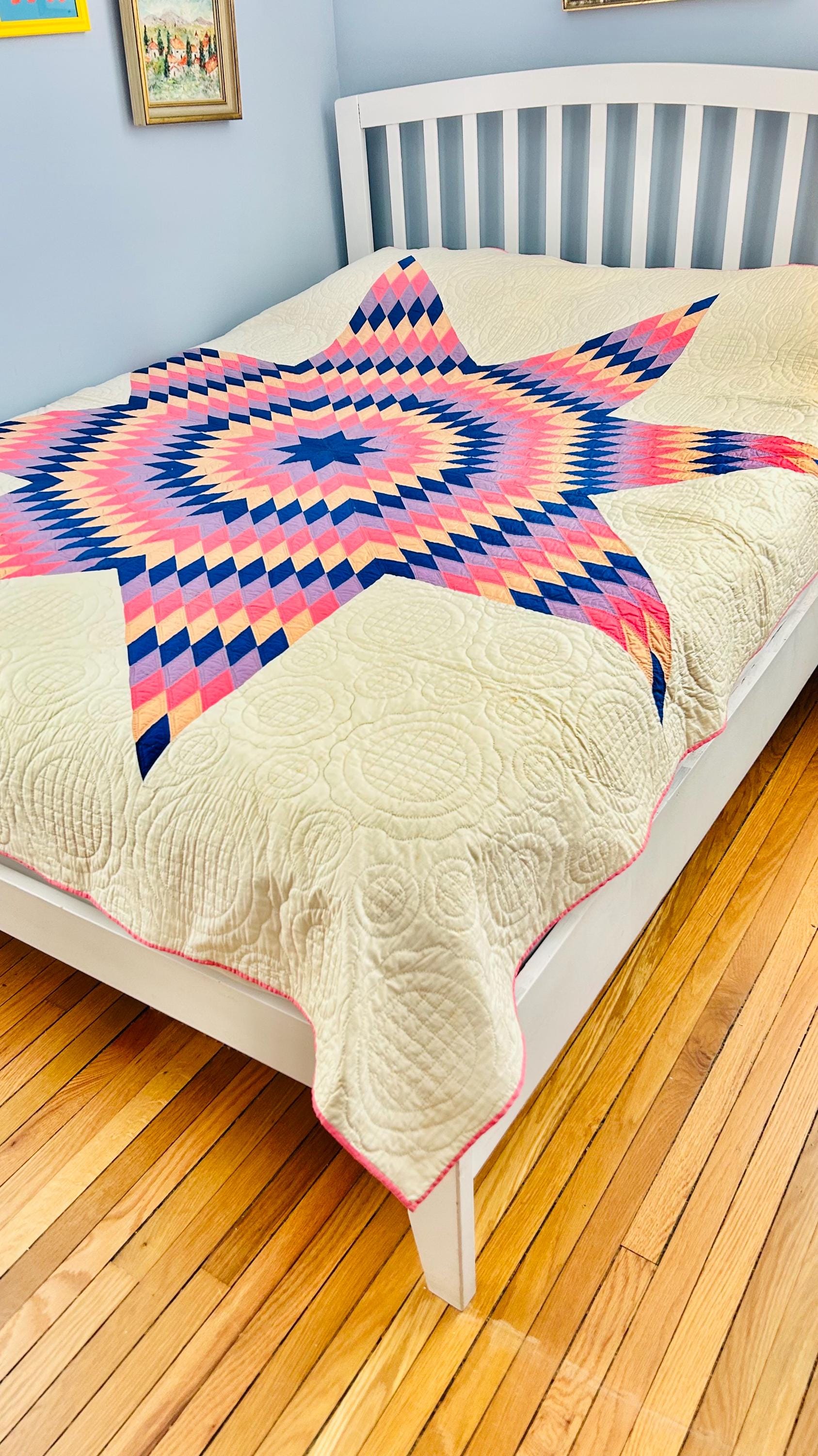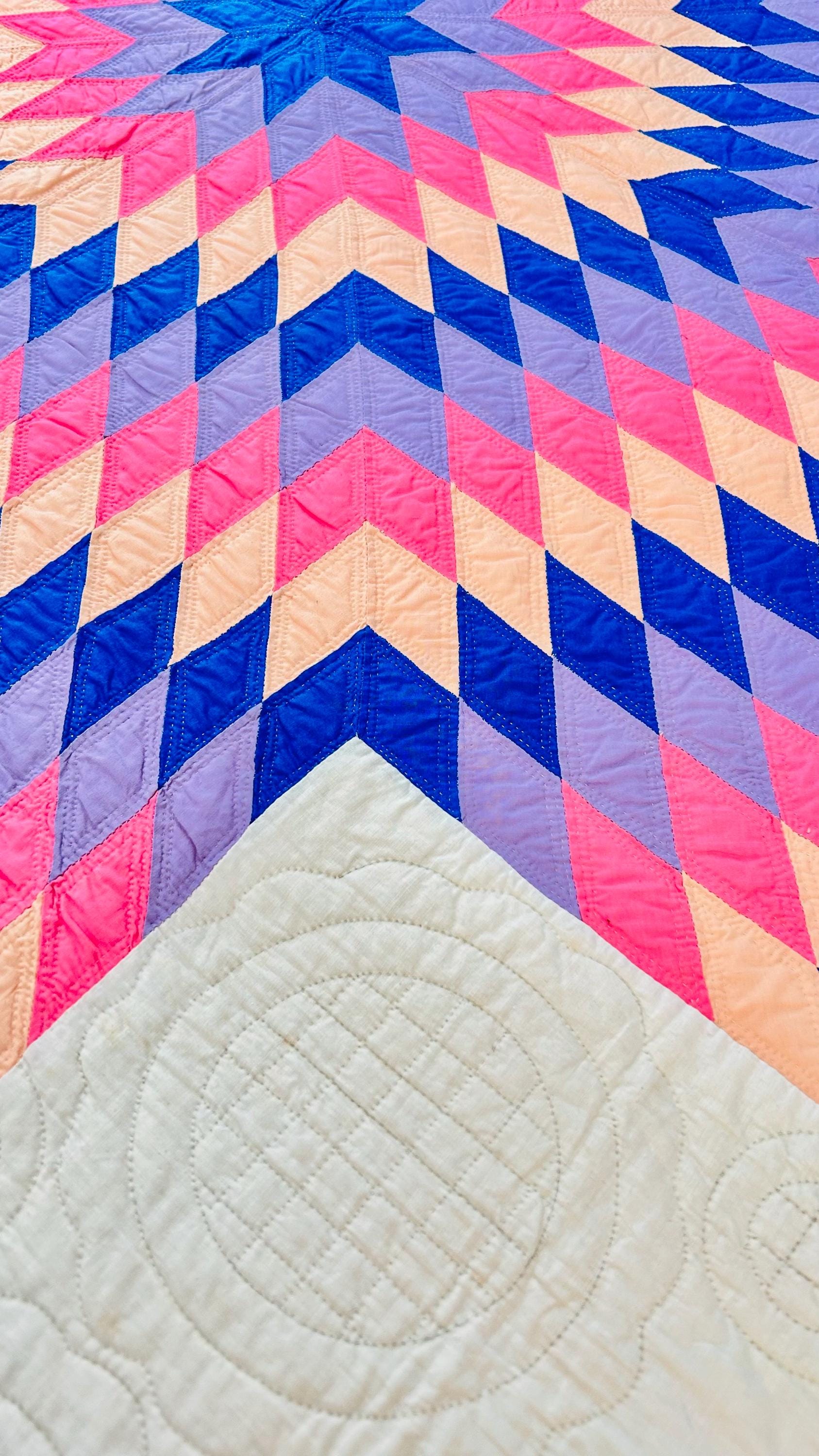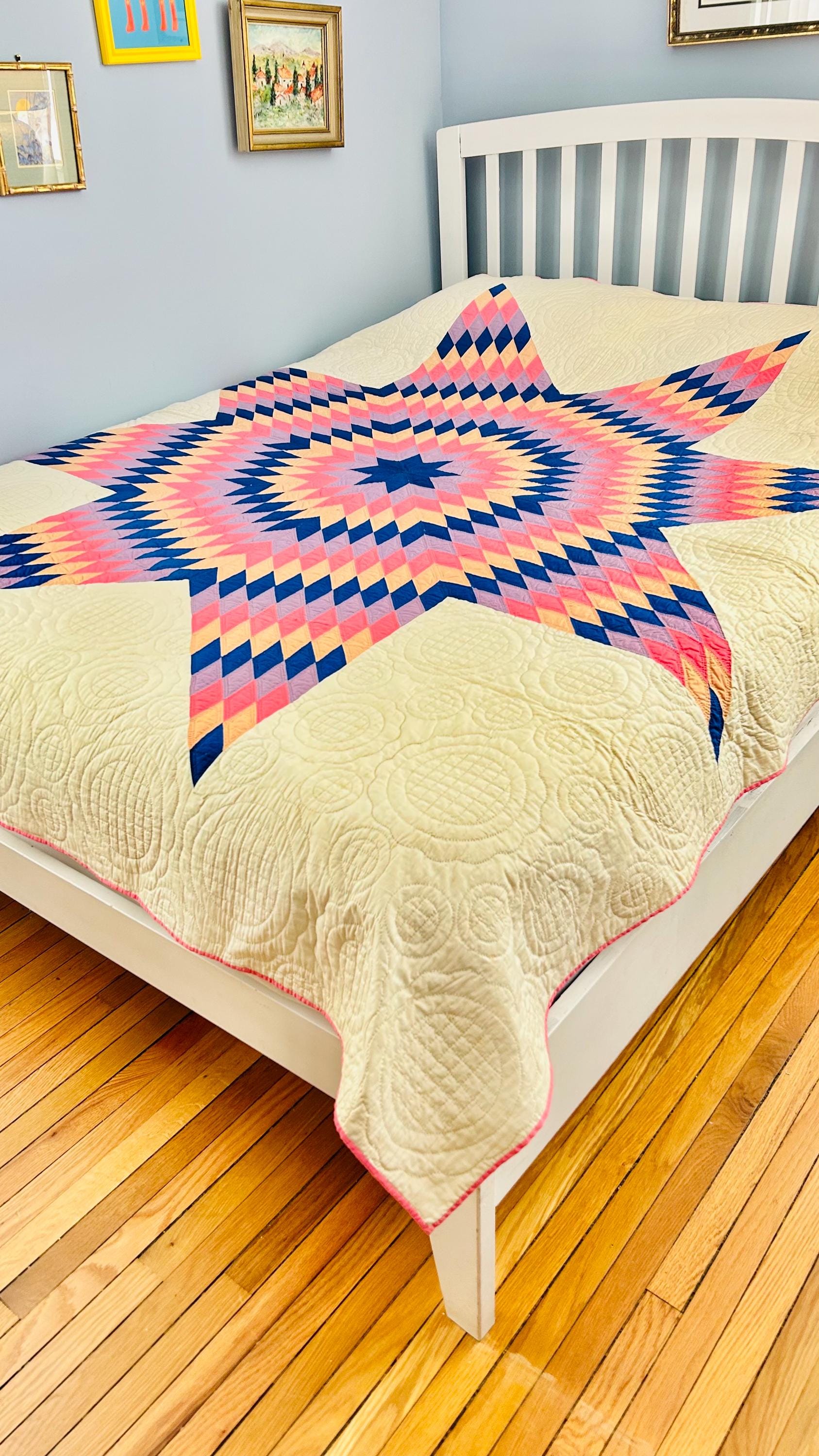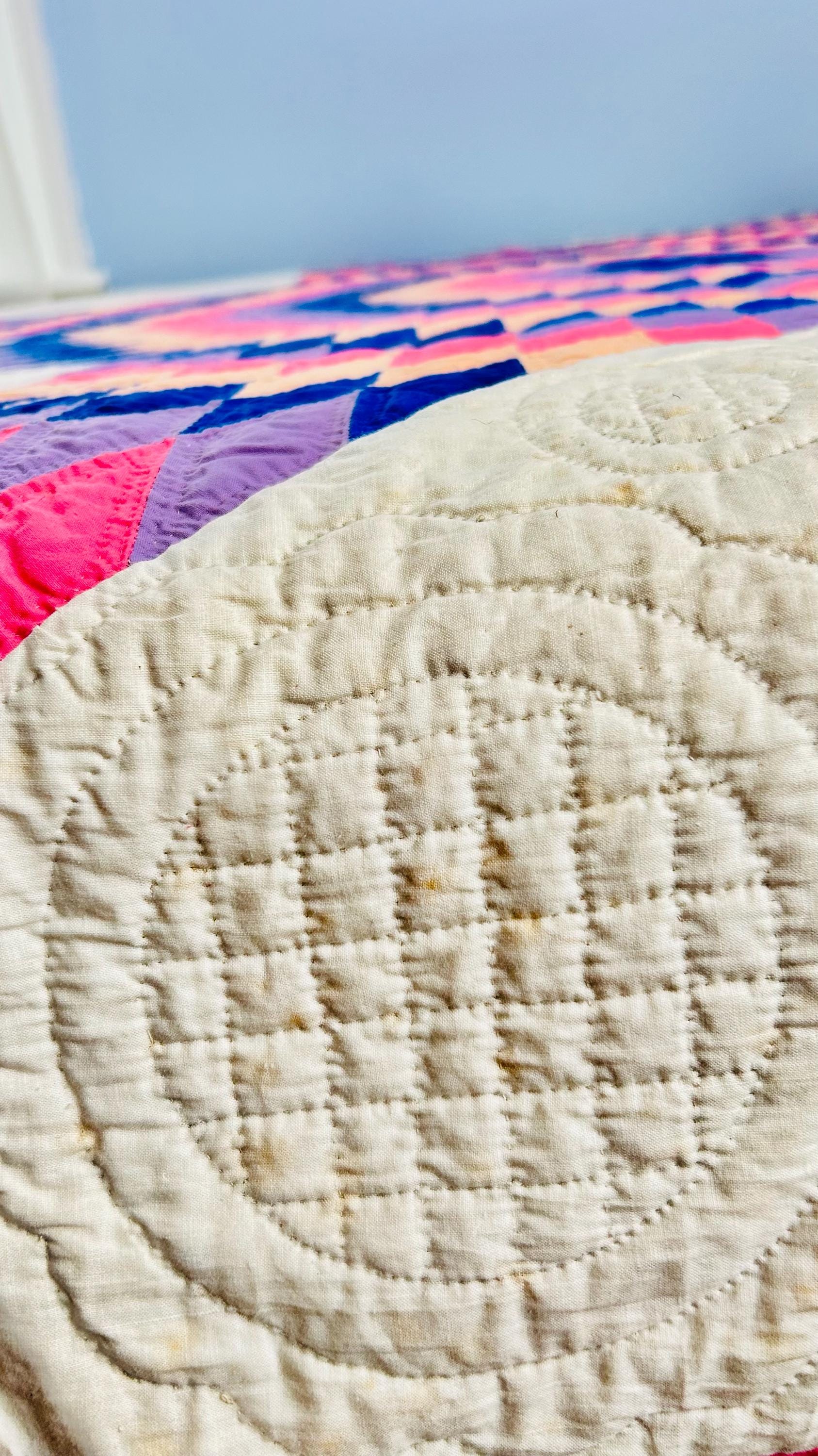 This striking antique Lone Star quilt dates to the 1930s–1940s and features a bold, oversized eight-point star radiating across a creamy white ground. Hand-pieced from classic Depression-era cottons in vivid pink, lavender, peach, and deep blue, the quilt is entirely and beautifully hand quilted in concentric circles and cross-hatch grids, as well as in double outlines of the diamond piecework.