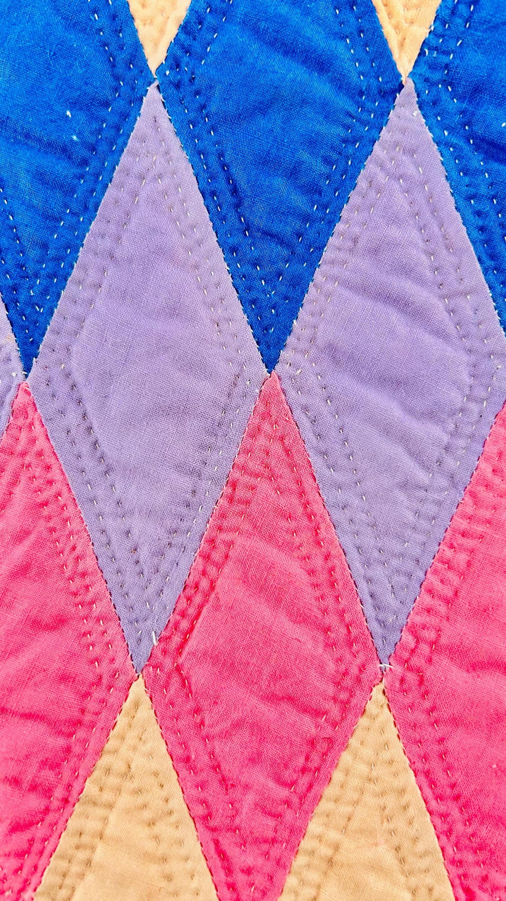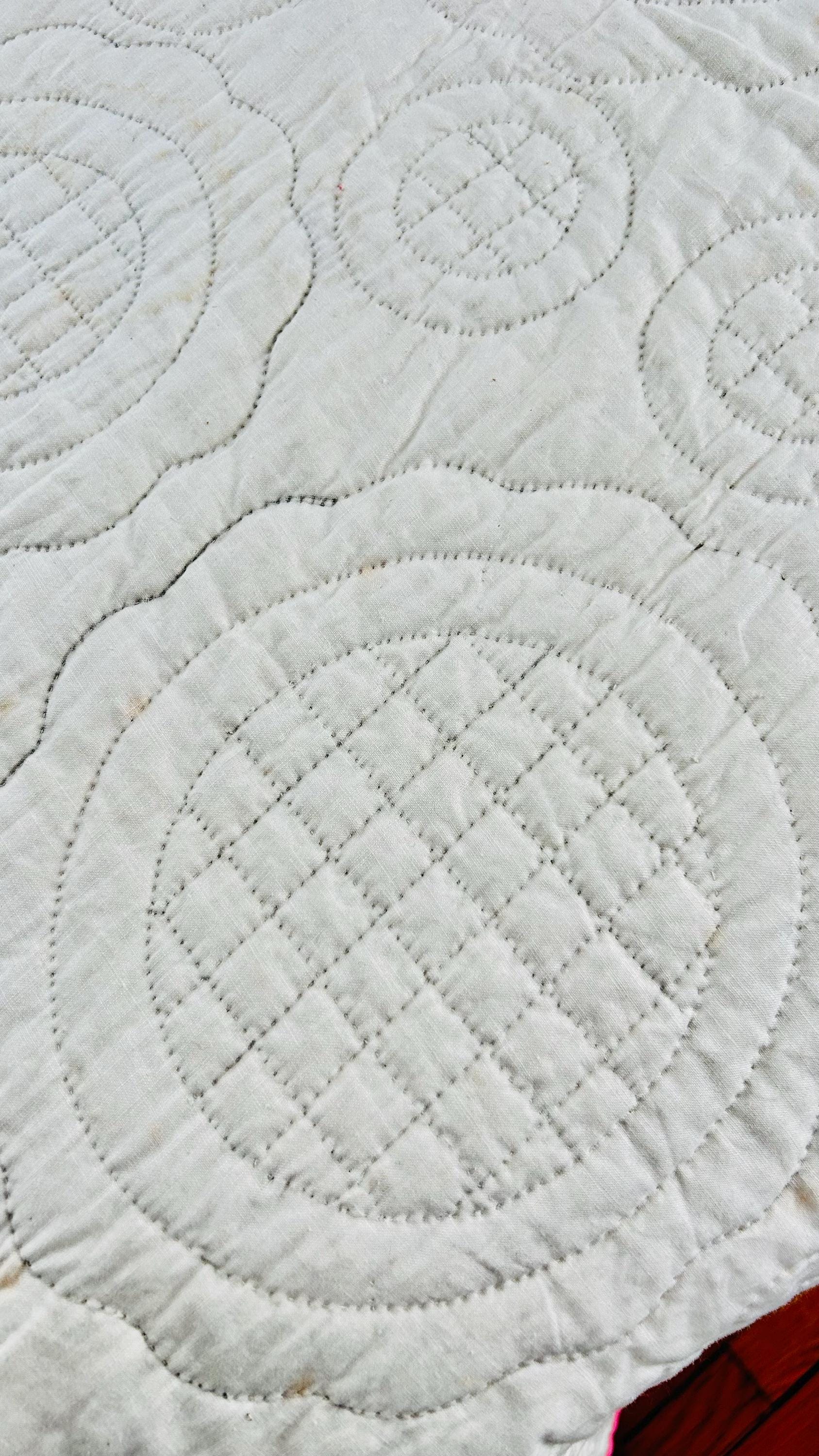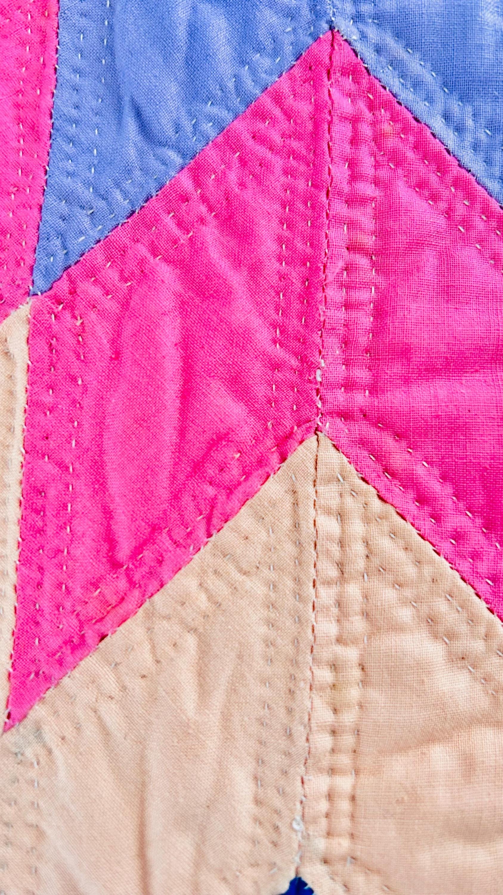 The back is white cotton while the binding is bright pink cotton that has been hand-stitched to both sides. The cotton batting is lightweight.
