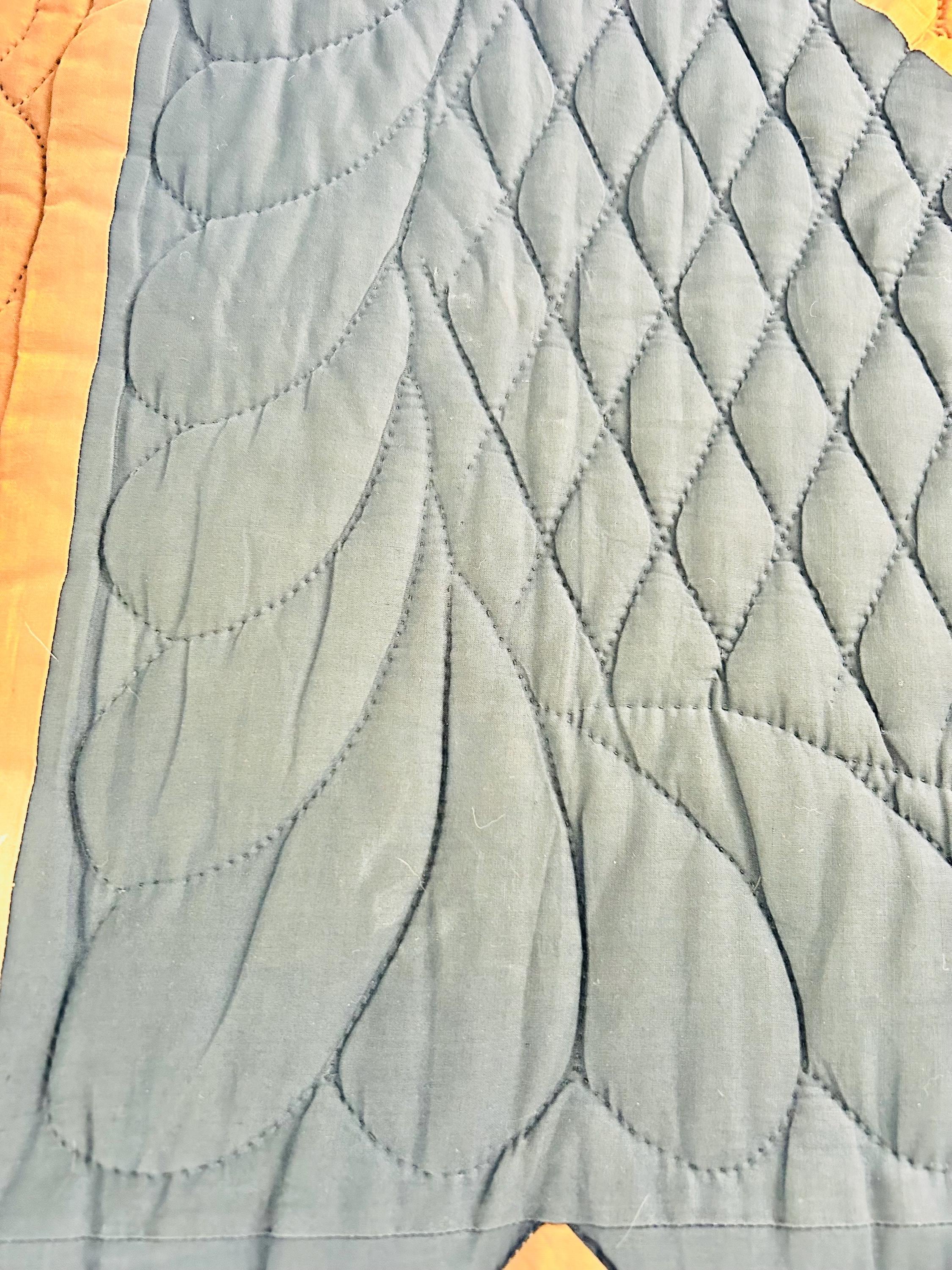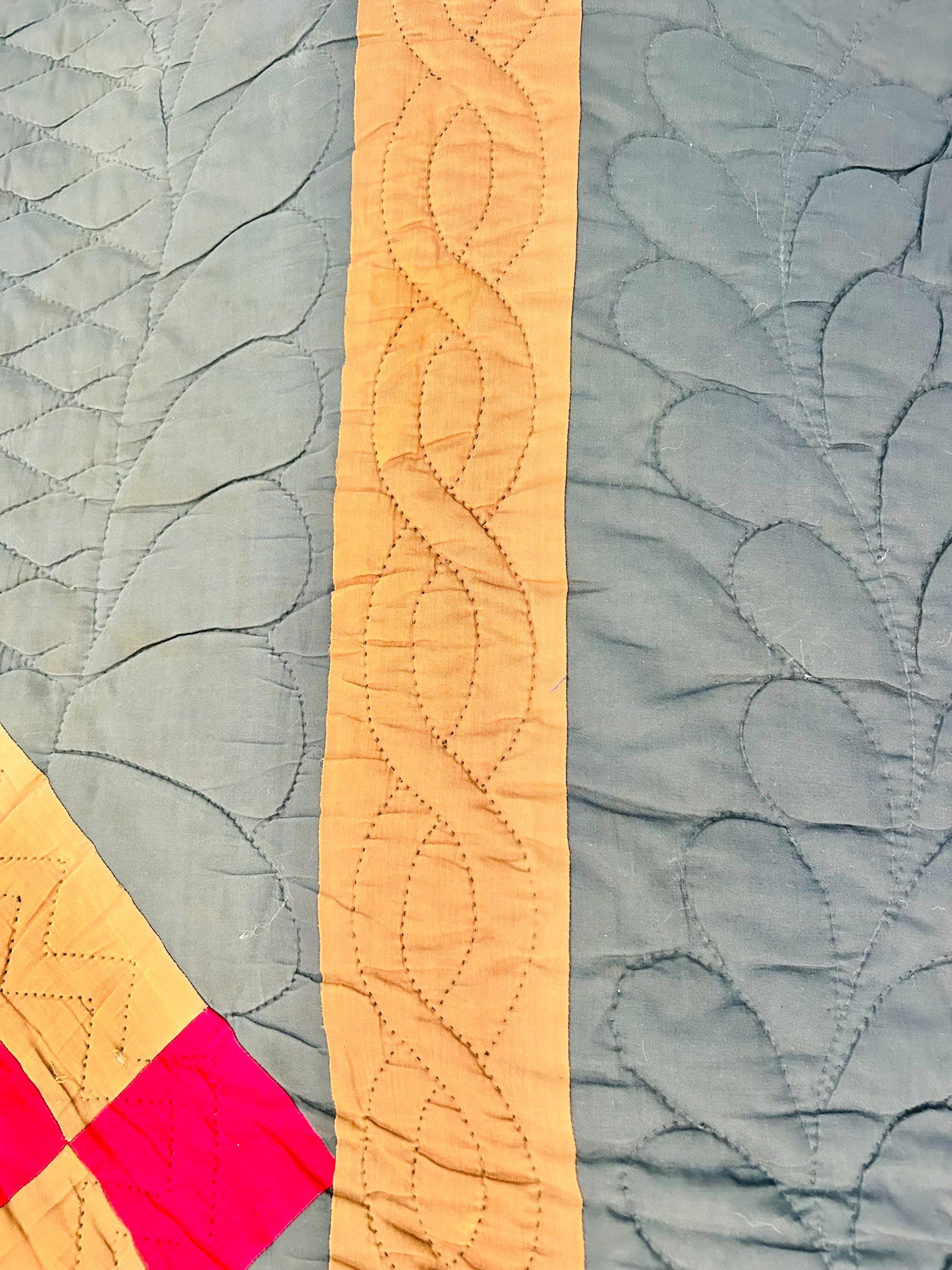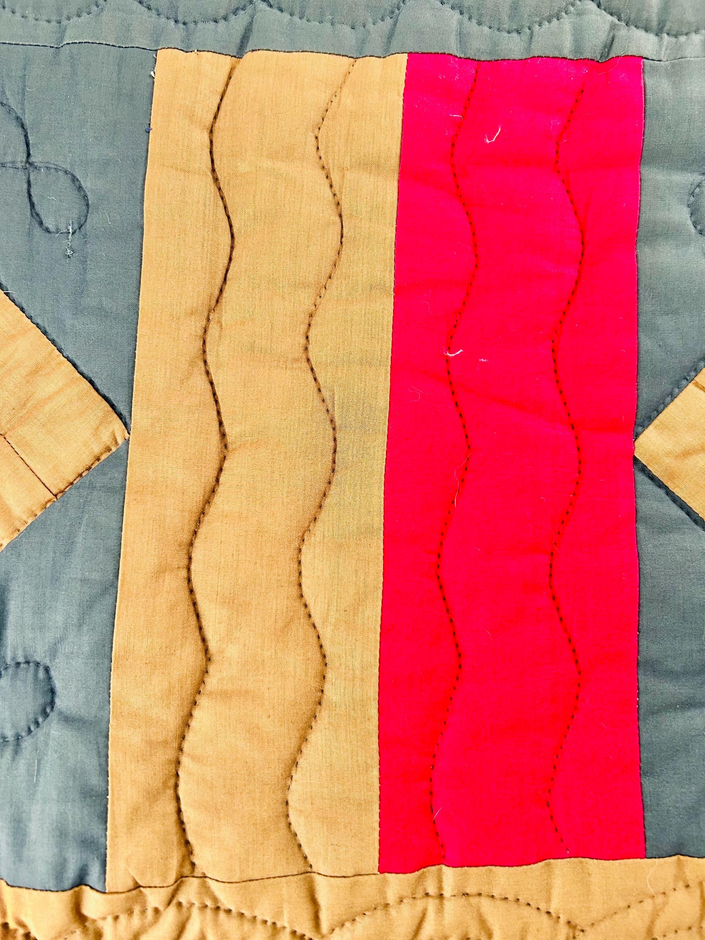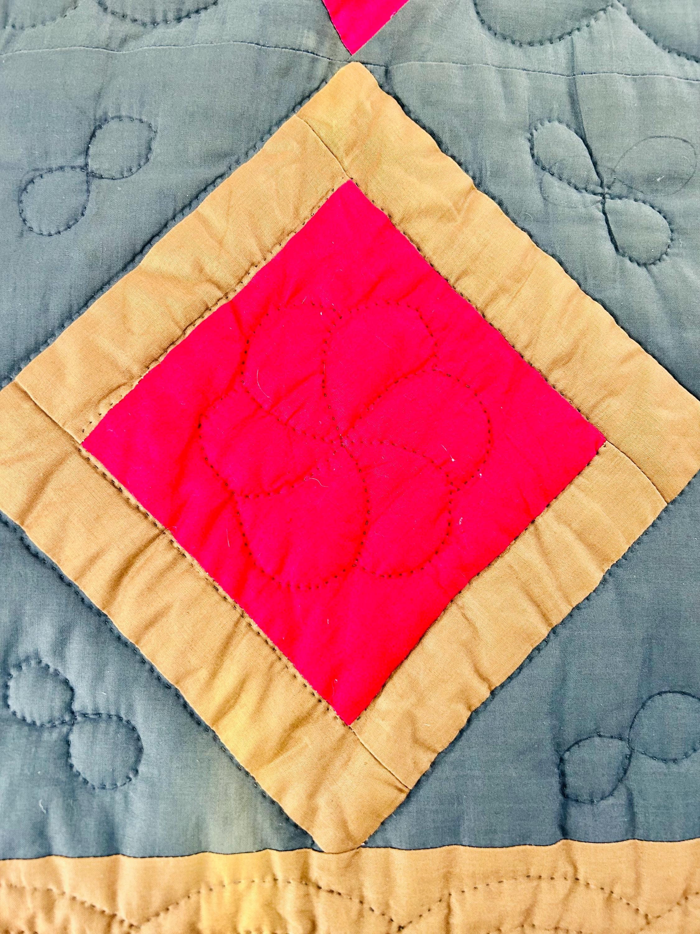 It is entirely hand-stitched. The hand-quilting is extensive and in beautiful, elaborate feathering and twisted rope motifs along the four-sided border and around the center diamond, as well as chevrons and cross-hatch grids, all in black thread. The hand-quilted center medallion is elaborate, radiating from the center circle/cross-hatch grid in a repeating geometric/floral design. The mustard/tan sashing around the center diamond is quilted in a zig-zag pattern.