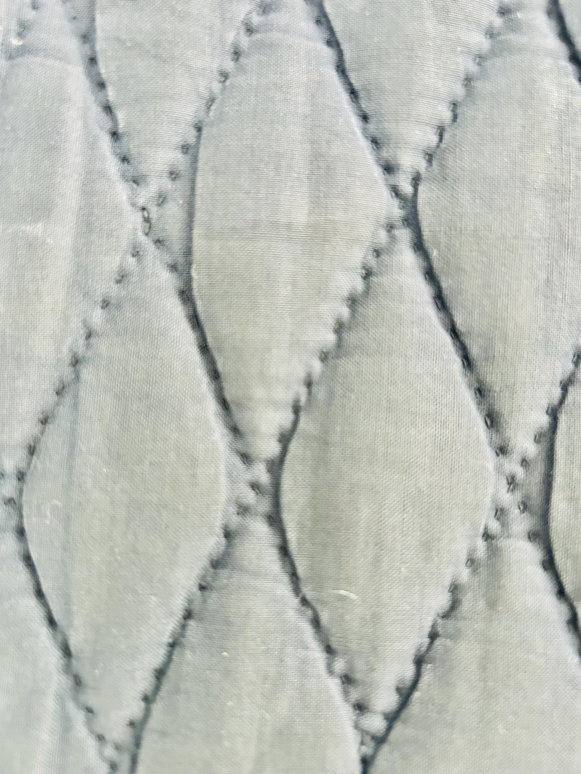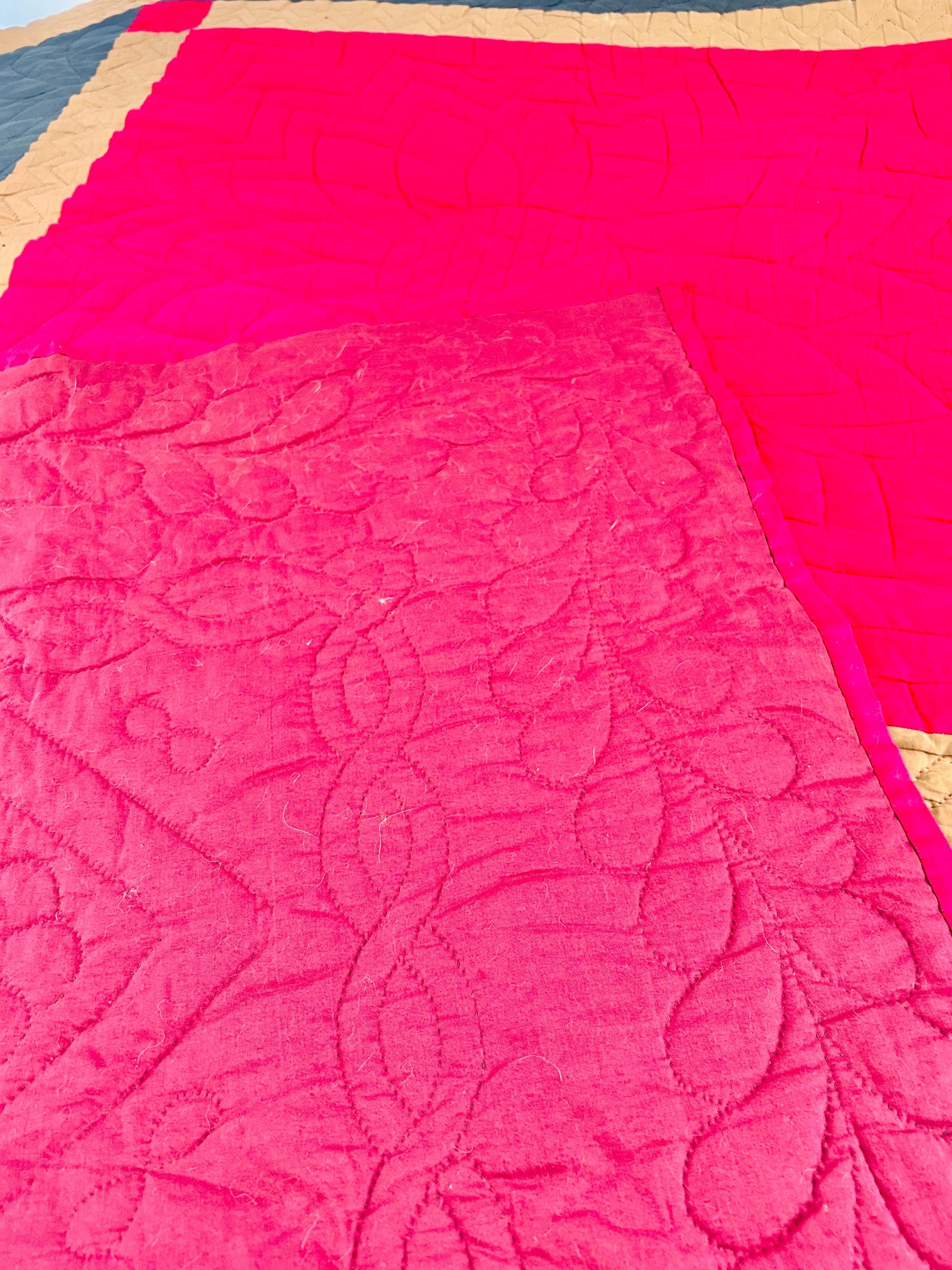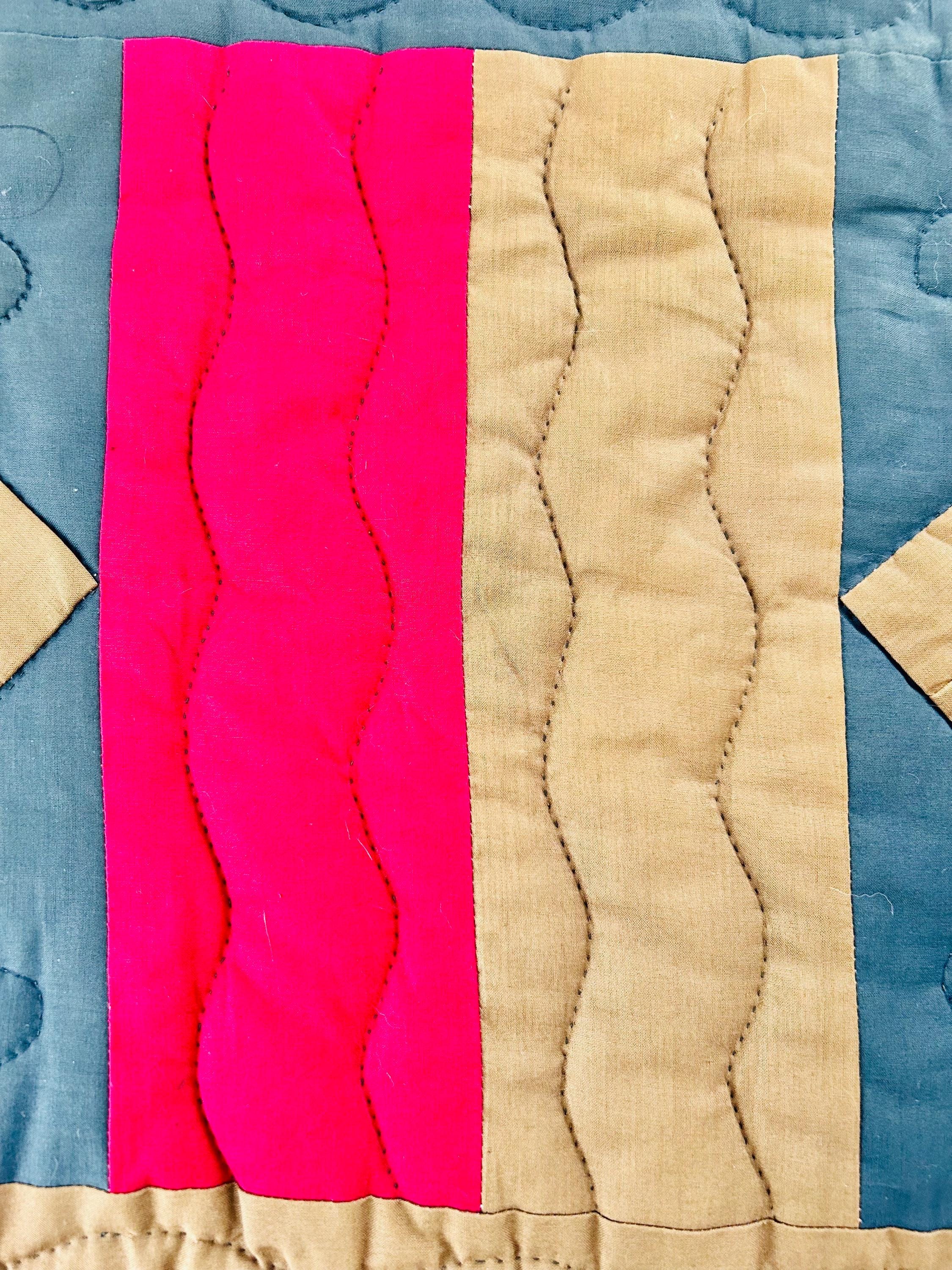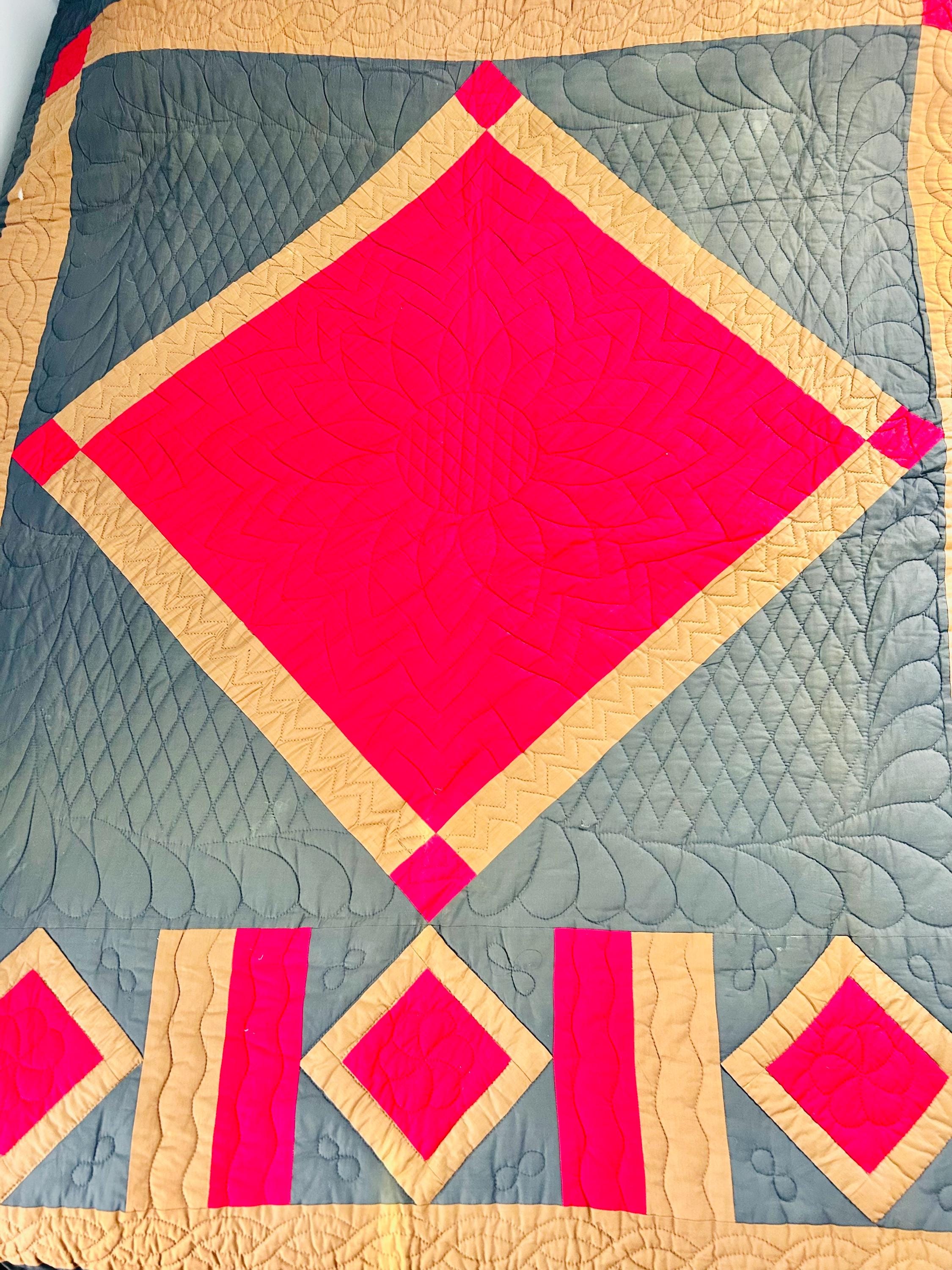 It is entirely hand-stitched. The hand-quilting is extensive and in beautiful, elaborate feathering and twisted rope motifs along the four-sided border and around the center diamond, as well as chevrons and cross-hatch grids, all in black thread. The hand-quilted center medallion is elaborate, radiating from the center circle/cross-hatch grid in a repeating geometric/floral design. The mustard/tan sashing around the center diamond is quilted in a zig-zag pattern.