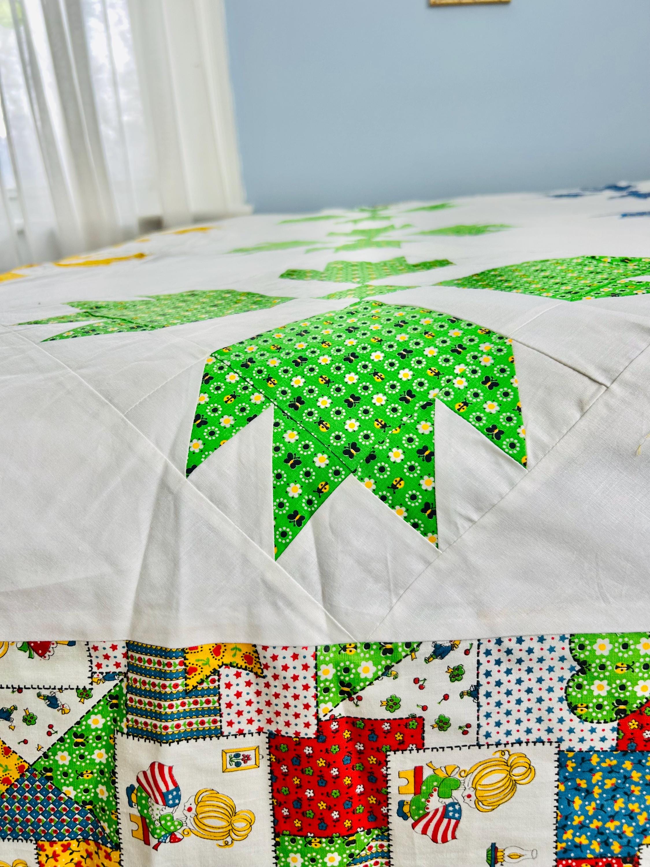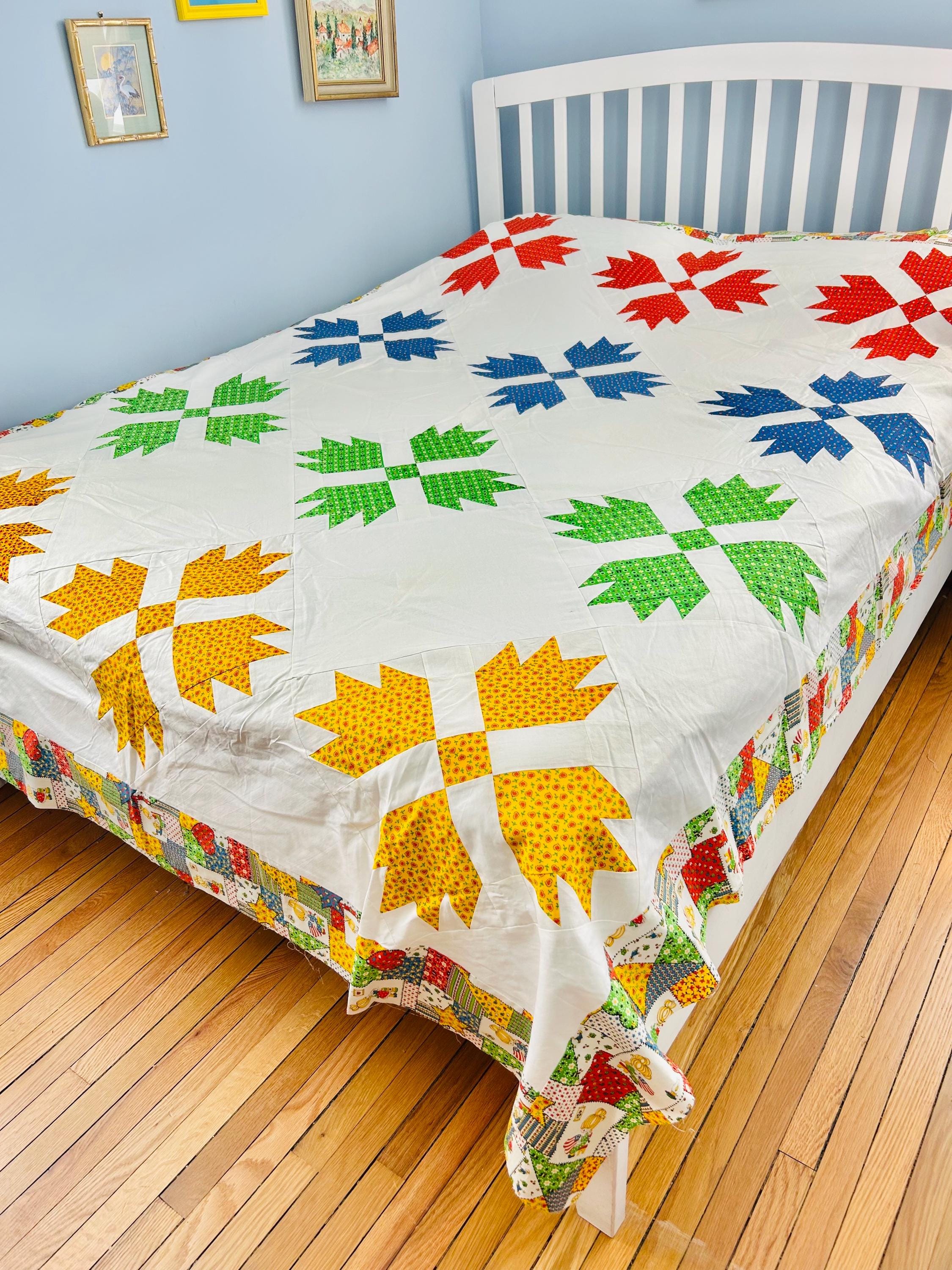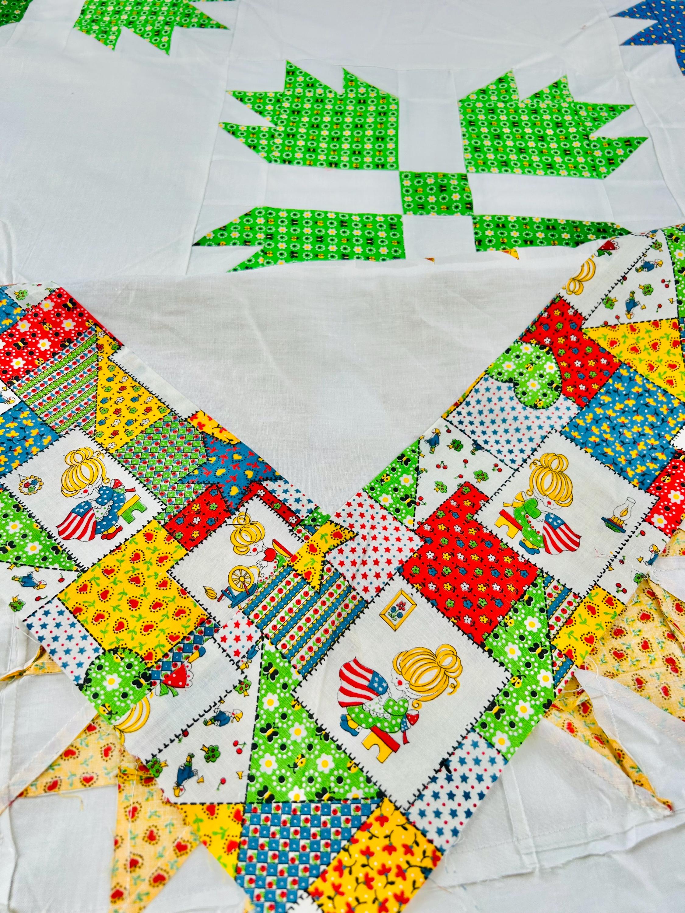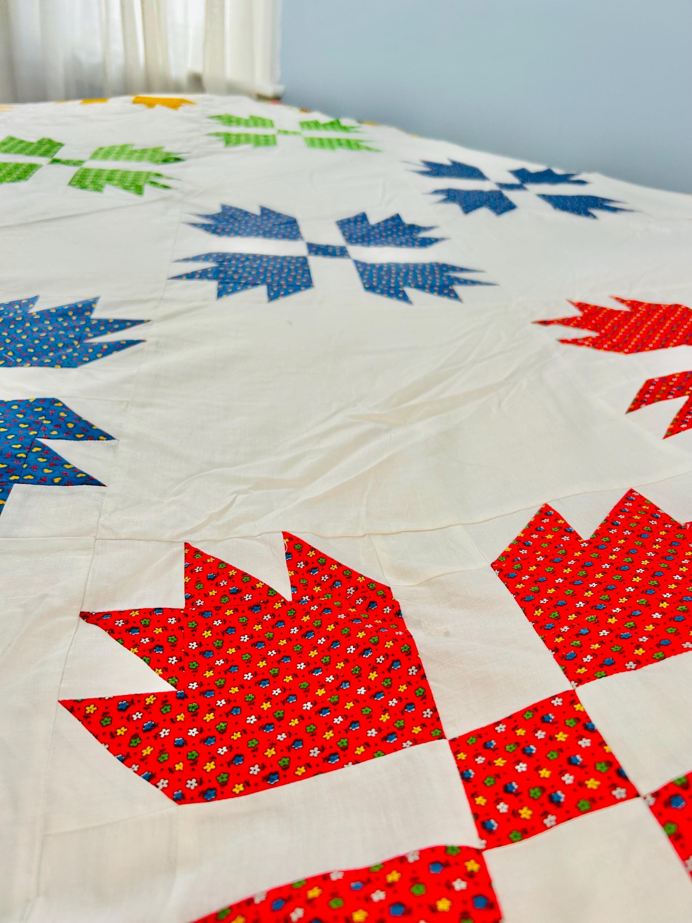 This bright, cheerful vintage Autumn Leaf quilt top was made in the 1980s to 1990s and features bold, stylized leaf blocks arranged on point across a crisp white background. The colorful leaves—worked in red, blue, green, and golden yellow novelty prints—give this quilt top a lively, seasonal feel that works beautifully for fall décor or year-round display.