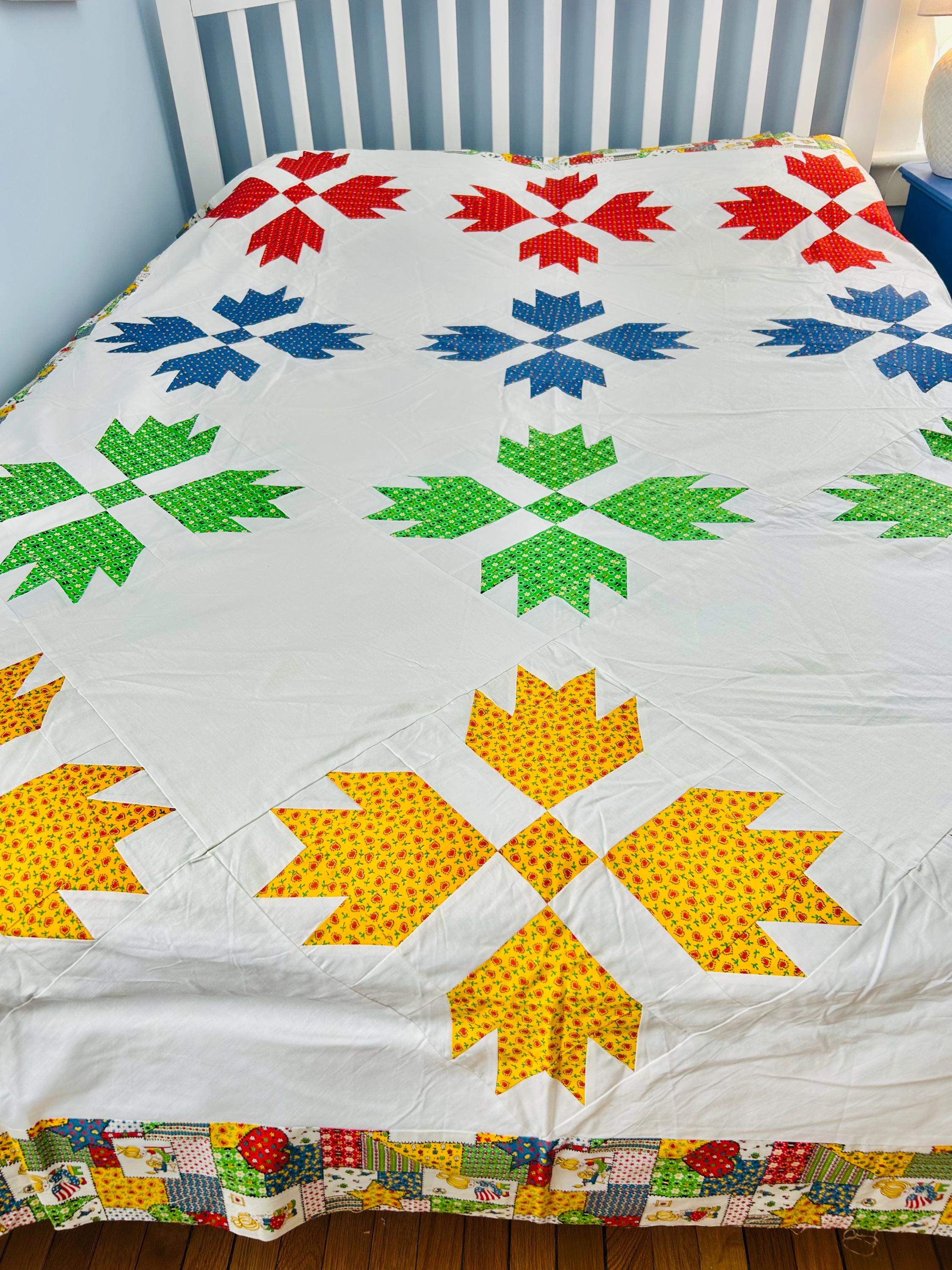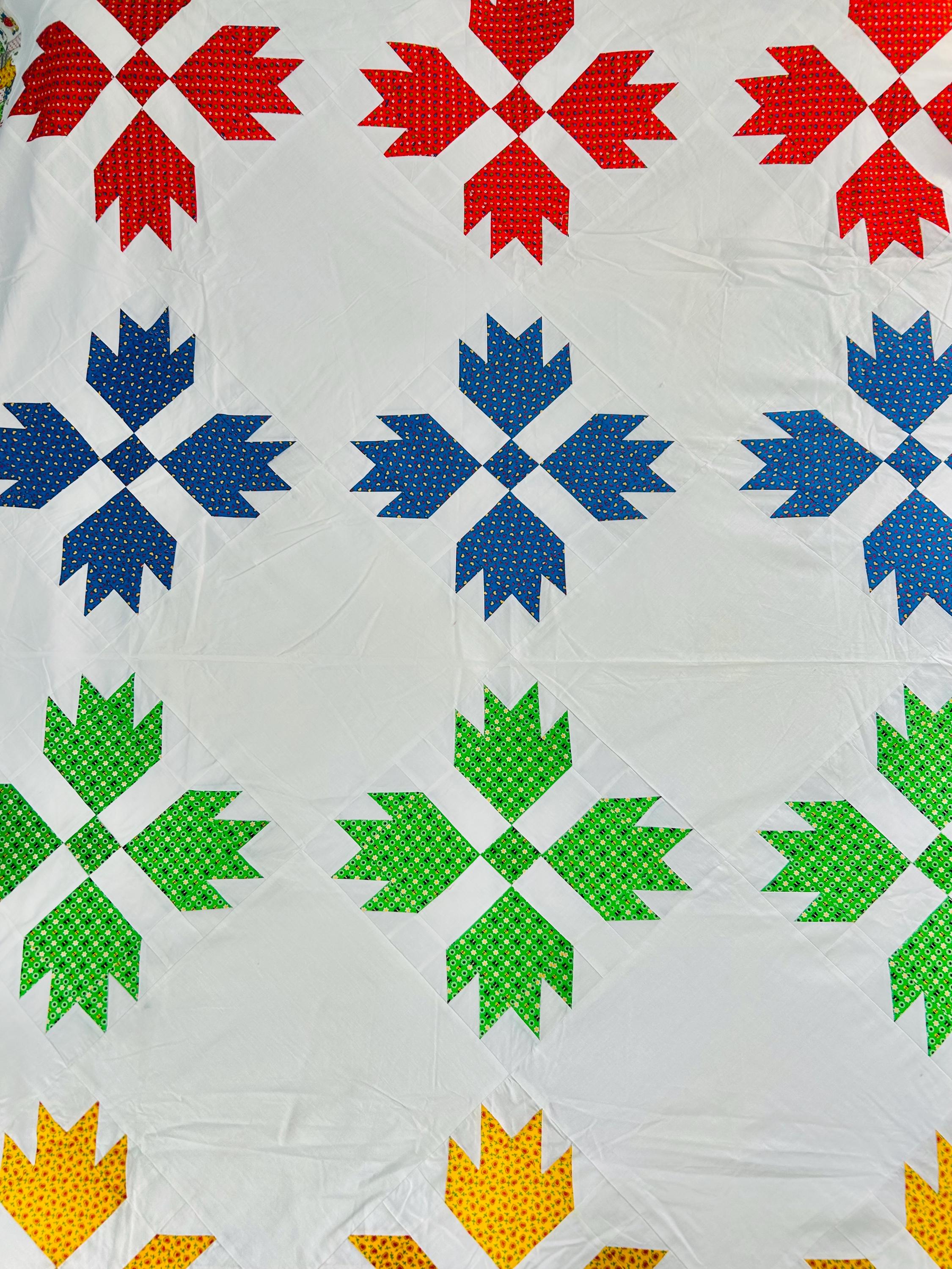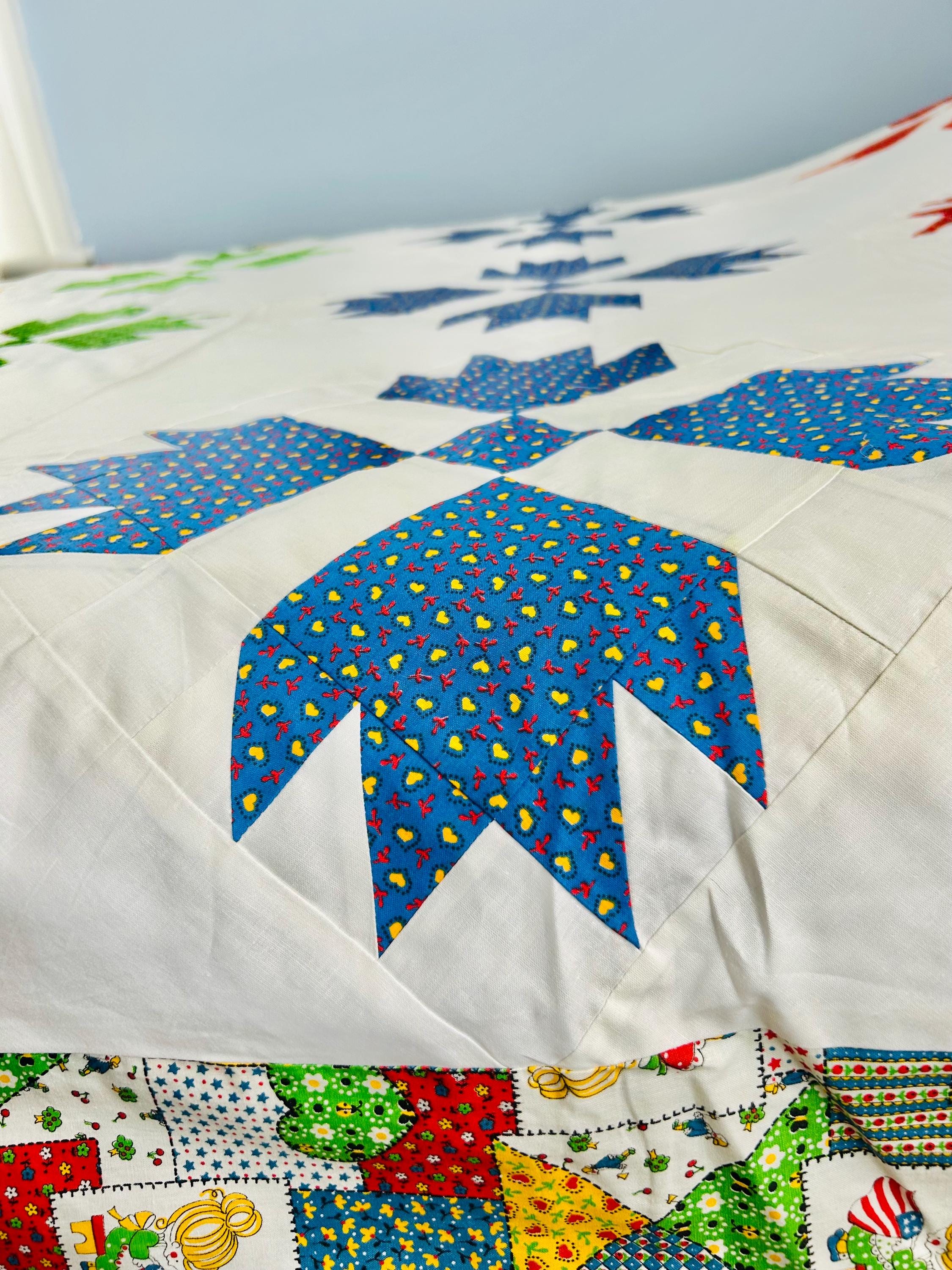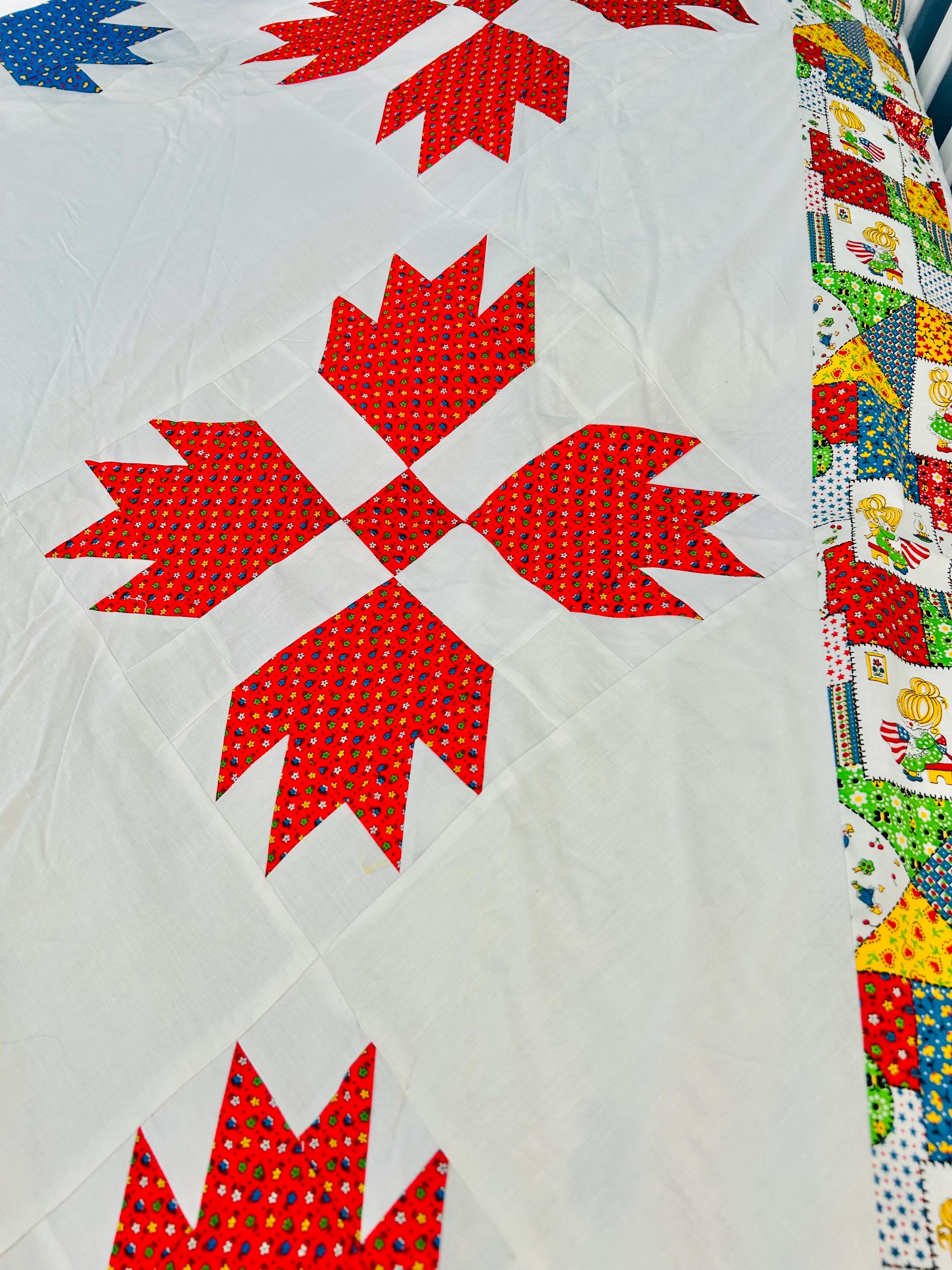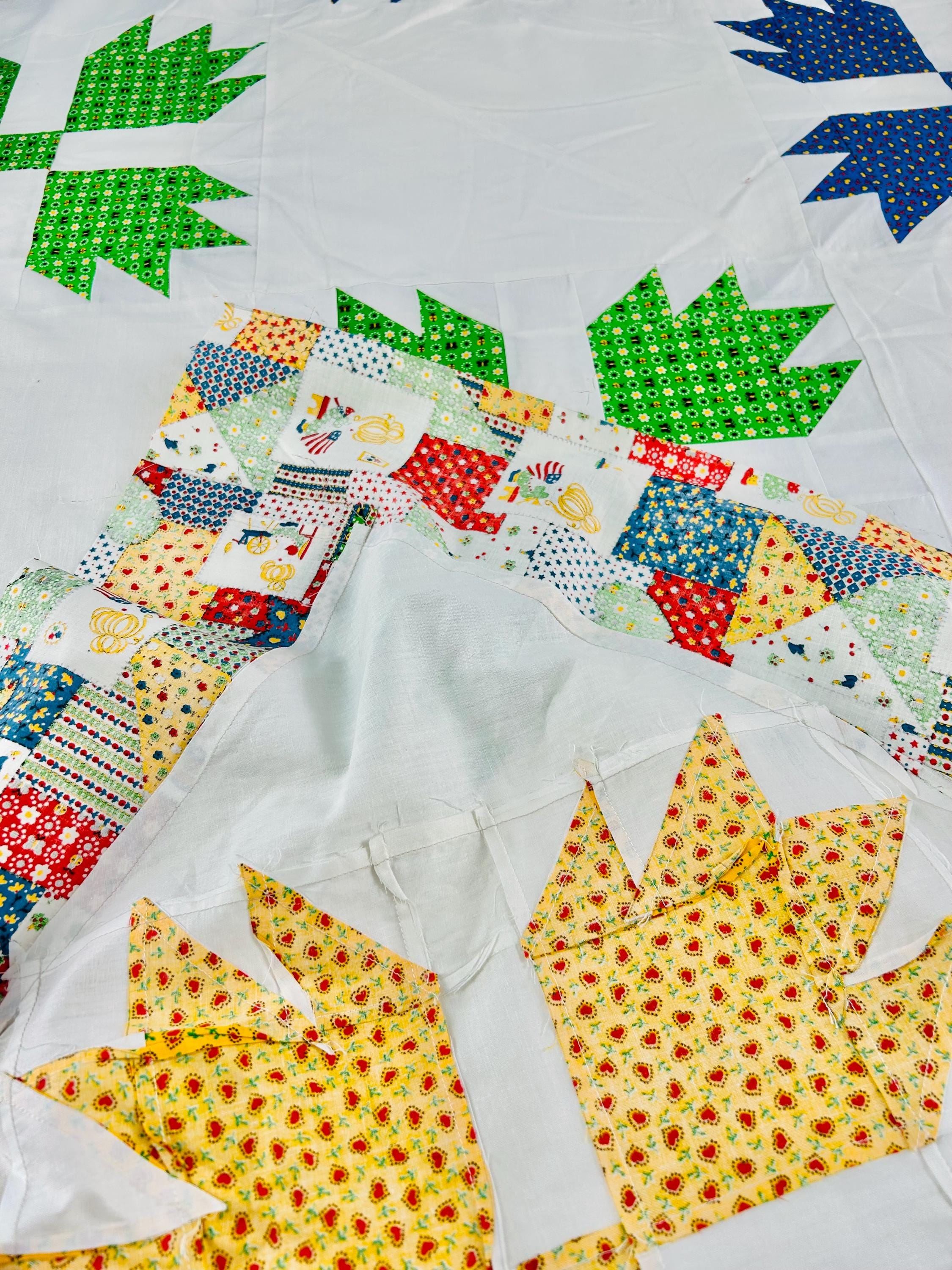 This bright, cheerful vintage Autumn Leaf quilt top was made in the 1980s to 1990s and features bold, stylized leaf blocks arranged on point across a crisp white background. The colorful leaves—worked in red, blue, green, and golden yellow novelty prints—give this quilt top a lively, seasonal feel that works beautifully for fall décor or year-round display.