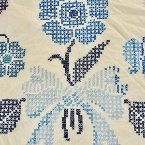 The quilt top comes from a smoke-free, pet-free home and is pictured on a queen-size bed.