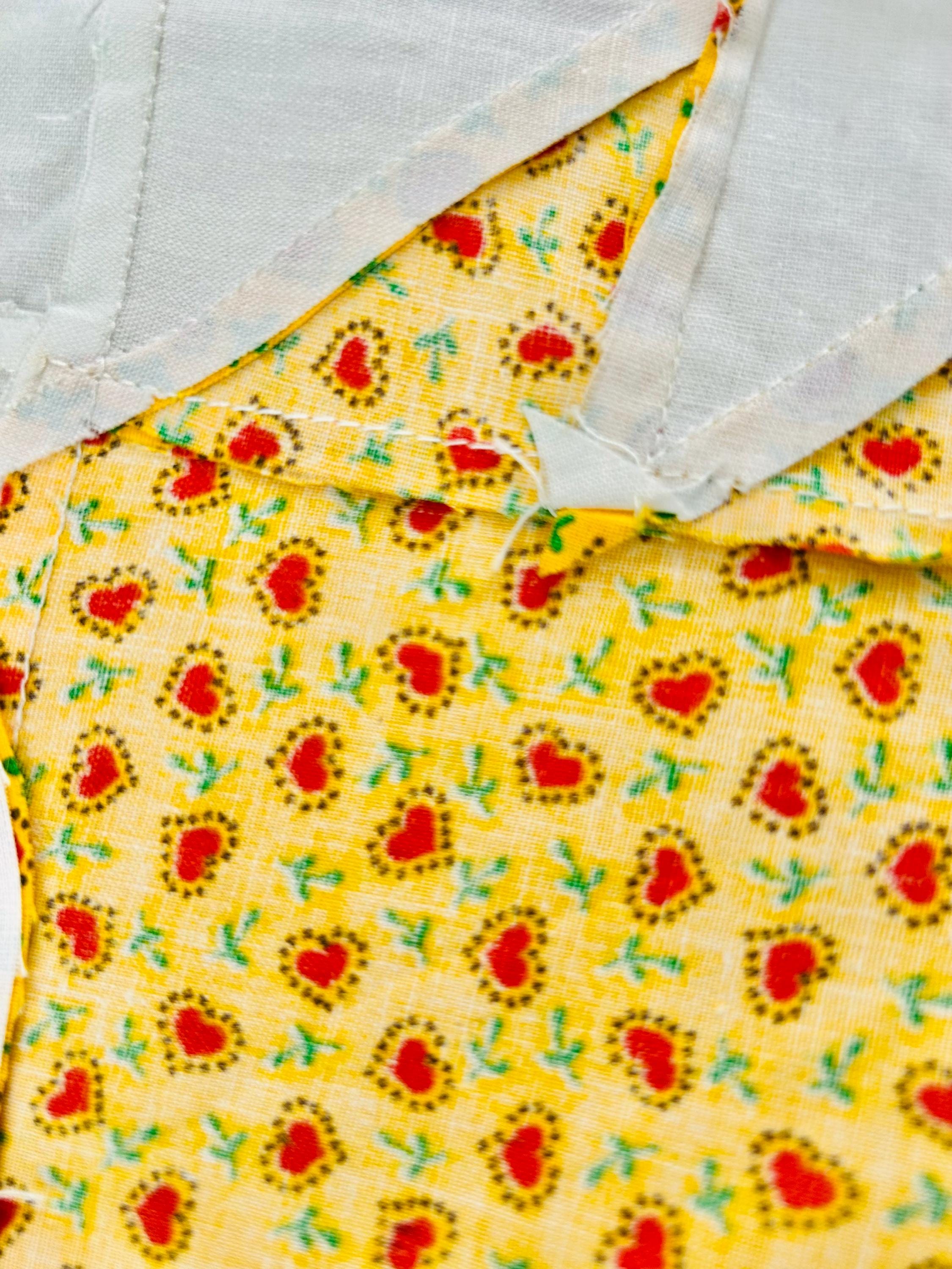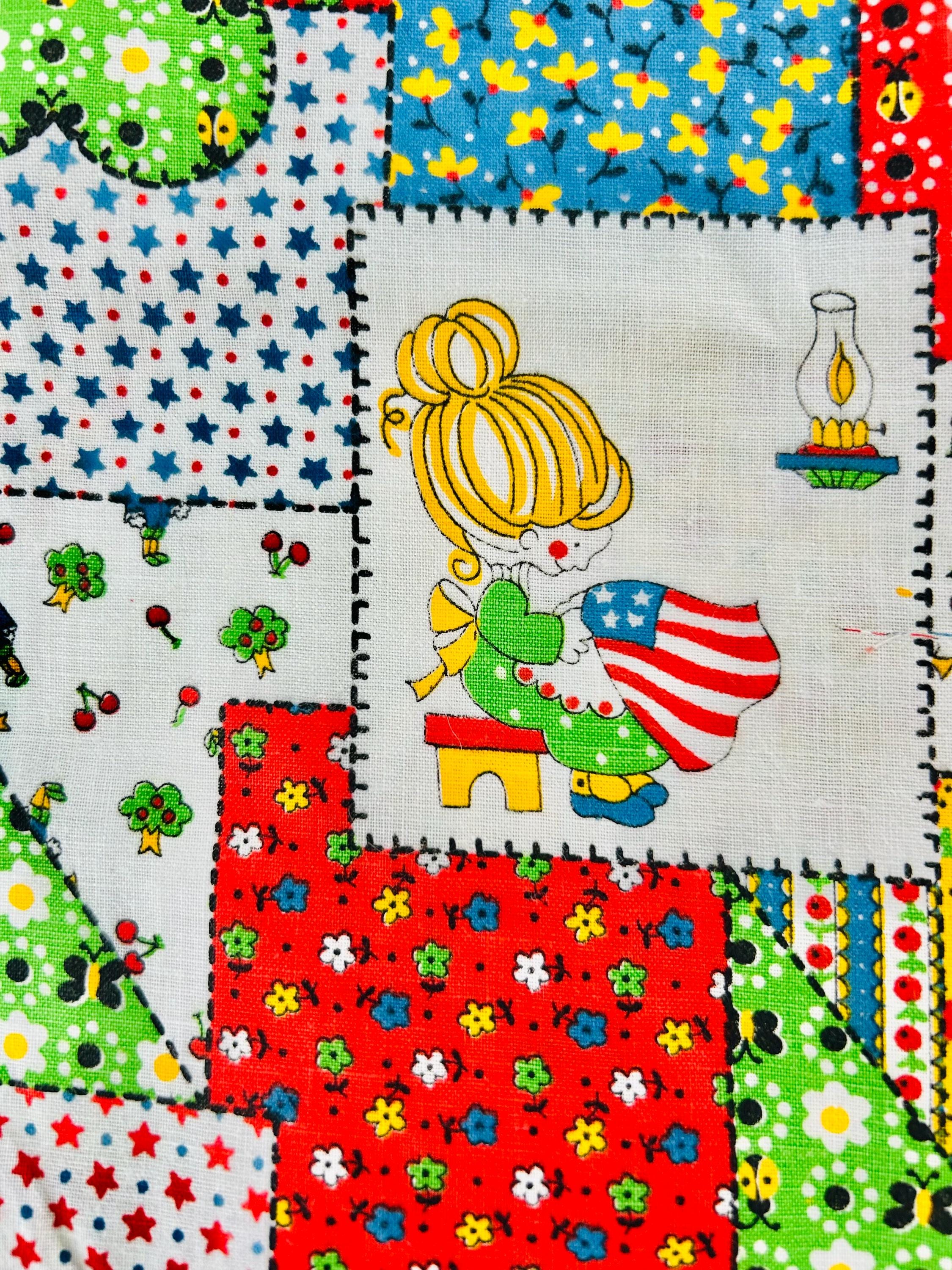 The quilt top is unfinished and has never been quilted. It does not include batting or a backing and will require finishing by the buyer. A pieced patchwork border made from coordinating novelty prints adds extra visual interest.