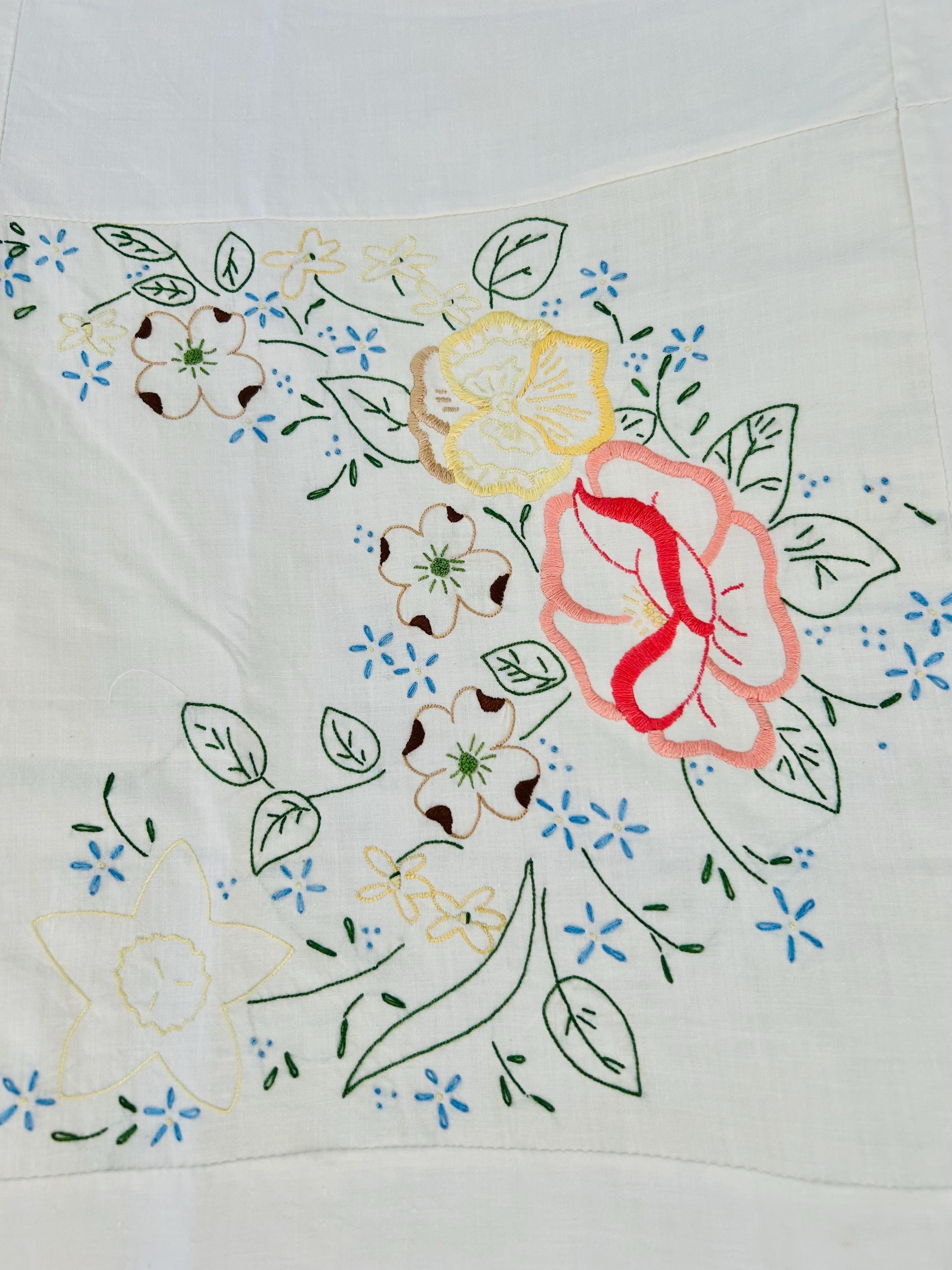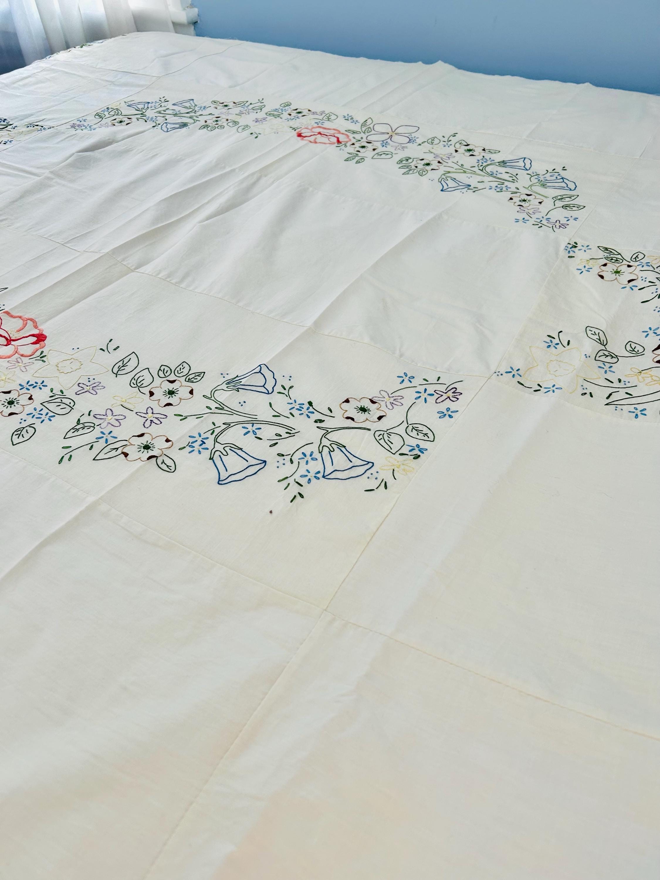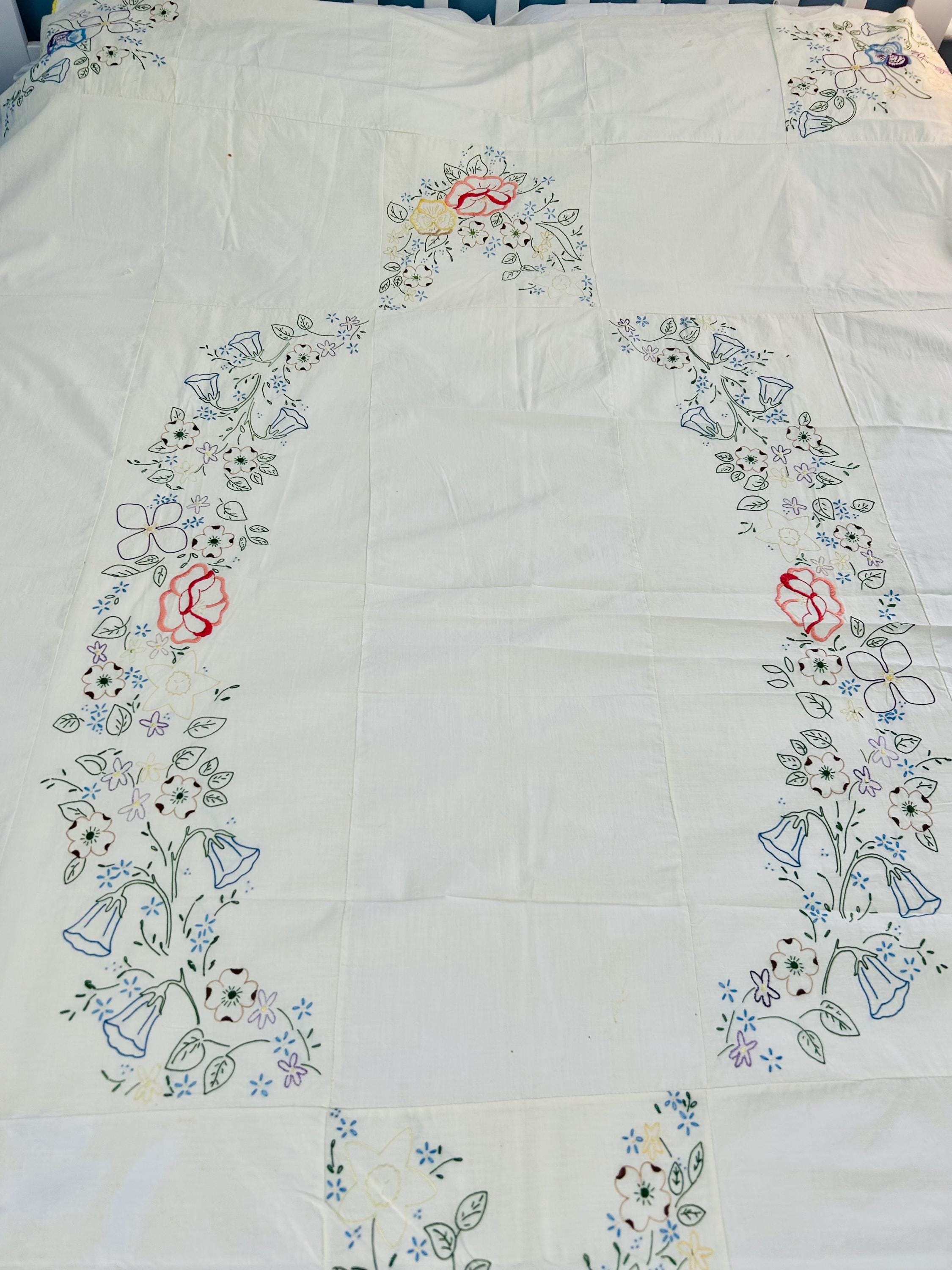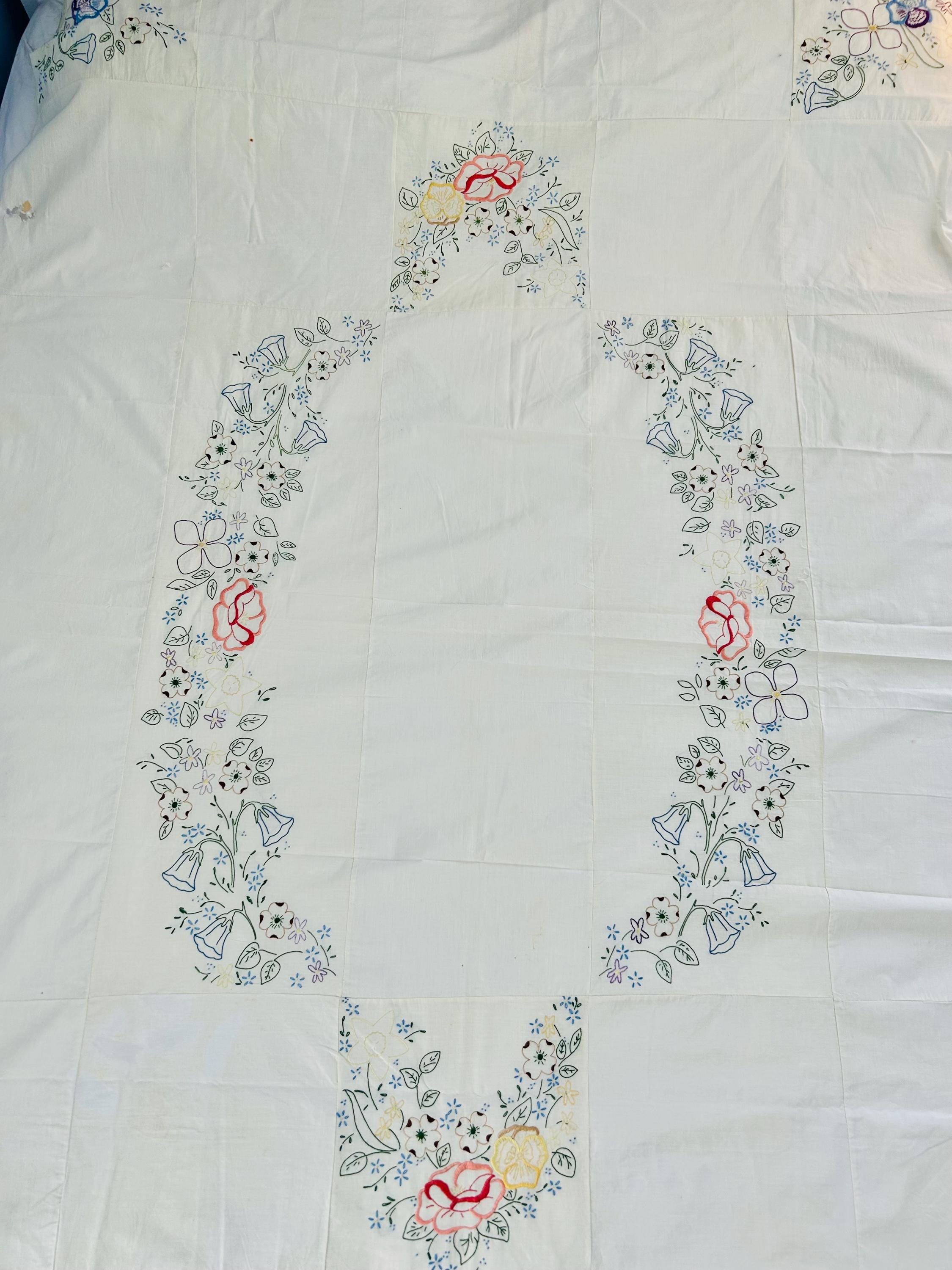 Details: • Era: 1990s (vintage) • Item: Quilt top ONLY • Construction: Machine-embroidered quilt top • Design: Vertical floral garlands with roses and garden flowers • Colors: White background with pastel embroidery • Size: 60” x 82” • Condition: Excellent vintage condition; no batting, backing, or quilting present