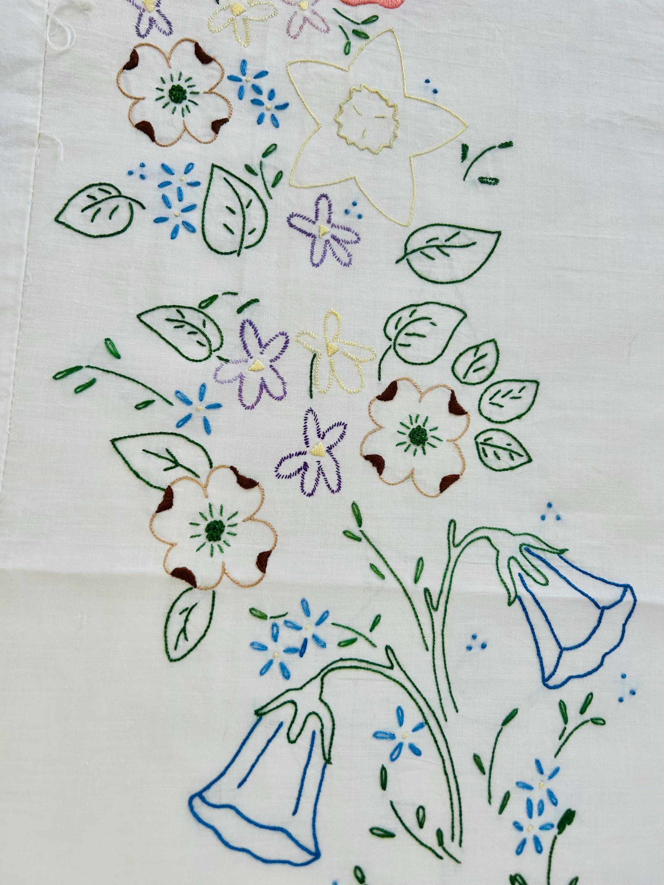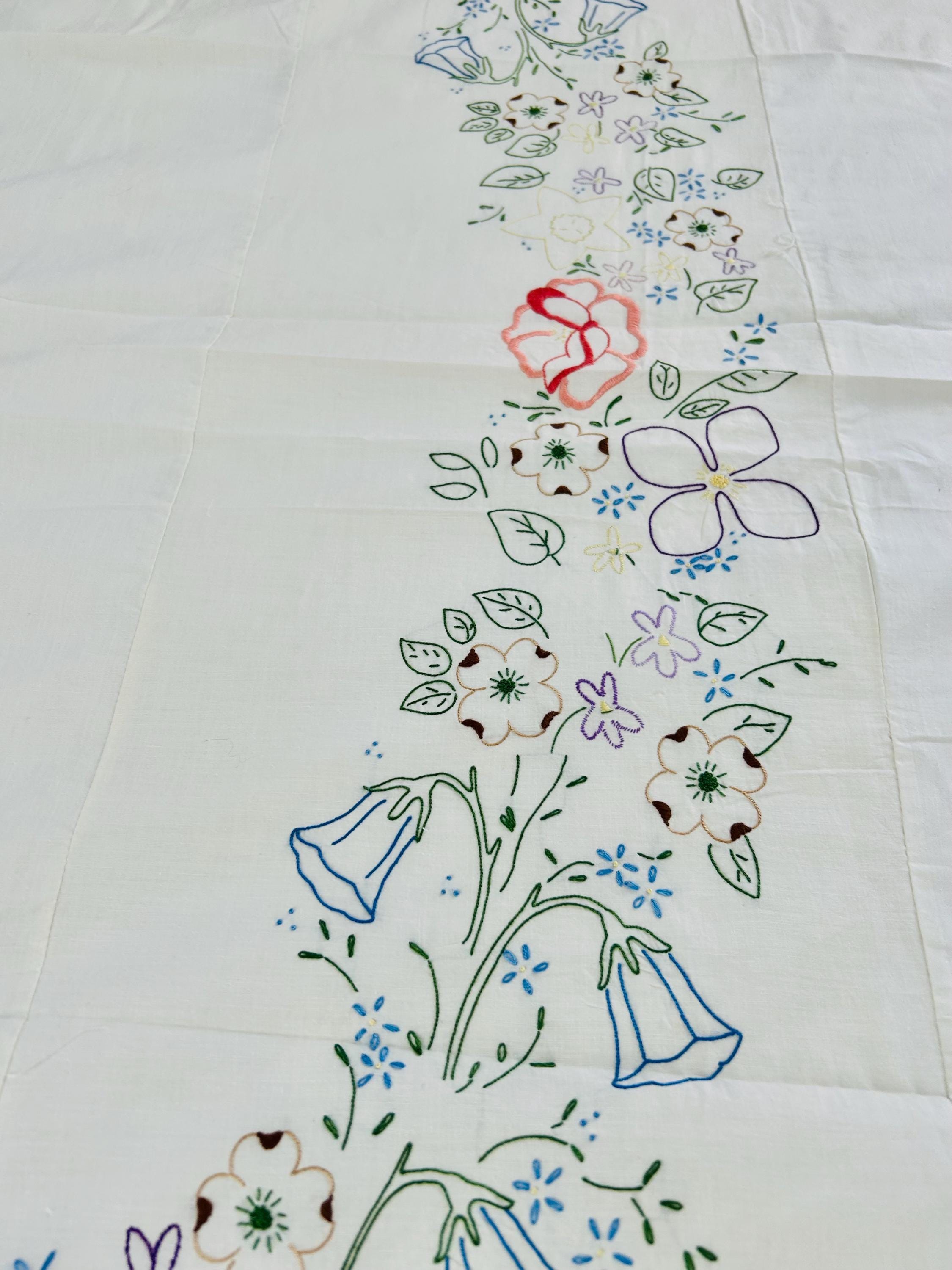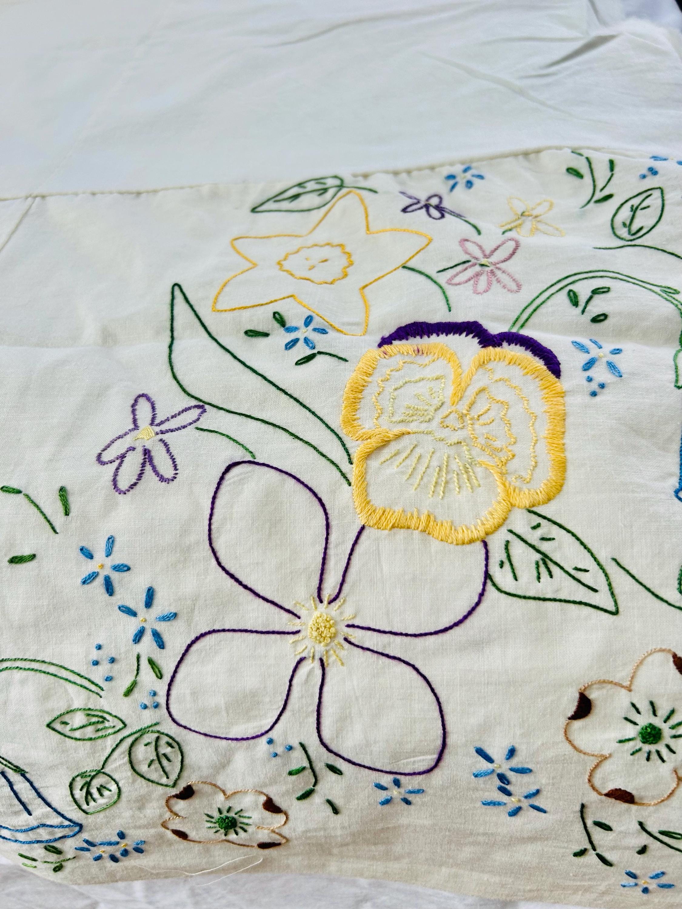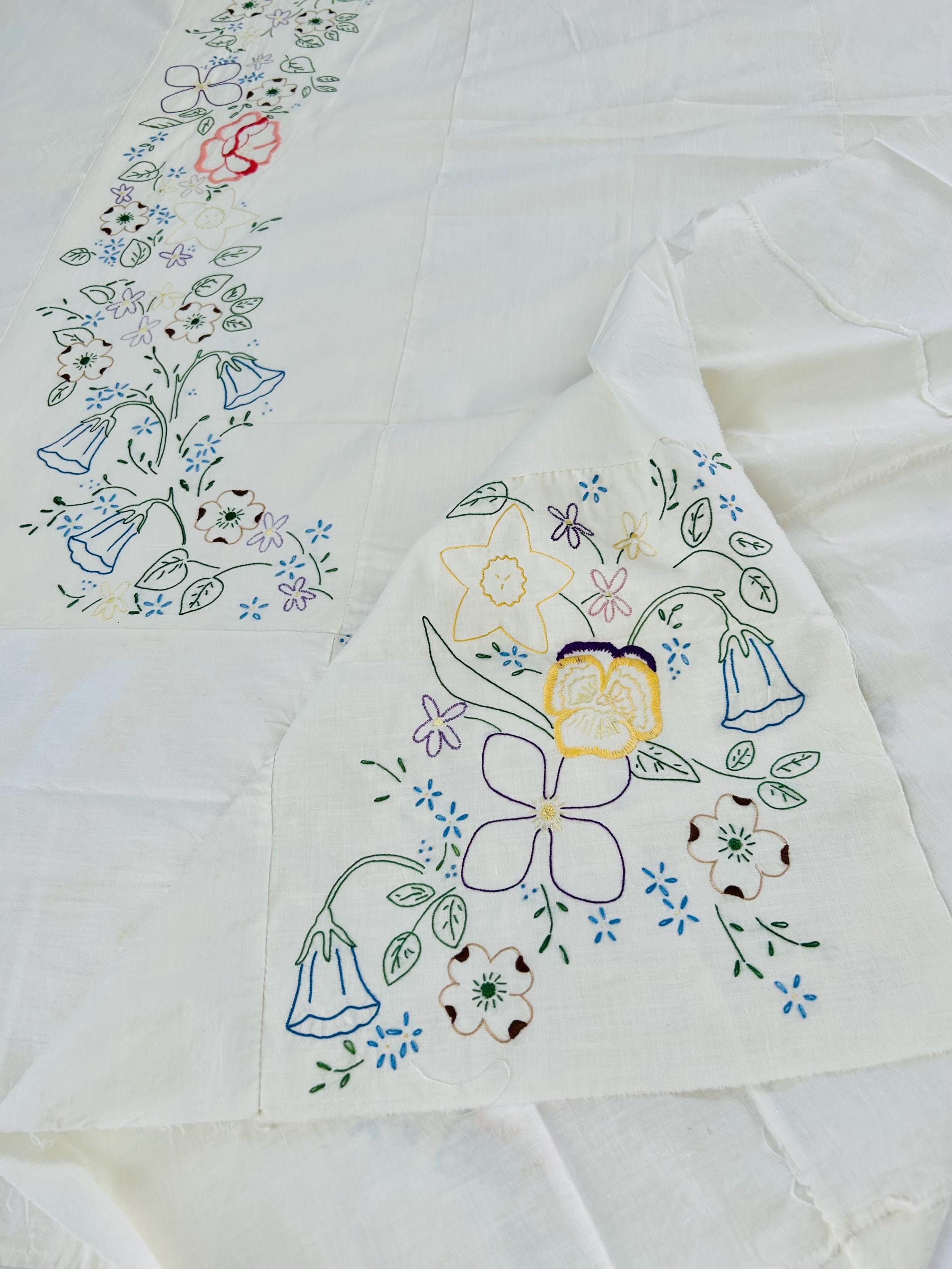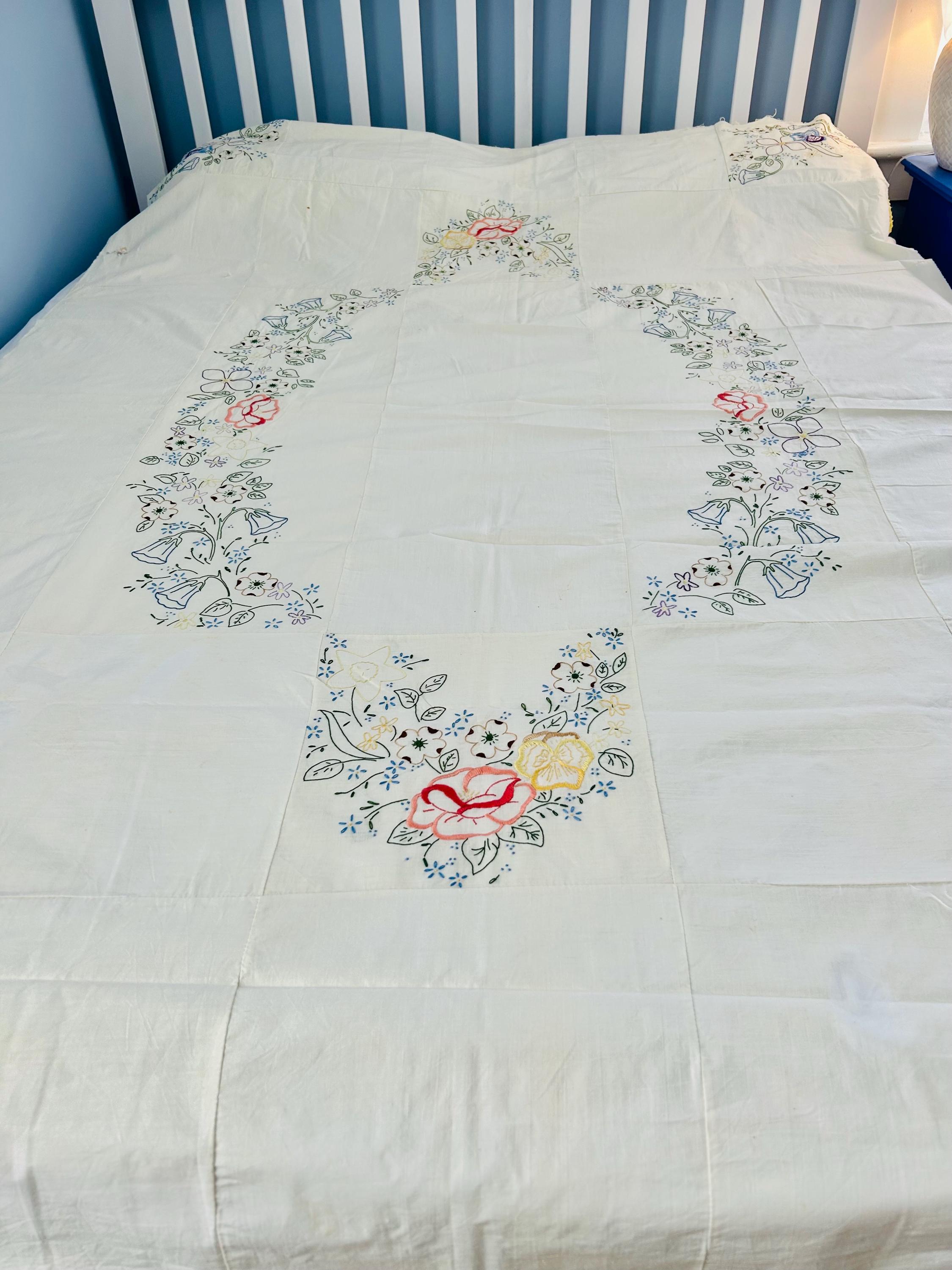 Details: • Era: 1990s (vintage) • Item: Quilt top ONLY • Construction: Machine-embroidered quilt top • Design: Vertical floral garlands with roses and garden flowers • Colors: White background with pastel embroidery • Size: 60” x 82” • Condition: Excellent vintage condition; no batting, backing, or quilting present