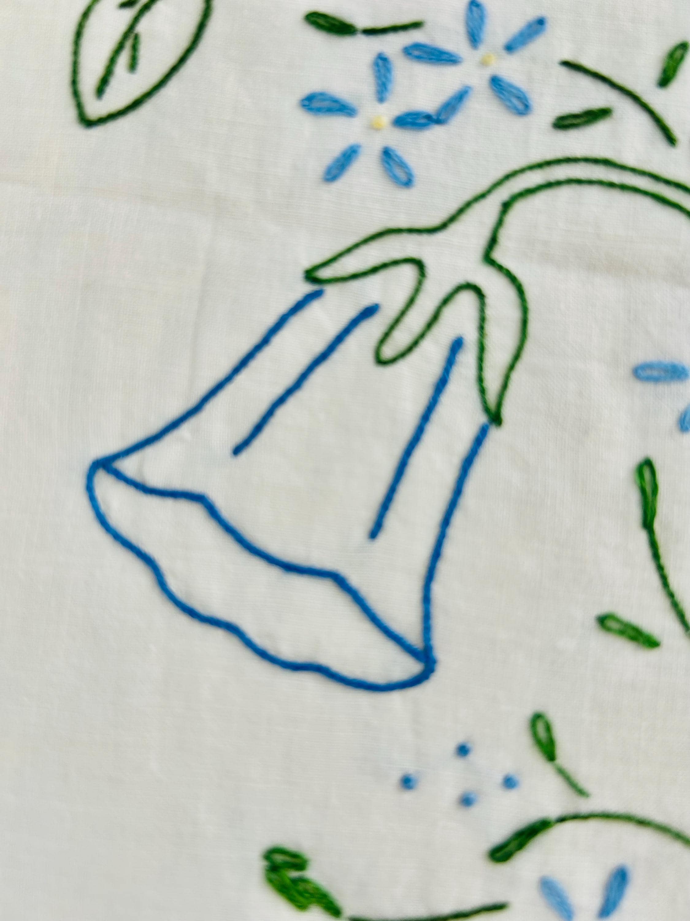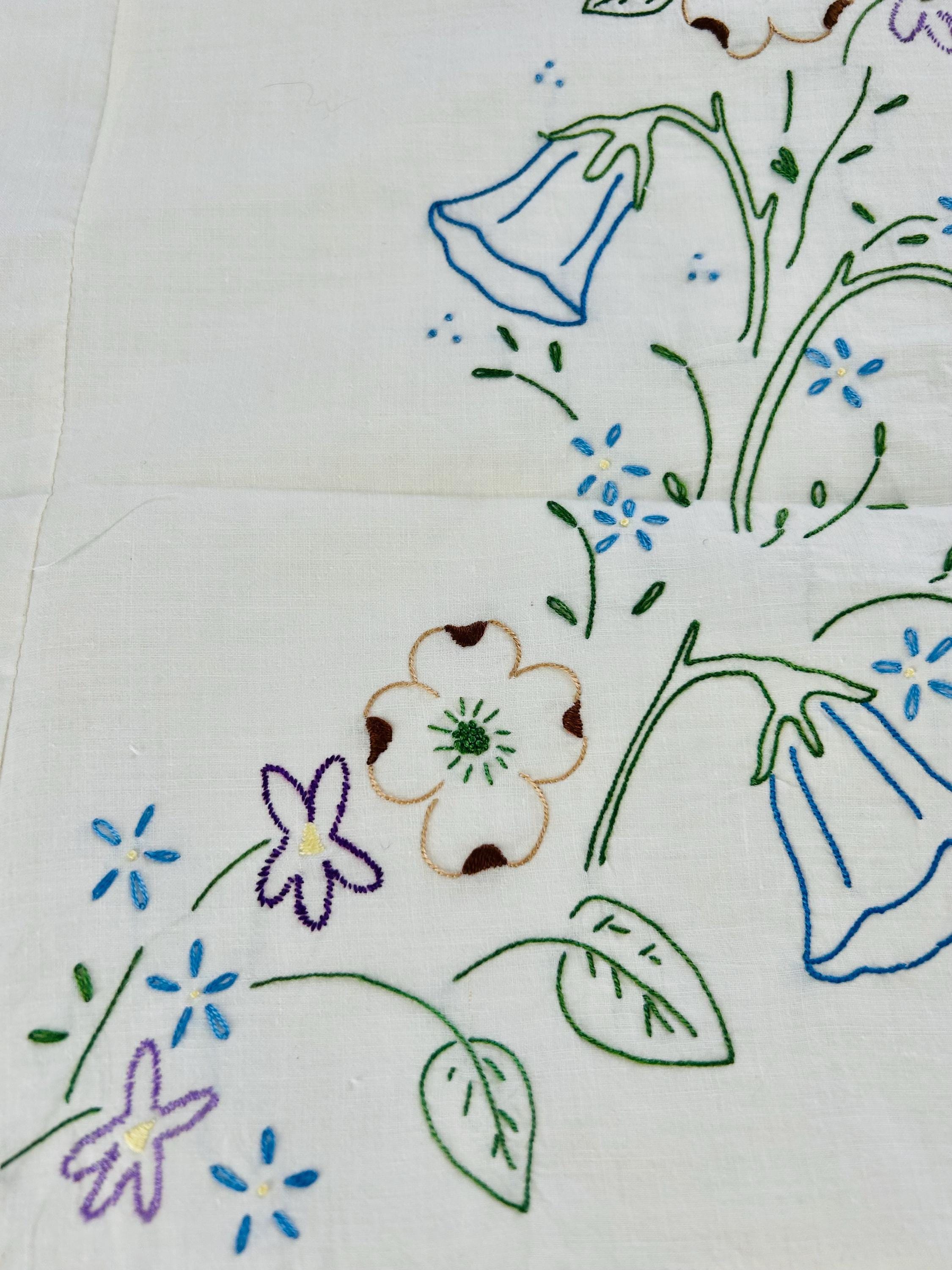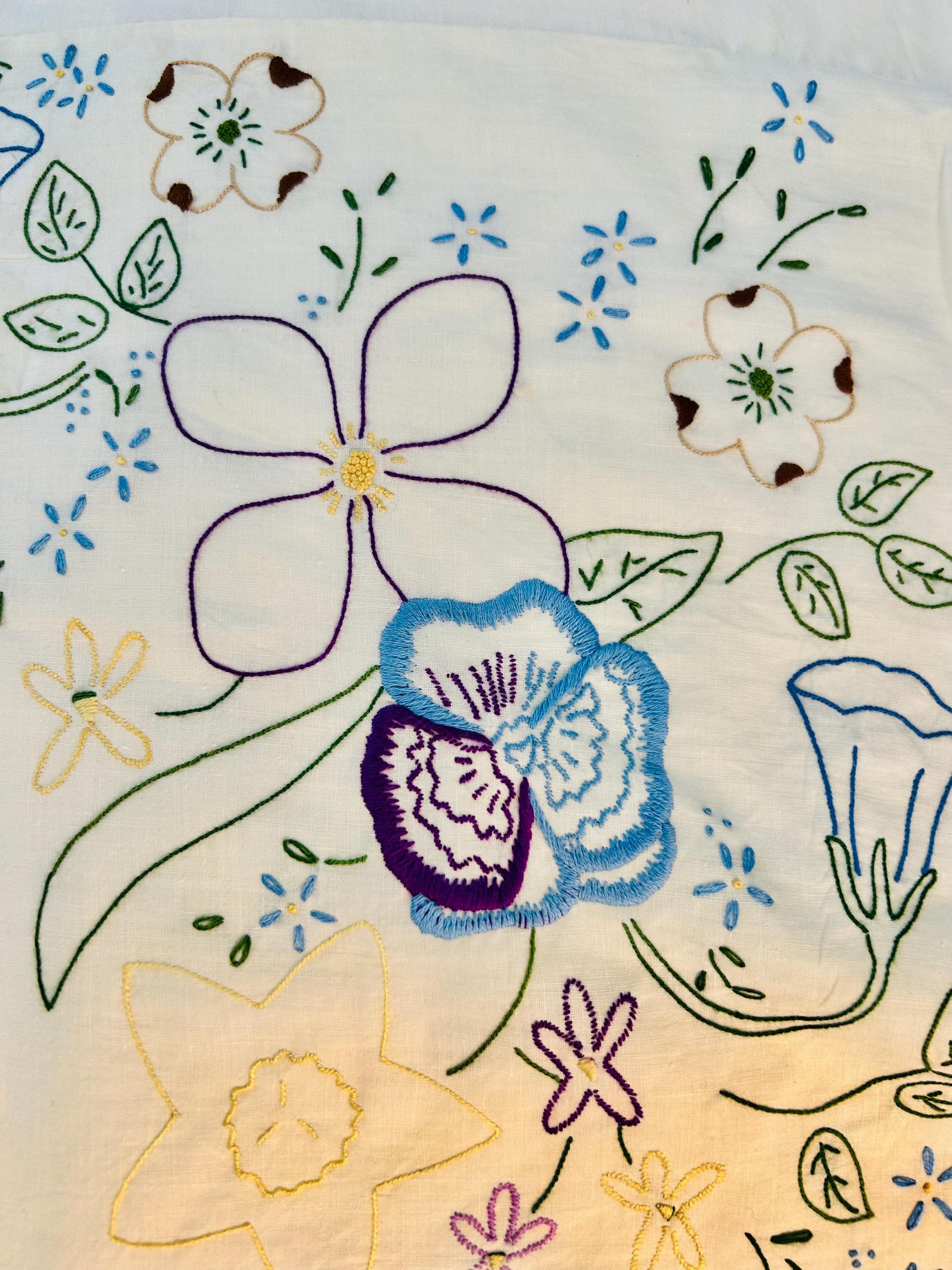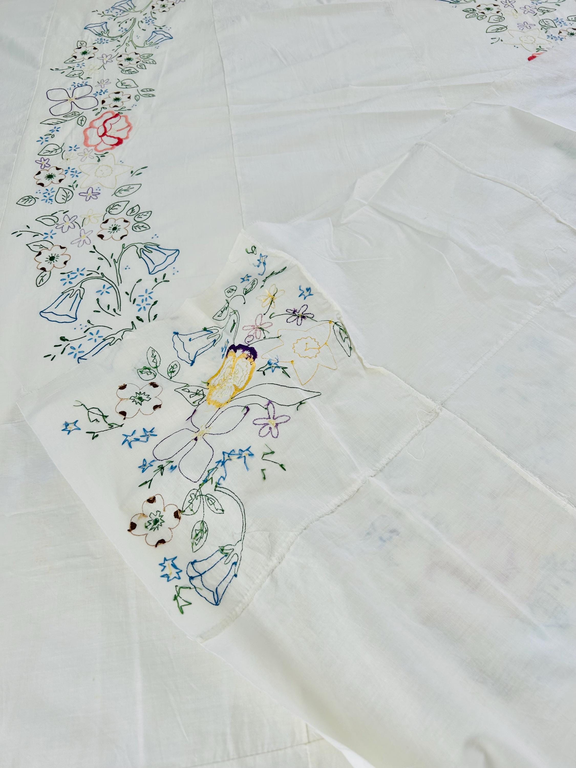 Details: • Era: 1990s (vintage) • Item: Quilt top ONLY • Construction: Machine-embroidered quilt top • Design: Vertical floral garlands with roses and garden flowers • Colors: White background with pastel embroidery • Size: 60” x 82” • Condition: Excellent vintage condition; no batting, backing, or quilting present